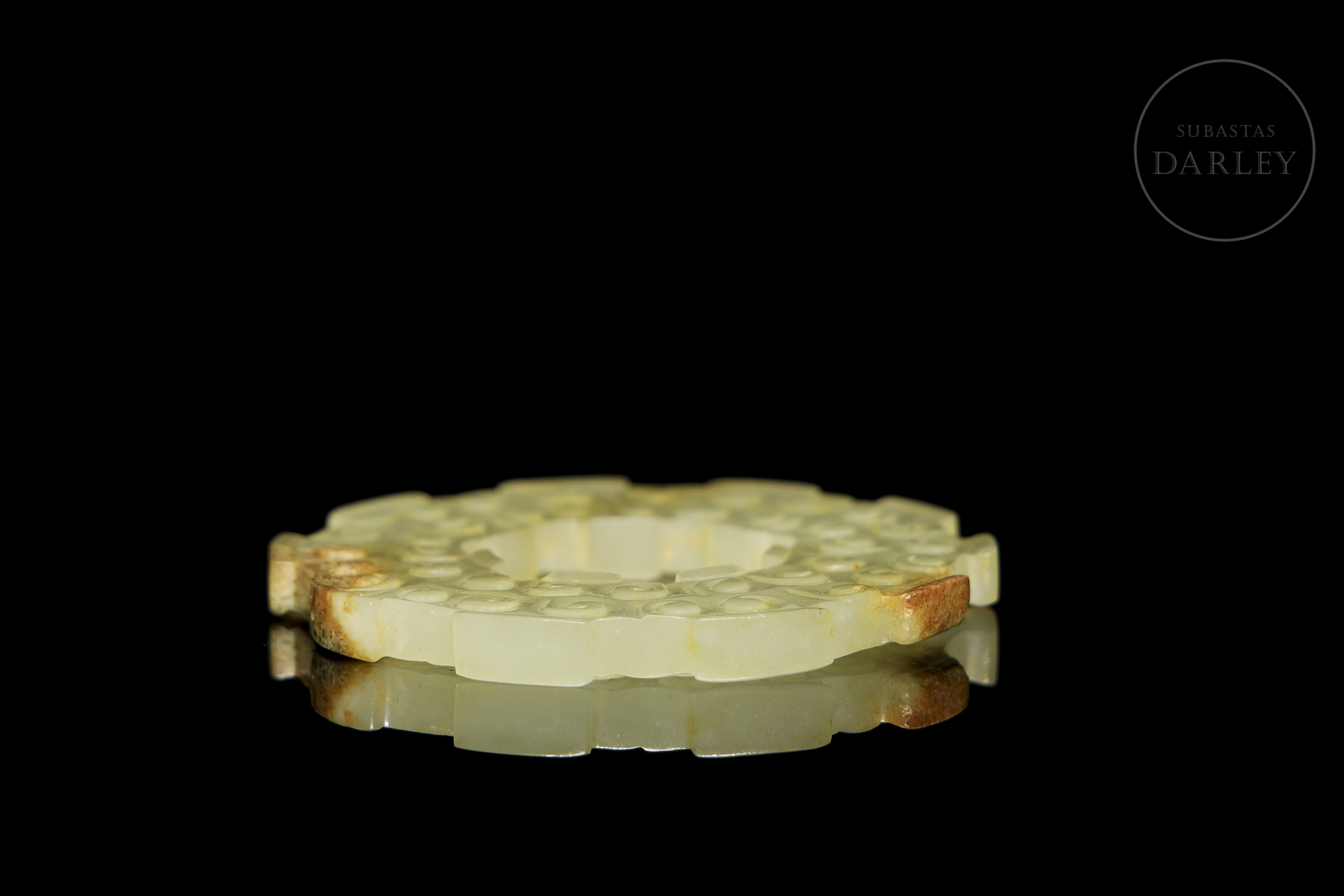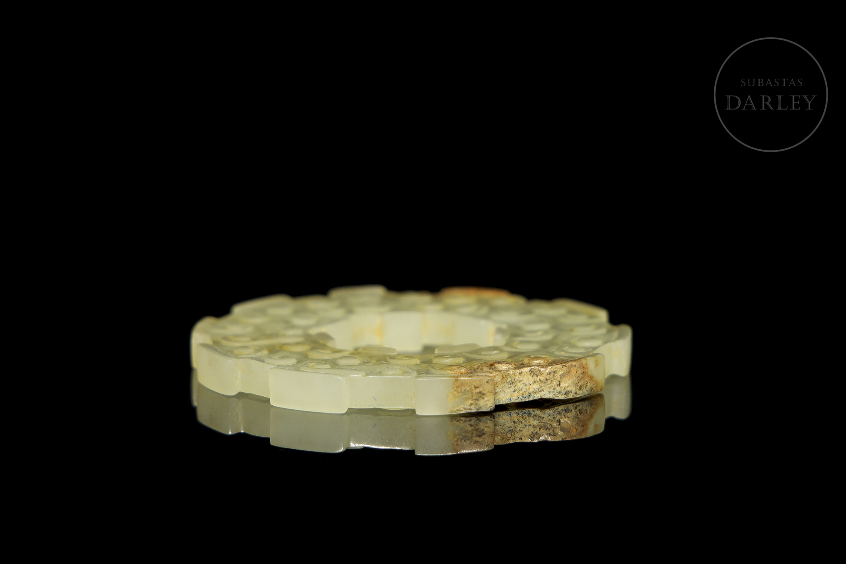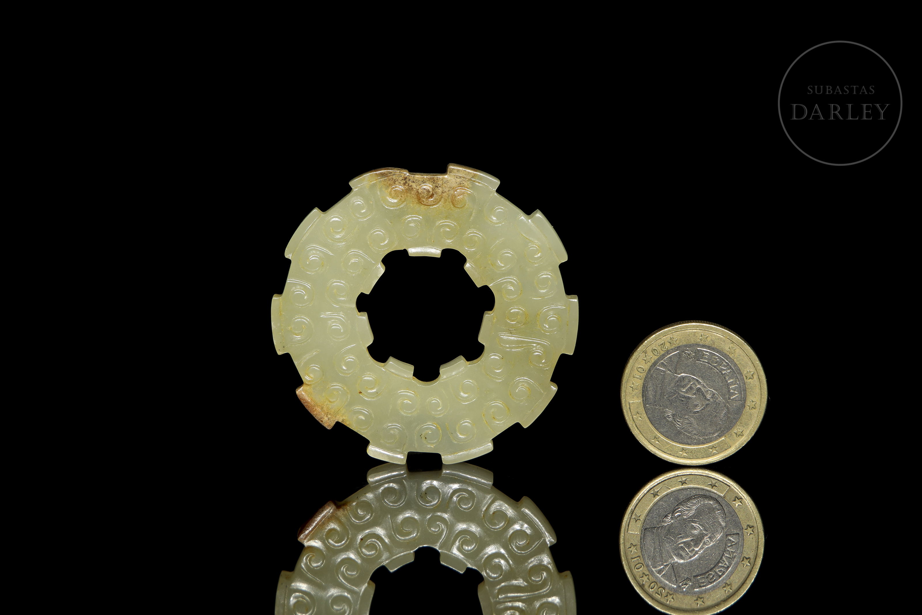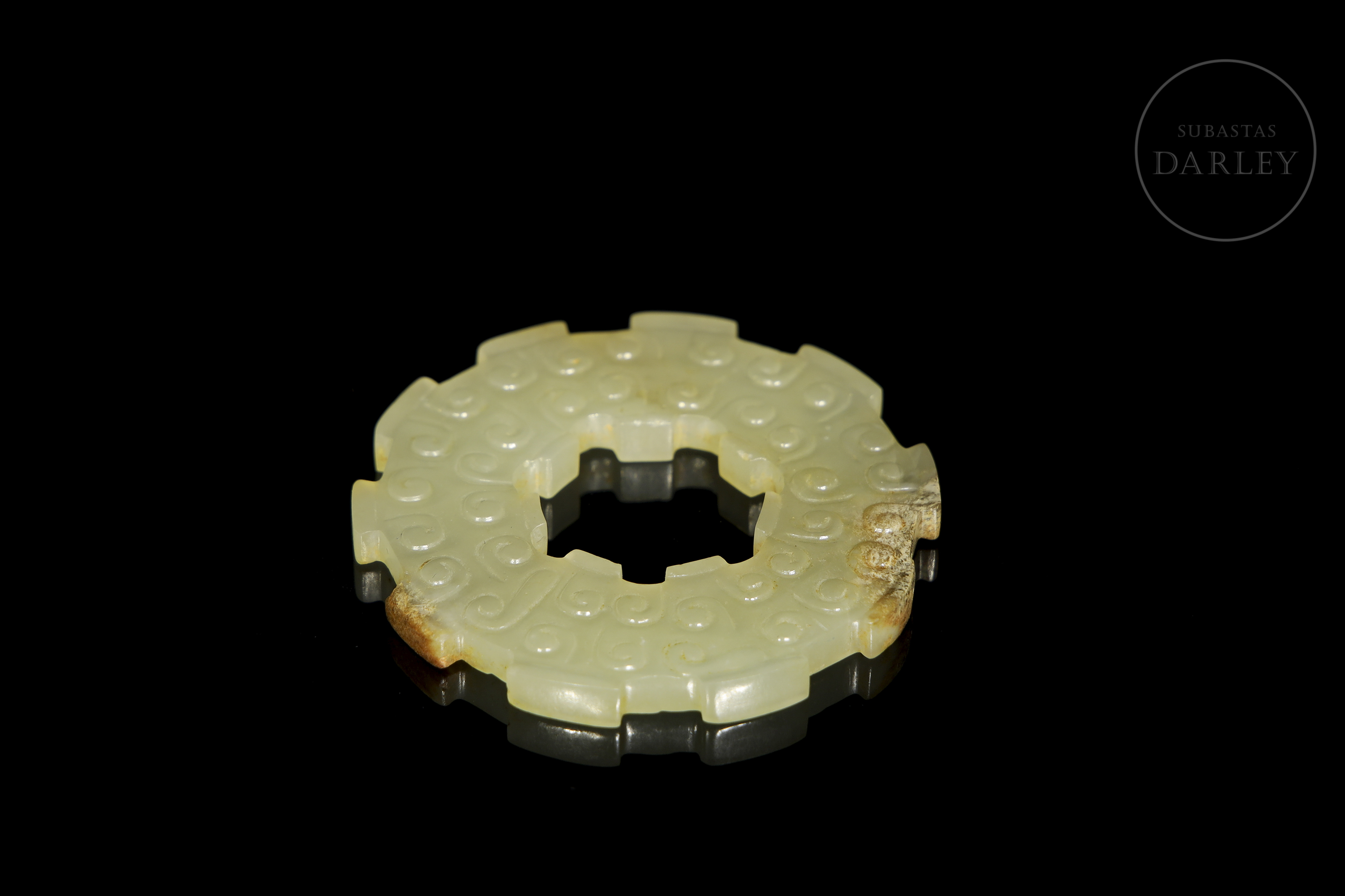 Circular jade pendant in a light shade with slight areas of amber and ochre patina. It has a serrated outer edge, decorated with incised spiral ‘leiwen’ motifs. The central hole is also serrated. It shows patina due to ageing.