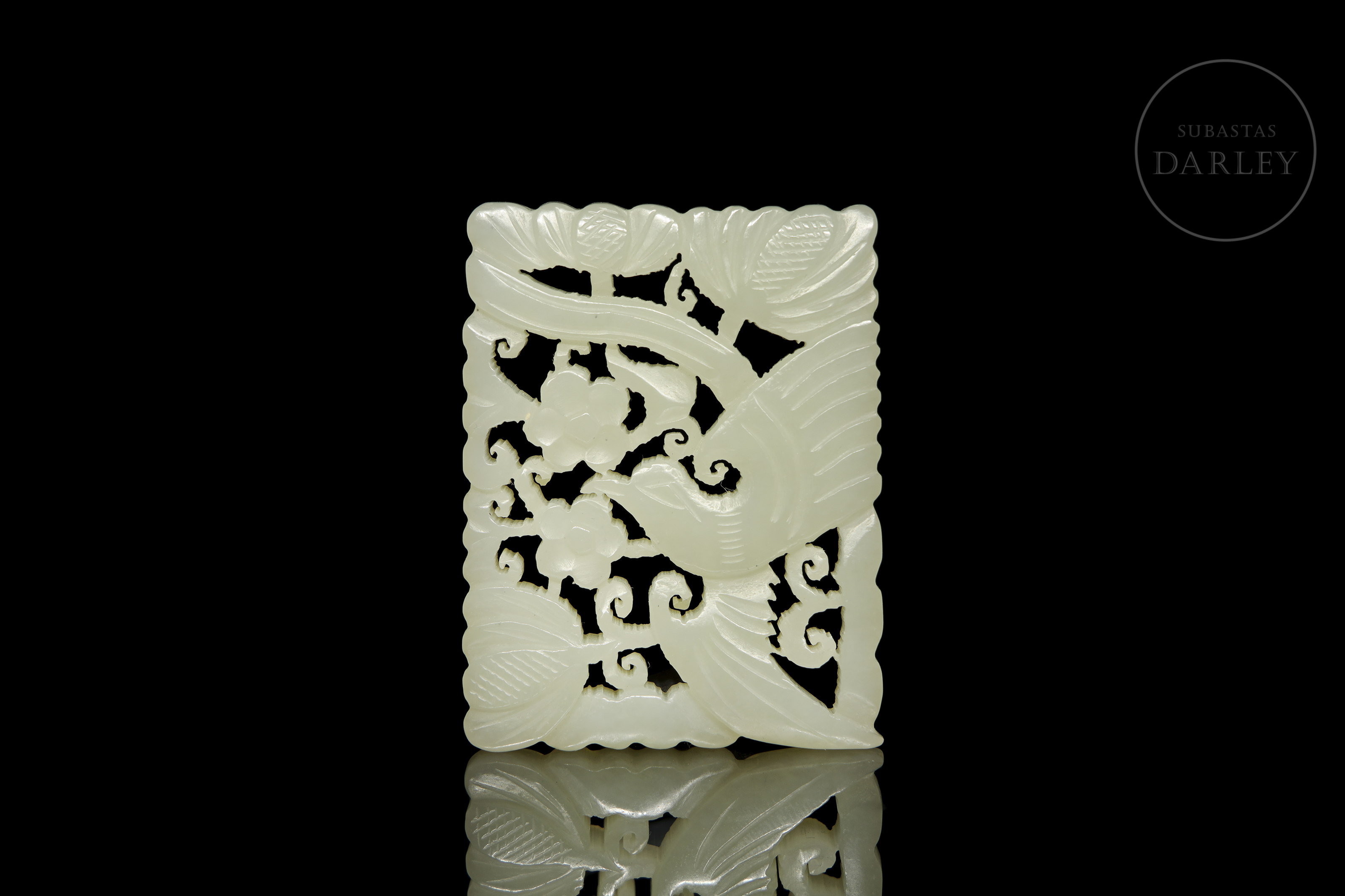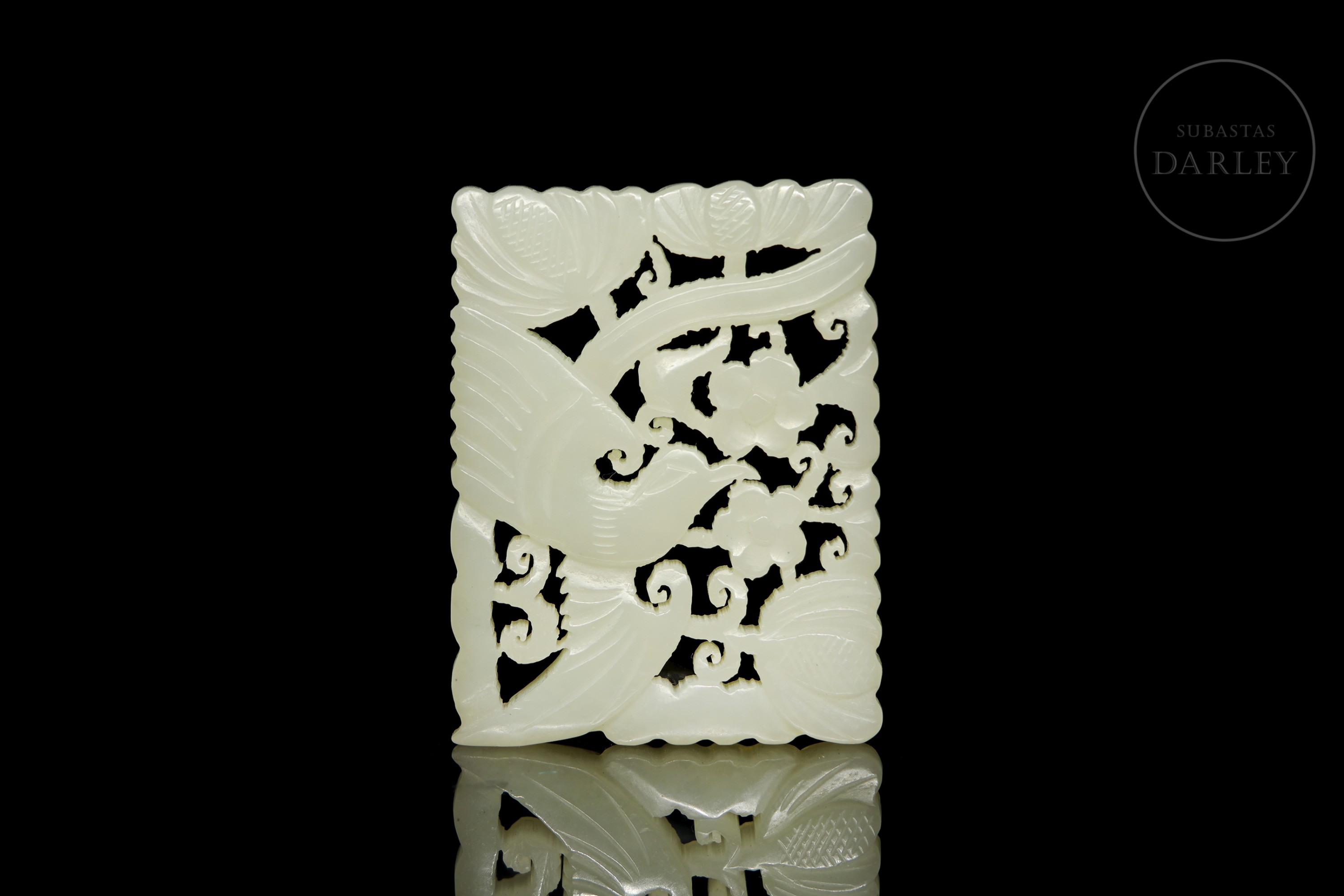 Thin rectangular plaque of milky-coloured jade. It is finely carved and engraved with the representation of a bird in flight, with outstretched wings, among scrolls and branches of lotus and daisy flowers. Qing Dynasty (1644–1912).