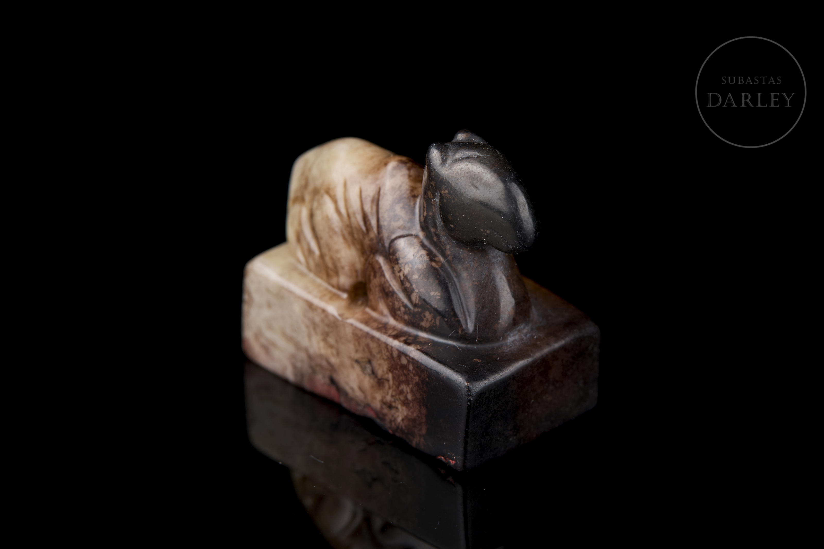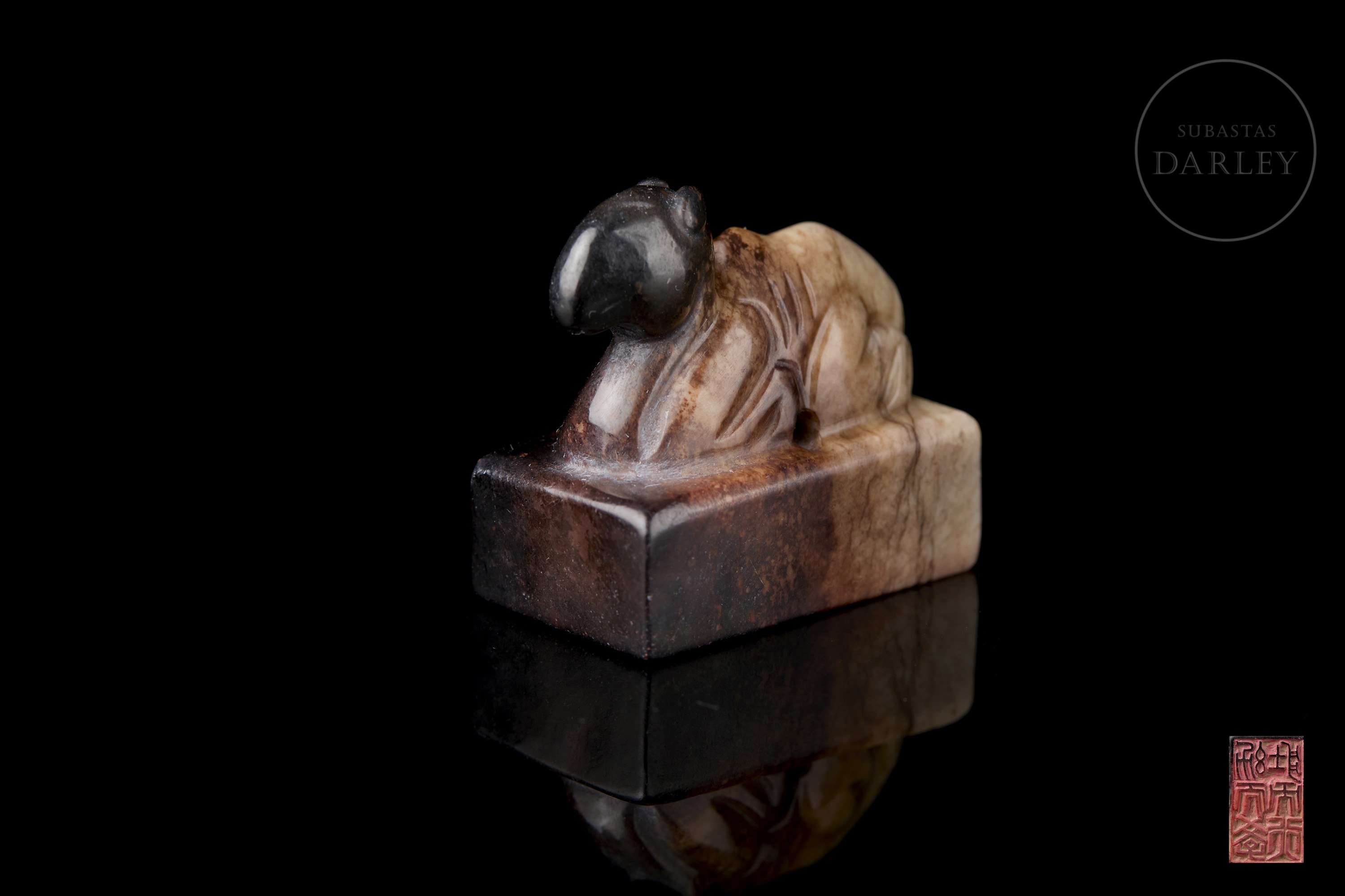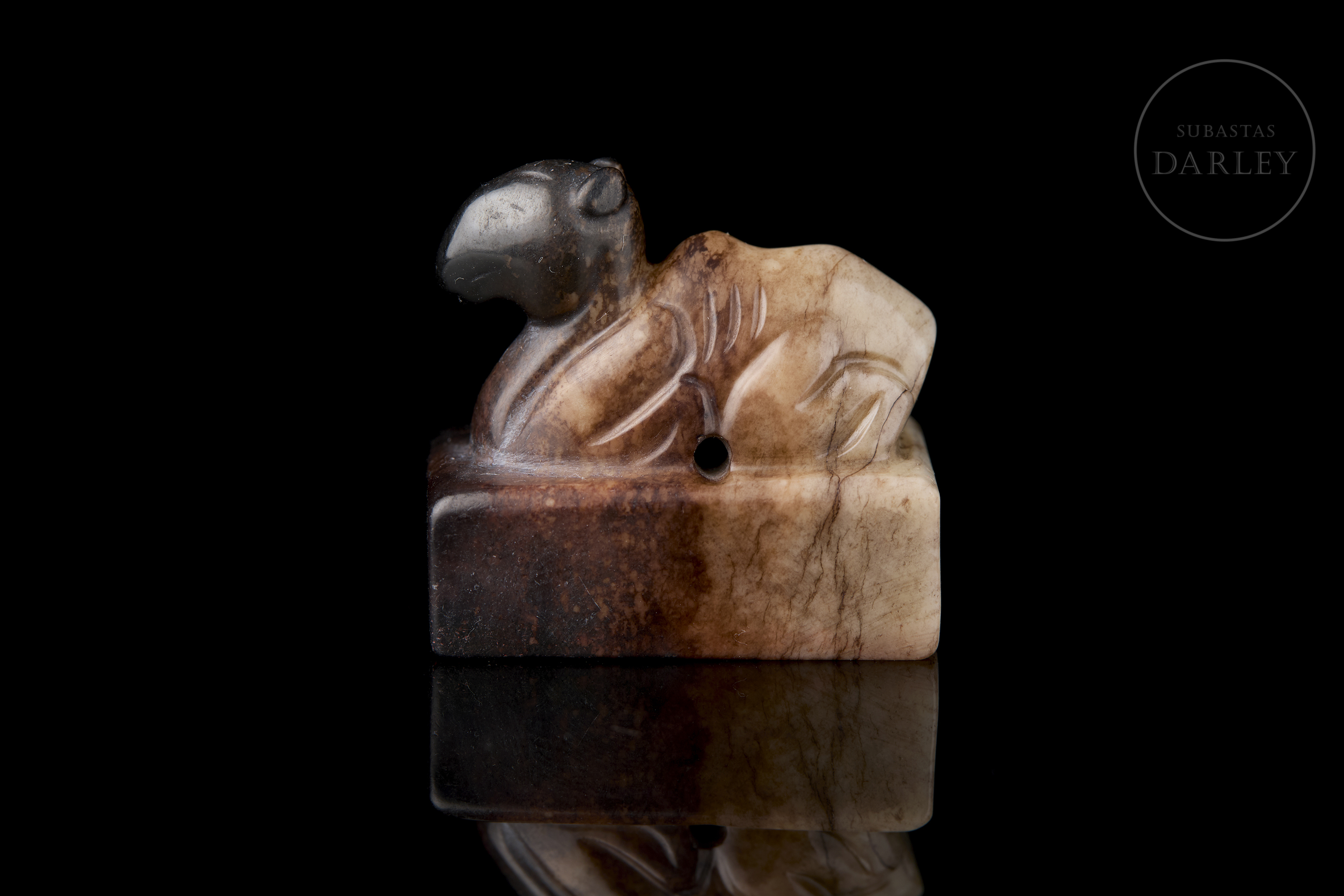Brownish-white jade seal with natural veins, crowned by the figure of a reclining camel, worked with linear incisions marking the mane and limbs. The base features a seal carved in bas-relief ‘幼而学壮而行’.