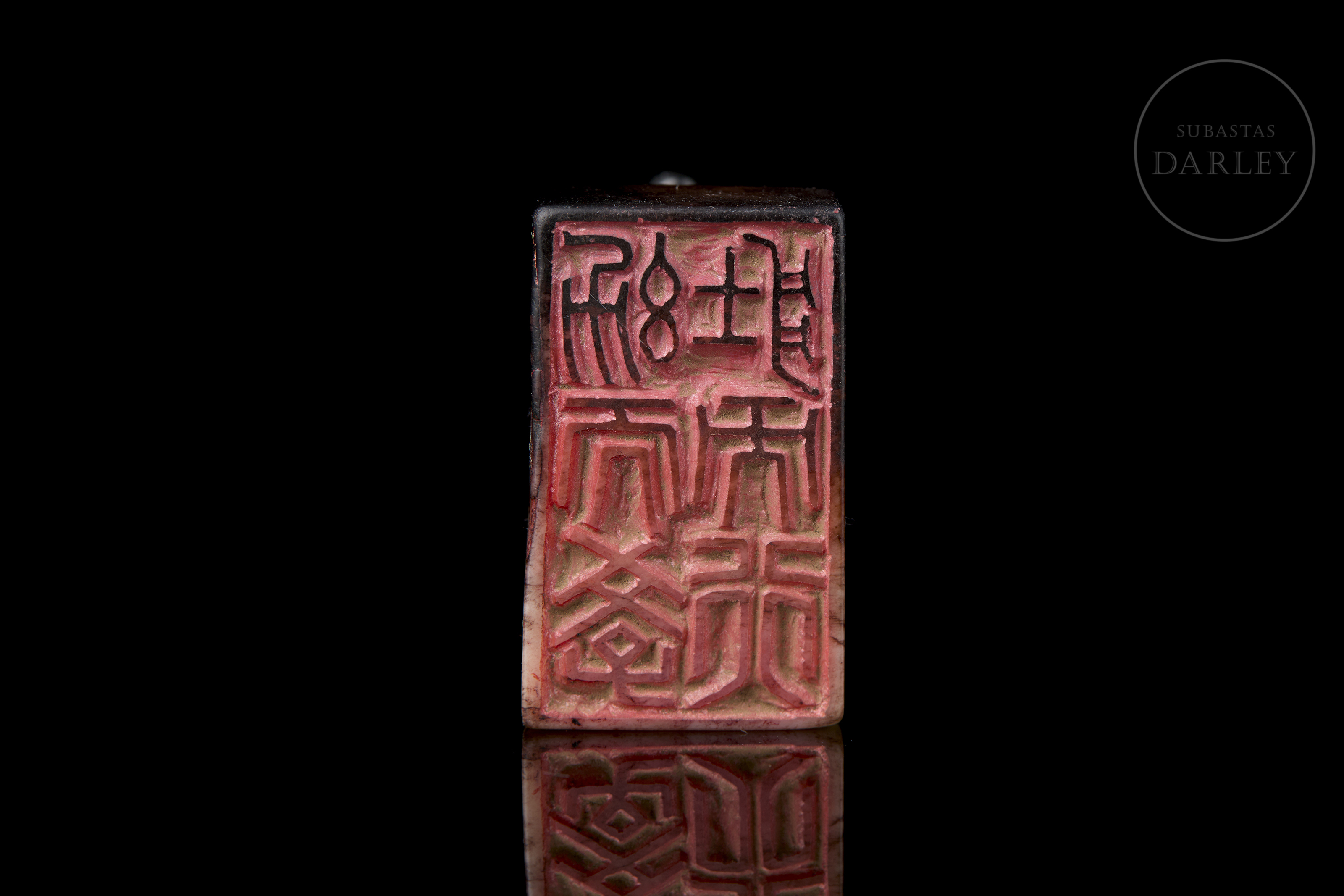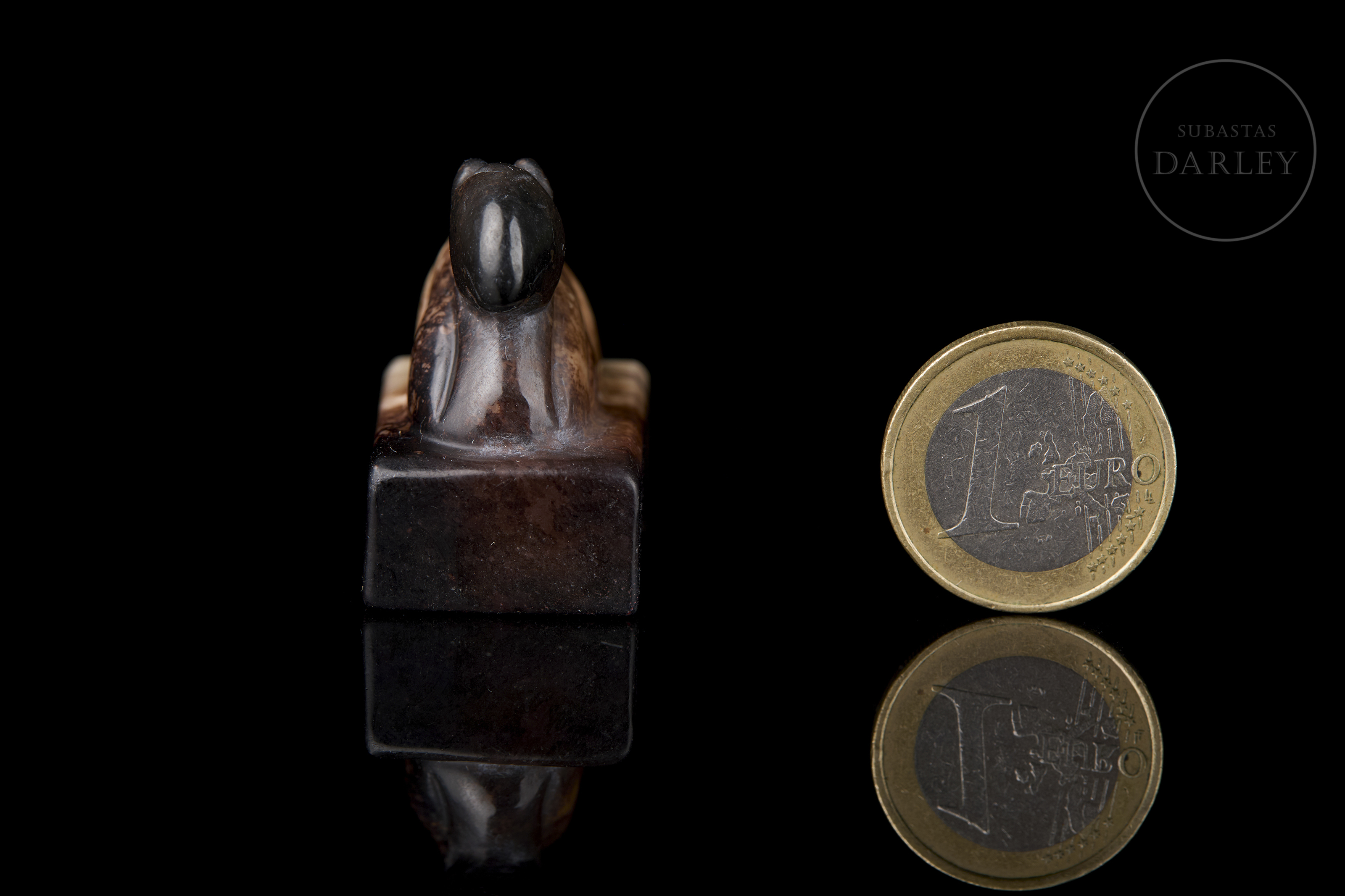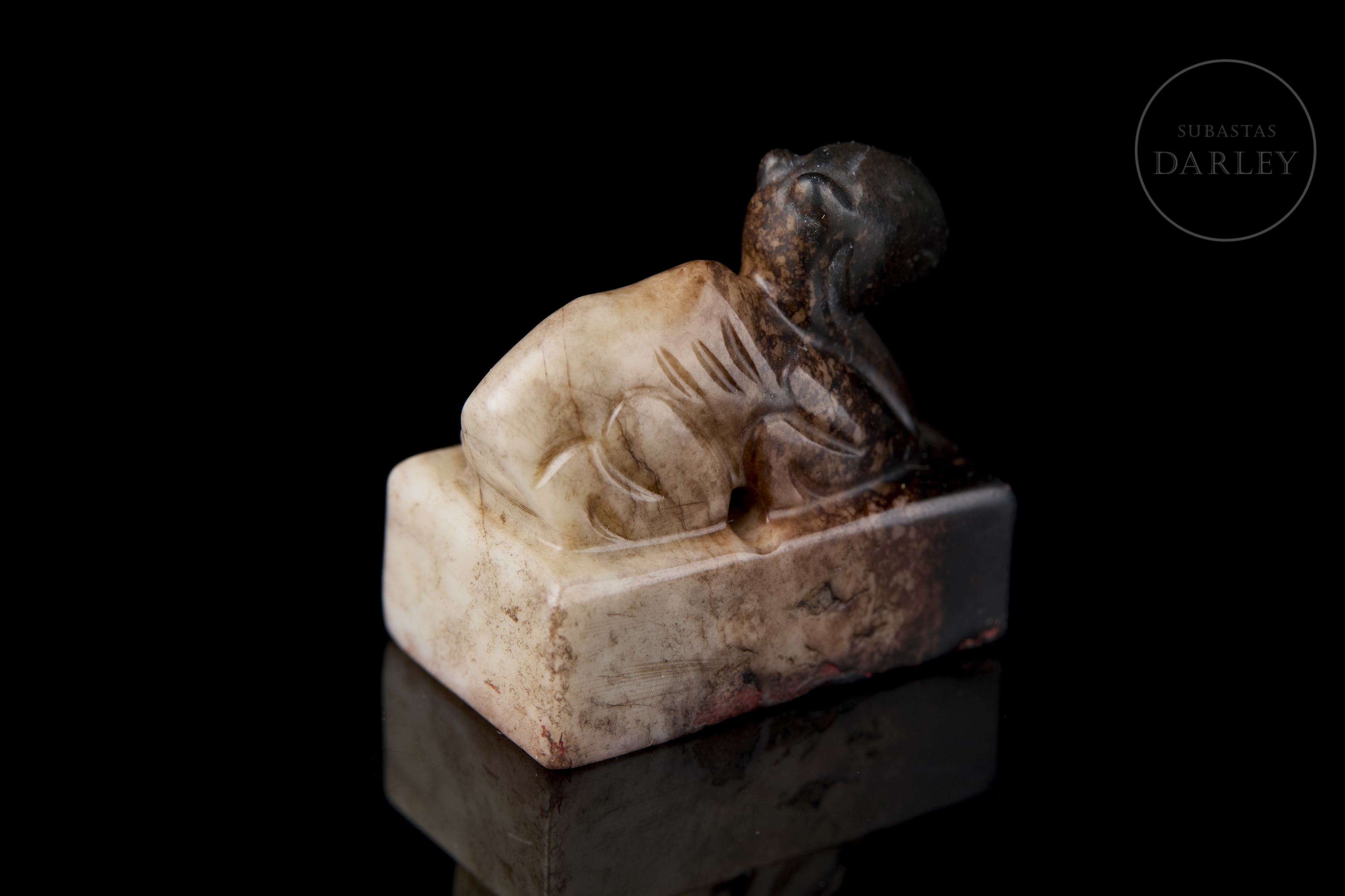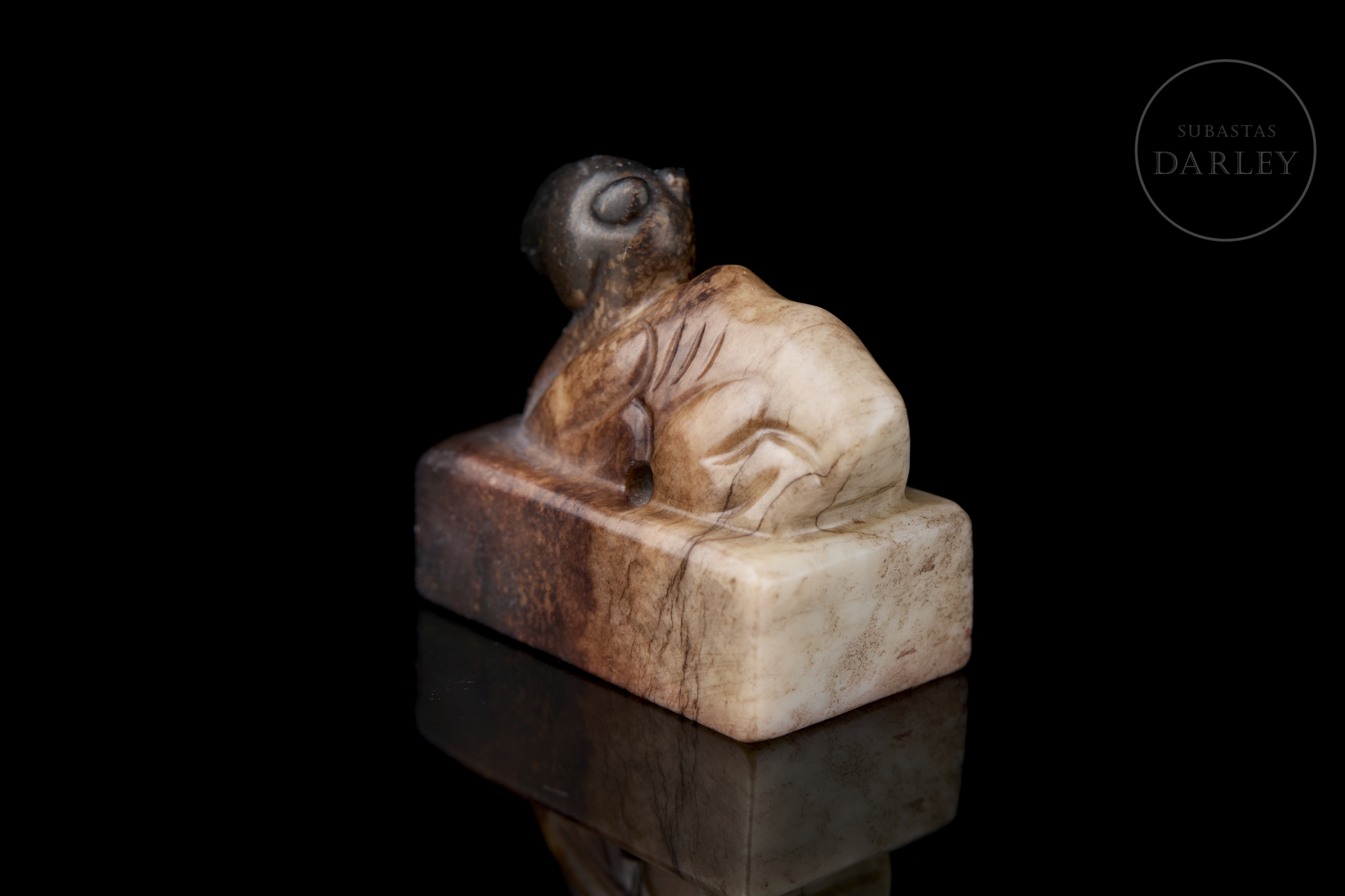 Brownish-white jade seal with natural veins, crowned by the figure of a reclining camel, worked with linear incisions marking the mane and limbs. The base features a seal carved in bas-relief ‘幼而学壮而行’.