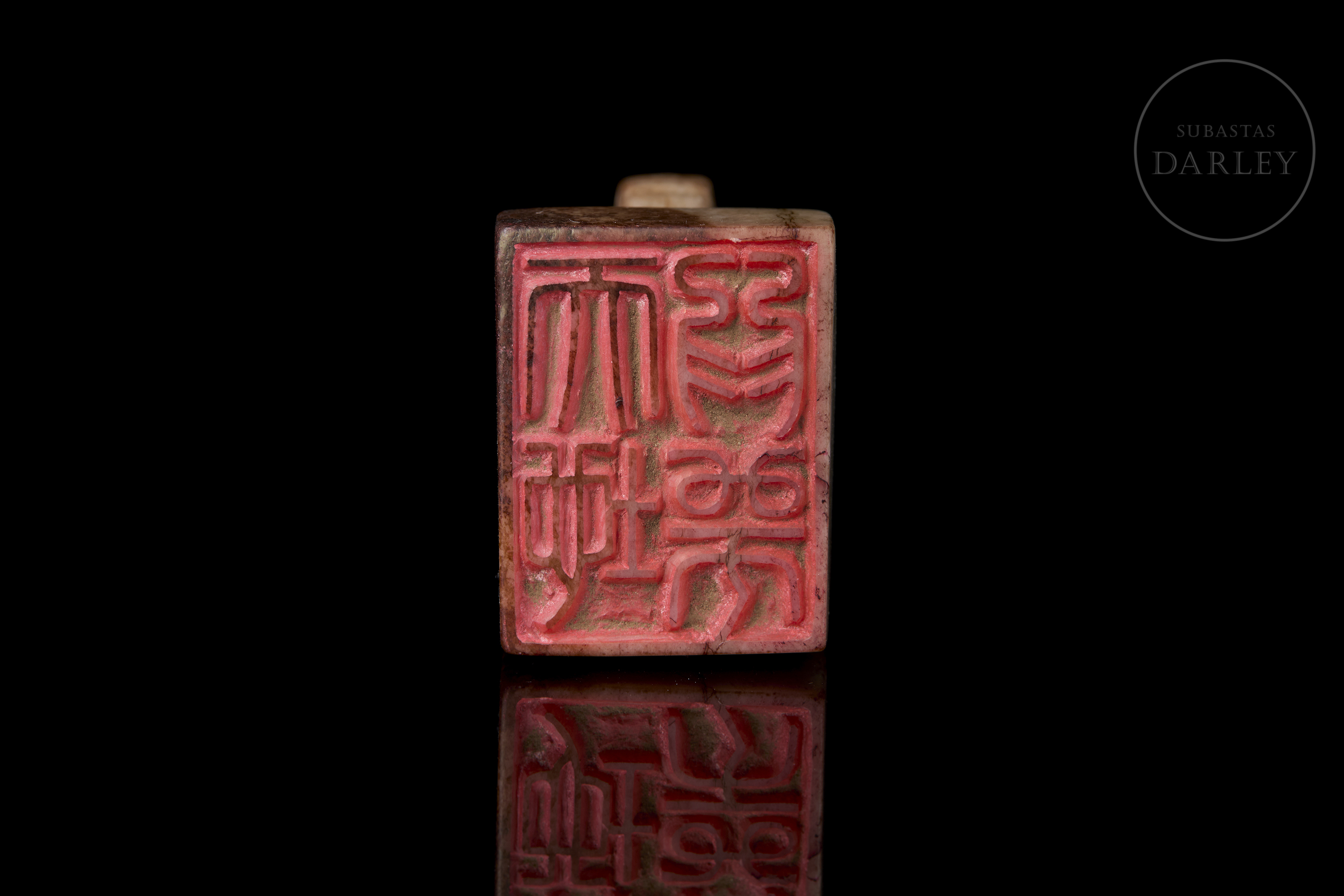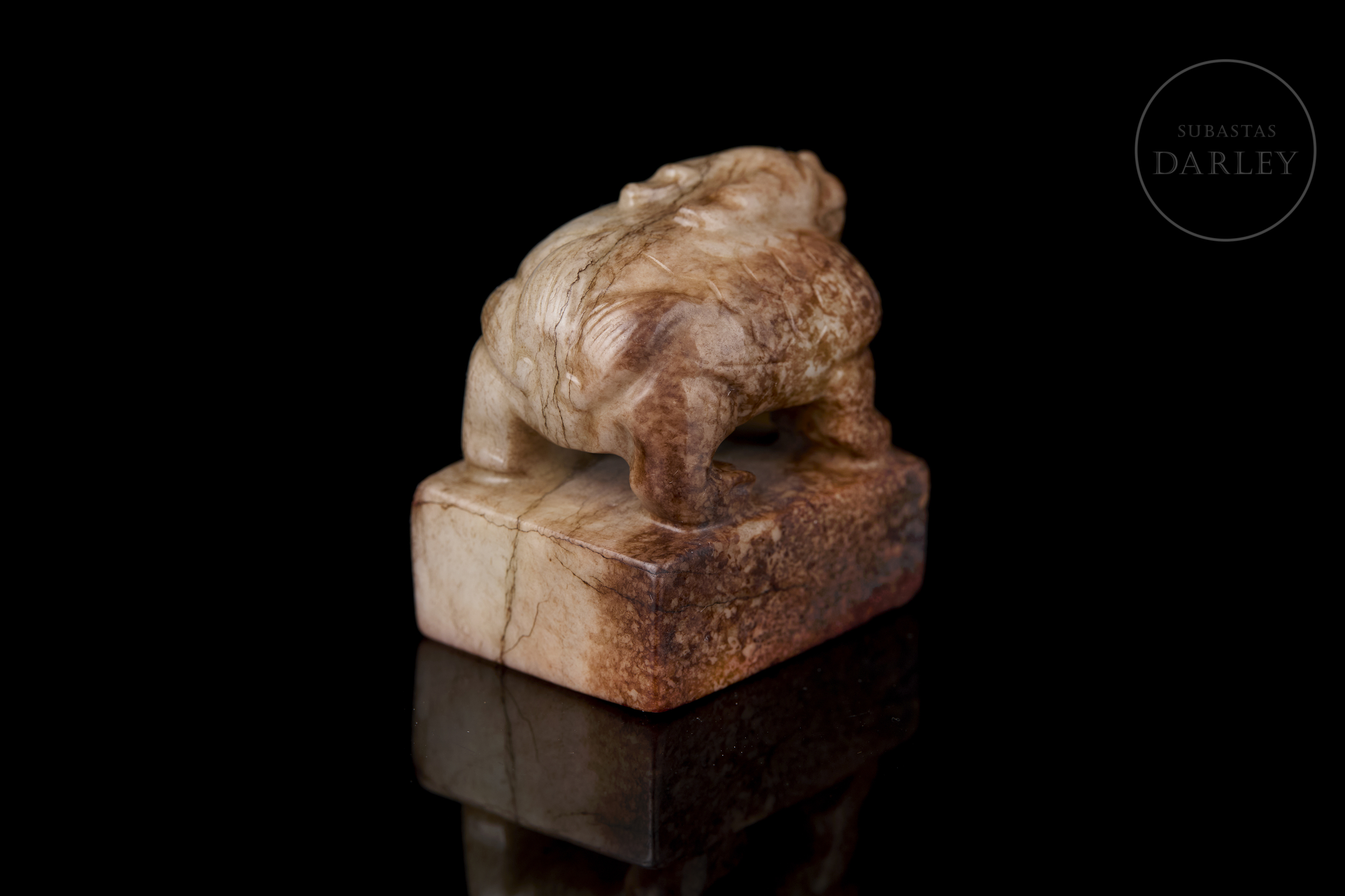 Rectangular jade seal, finely carved from a pale ochre-coloured material with natural darker orange veins. The upper edge is sculpted in the shape of a mythological beast, with the body of a turtle and the face of a dragon, with meticulous details. The smooth base bears four incised characters, ‘天地为师’ , with traces of red sealing wax.