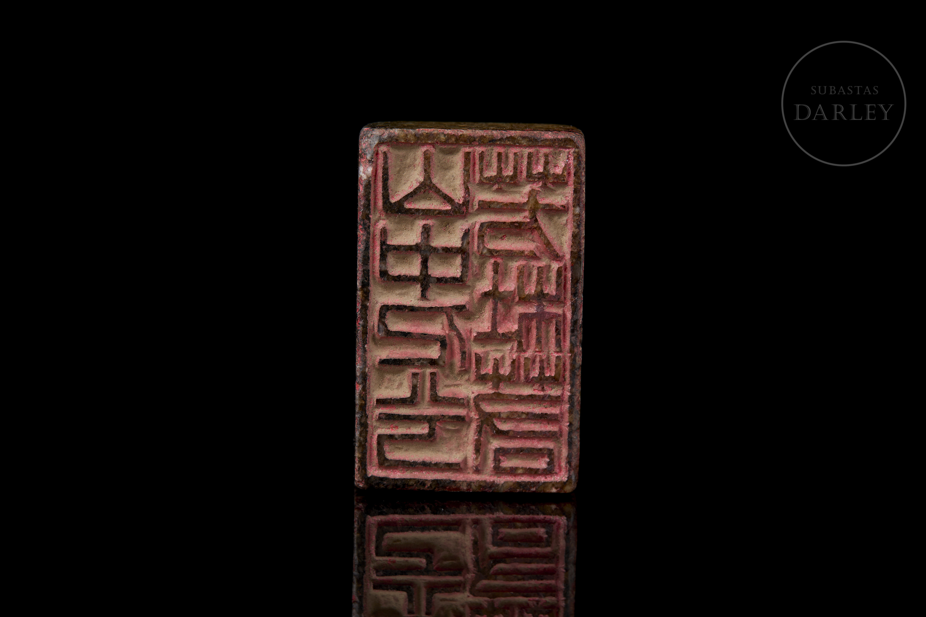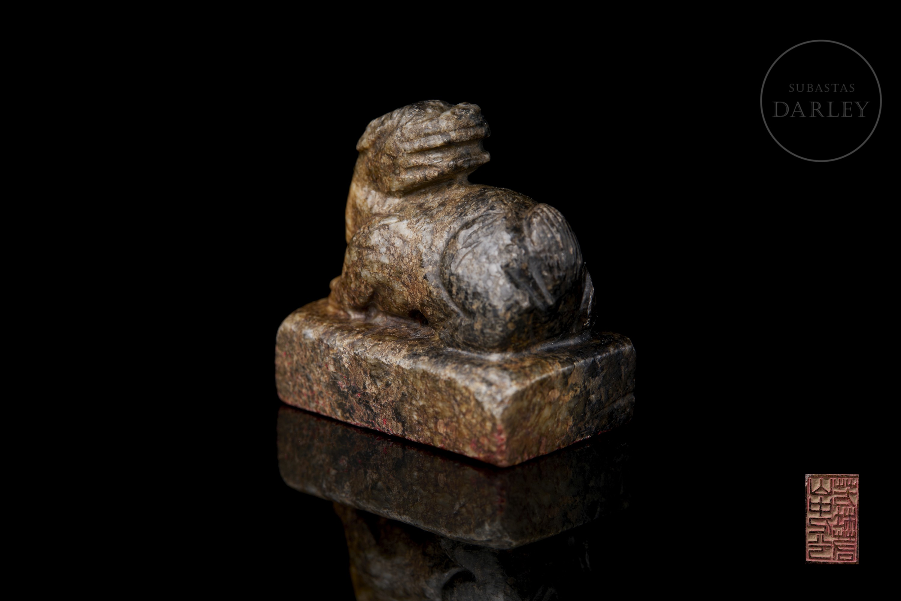 Brown and greyish jade seal with natural patina, crowned by the figure of a reclining mythical animal with schematic features and a compact body. The rectangular base bears a seal in sigillary characters with the inscription ‘山中人兮芳杜若’.