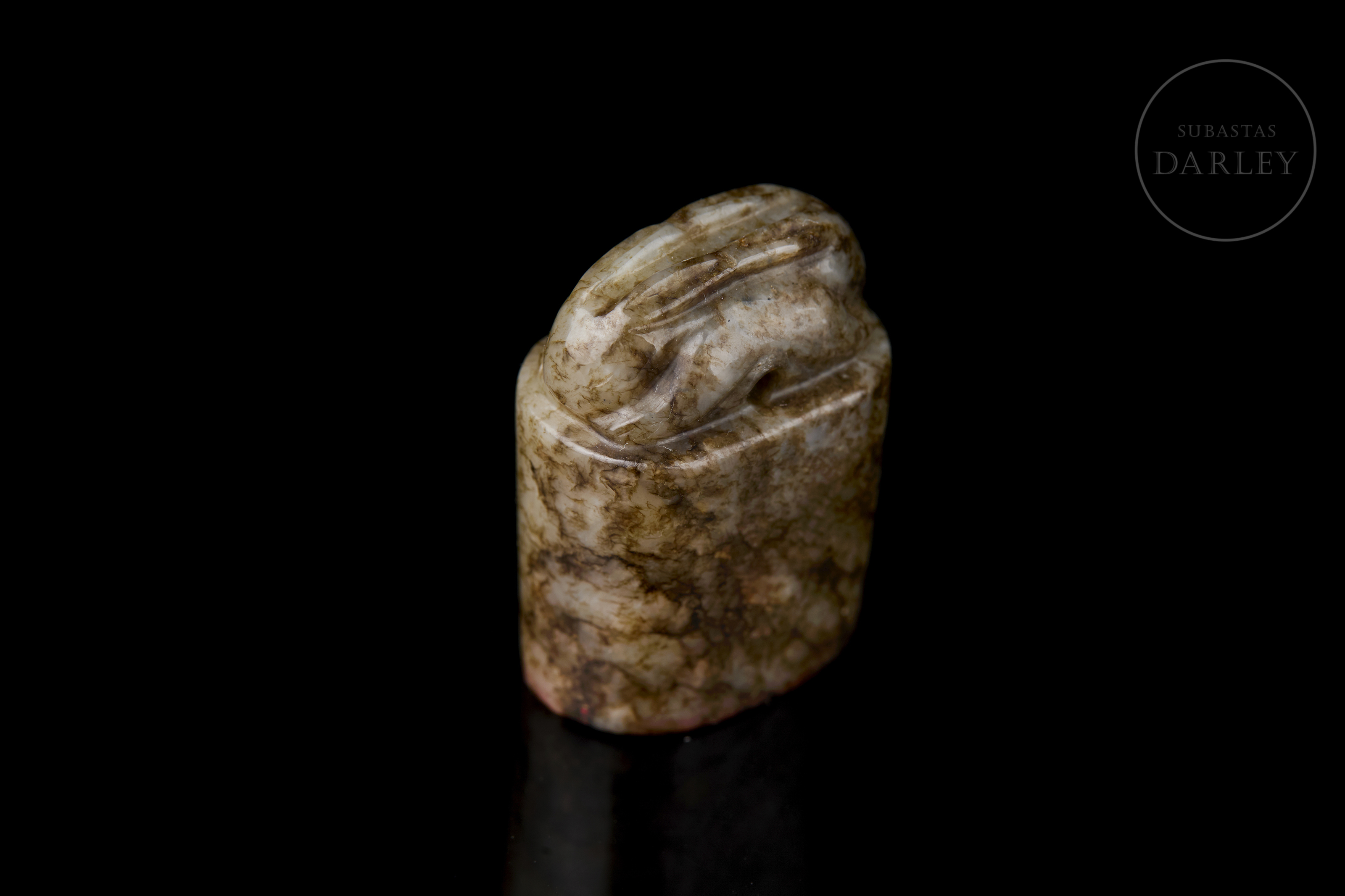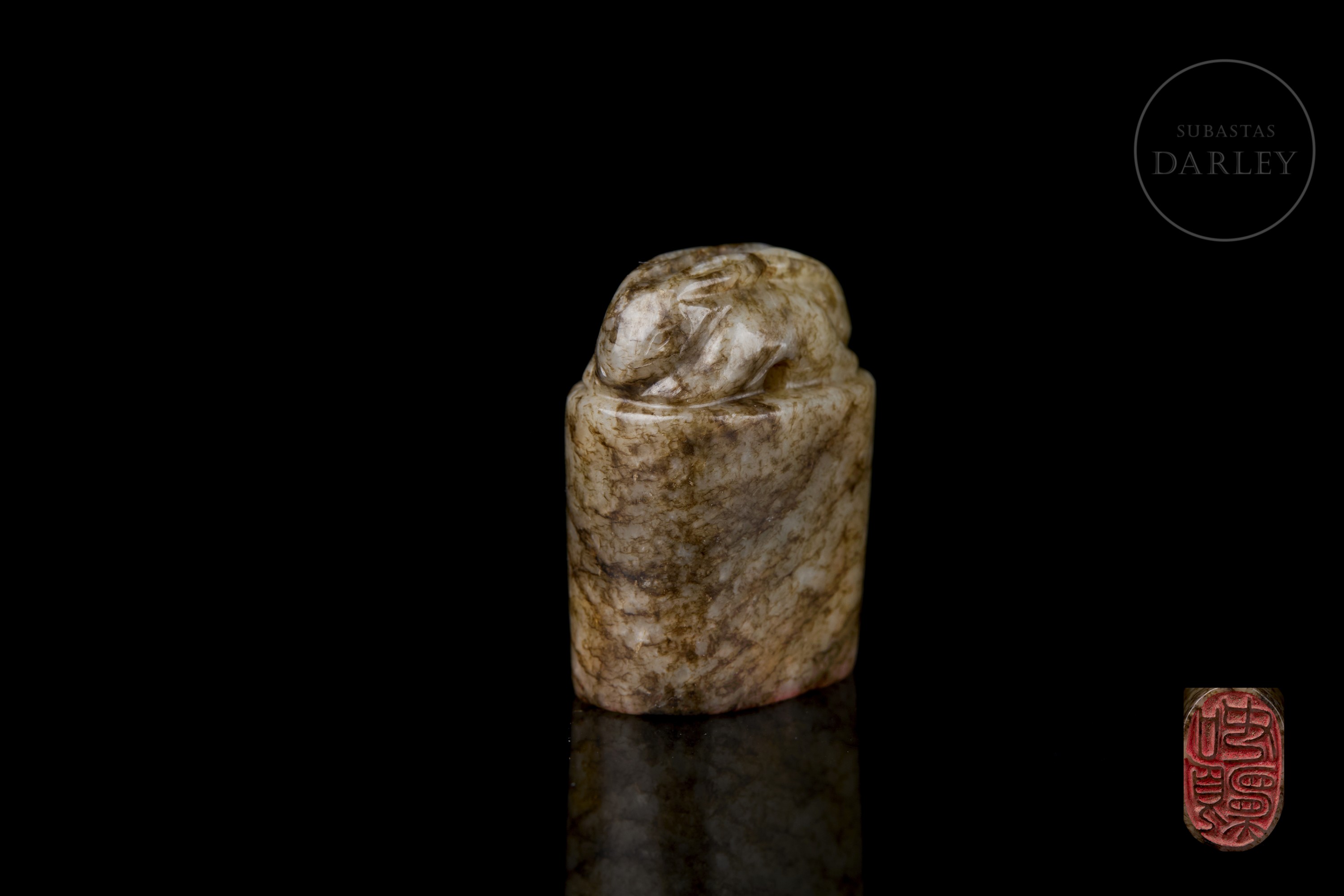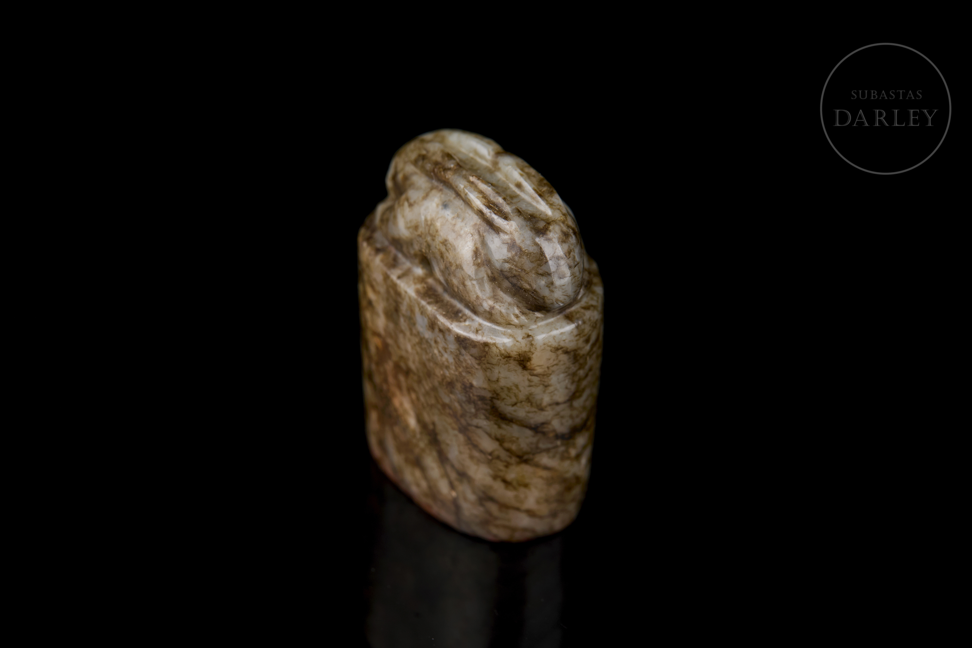 Small oval-shaped jade seal with a mottled patina in shades of brown and ochre. The upper part is crowned by the figure of a crouching rabbit, with compact and simple lines. The base bears the inscription ‘如愿’ in bas-relief.