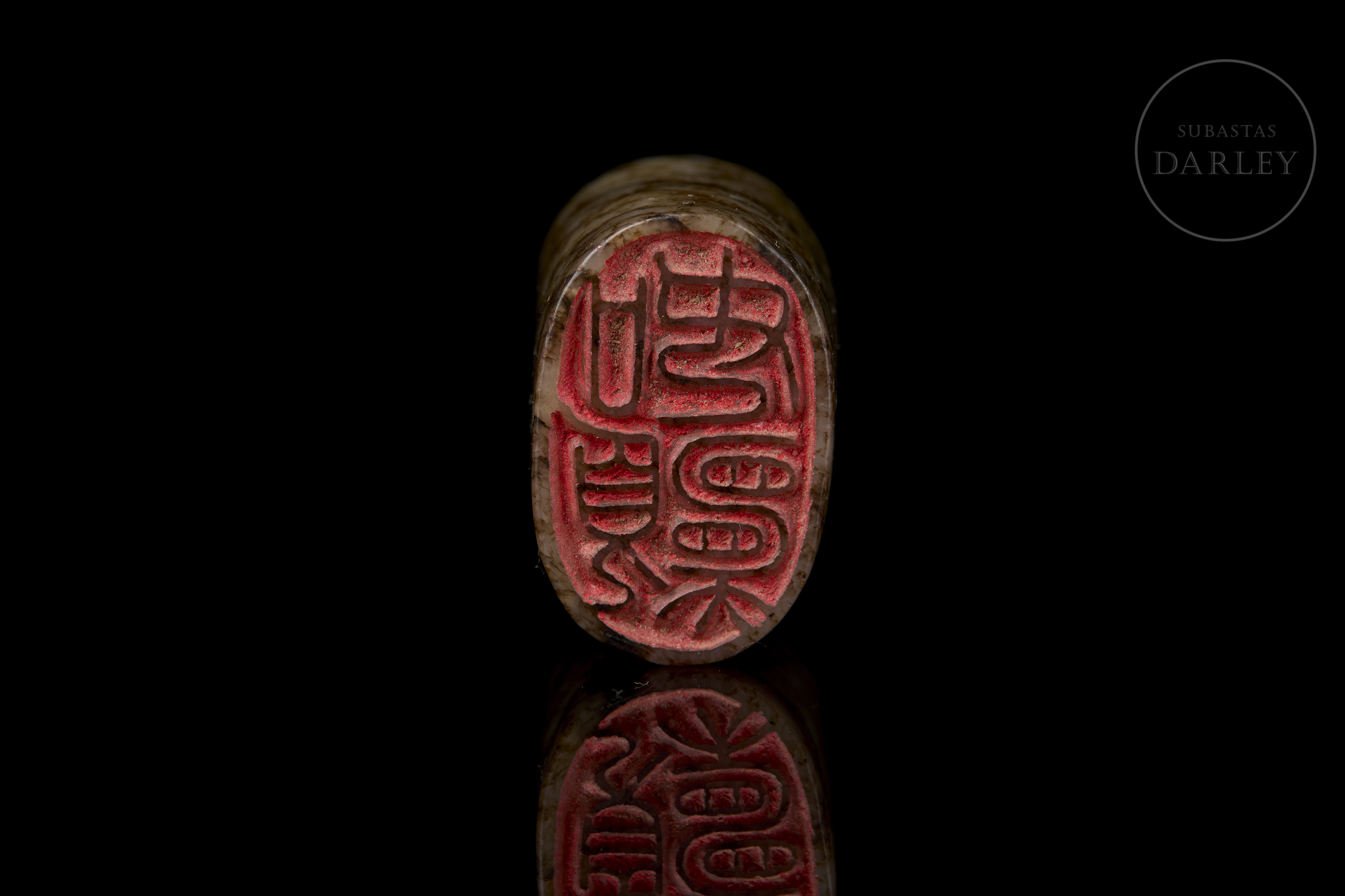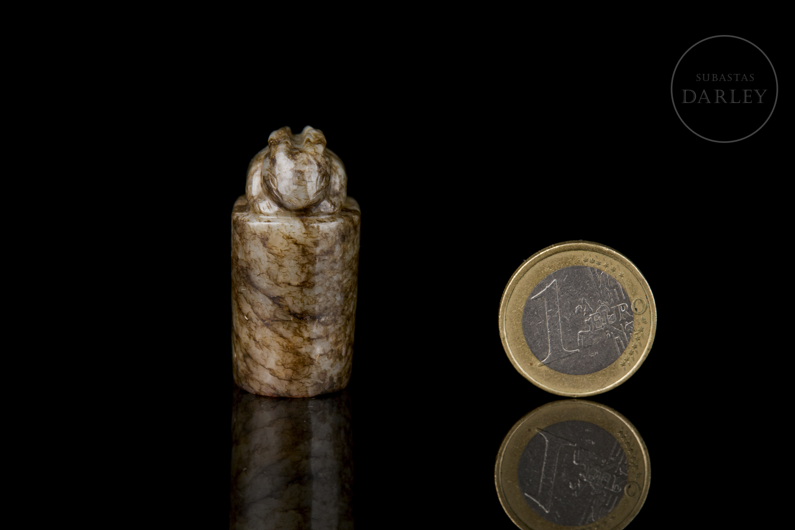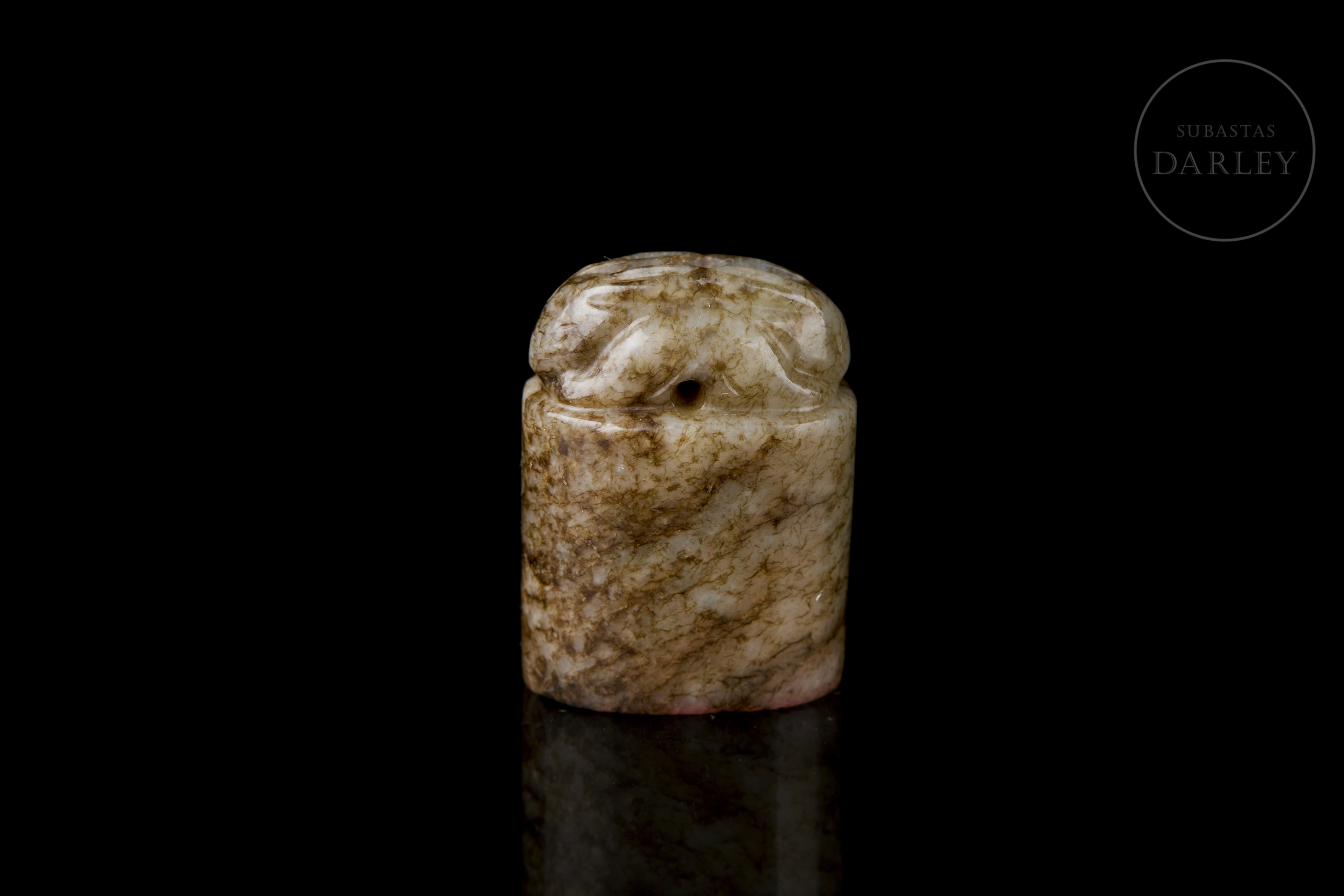 Small oval-shaped jade seal with a mottled patina in shades of brown and ochre. The upper part is crowned by the figure of a crouching rabbit, with compact and simple lines. The base bears the inscription ‘如愿’ in bas-relief.