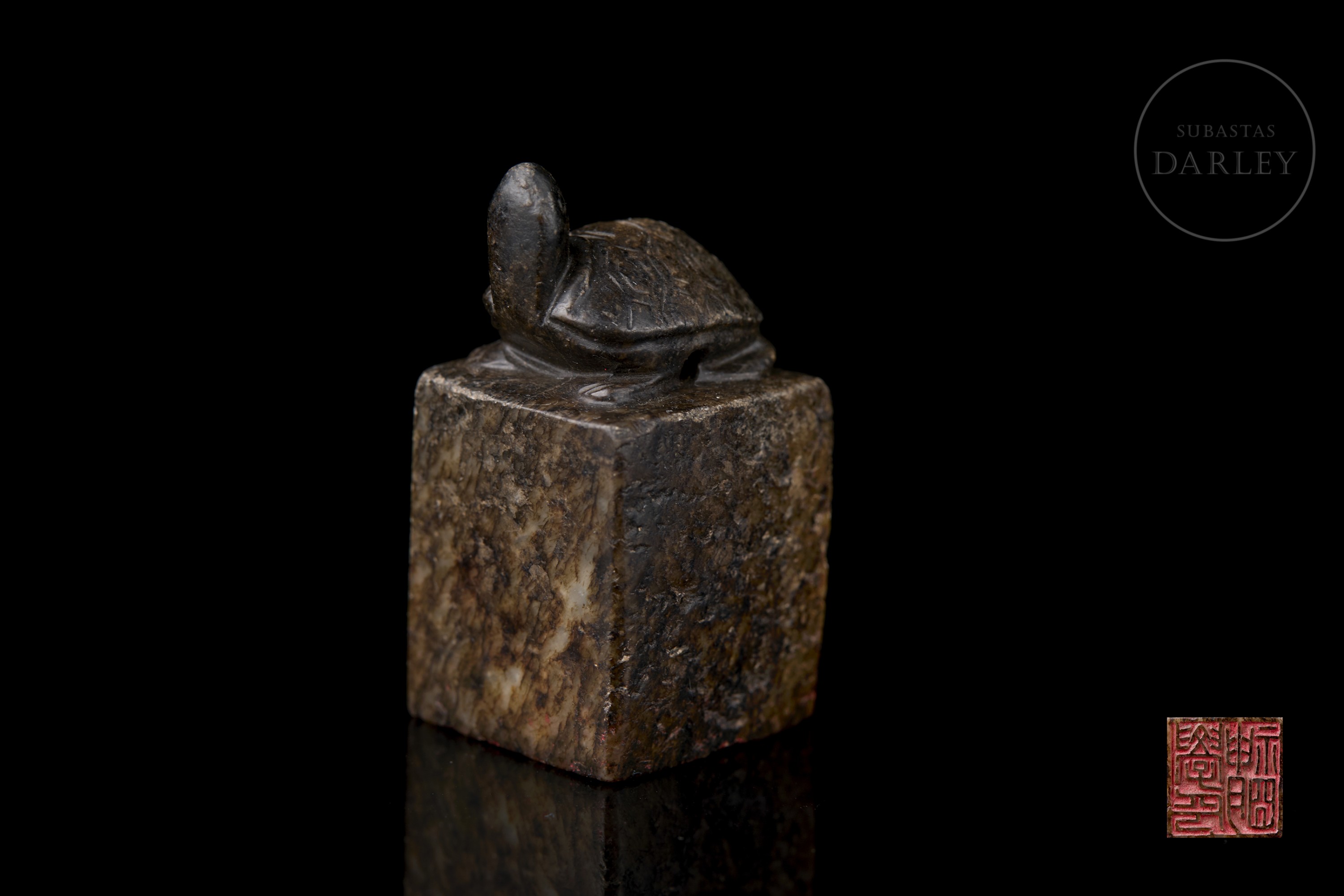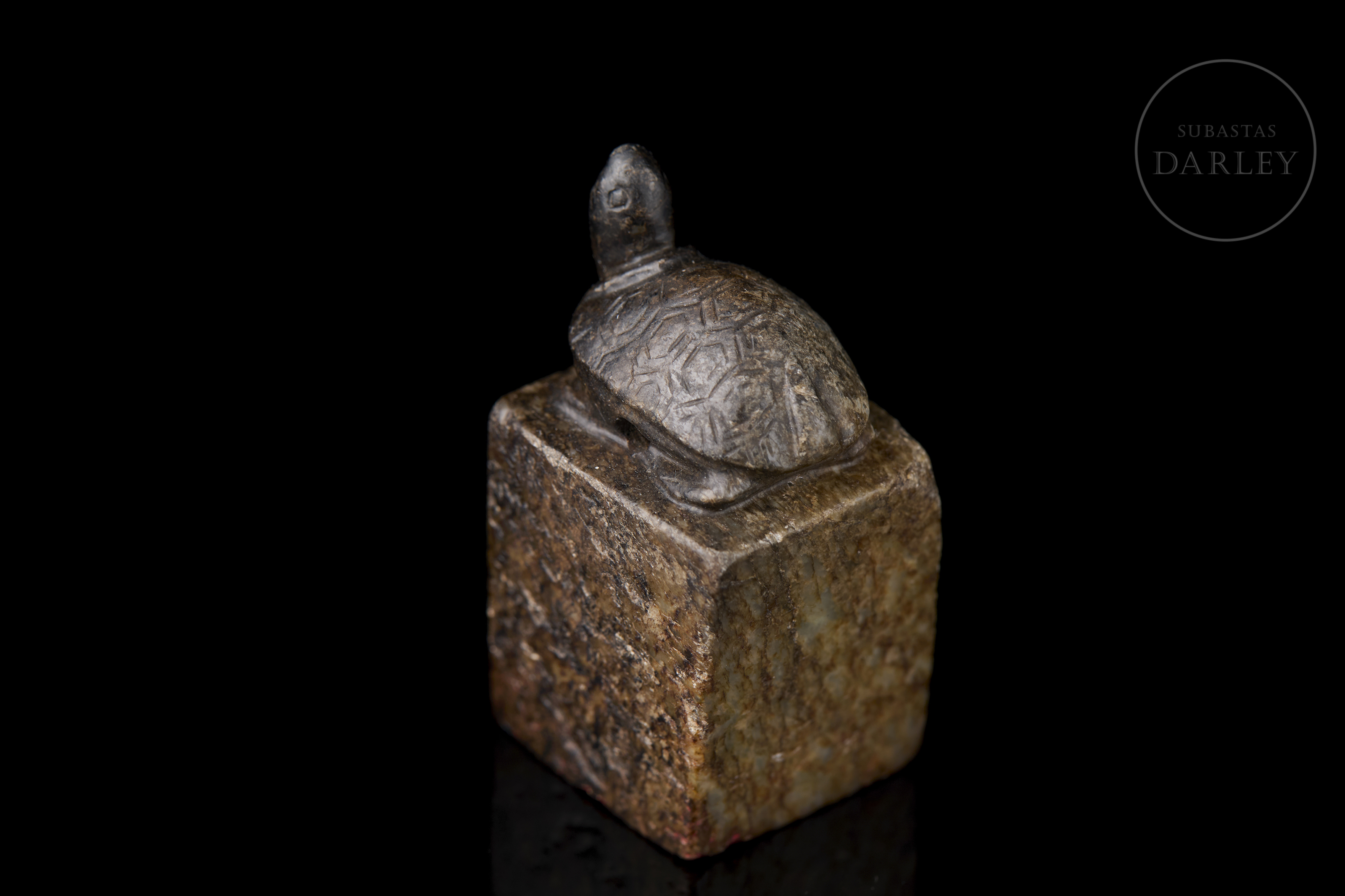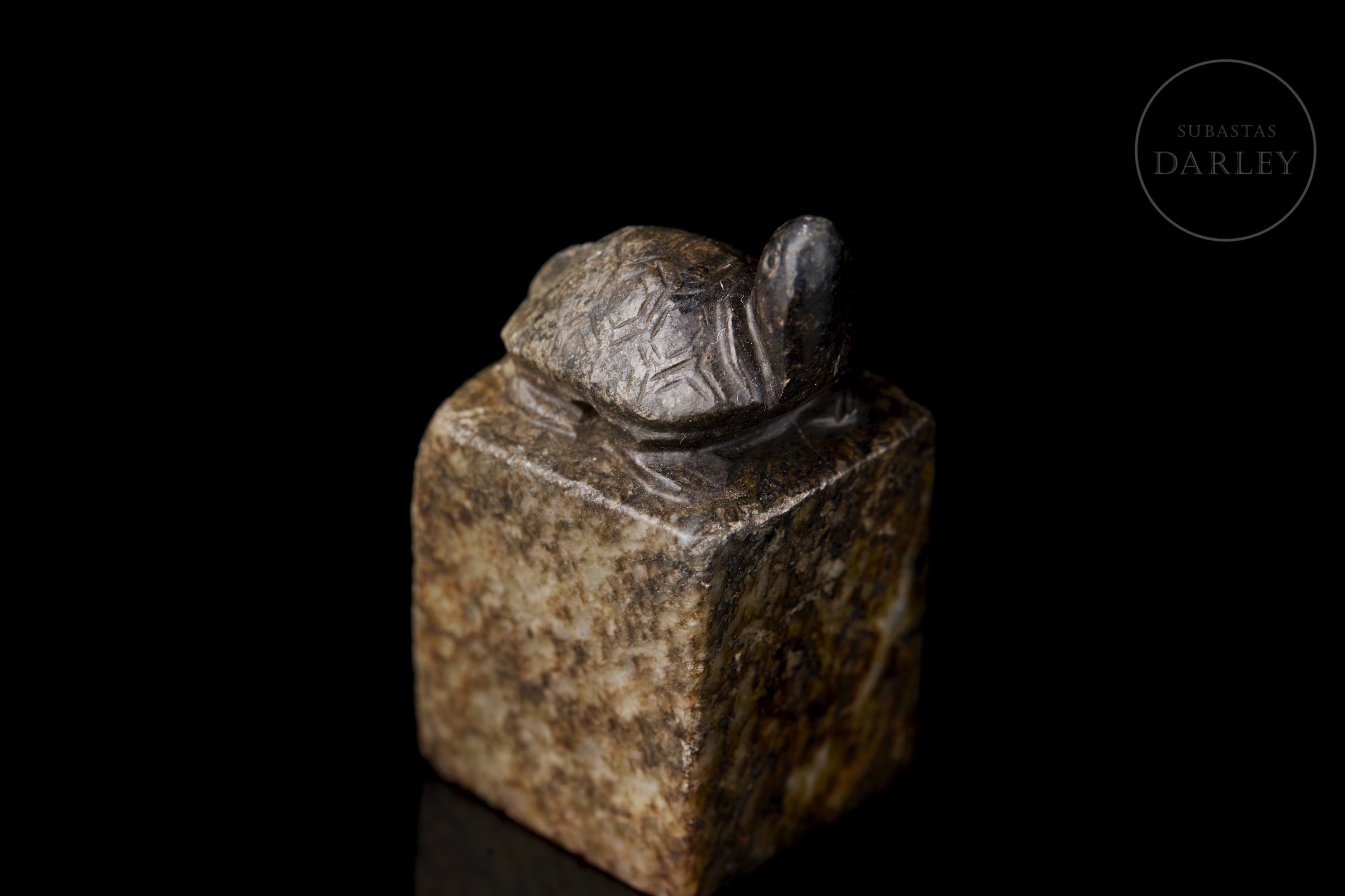 Brown-toned jade seal with patina, crowned by a relief figure of a turtle, with the shell decorated with geometric incisions. The rectangular base features the seal carved with the characters ‘学乎神明’.