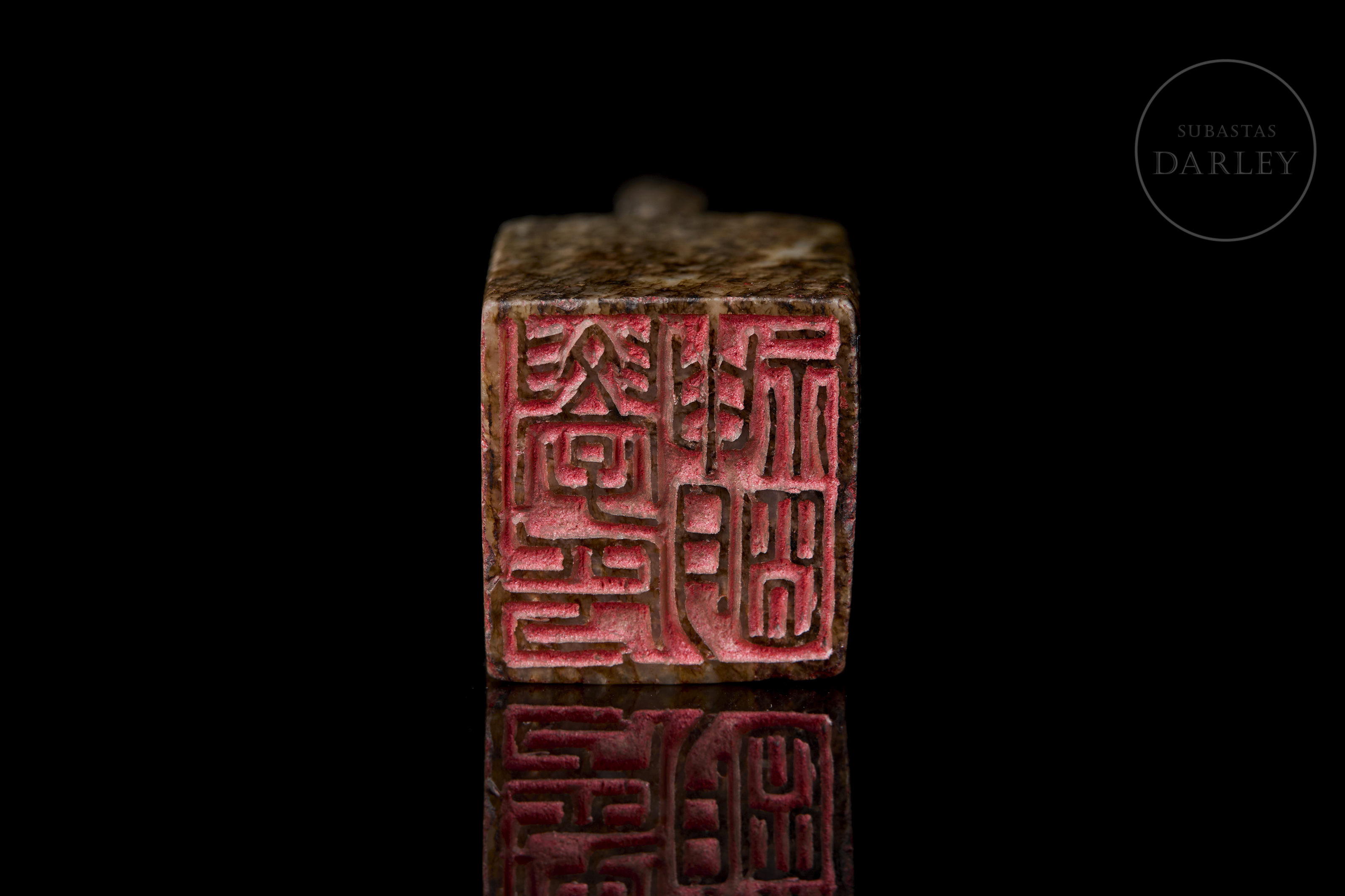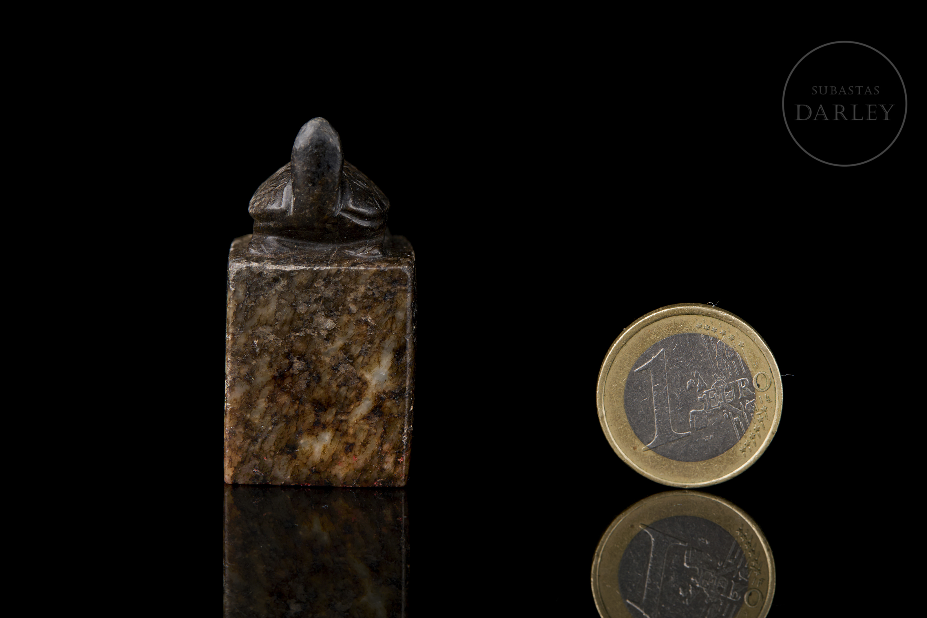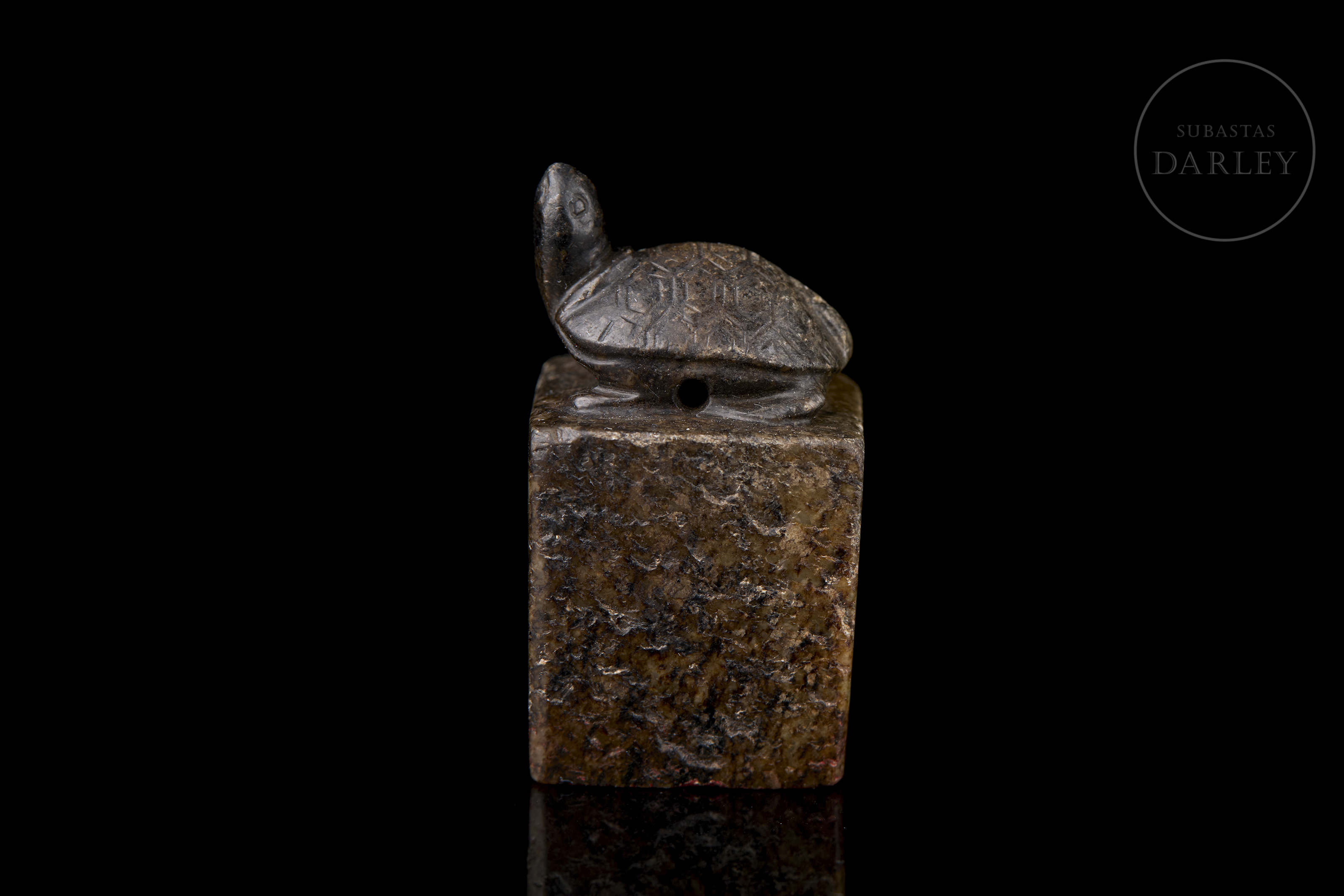 Brown-toned jade seal with patina, crowned by a relief figure of a turtle, with the shell decorated with geometric incisions. The rectangular base features the seal carved with the characters ‘学乎神明’.