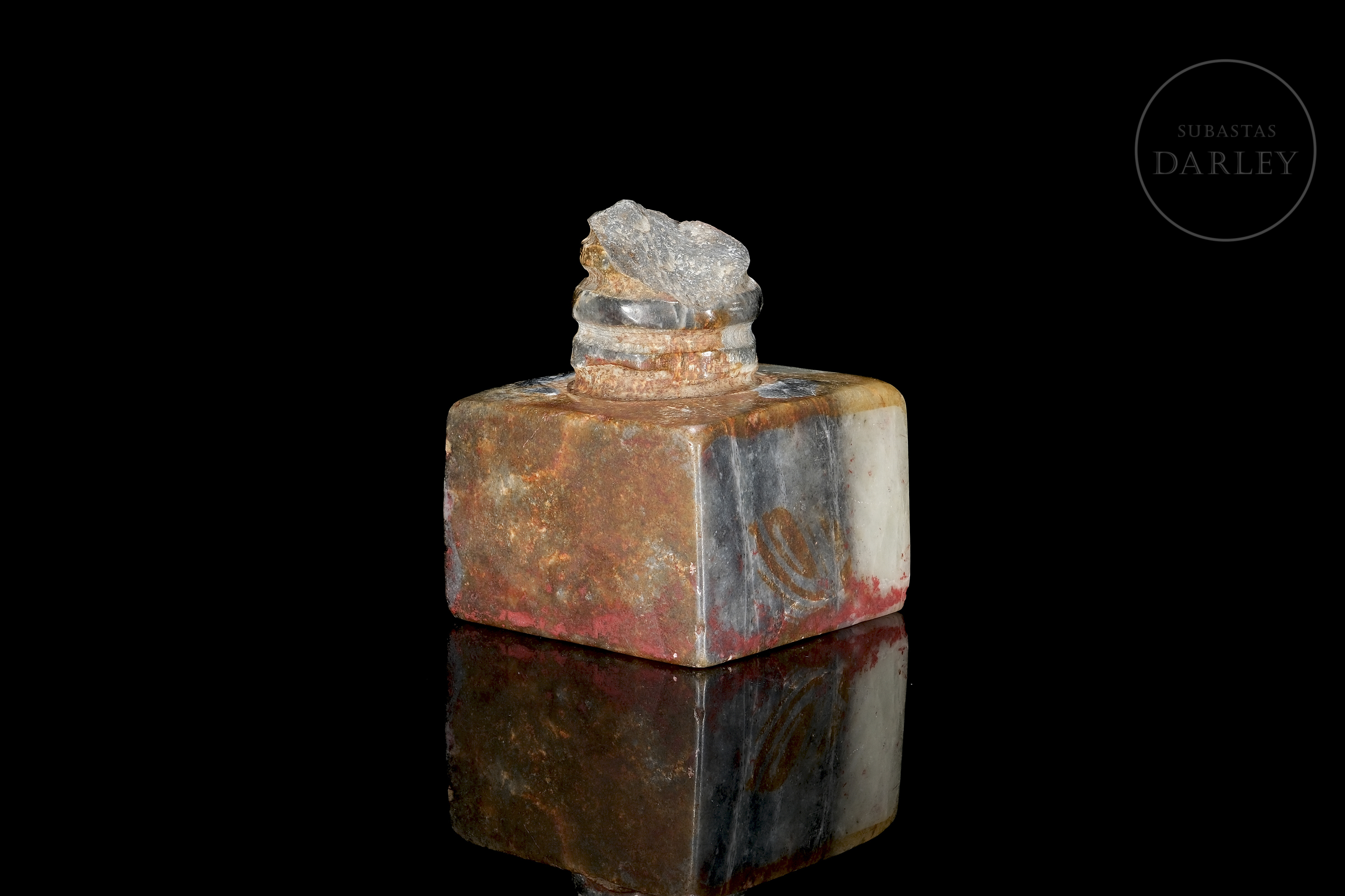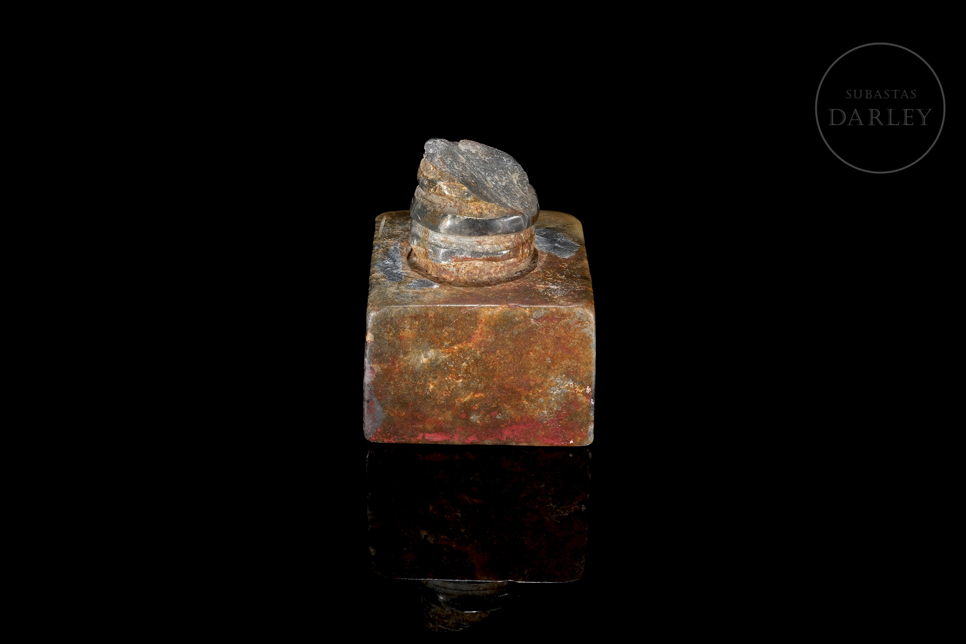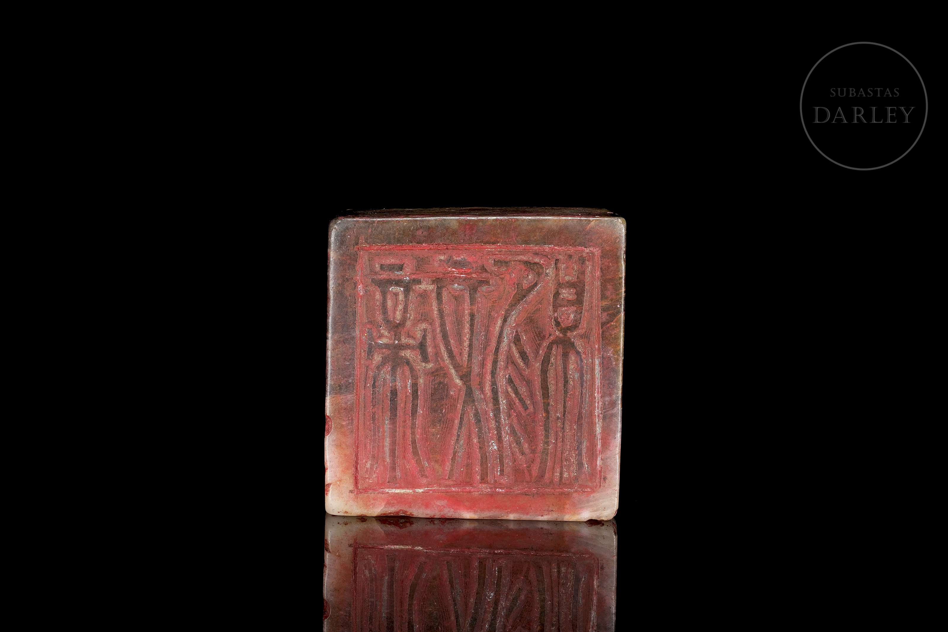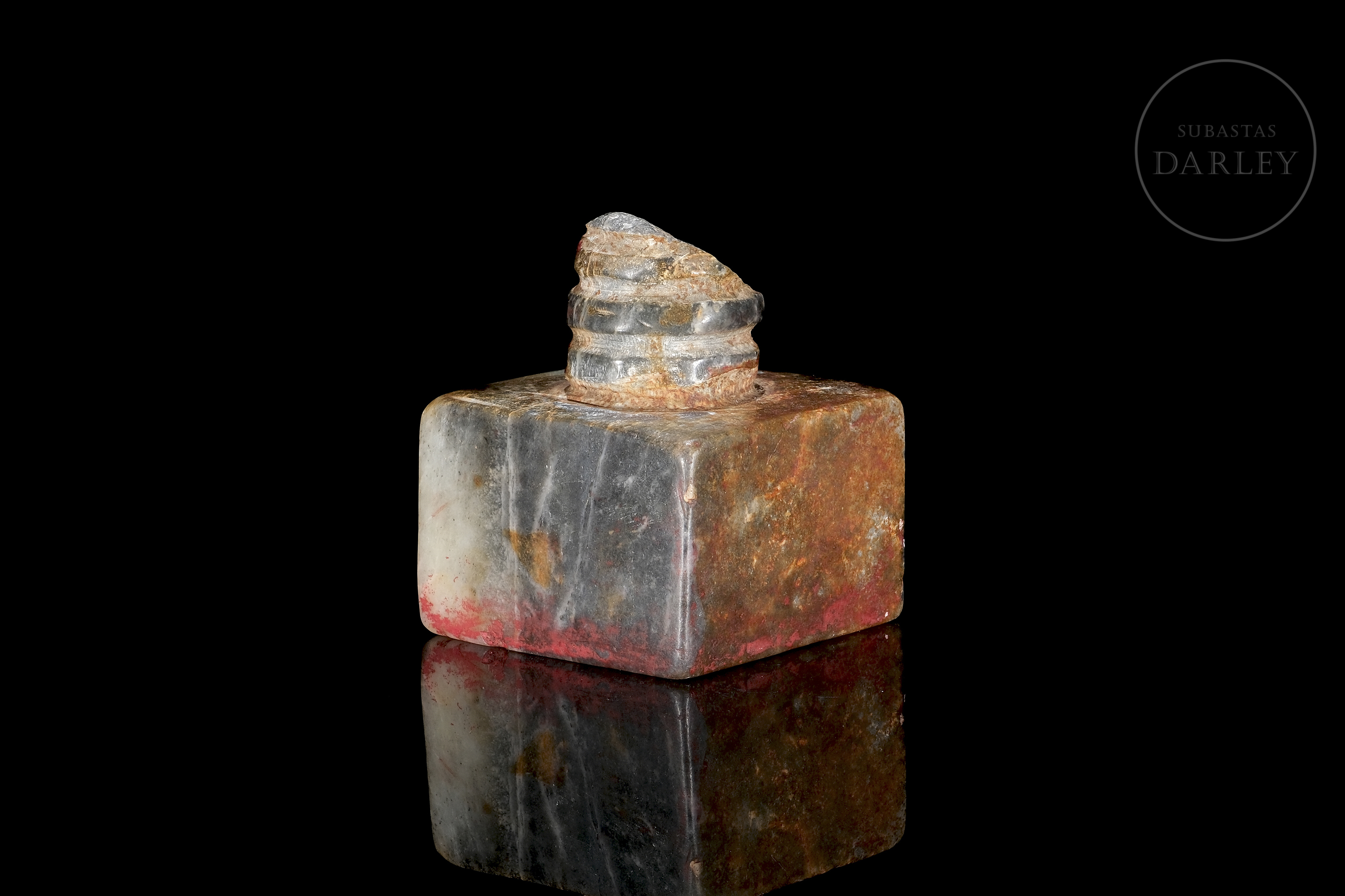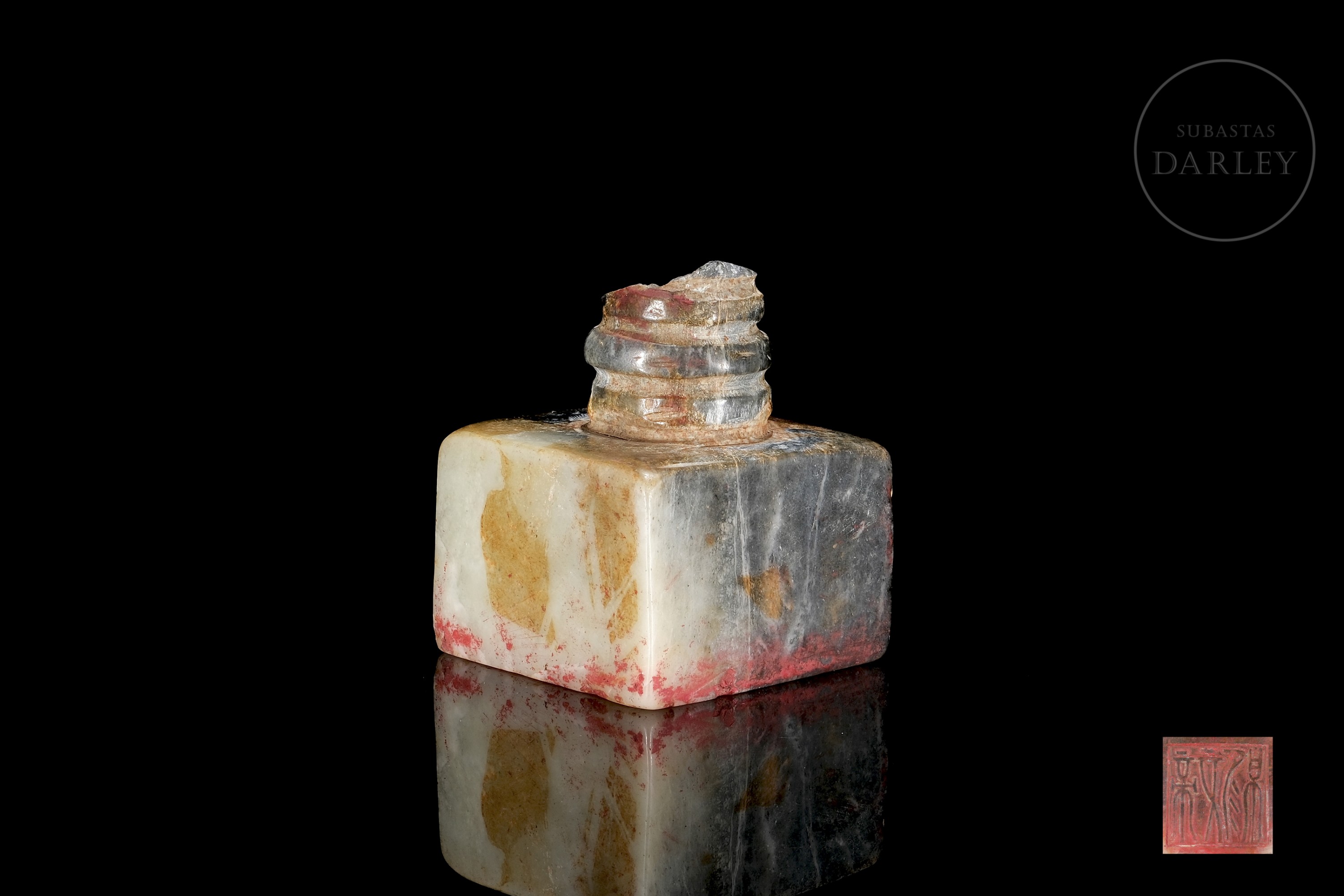 Seal carved from Shoushan stone with cream, reddish and grey veins. The piece has a square base, topped by a decorative cylinder with carved rings. The base has four characters in relief with traces of red sealing wax. Size: 7.5 x 5.8 x 5.8 cm