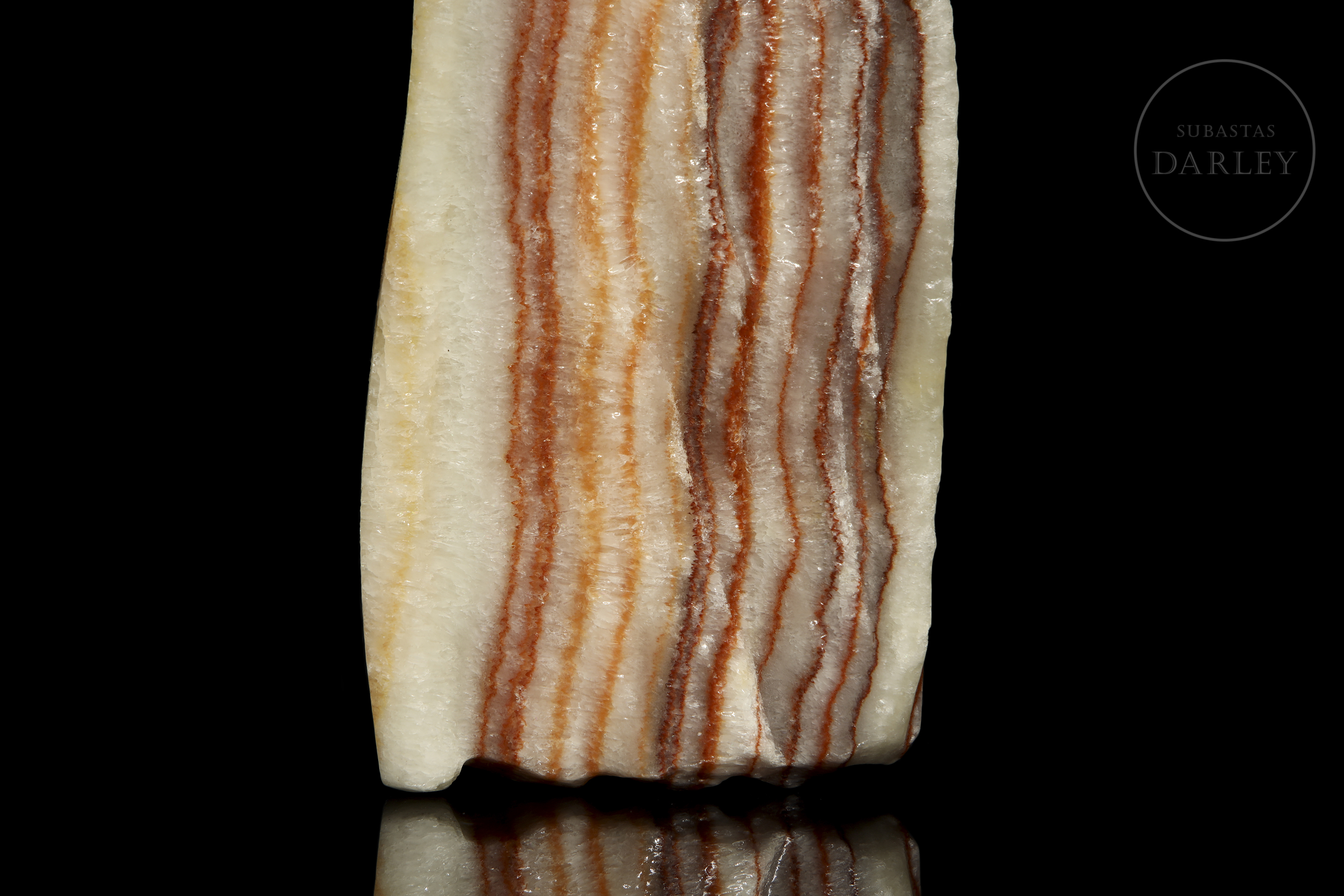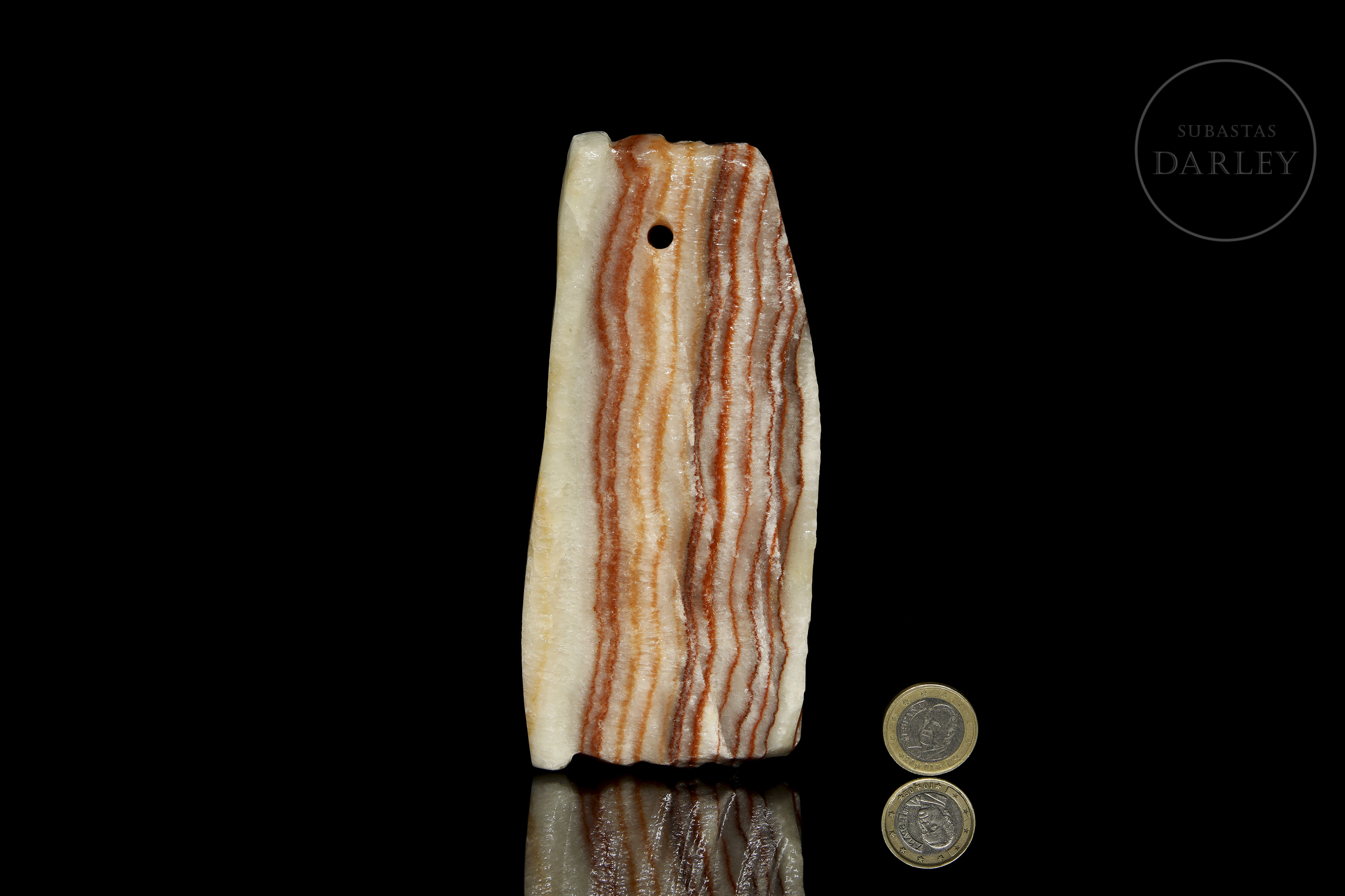 Pendant made of reddish and white stone, imitating the characteristic marbling of a piece of bacon. It has a circular hole at one end for hanging.