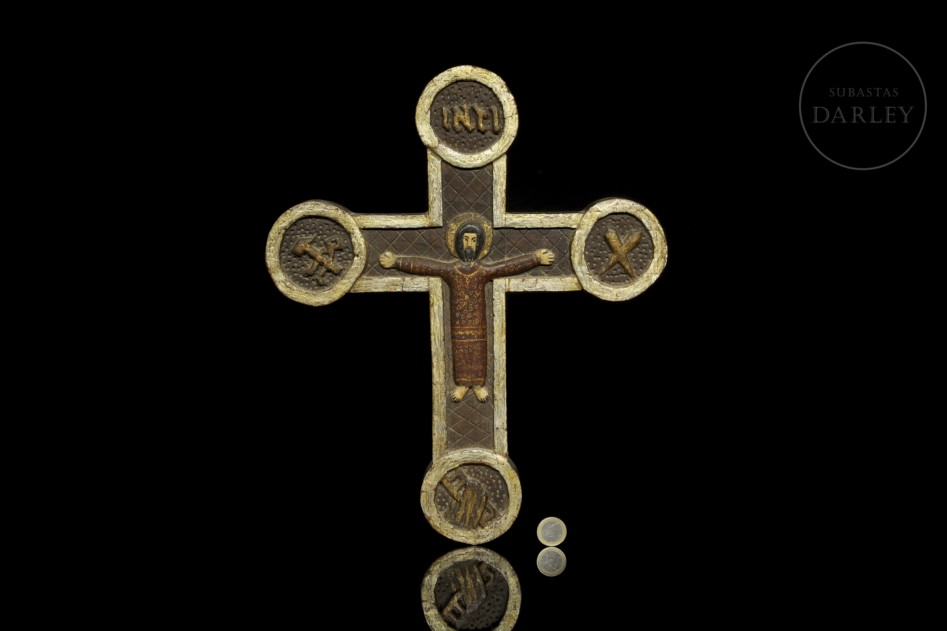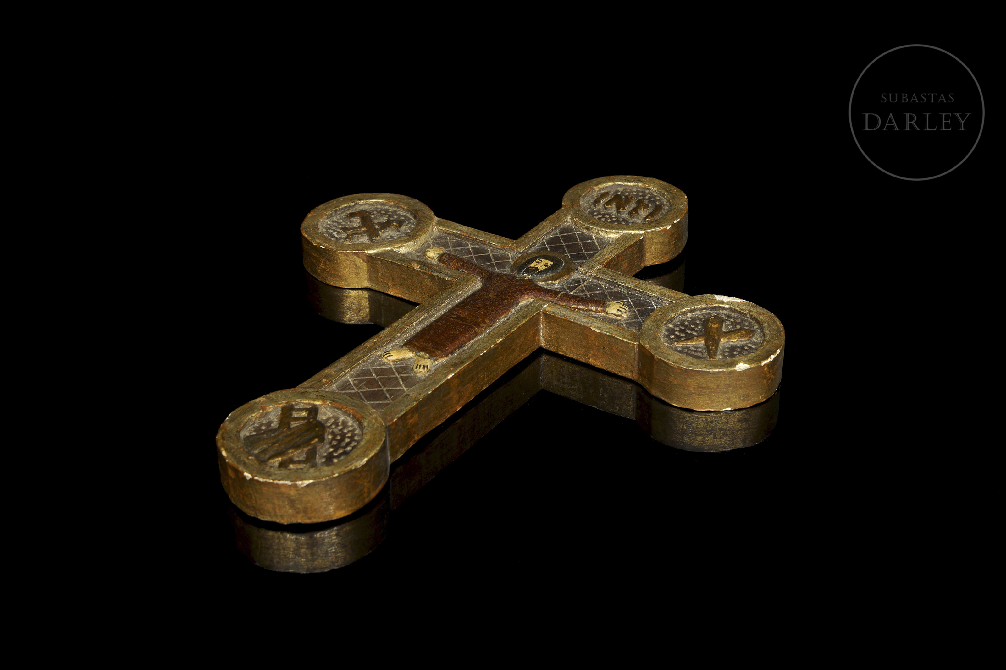 雕刻、彩绘并镀金的木质壁挂十字架,基督圣躯部分经彩绘处理。十字架主体饰有镌刻菱形纹样,两端顶部镶嵌圆形镀金徽章。