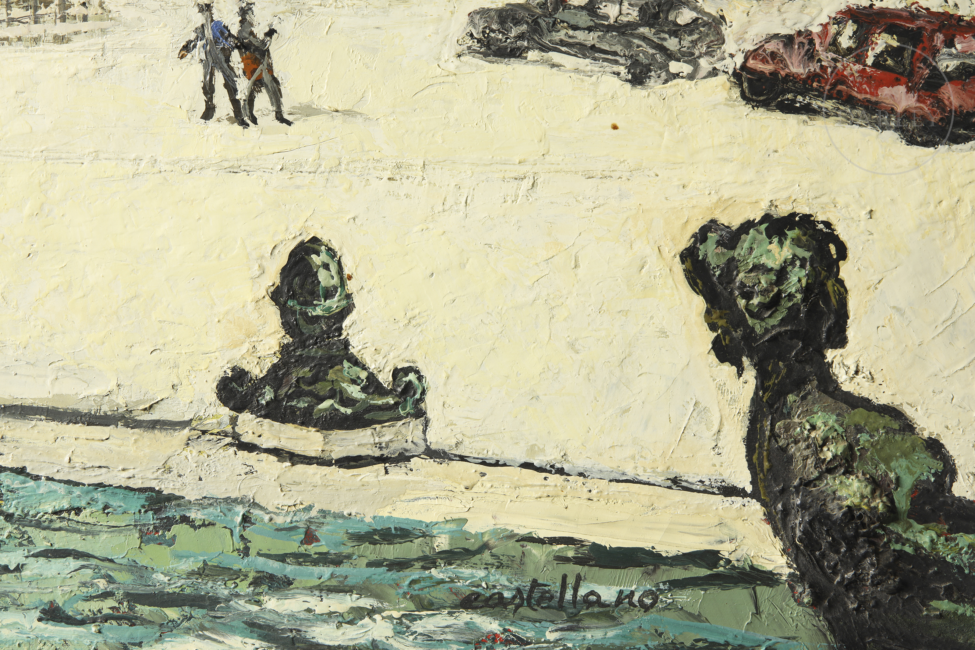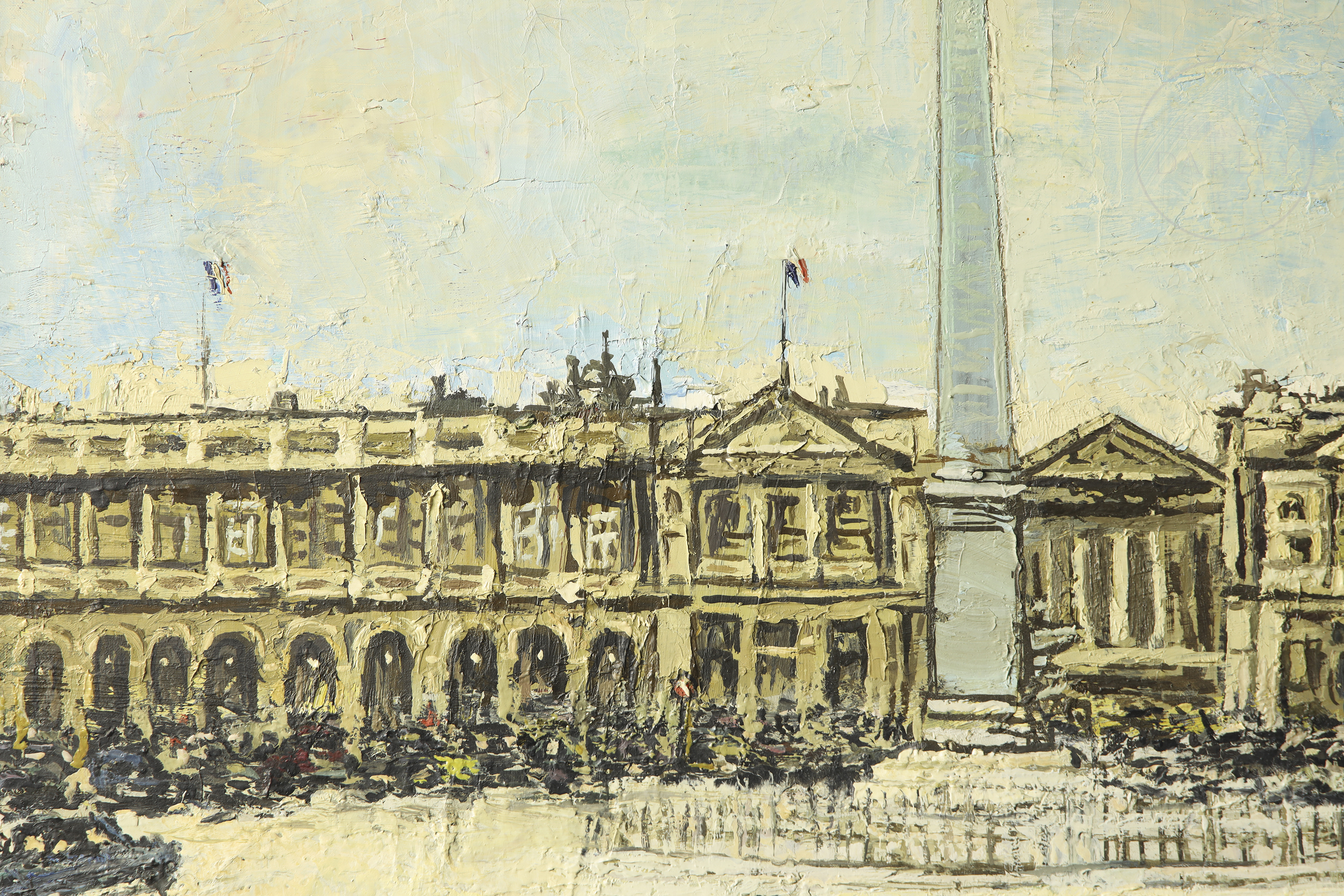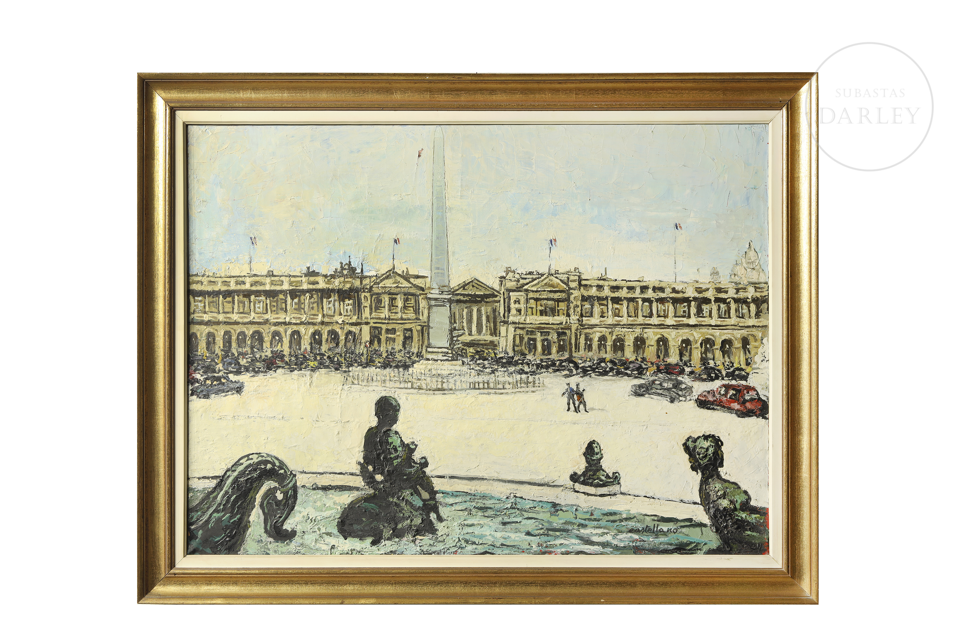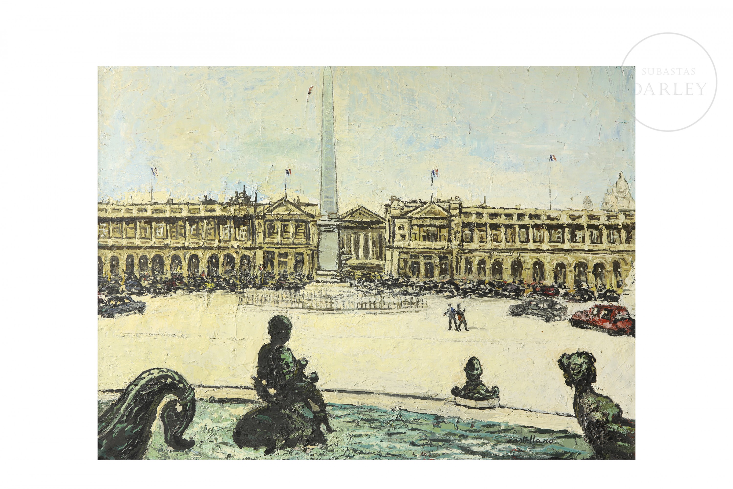 Mixed media on canvas, signed “Castellano” in the lower right corner. The work depicts a view of the Place de la Concorde in Paris with its characteristic obelisk, the neoclassical buildings flanking it, and the ornamental fountains in the foreground.