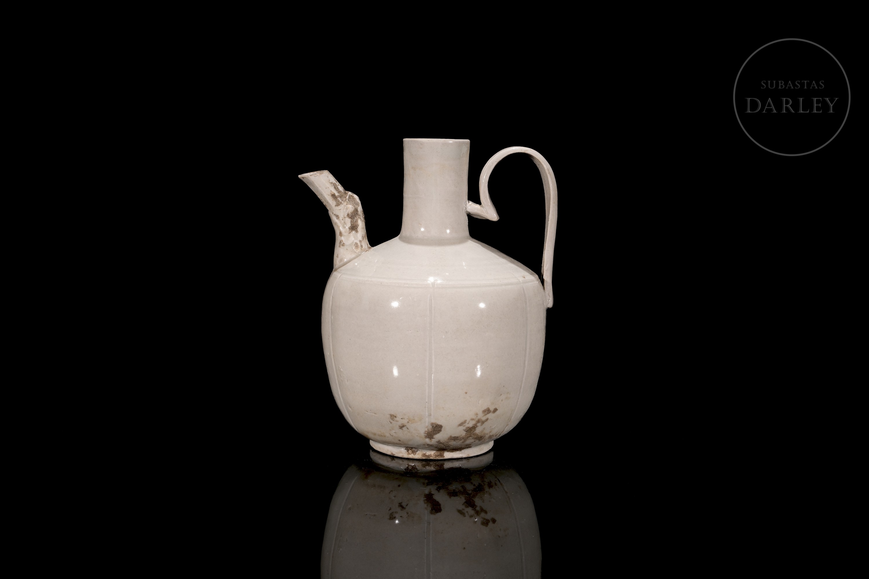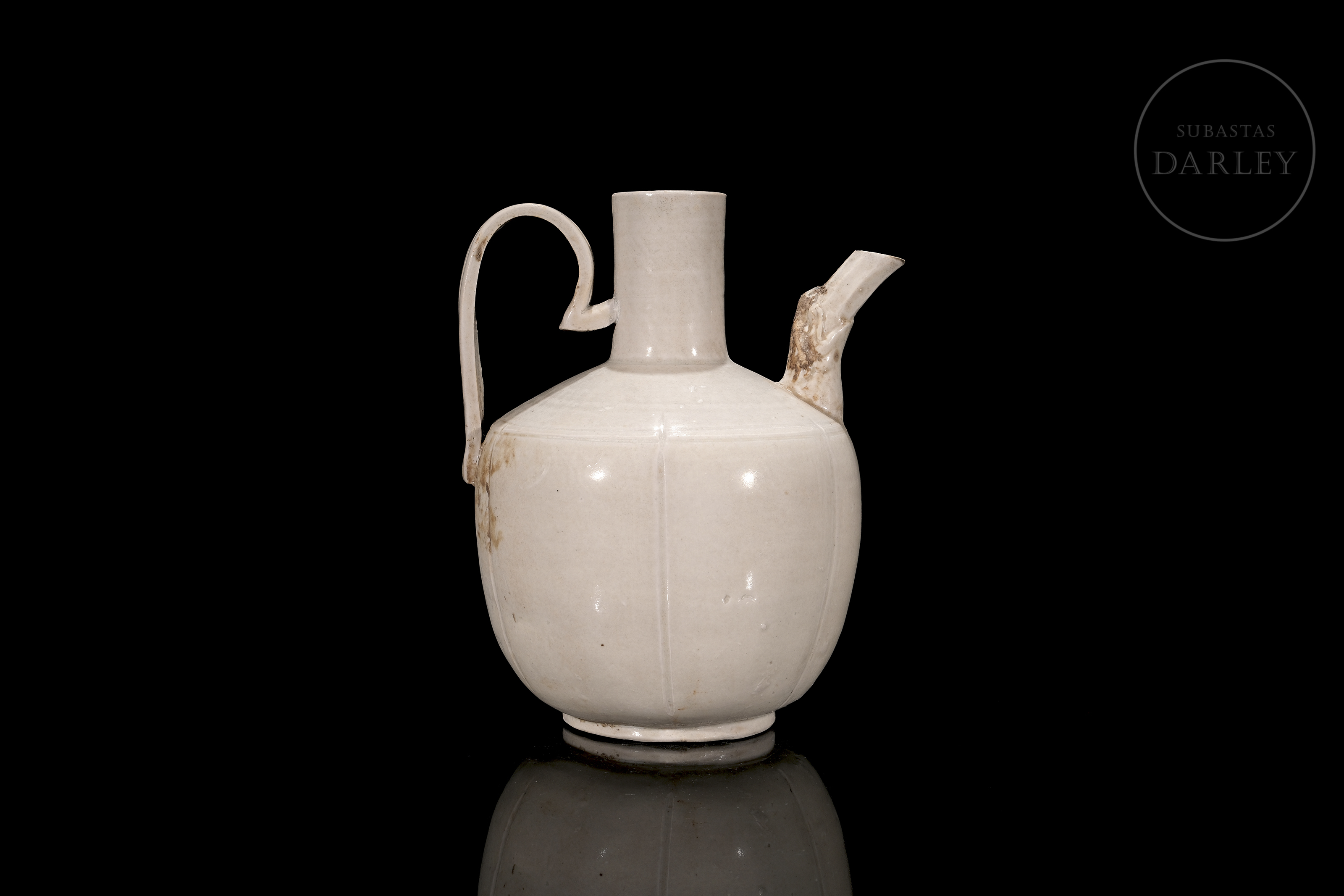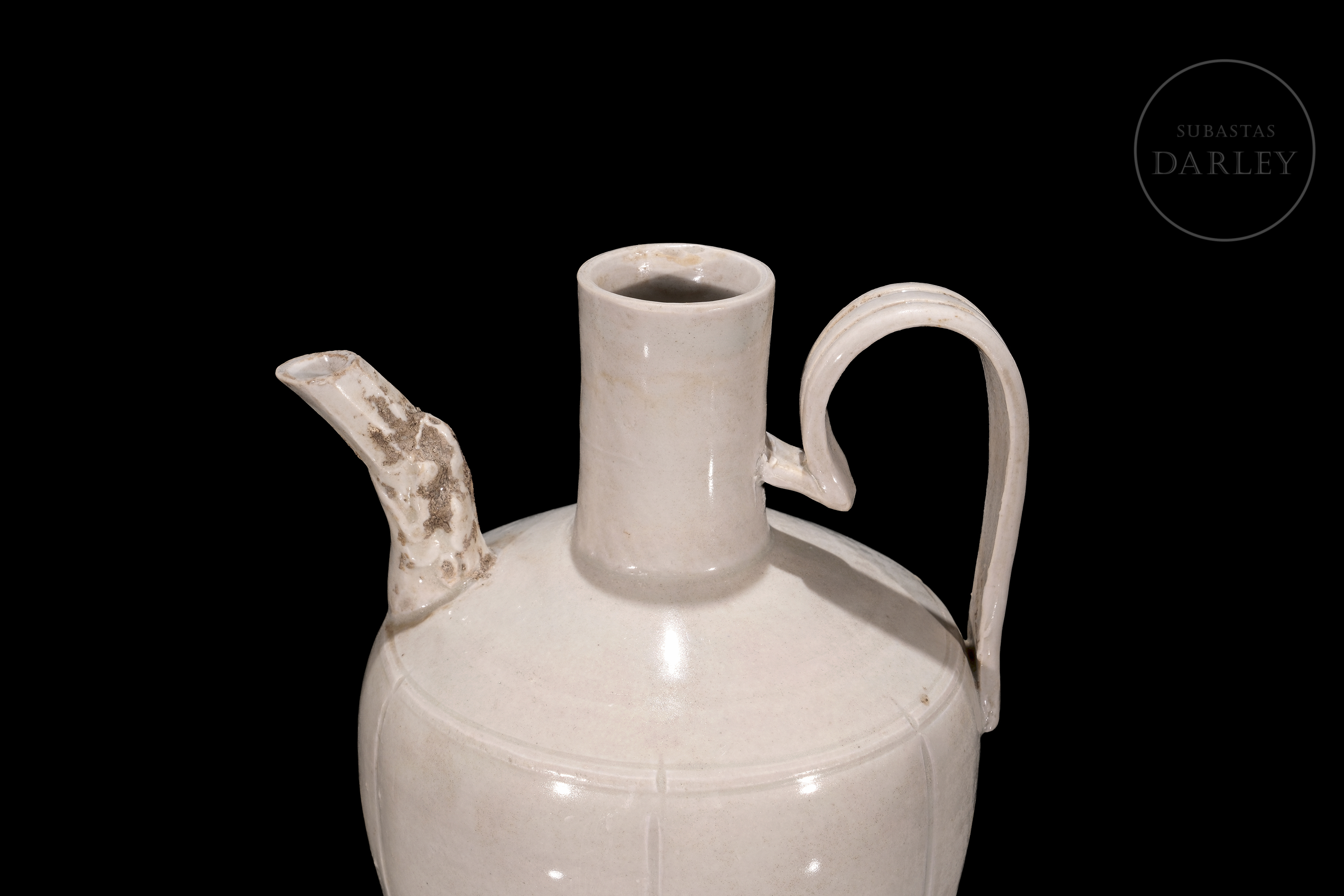Ding-type porcelain jug with a globular body divided by fine vertical ribs. The piece, with a high handle and short spout, is covered with an ivory-white glaze. The base is unglazed.