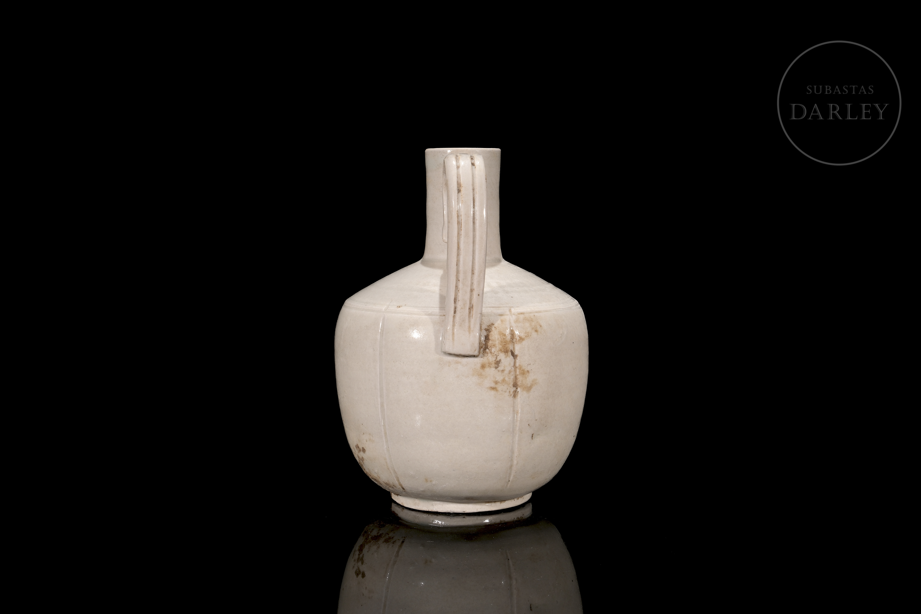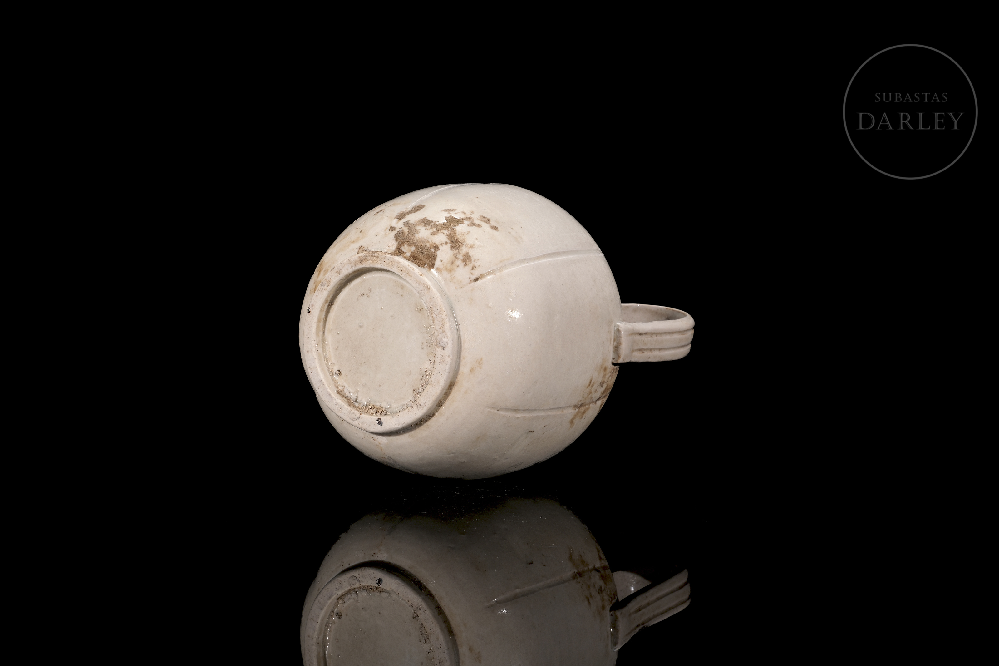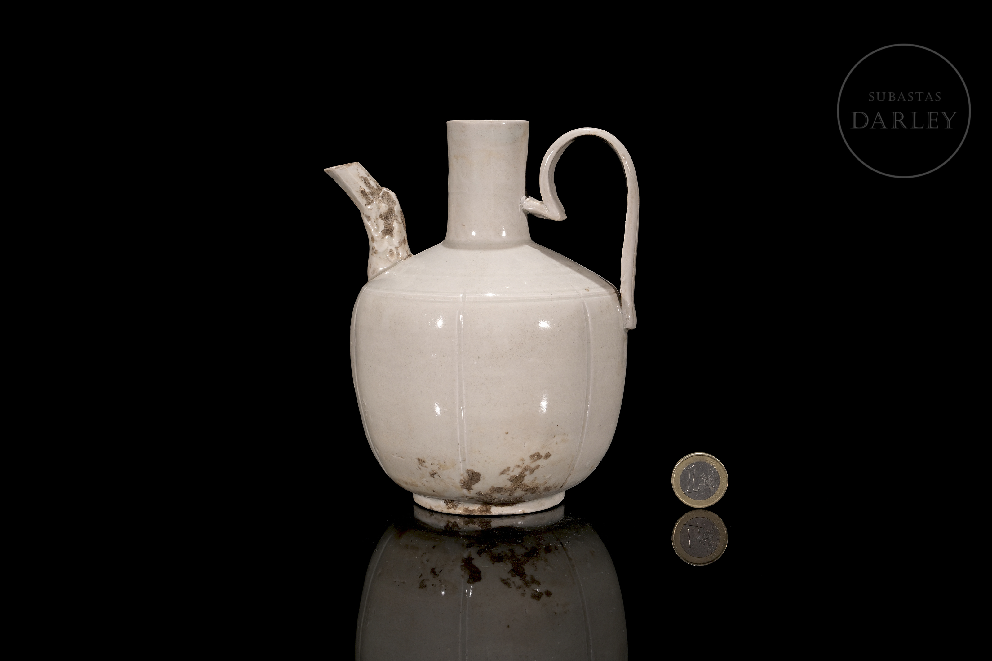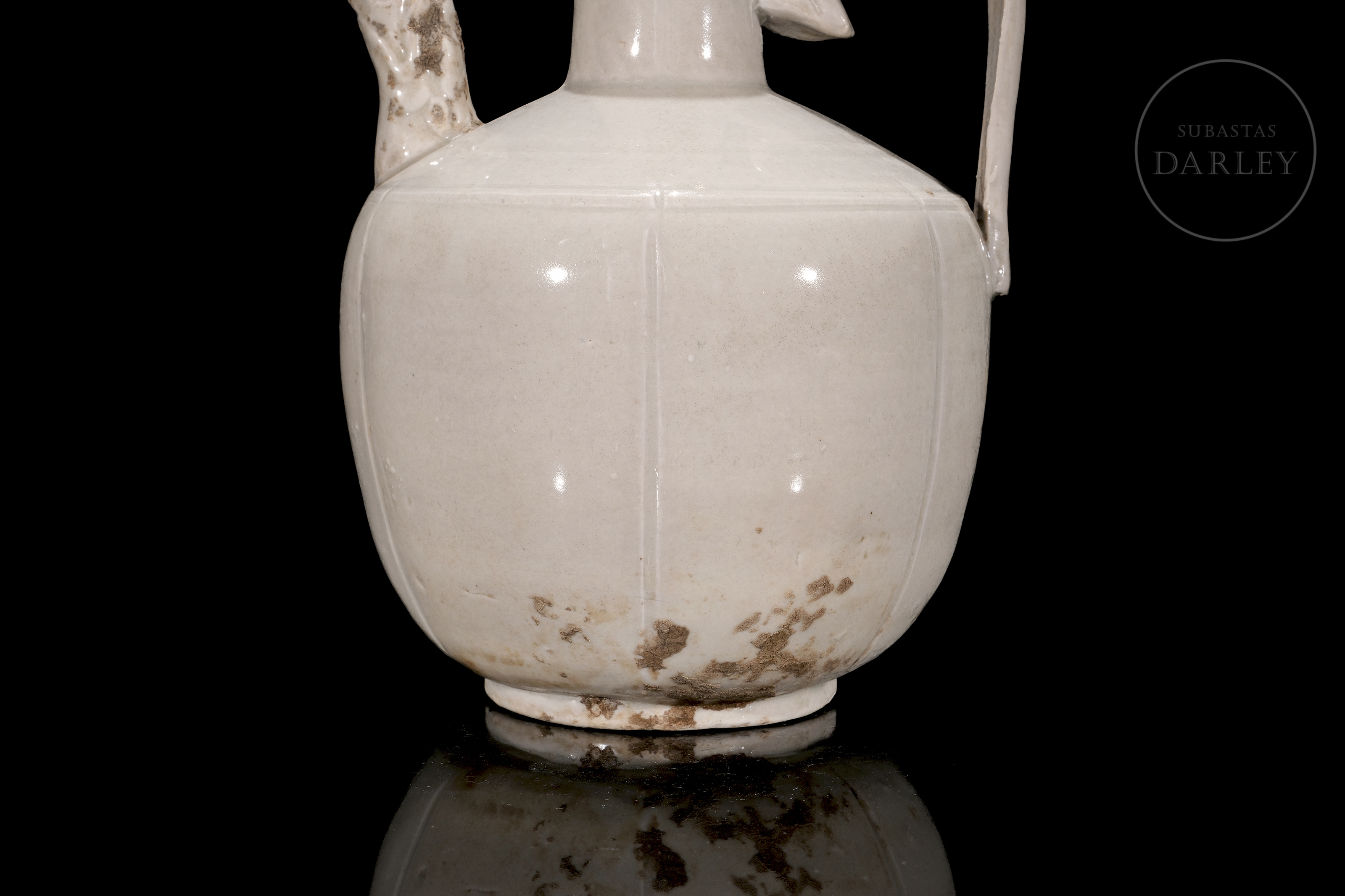 Ding-type porcelain jug with a globular body divided by fine vertical ribs. The piece, with a high handle and short spout, is covered with an ivory-white glaze. The base is unglazed.