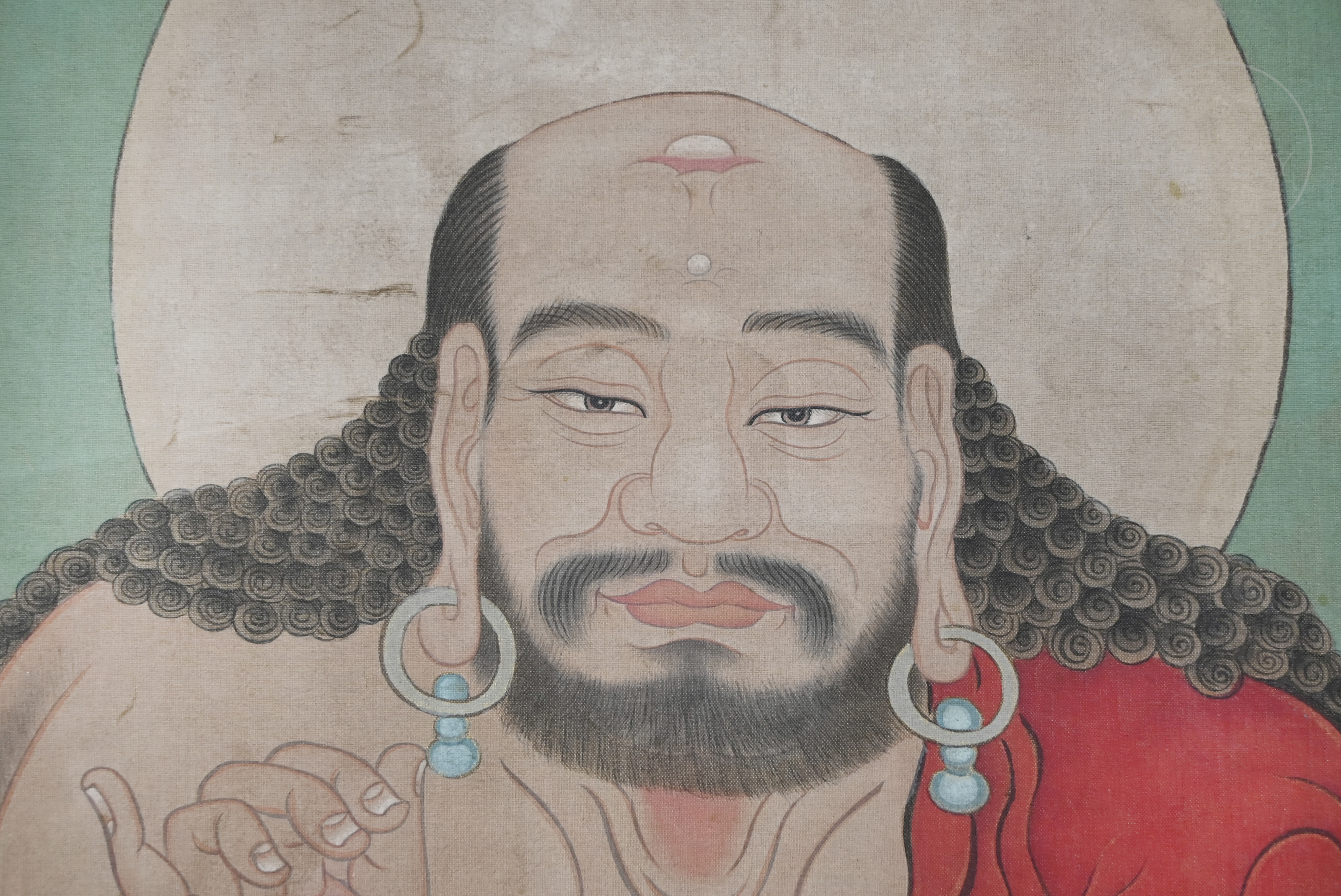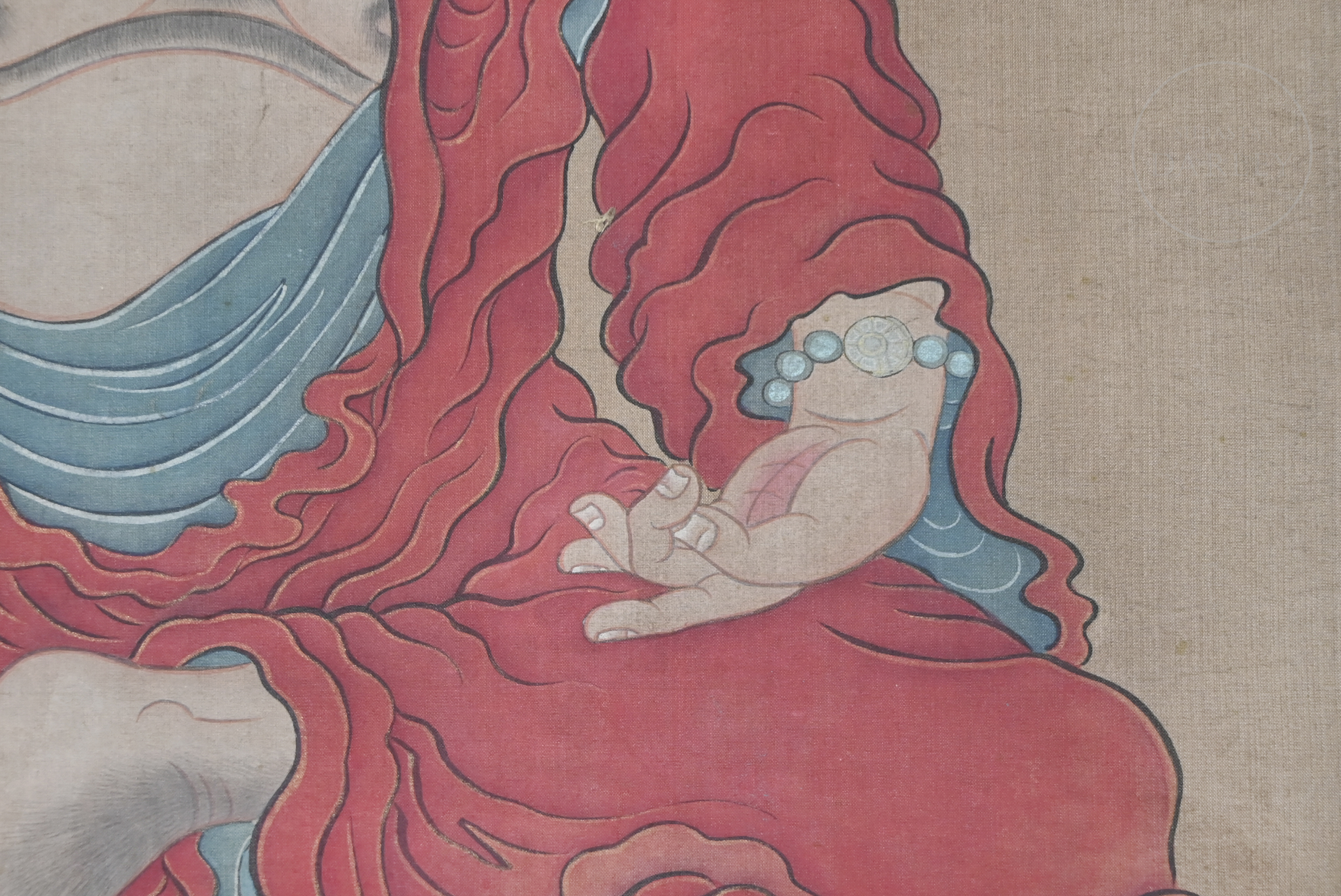 Painting executed in ink and pigments on silk, mounted on a brocade silk frame. It depicts an arhat seated on a rock formation, dressed in a red tunic and holding a mala in his right hand, while offering a gesture of giving with his left. It bears the inscription ‘臣丁观鹏恭画’ in the lower left corner, accompanied by the red seals “丁观鹏” and ‘恭绘’. Ding Guanpeng (1708–1771).