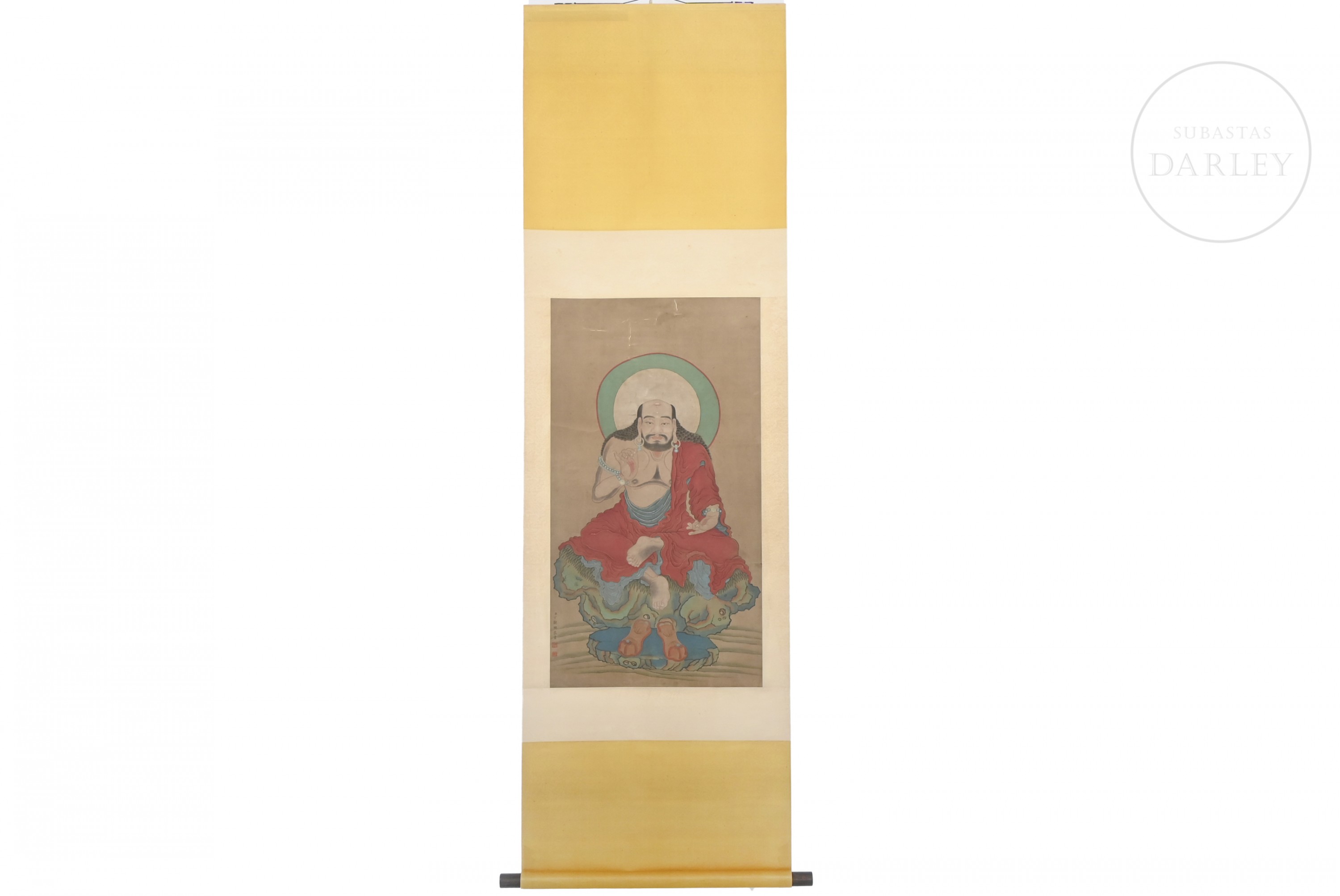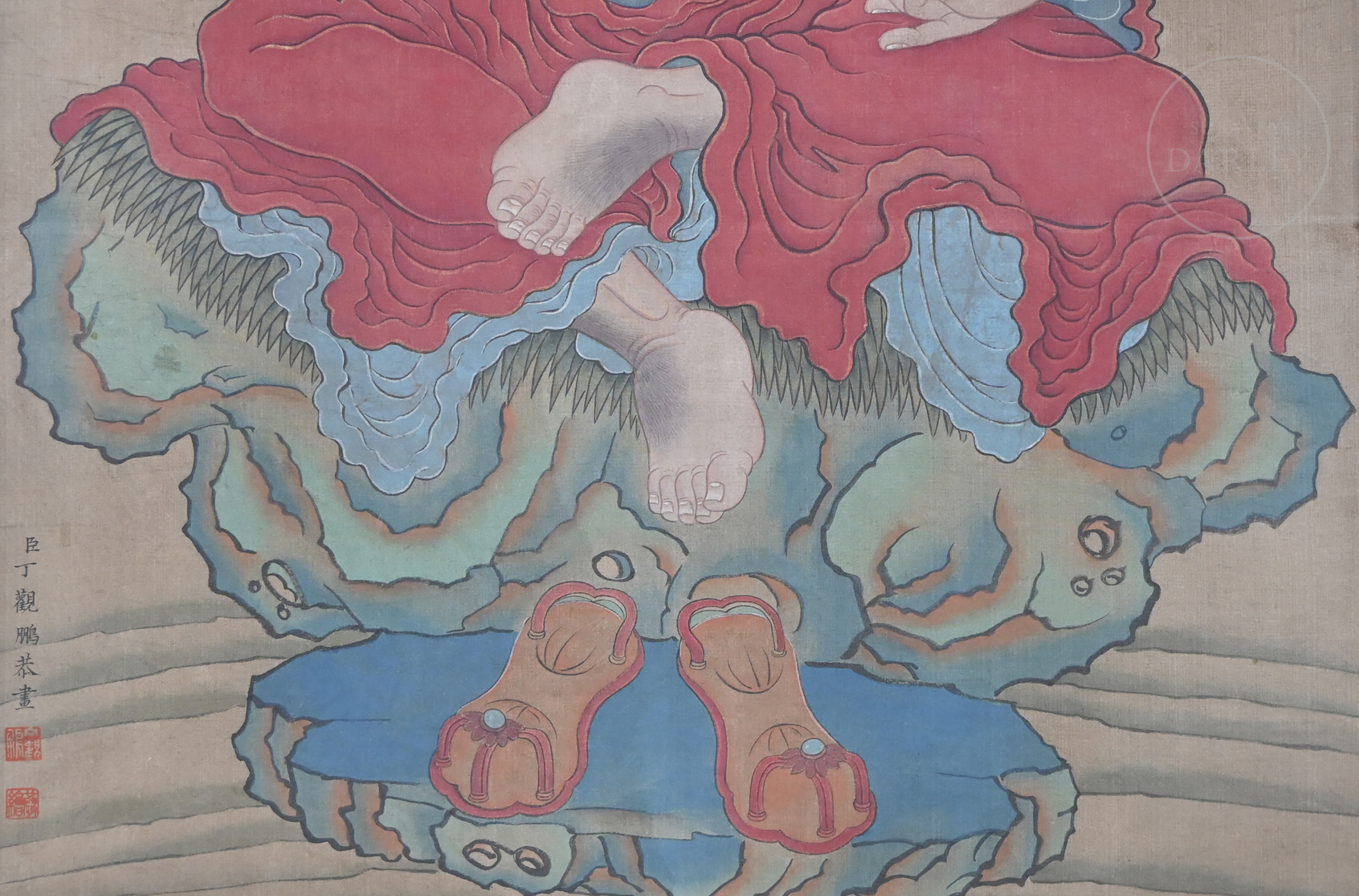 Chinese painting ‘Arhat sitting on a rock’, signed Ding Guanpeng