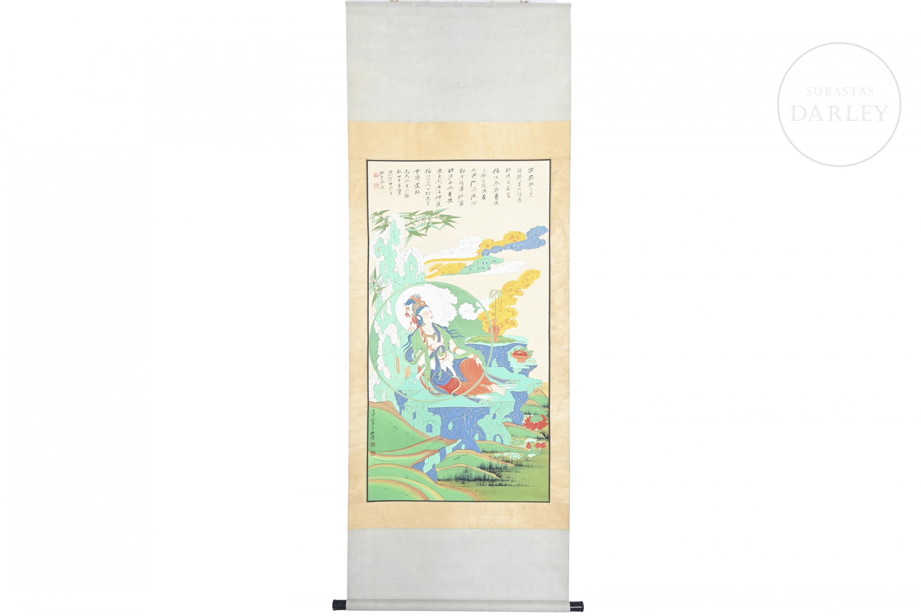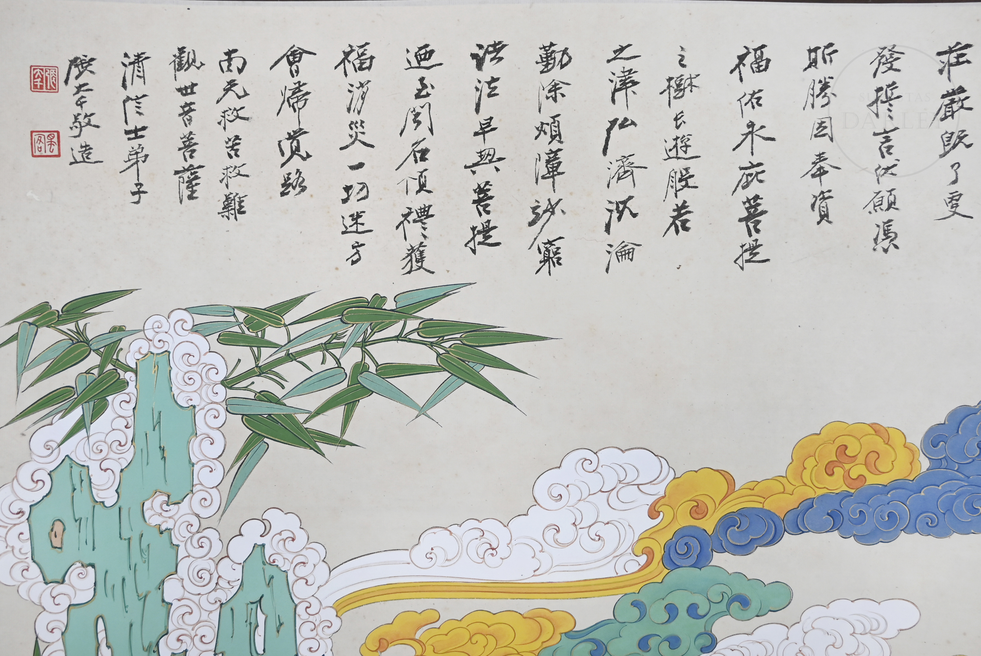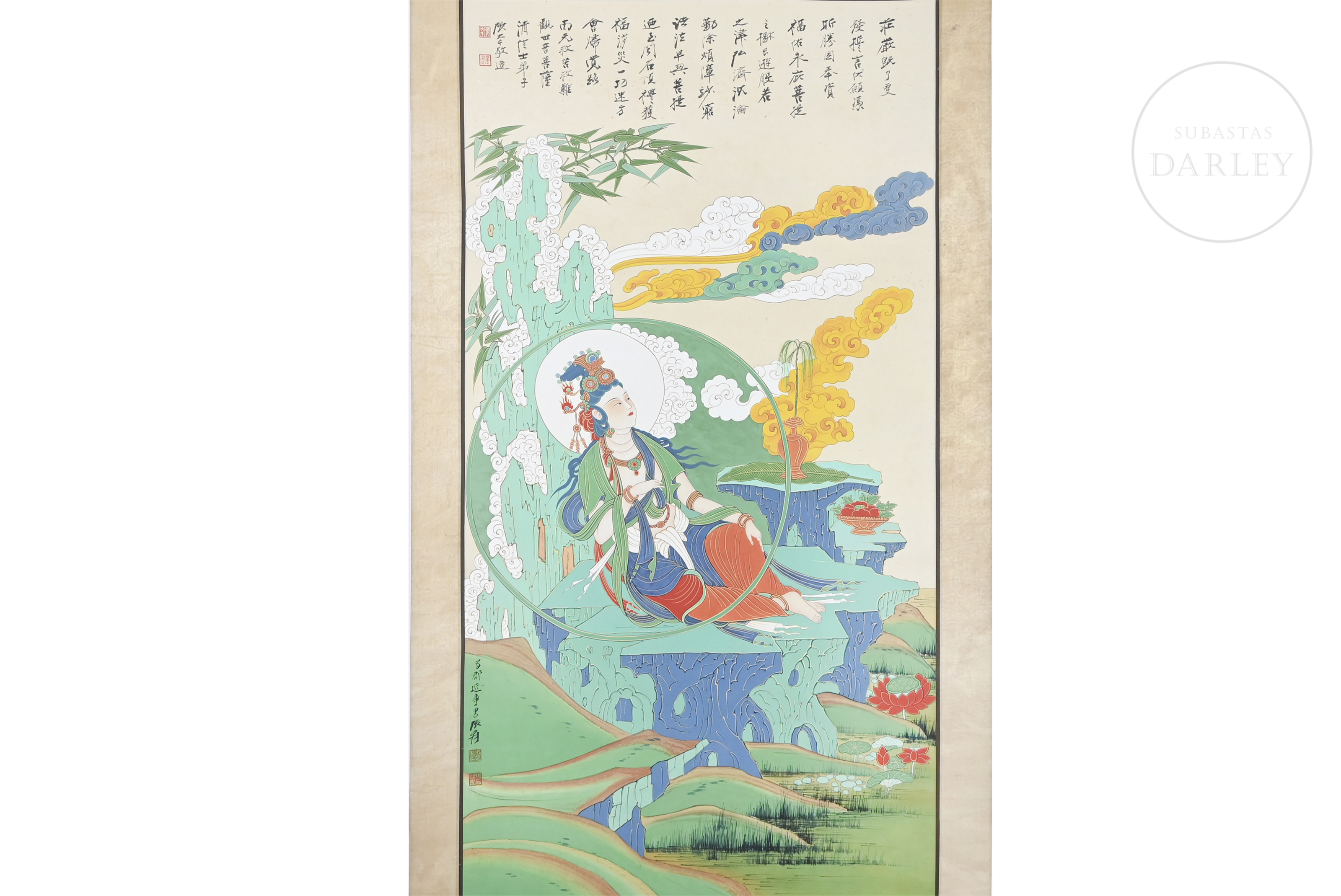 Painting executed in ink and pigments on paper, mounted in a brocade silk frame. It depicts the bodhisattva Guanyin in her ‘Shuiyue Guanyin’ (水月观音) iconography, seated in a contemplative pose on rock formations, surrounded by polychrome clouds, bamboo and lotus flowers. The upper part features a calligraphic inscription ‘觀世音菩薩’, next to two seals, and the lower part features the inscription ‘罗郡近事男张爰’ with the red seals “張爰之印” and ‘張爰福壽’. Zhang Daqian (1899–1983).