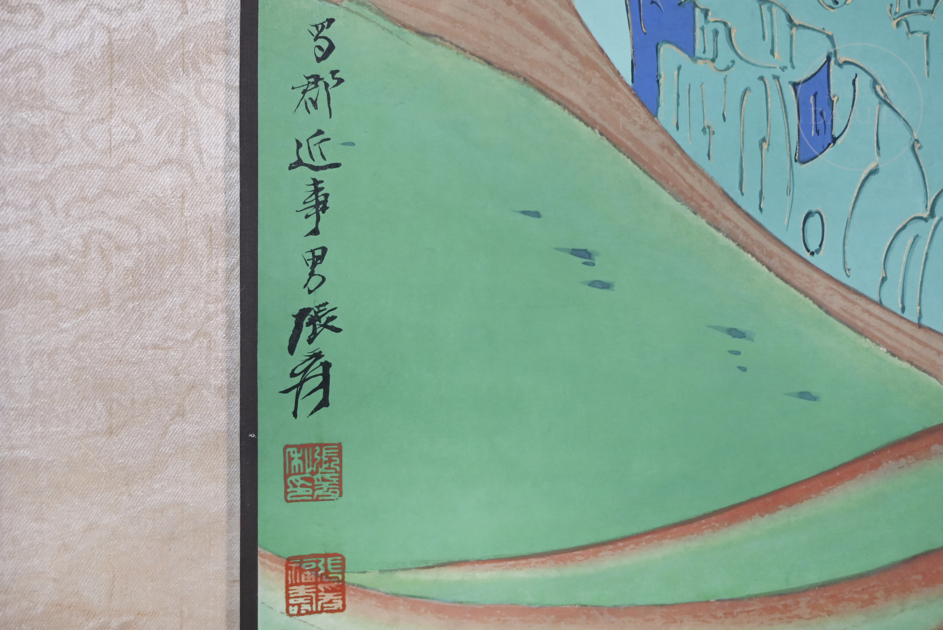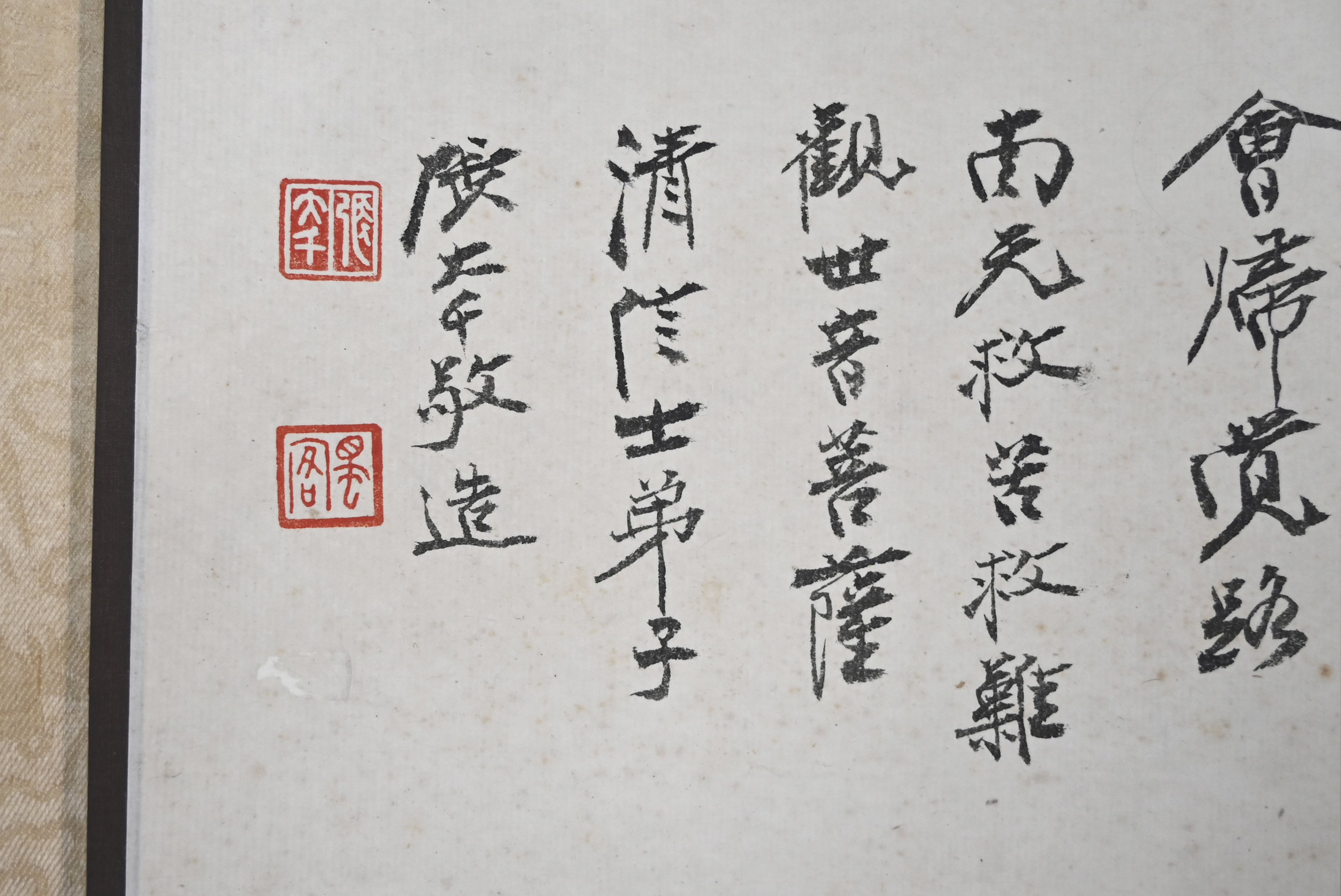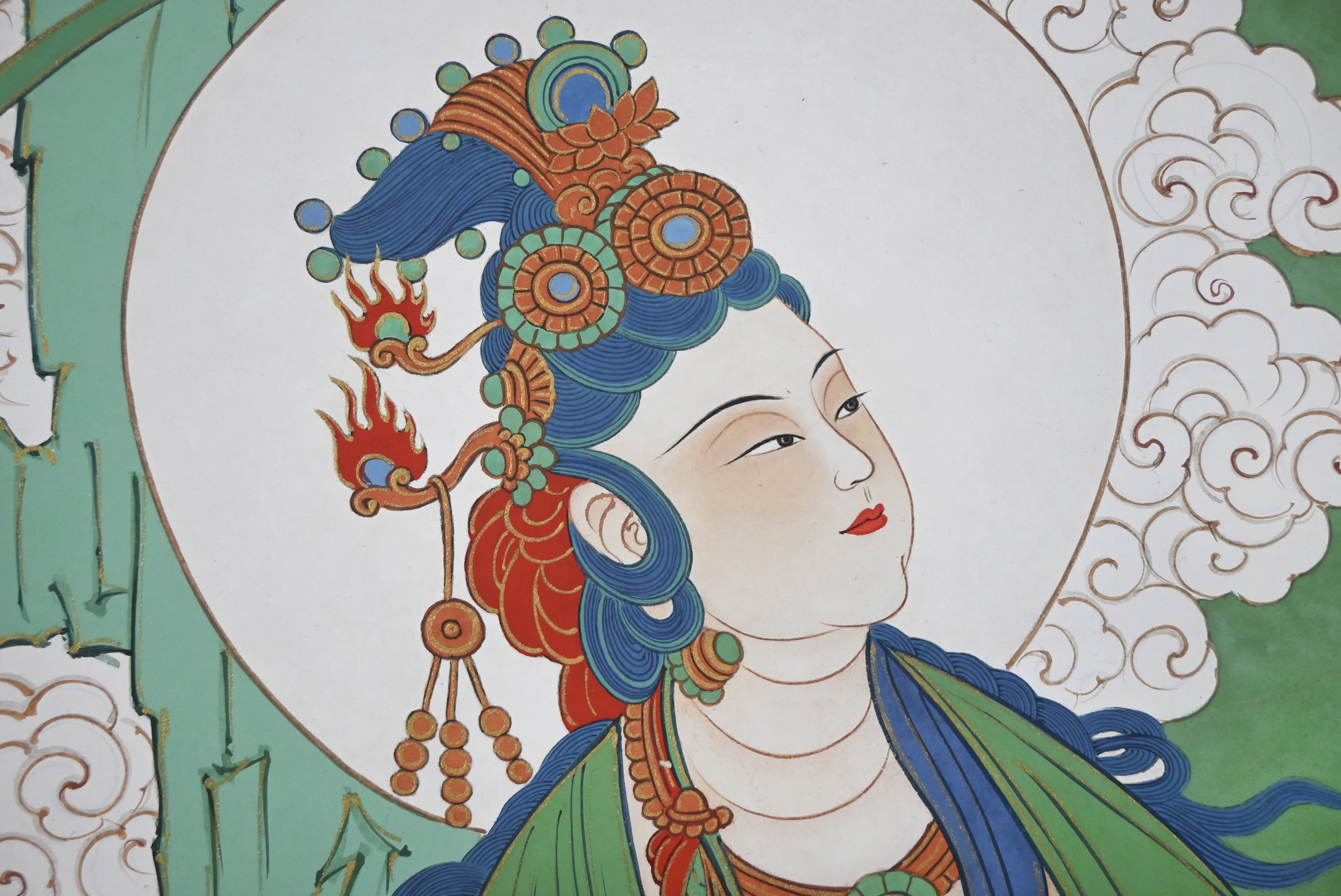 Painting executed in ink and pigments on paper, mounted in a brocade silk frame. It depicts the bodhisattva Guanyin in her ‘Shuiyue Guanyin’ (水月观音) iconography, seated in a contemplative pose on rock formations, surrounded by polychrome clouds, bamboo and lotus flowers. The upper part features a calligraphic inscription ‘觀世音菩薩’, next to two seals, and the lower part features the inscription ‘罗郡近事男张爰’ with the red seals “張爰之印” and ‘張爰福壽’. Zhang Daqian (1899–1983).
