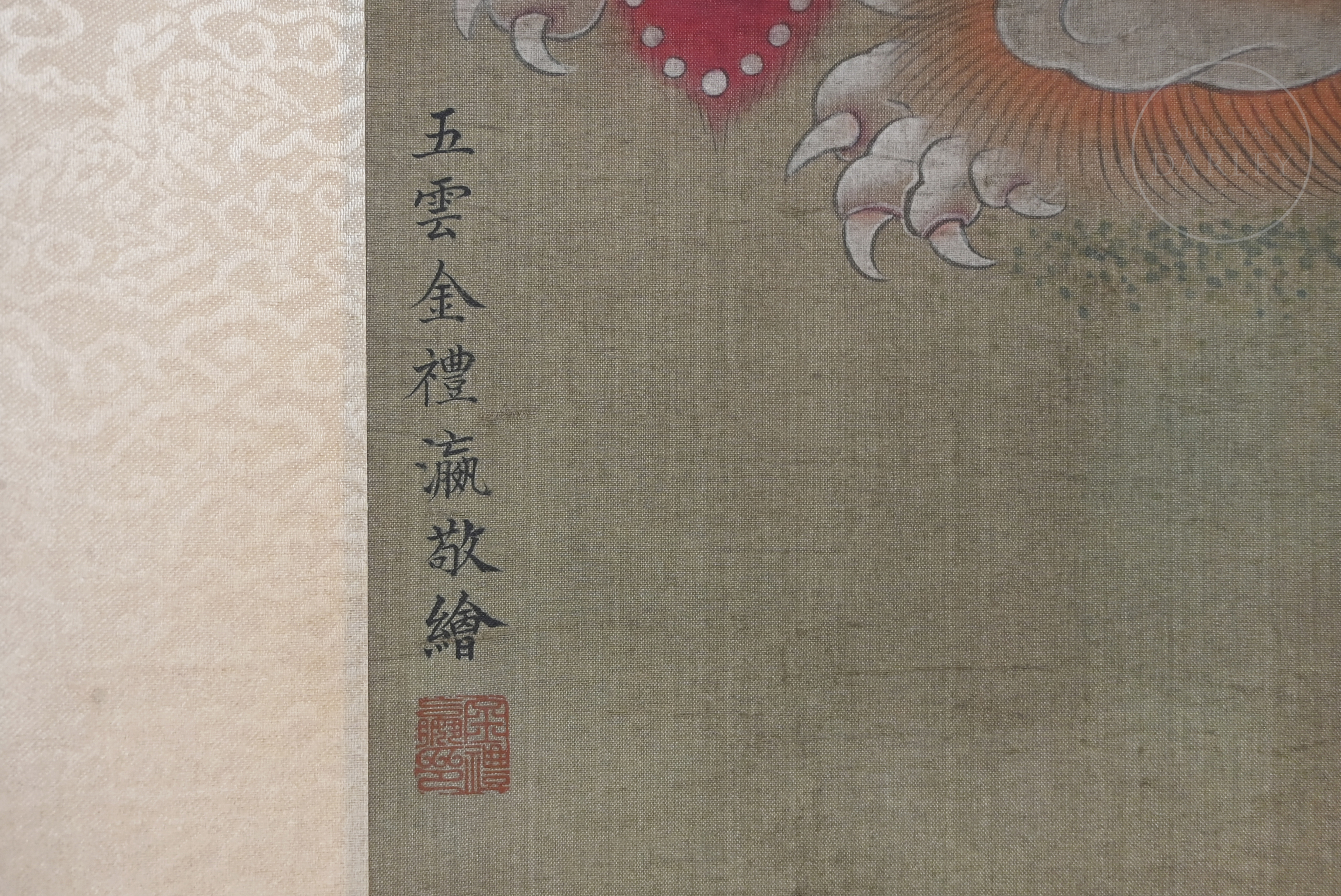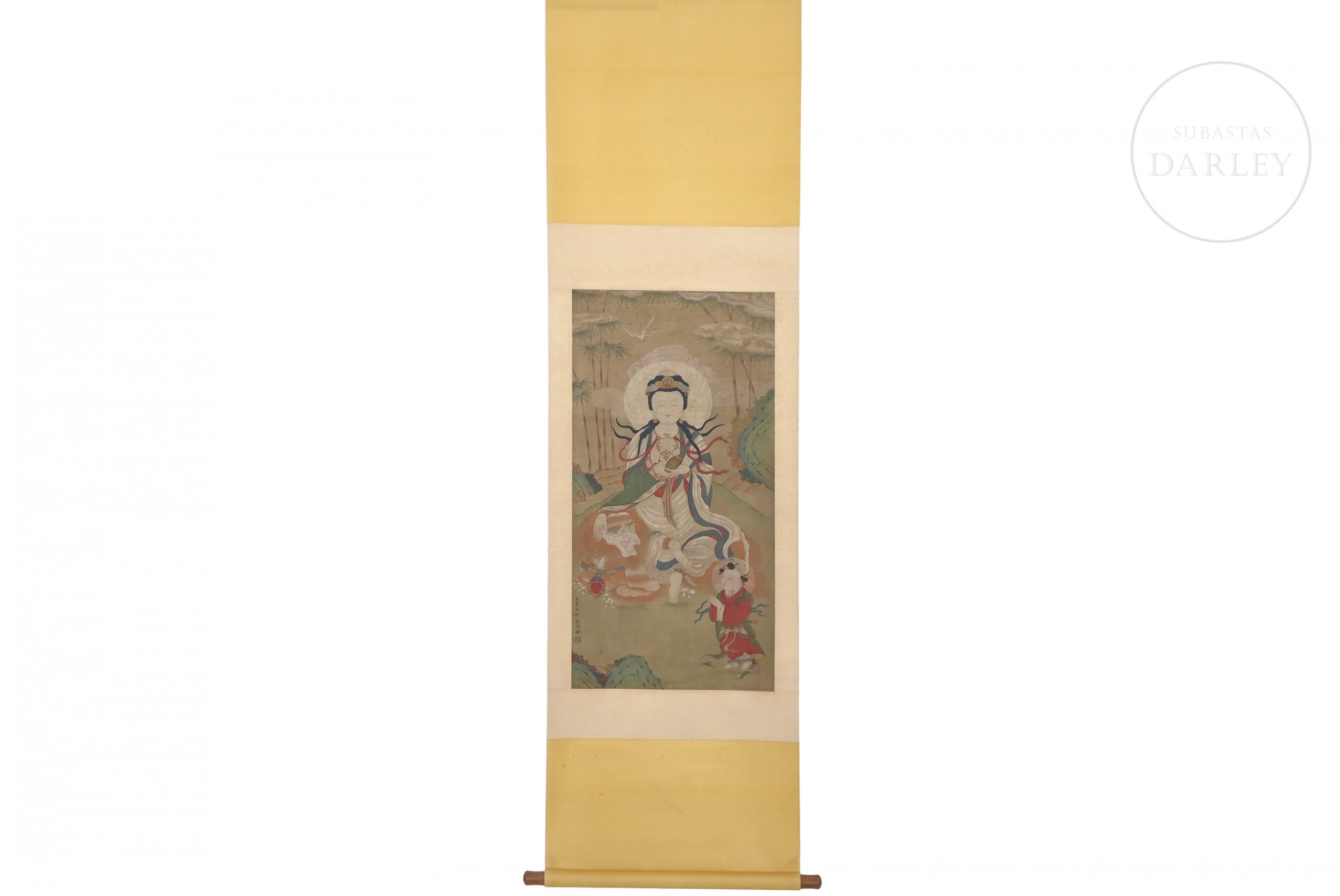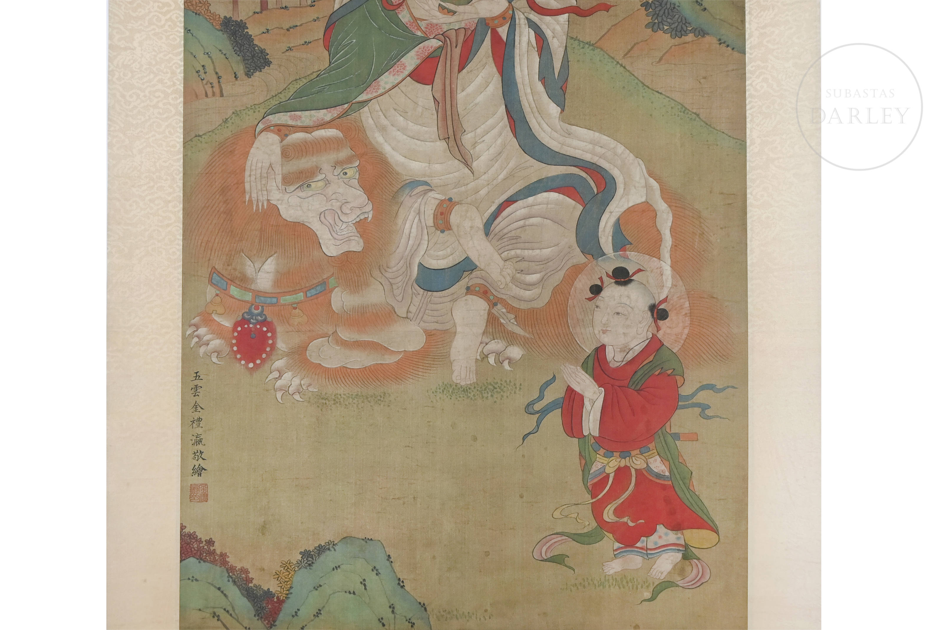 Painting executed in ink and pigments on silk, mounted on a brocade silk frame. It depicts the bodhisattva Guanyin, seated serenely on a white celestial lion, accompanied by a child assistant in the foreground. The scene is set against a landscape of mountains and bamboo, with stylized clouds in the background. On the left side is the inscription ‘五云金礼瀛敬绘’, next to the red seal ‘金礼瀛印’. Jin Liying (active in the 19th century).