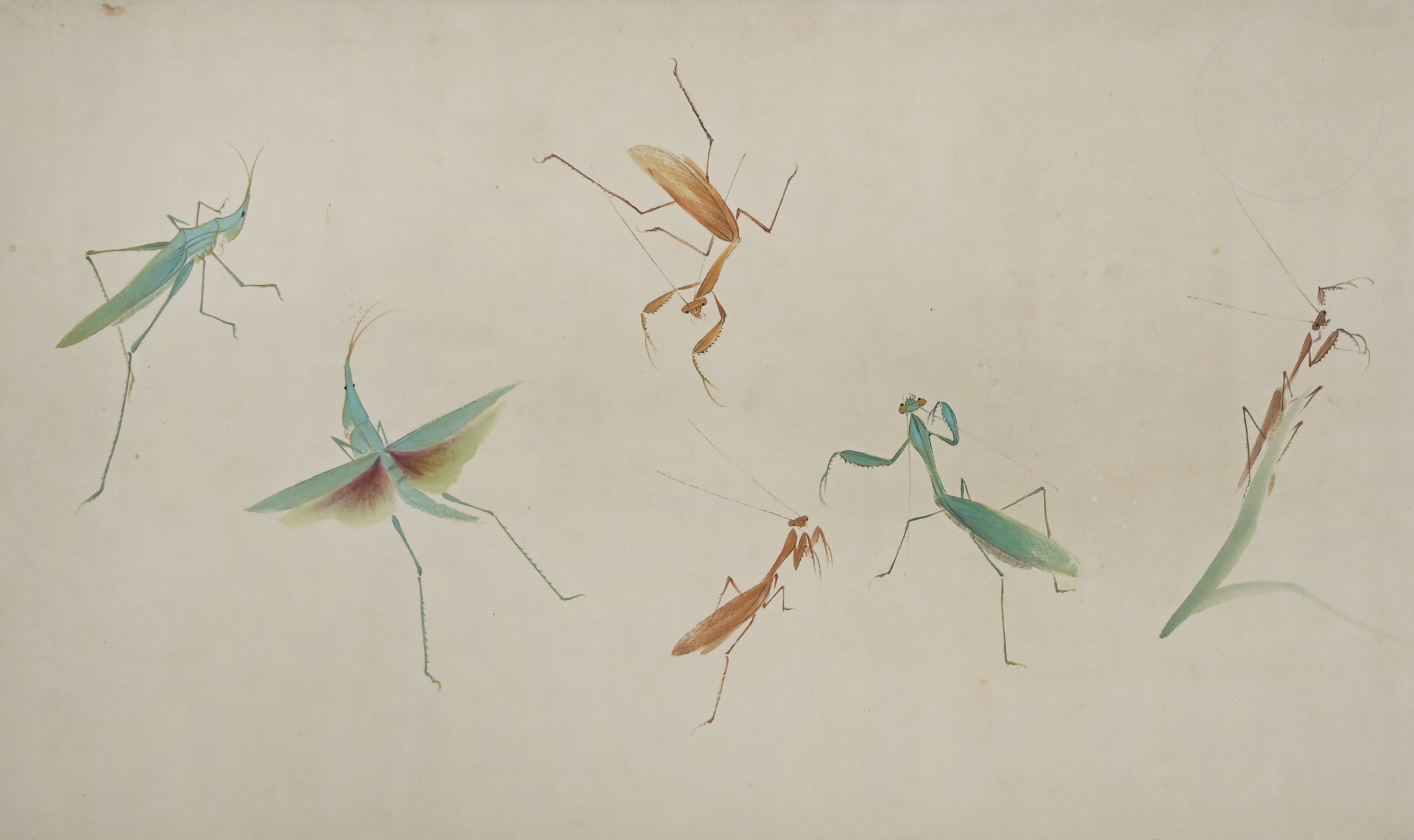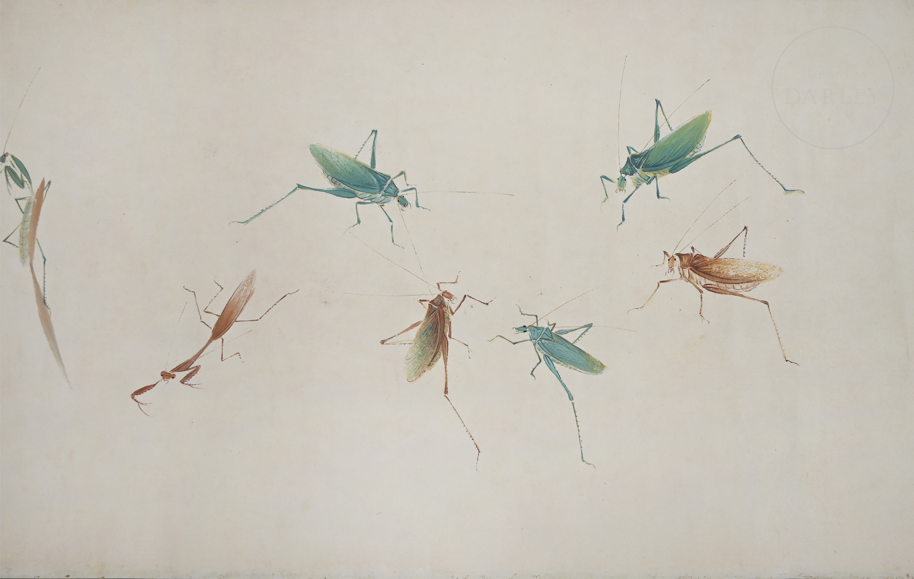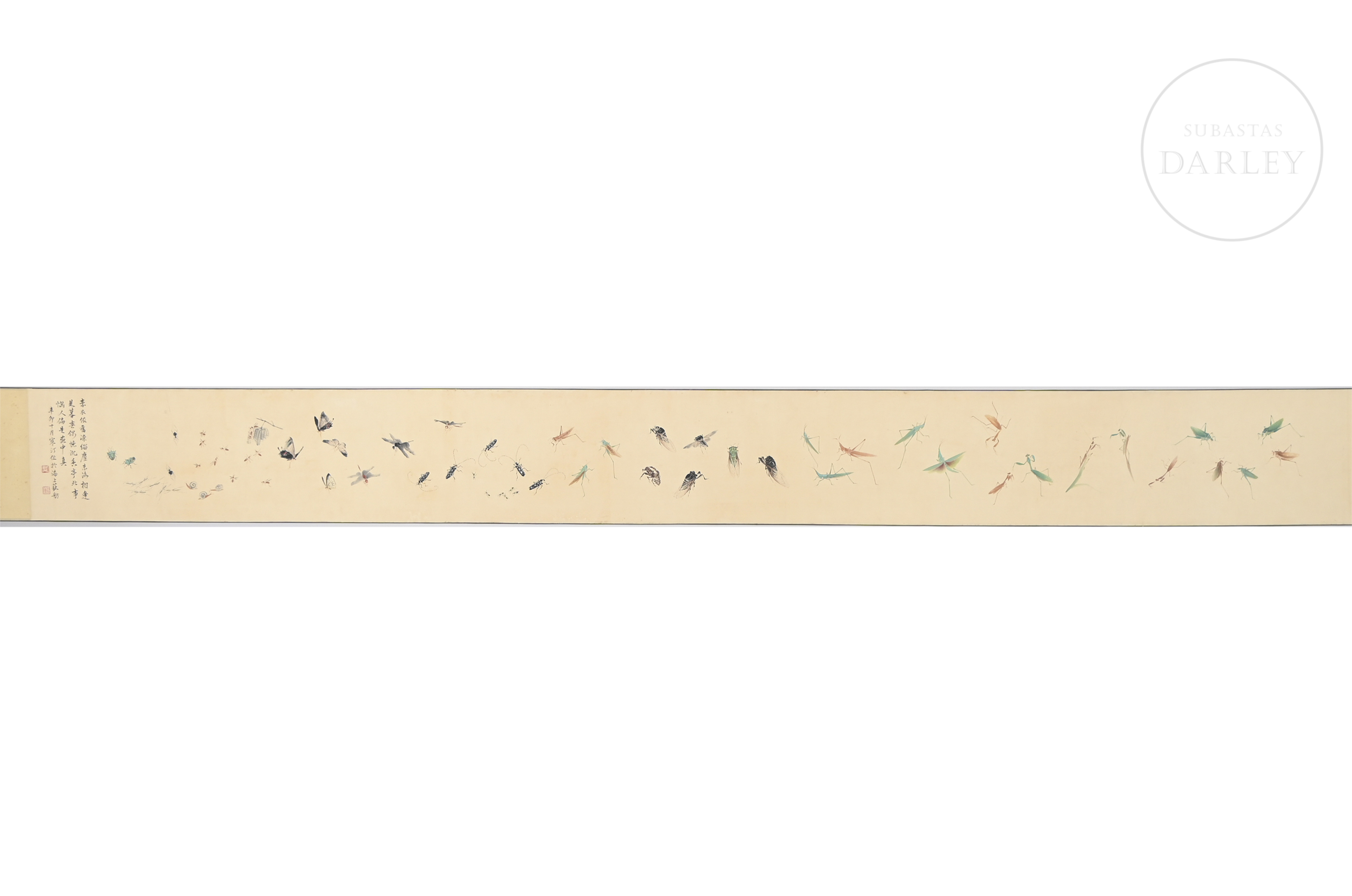 Made with ink and coloured pigments on paper, it is a horizontal scroll depicting multiple insects, such as butterflies, grasshoppers and dragonflies, in the style of Jiang Hanting (1903-1963). On the left is a poem with the inscription ‘辛卯十月寒汀作于海上获舫’, accompanied by two red seals ‘江寒汀’ and ‘江荻’. On the far right, the calligraphy “妙化天然” appears next to the inscription ‘徐邦达’ and two seals. The outside of the protective case reads ‘Jiang Hanting Grasshopper Painting Scroll’.