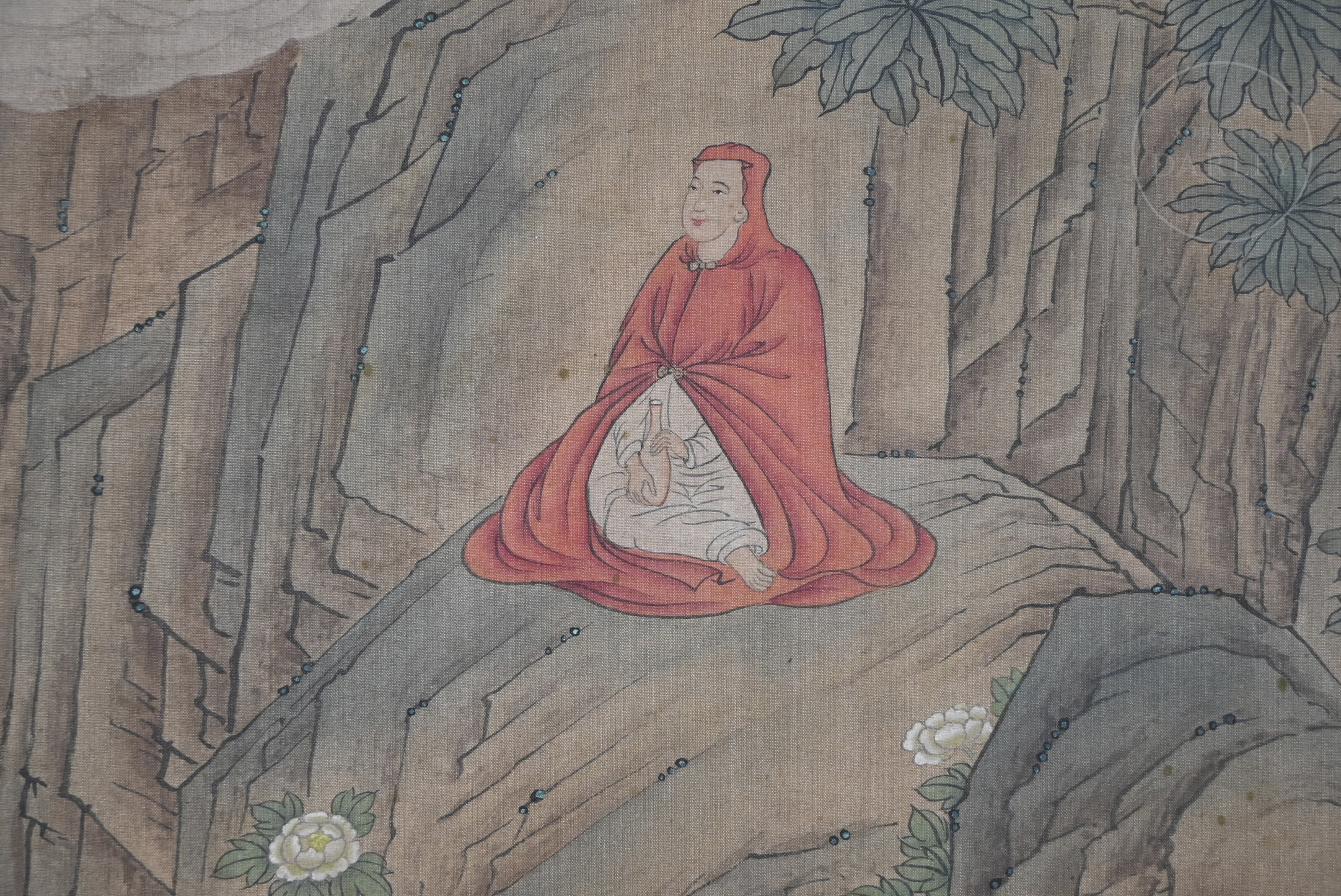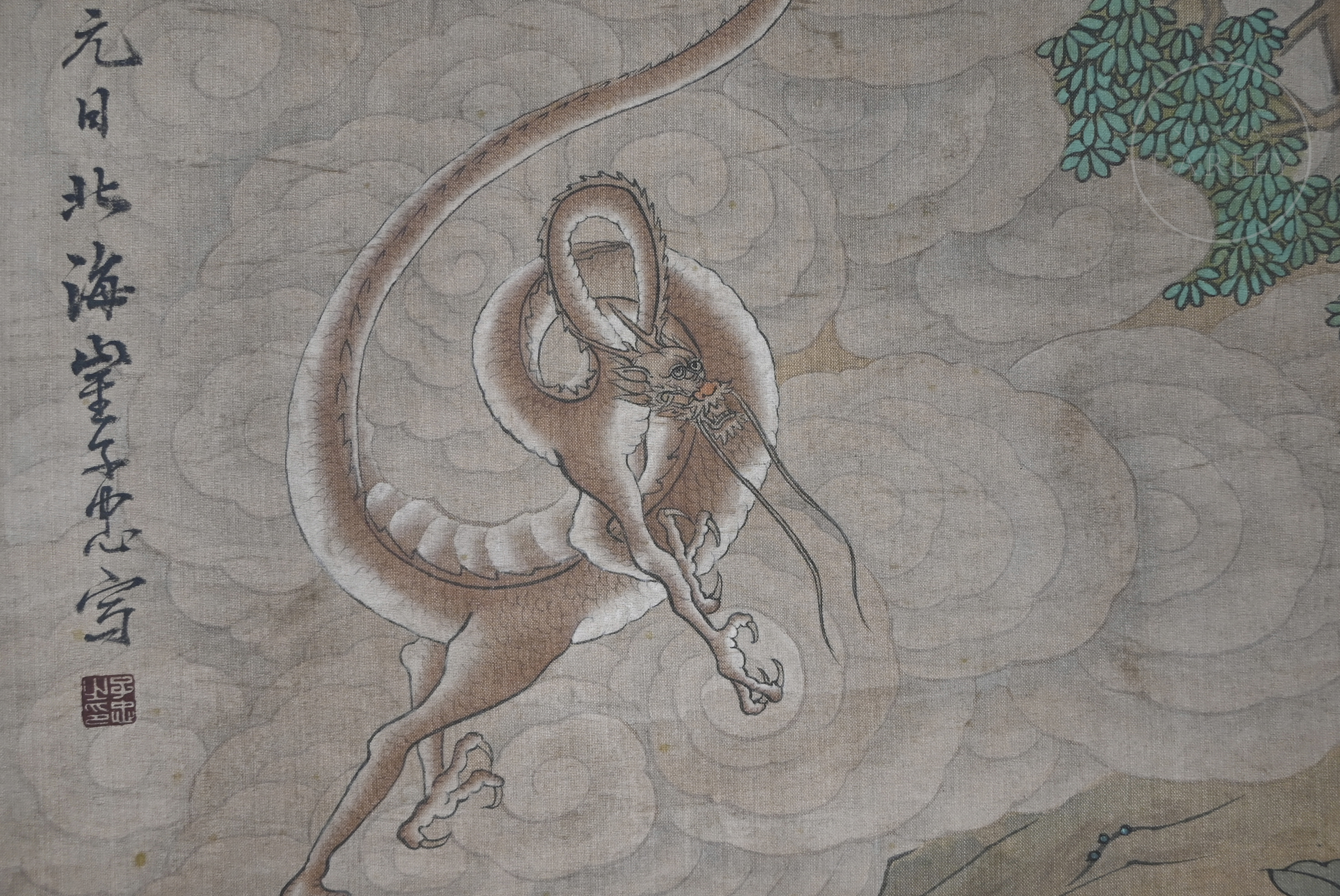 Painting executed in ink and pigments on silk, mounted on a brocade silk frame. The composition depicts a sage dressed in a red tunic seated next to two disciples at the bottom. The scene takes place in a mountainous setting, while at the top a dragon appears among the clouds. It bears an inscription in the upper left corner ‘崇祯戊寅元日北海崔子忠写’, along with a red seal ‘子忠之印’ and two collection seals “宫氏珍藏” and ‘信公珍赏’. Cui Zizhong (1594–1644).