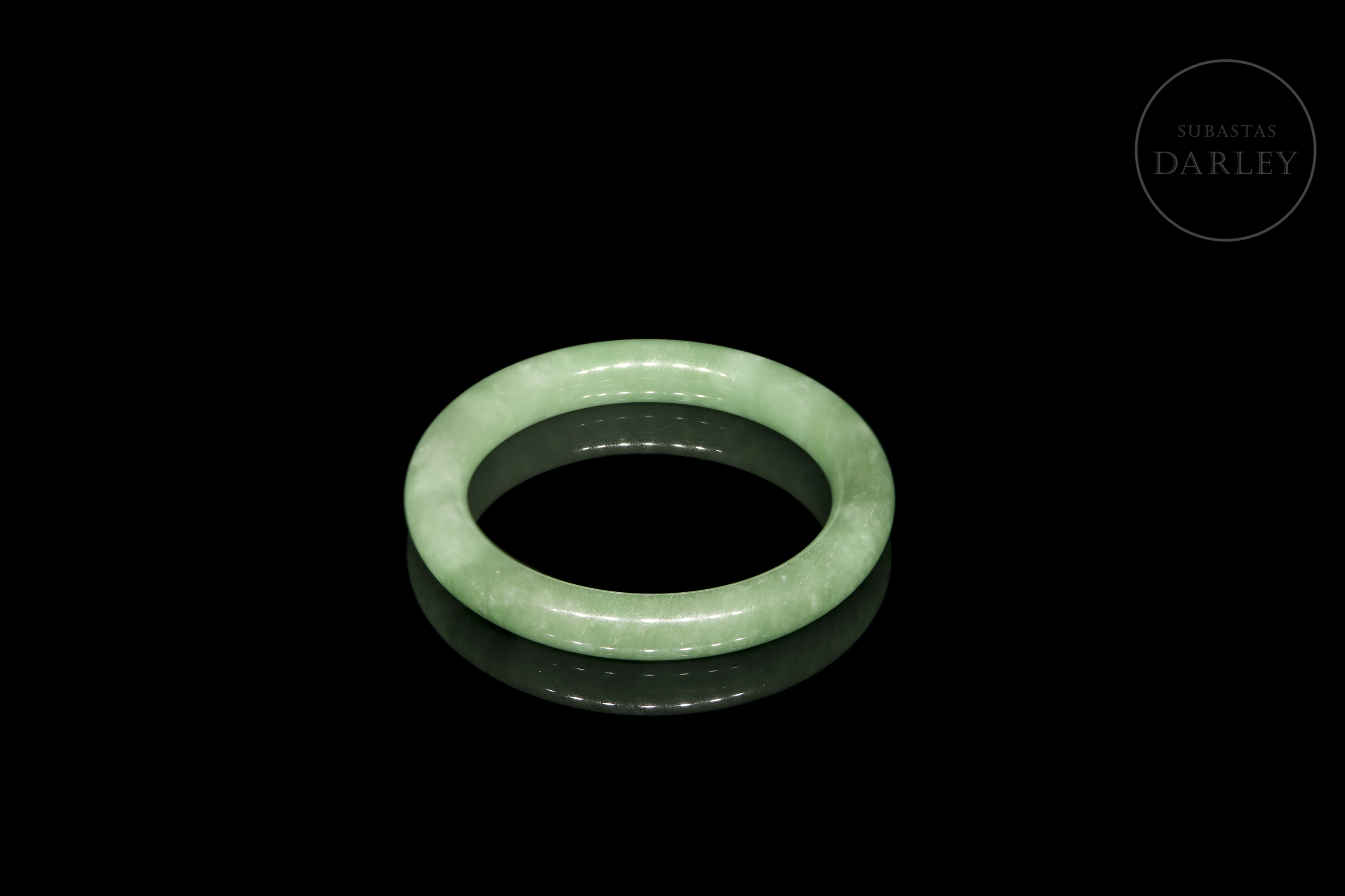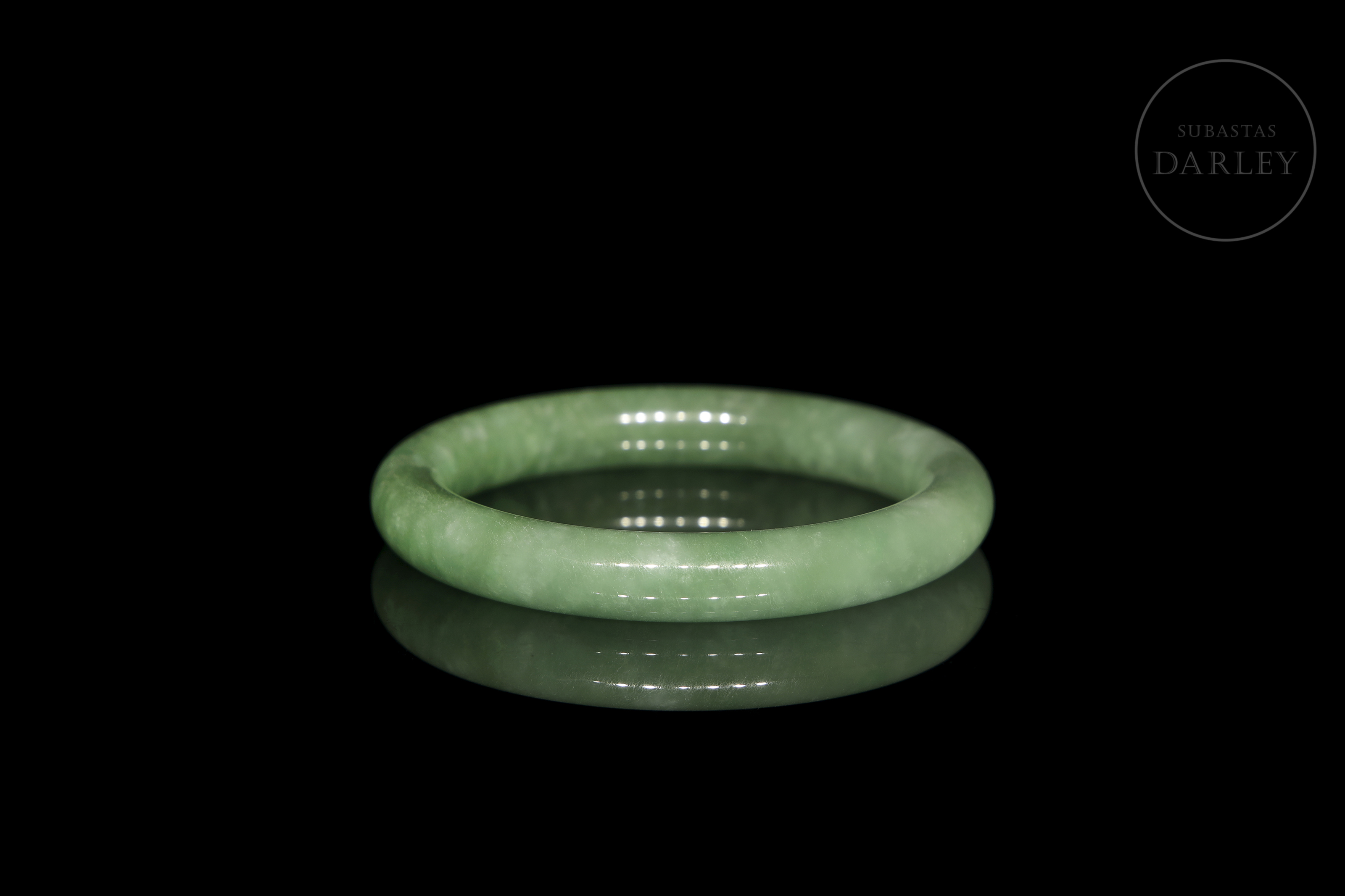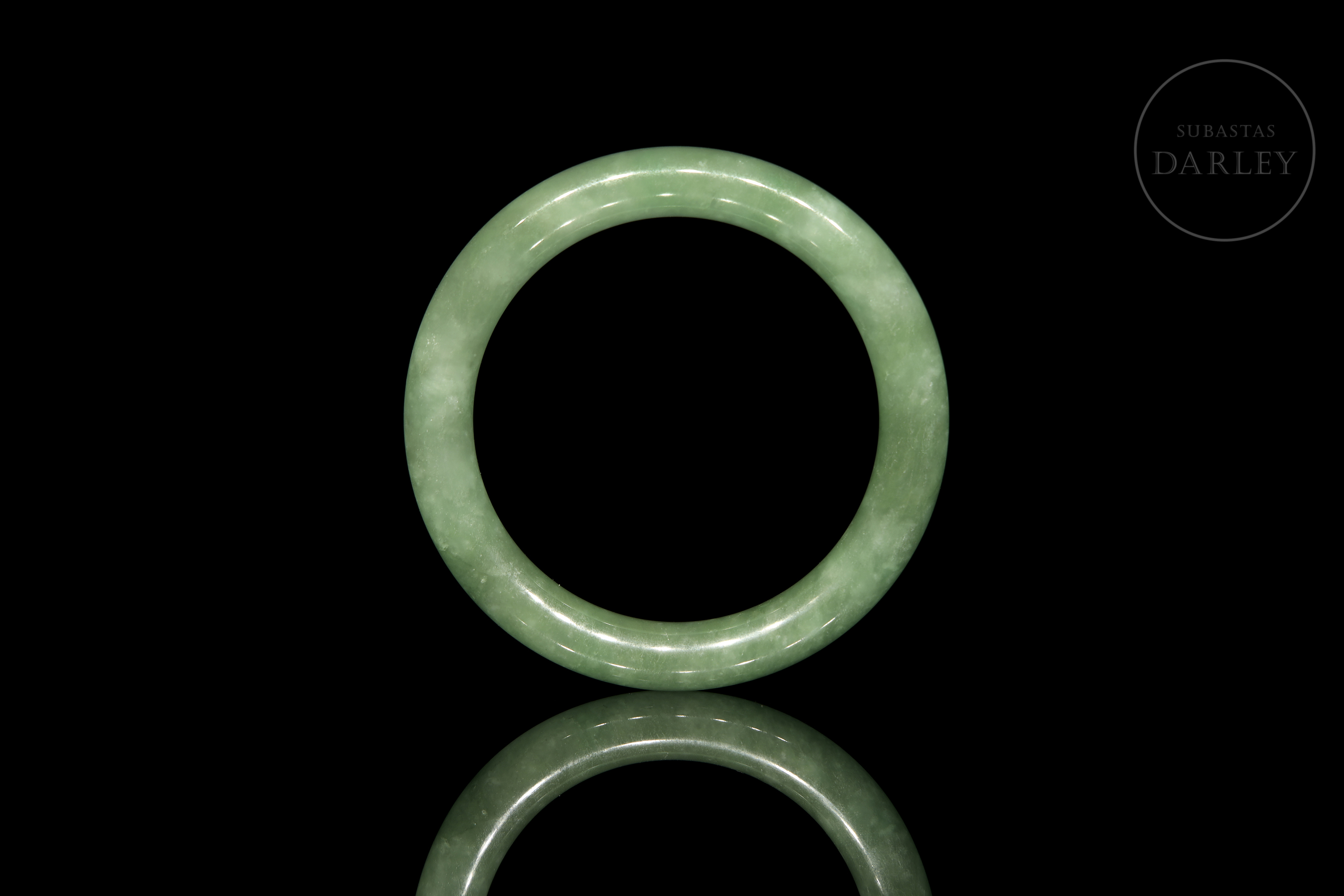Rigid bracelet made of jade in a uniform green tone with lighter shades, carved from a single piece. It has a circular shape and rounded section, with a gently polished surface that enhances the natural shine of the stone.
