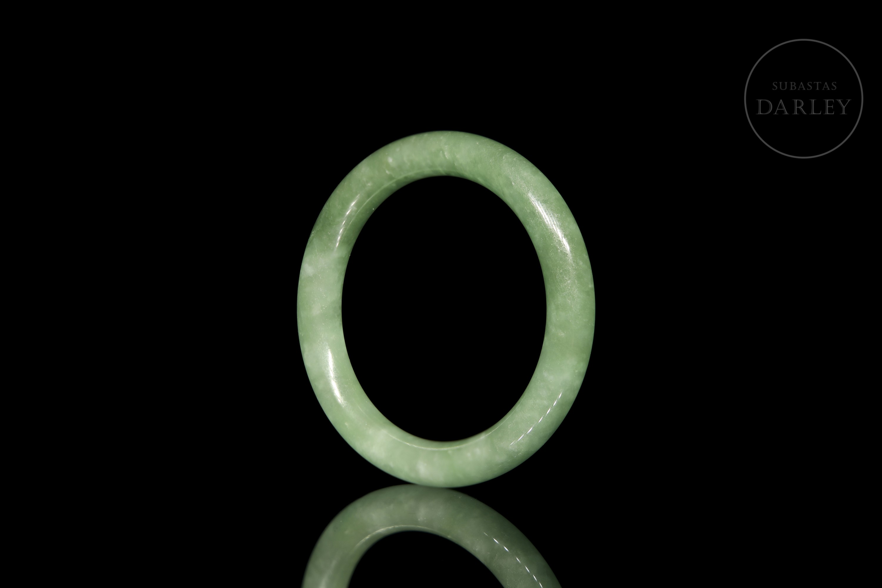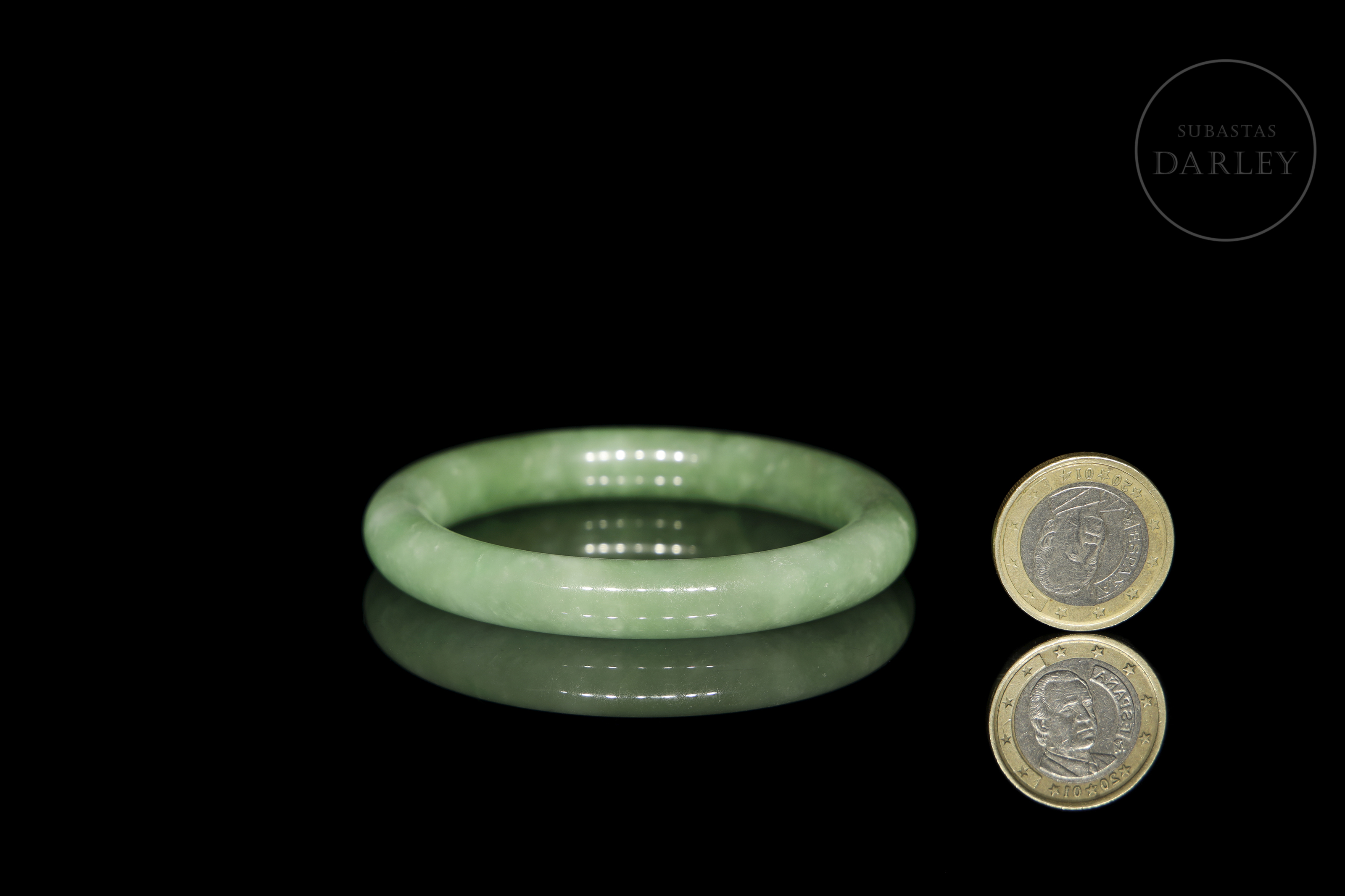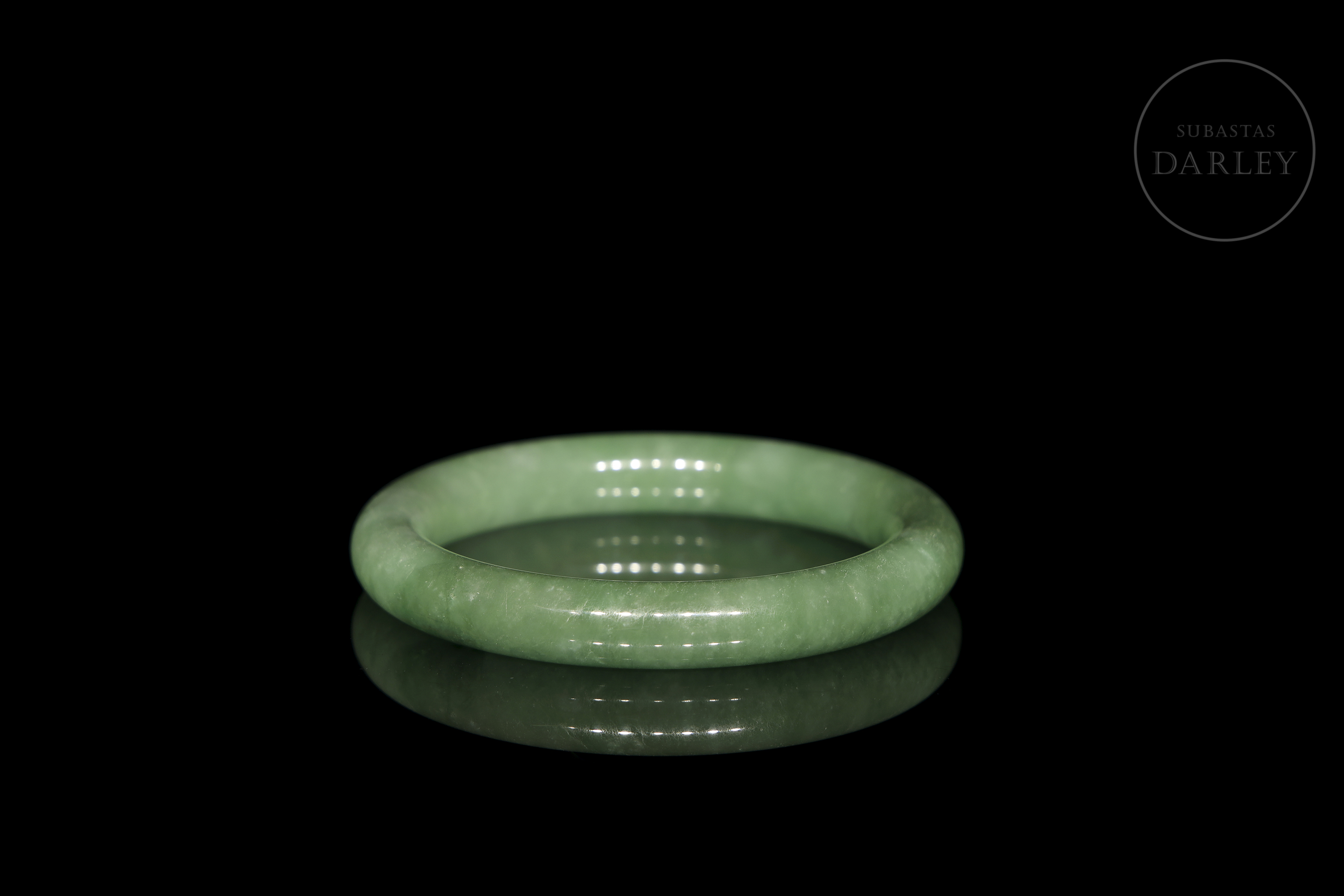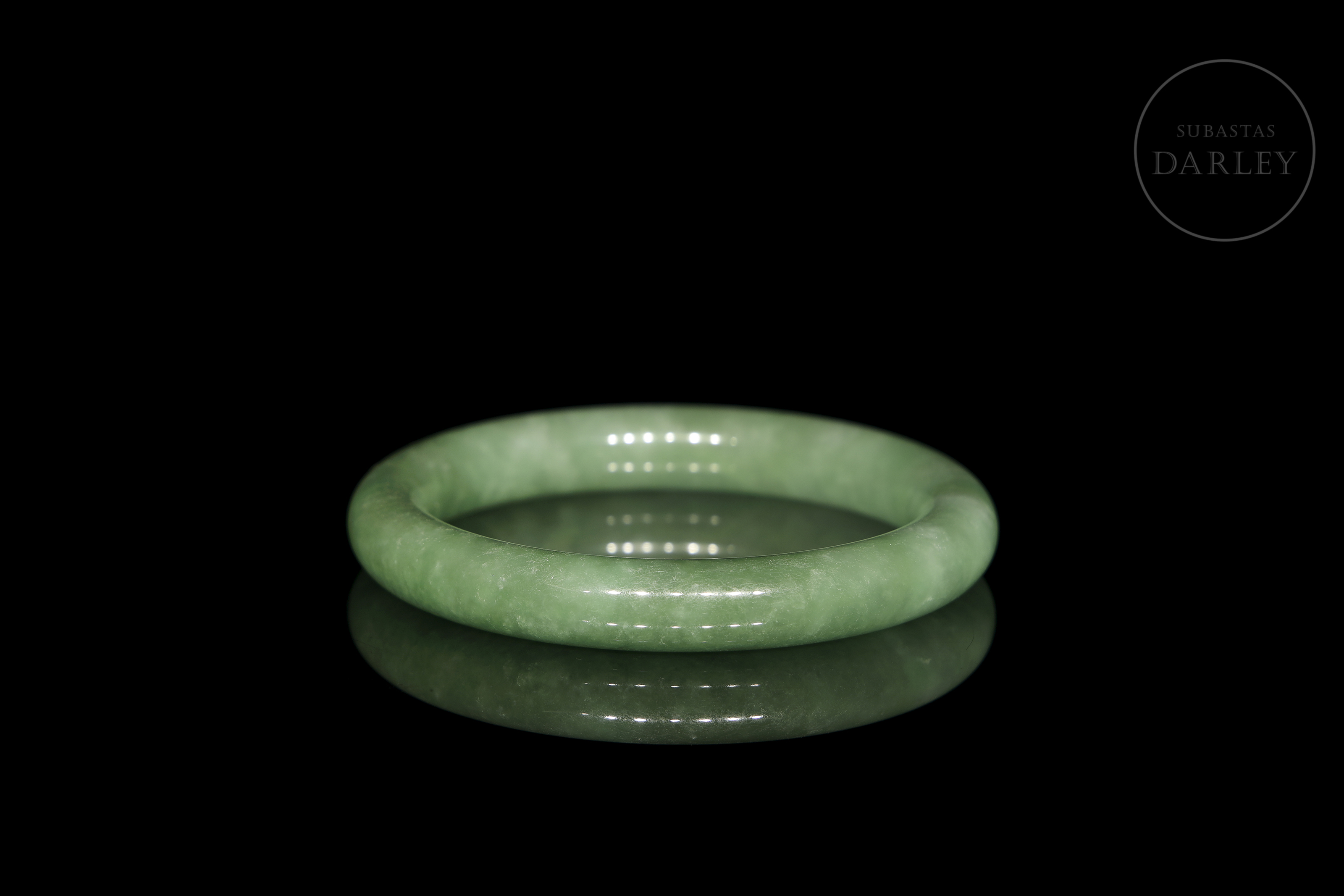 Rigid bracelet made of jade in a uniform green tone with lighter shades, carved from a single piece. It has a circular shape and rounded section, with a gently polished surface that enhances the natural shine of the stone.