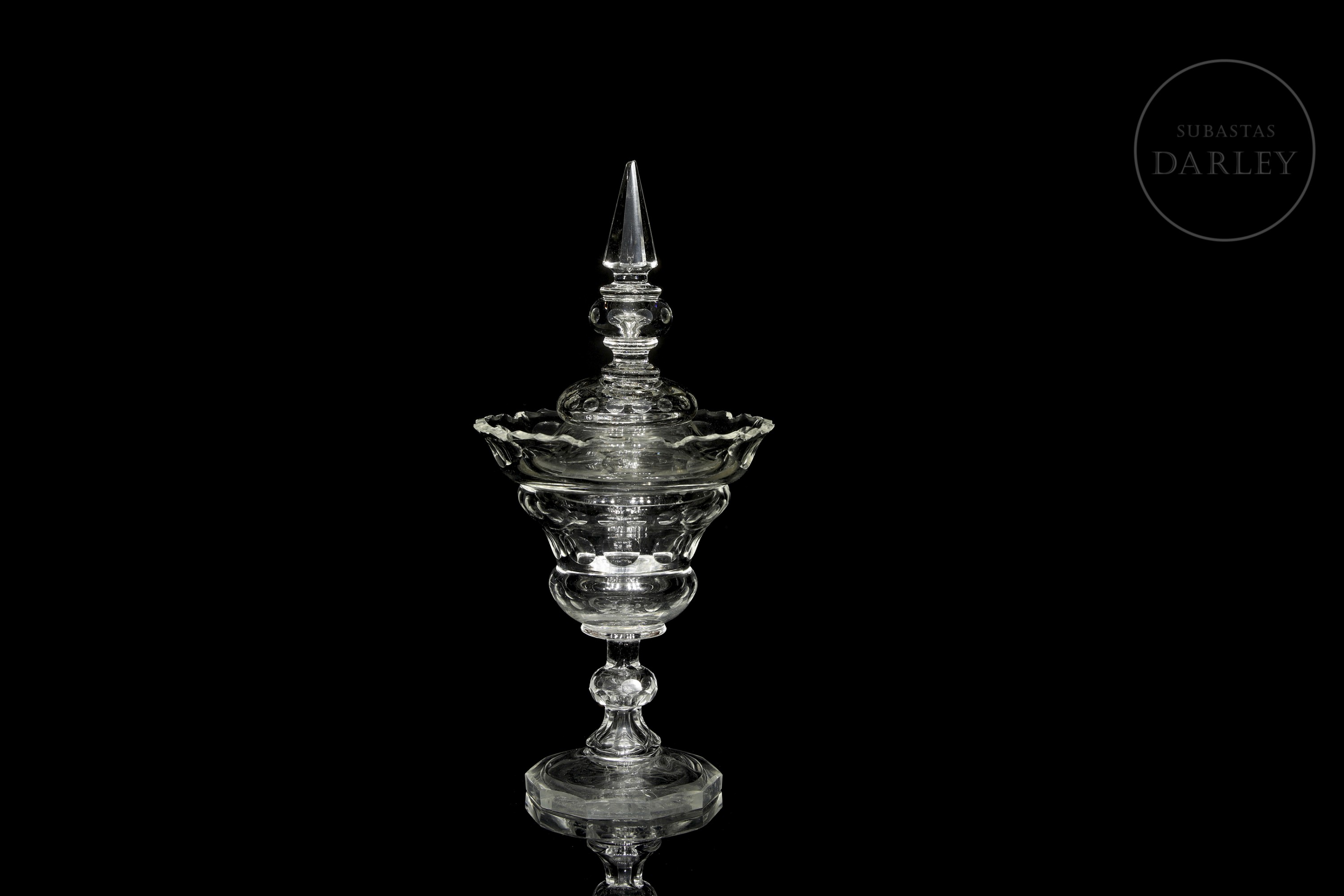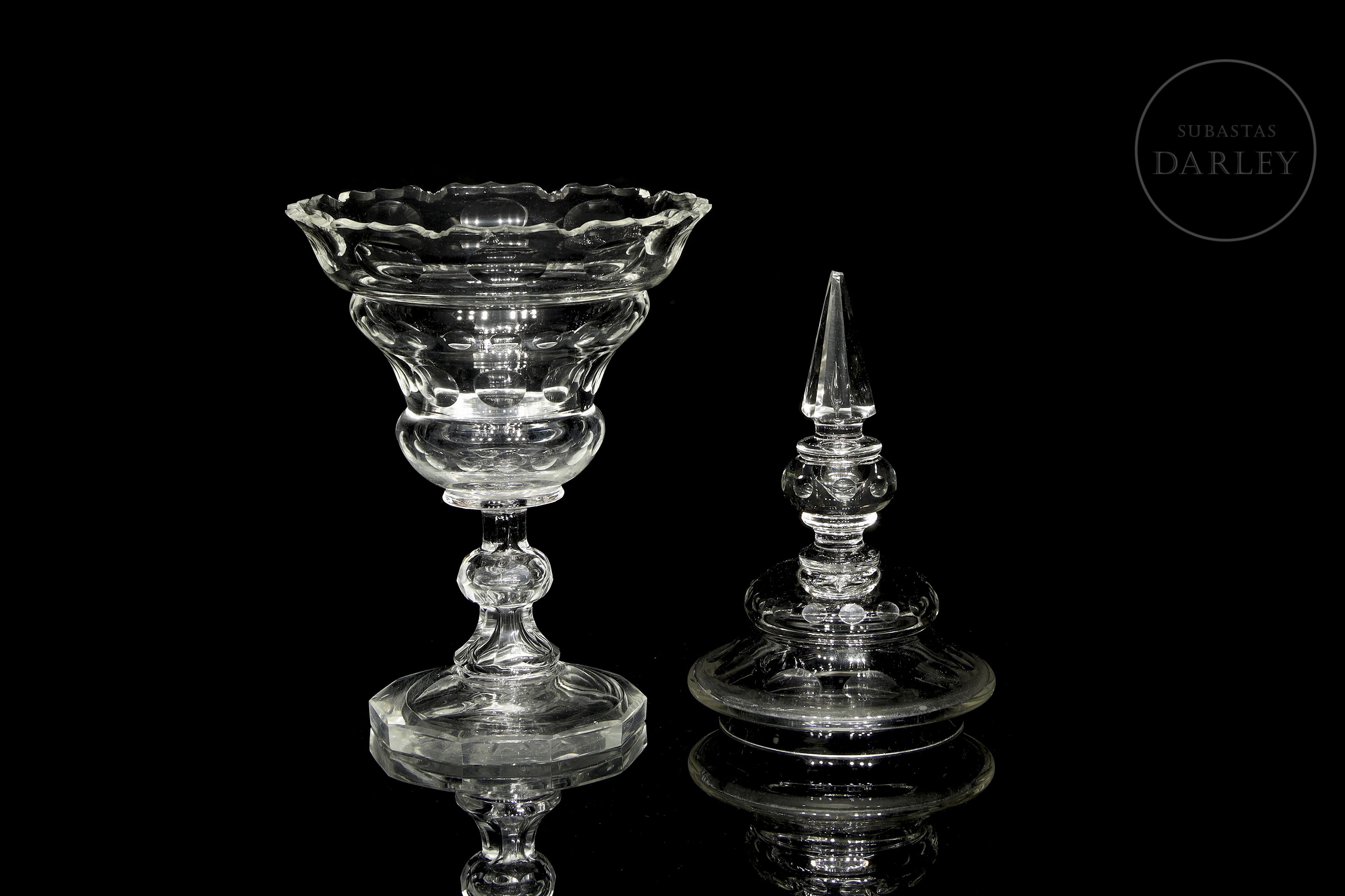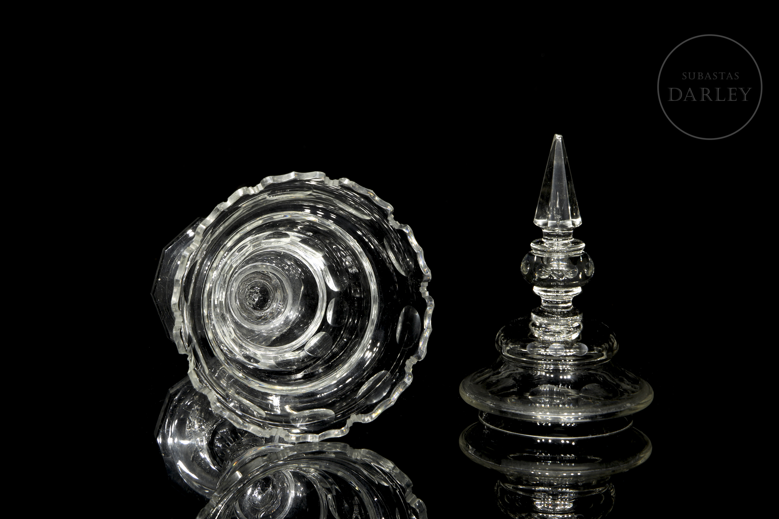水晶甜品碗或糖果盒。碗盖与碗身或底座均饰有环绕器物周缘雕刻的几何纹样。碗沿可见破损痕迹,顶缘存在轻微瑕疵。