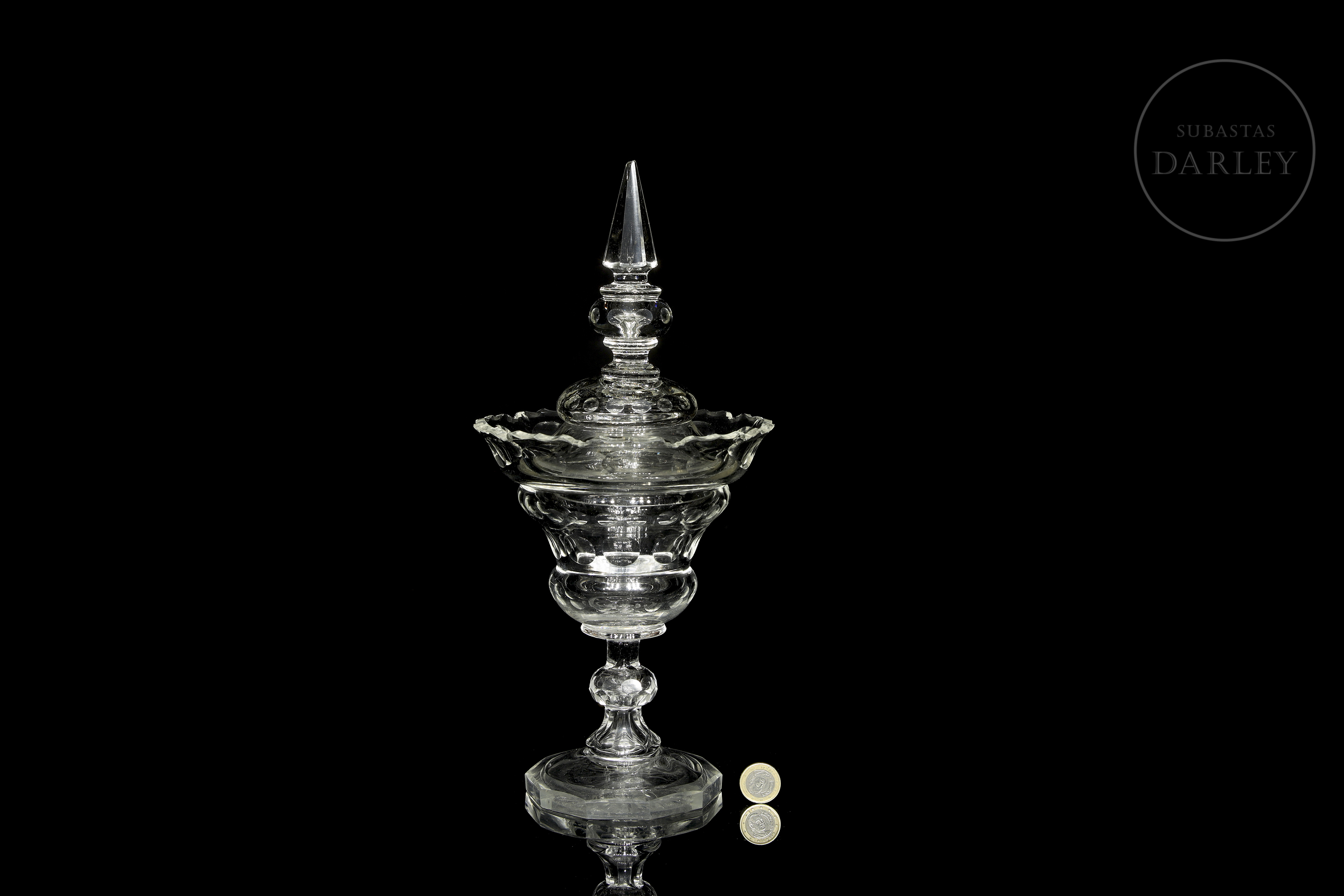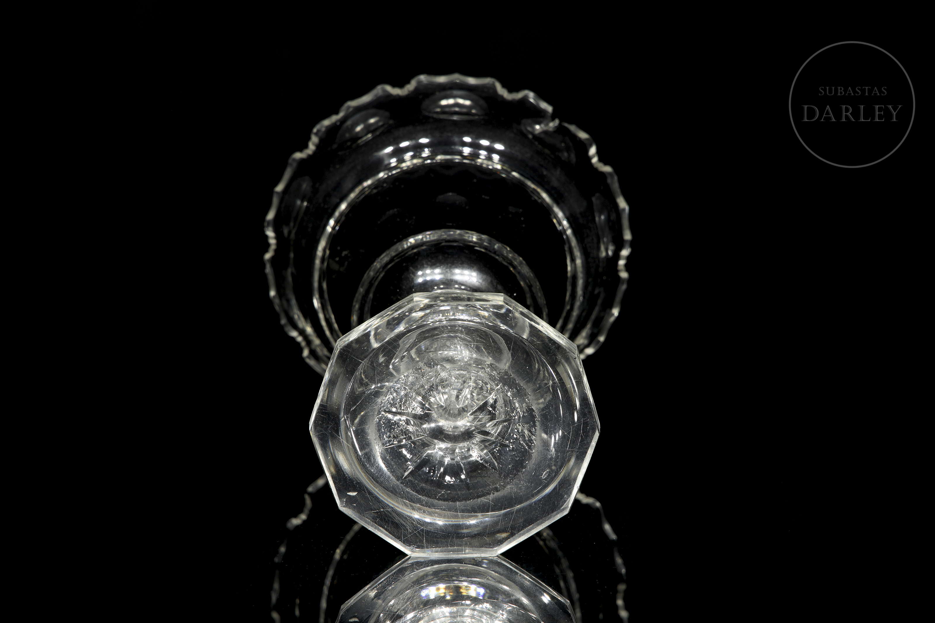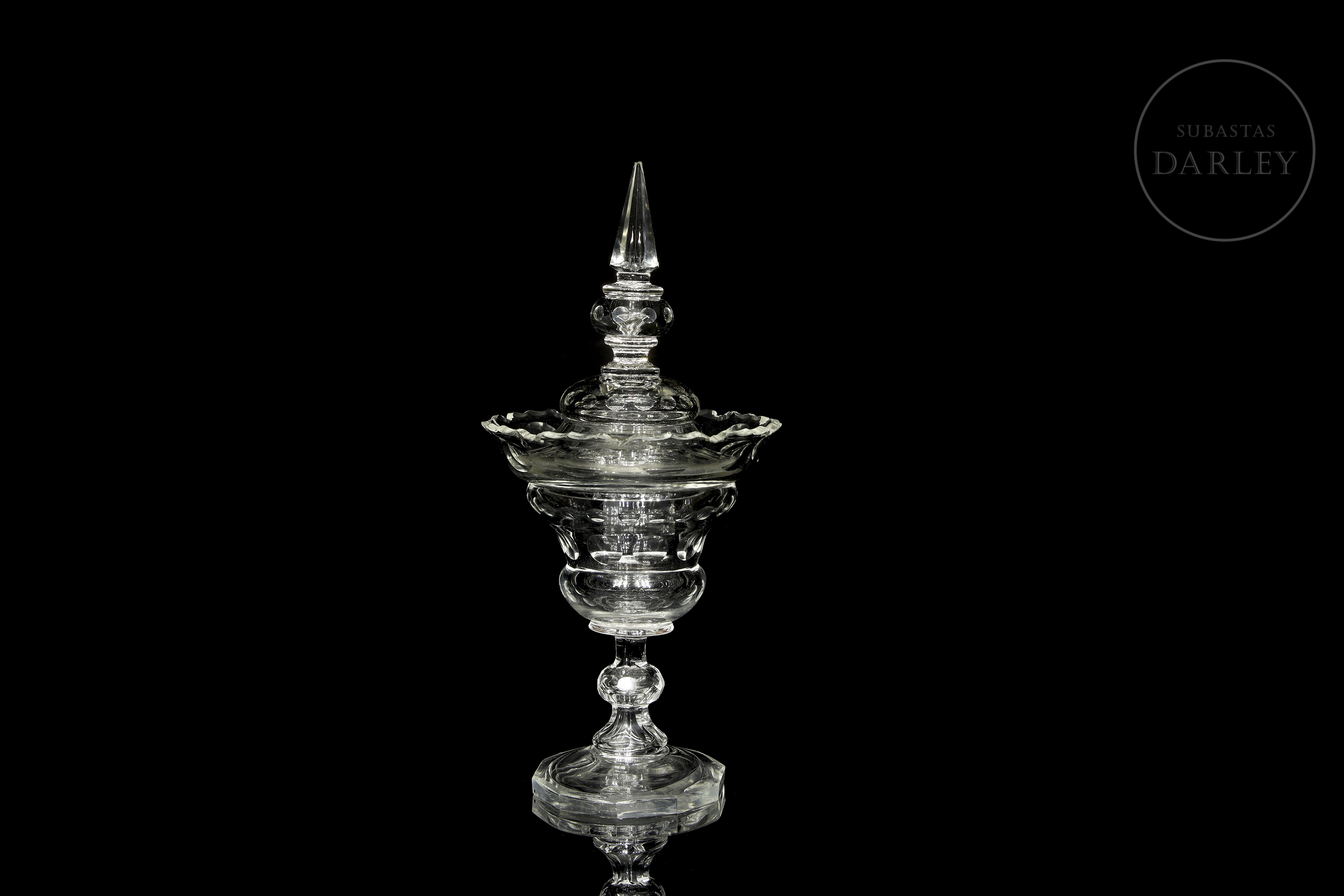 水晶甜品碗或糖果盒。碗盖与碗身或底座均饰有环绕器物周缘雕刻的几何纹样。碗沿可见破损痕迹,顶缘存在轻微瑕疵。