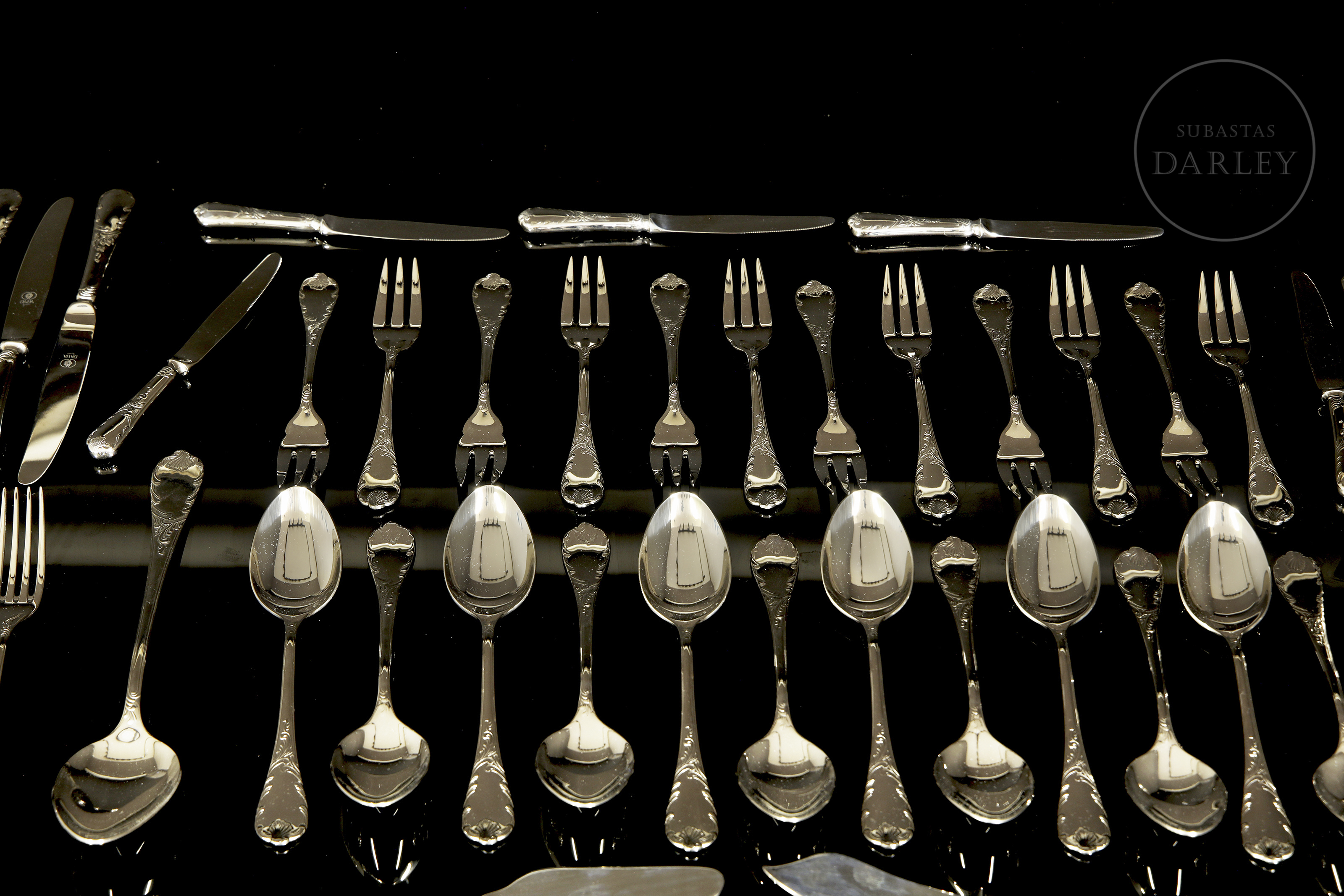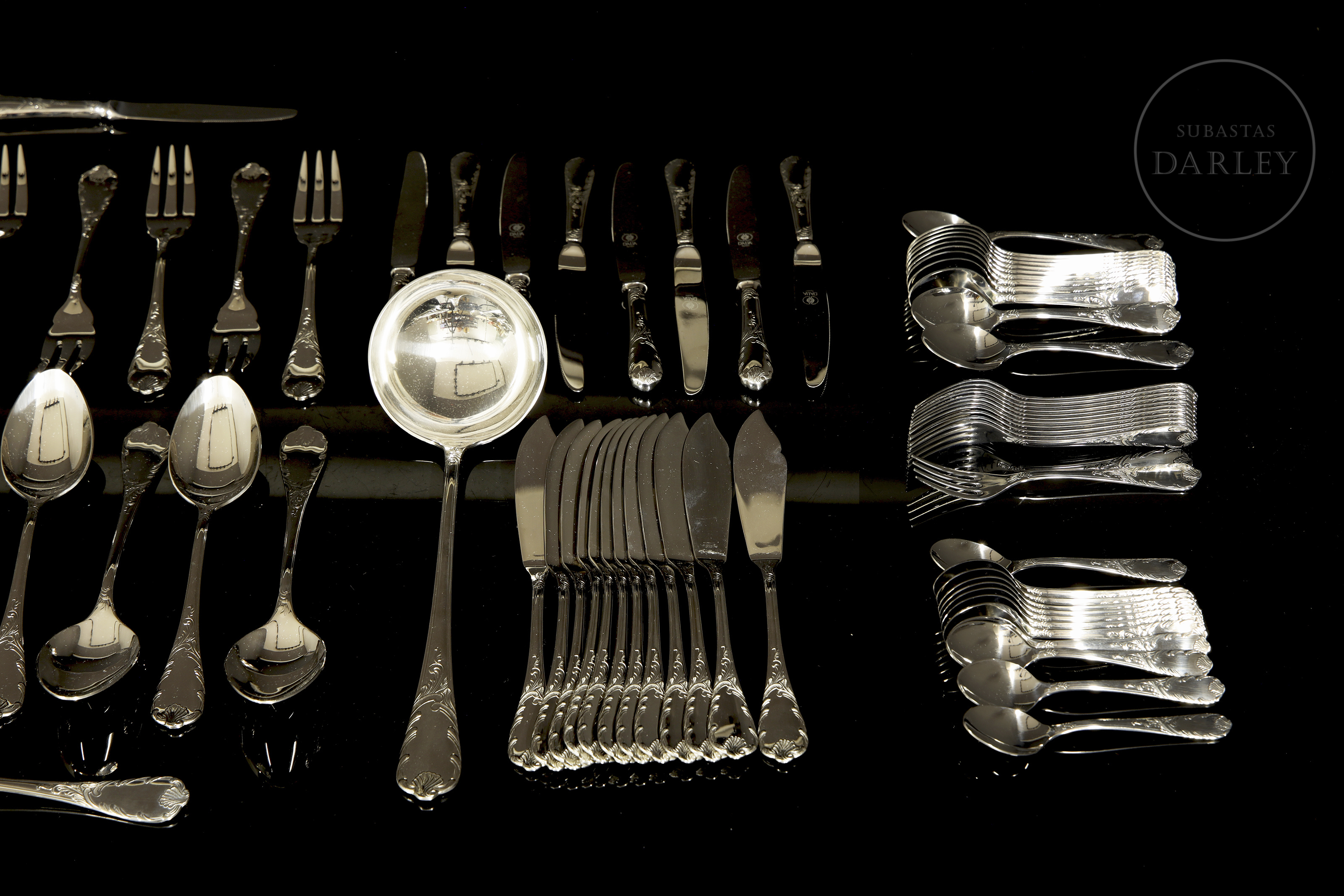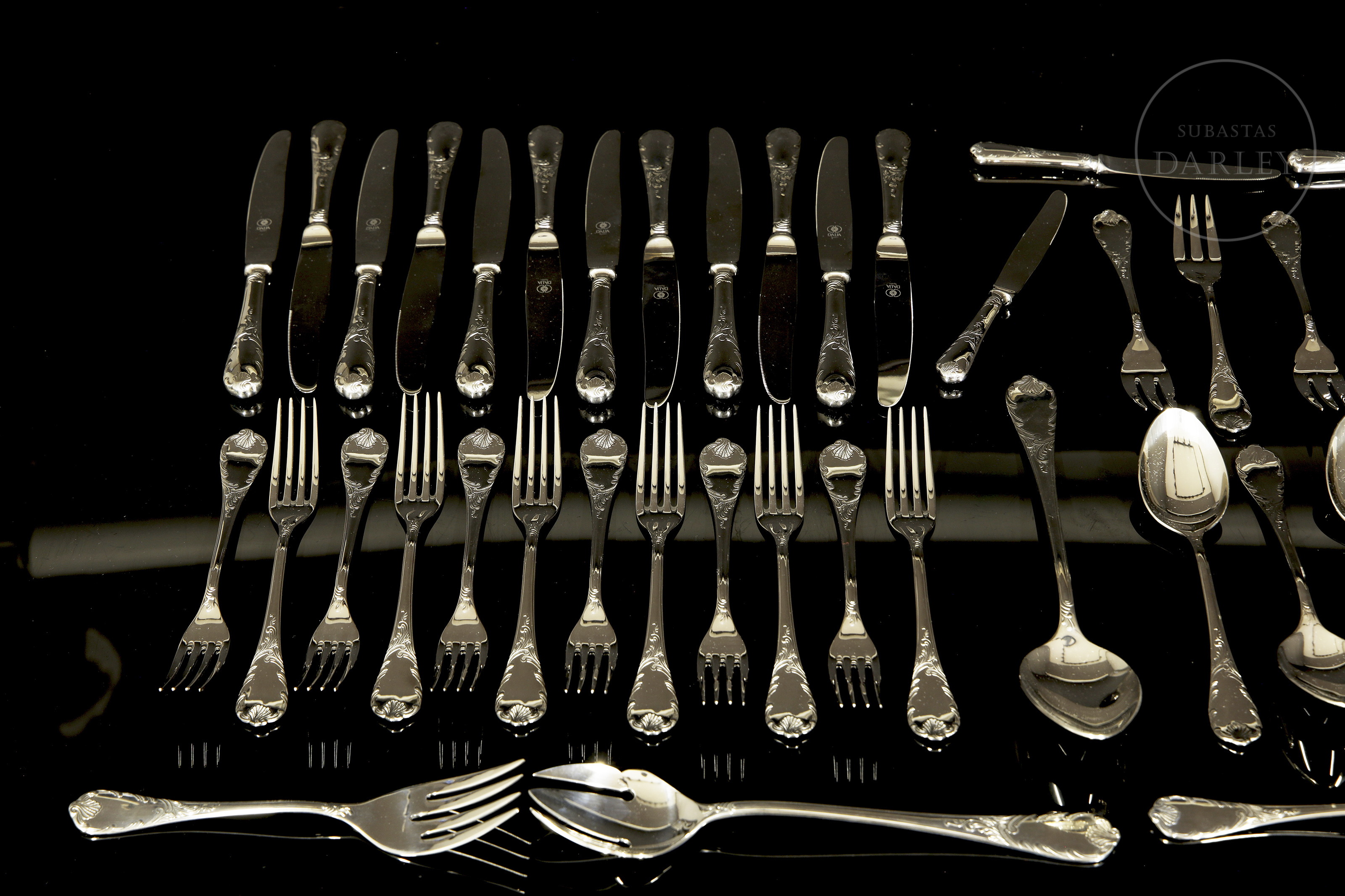达利亚品牌全套餐具,共113件,采用优质不锈钢(18/10)材质。设计经典华美,手柄饰有浮雕式洛可可卷草纹。包含汤勺、蛋糕铲等服务用具。