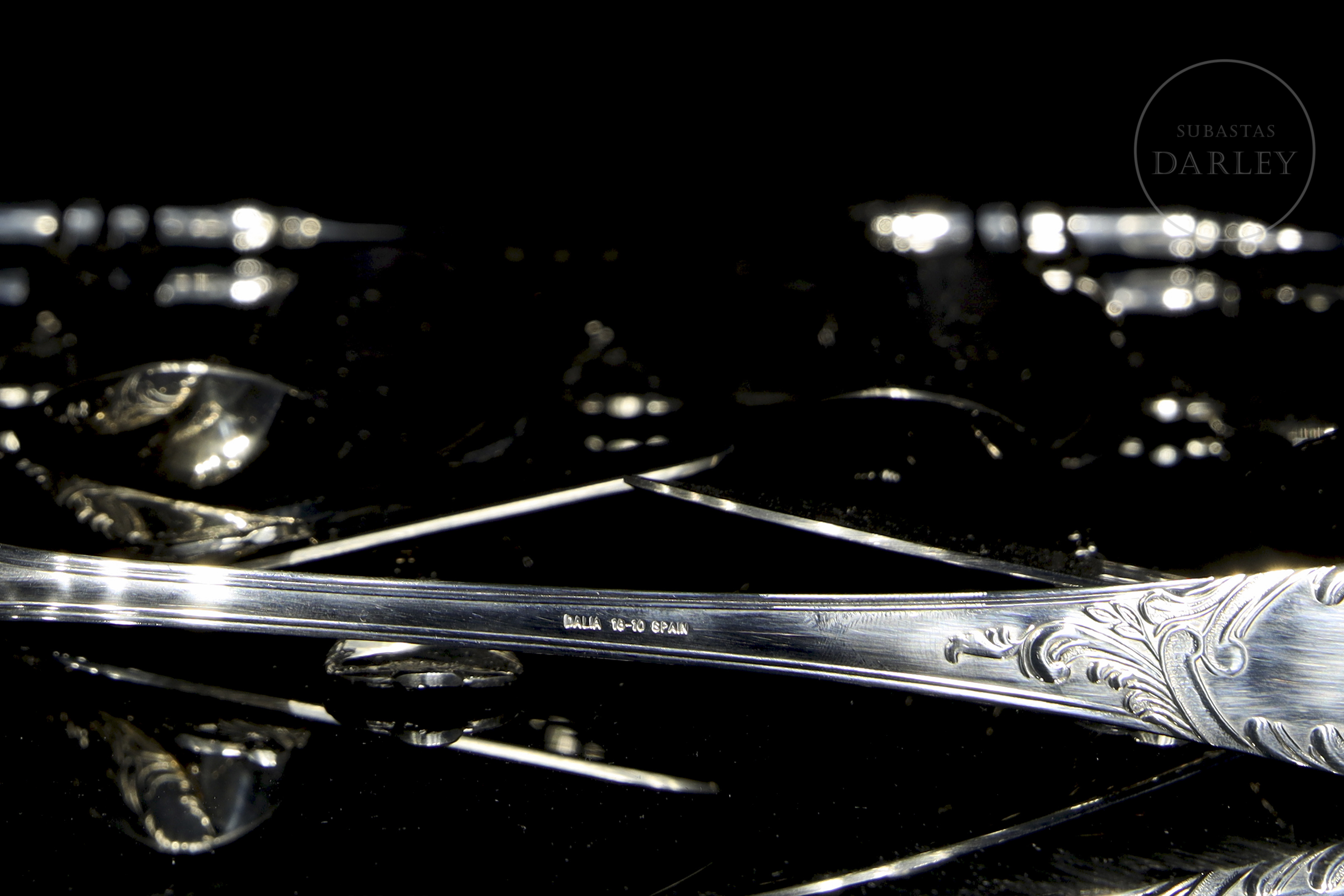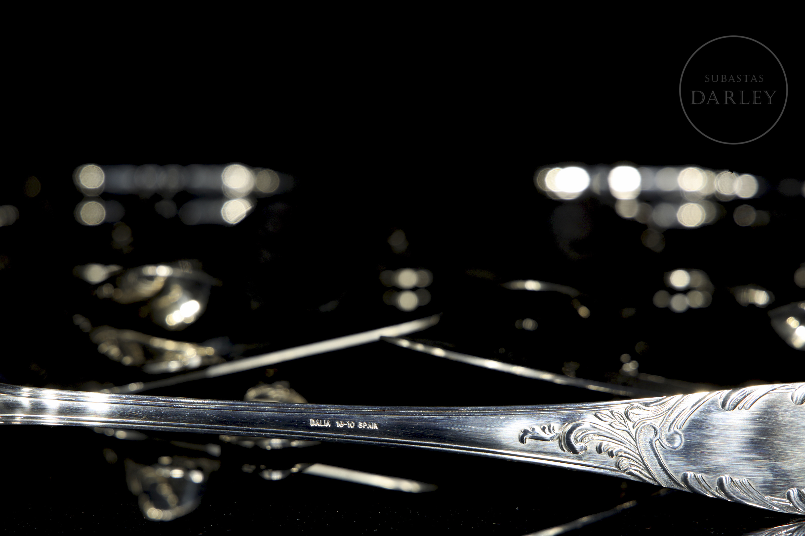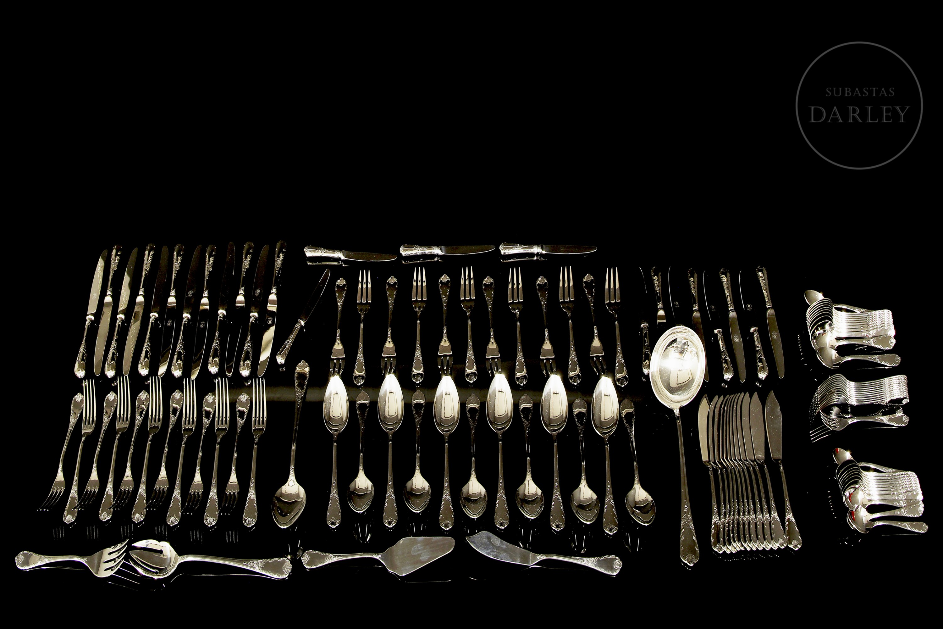达利亚品牌全套餐具,共113件,采用优质不锈钢(18/10)材质。设计经典华美,手柄饰有浮雕式洛可可卷草纹。包含汤勺、蛋糕铲等服务用具。