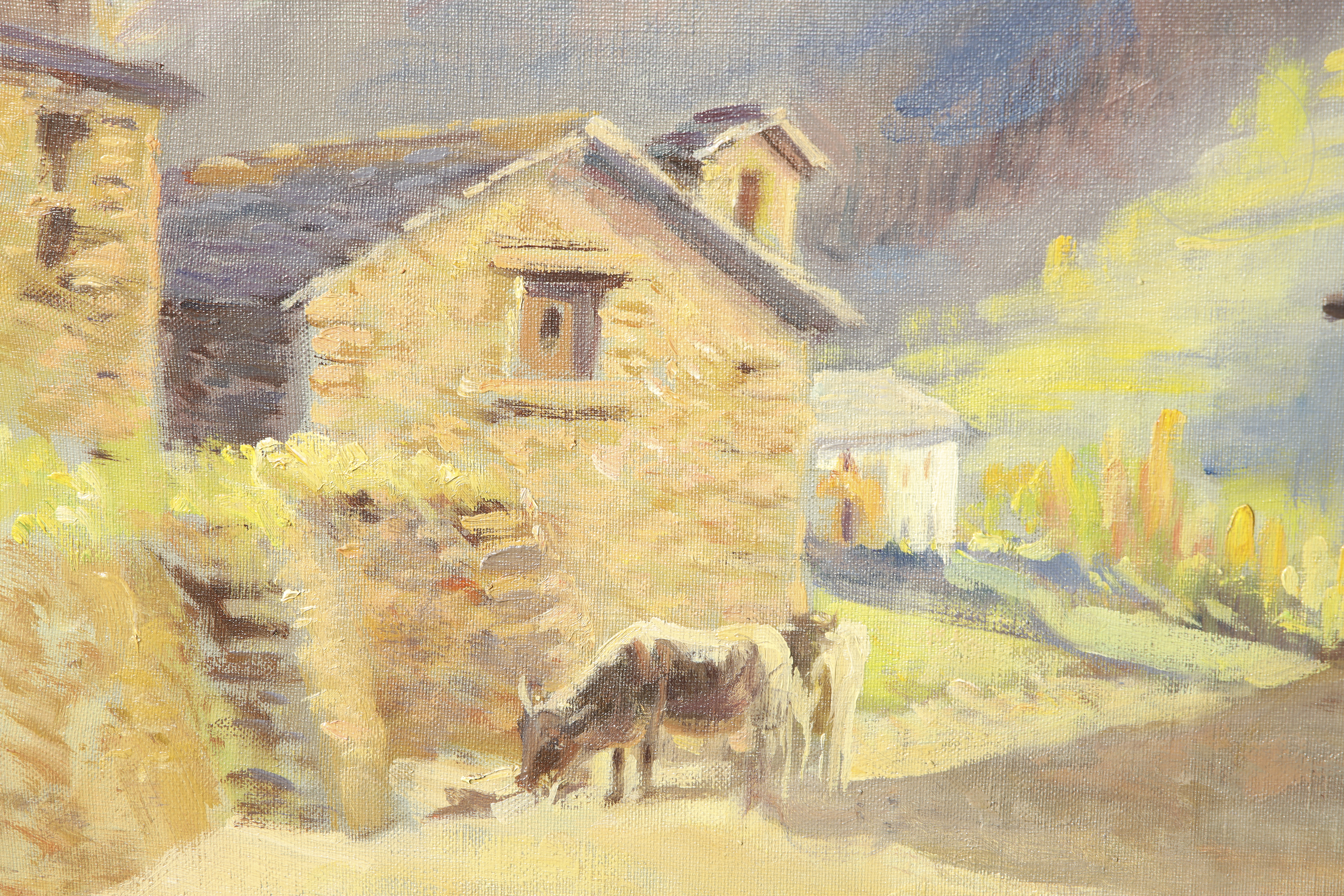 油画布。描绘乡村中的一个村庄。右下角签名“Domingo Soler”。