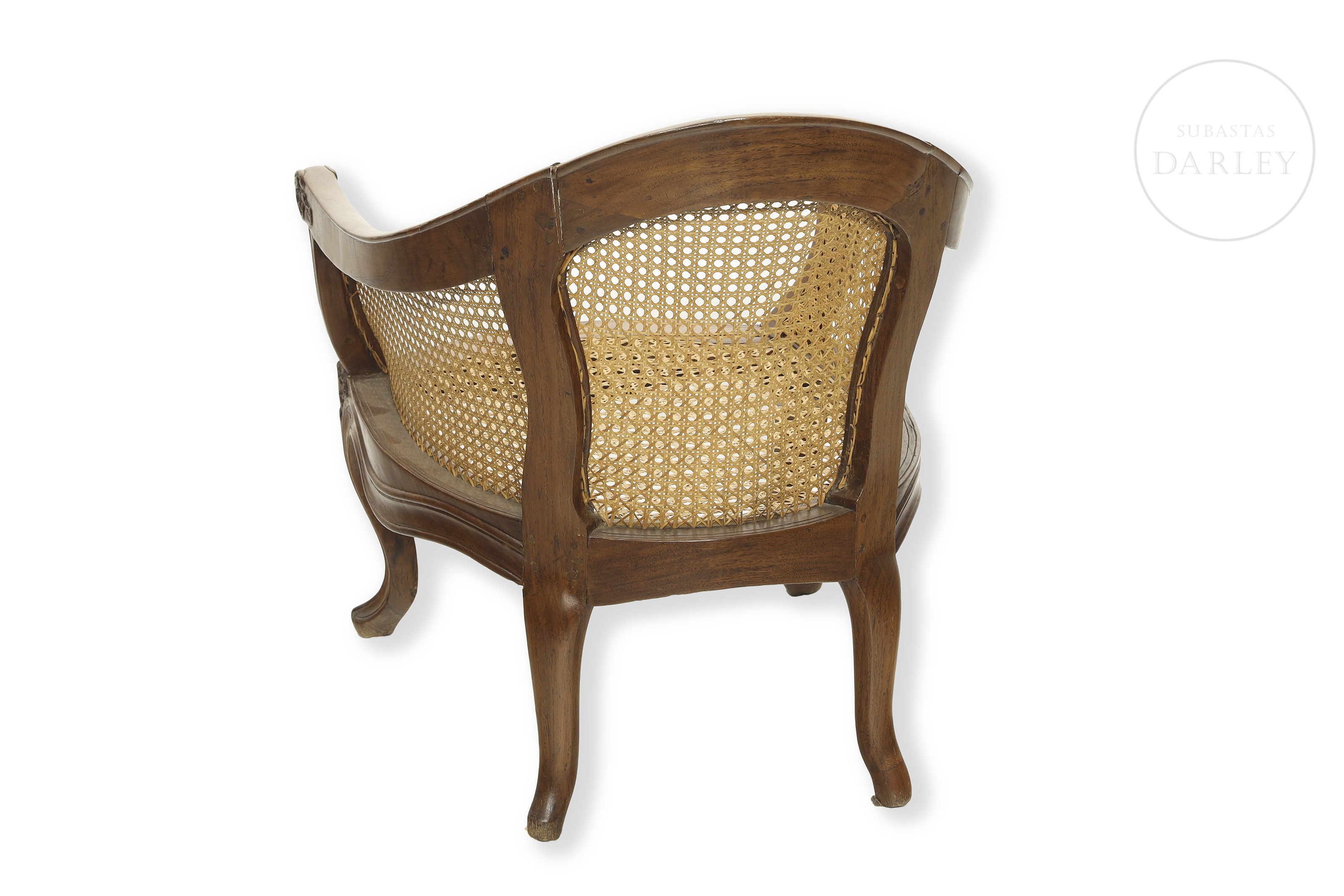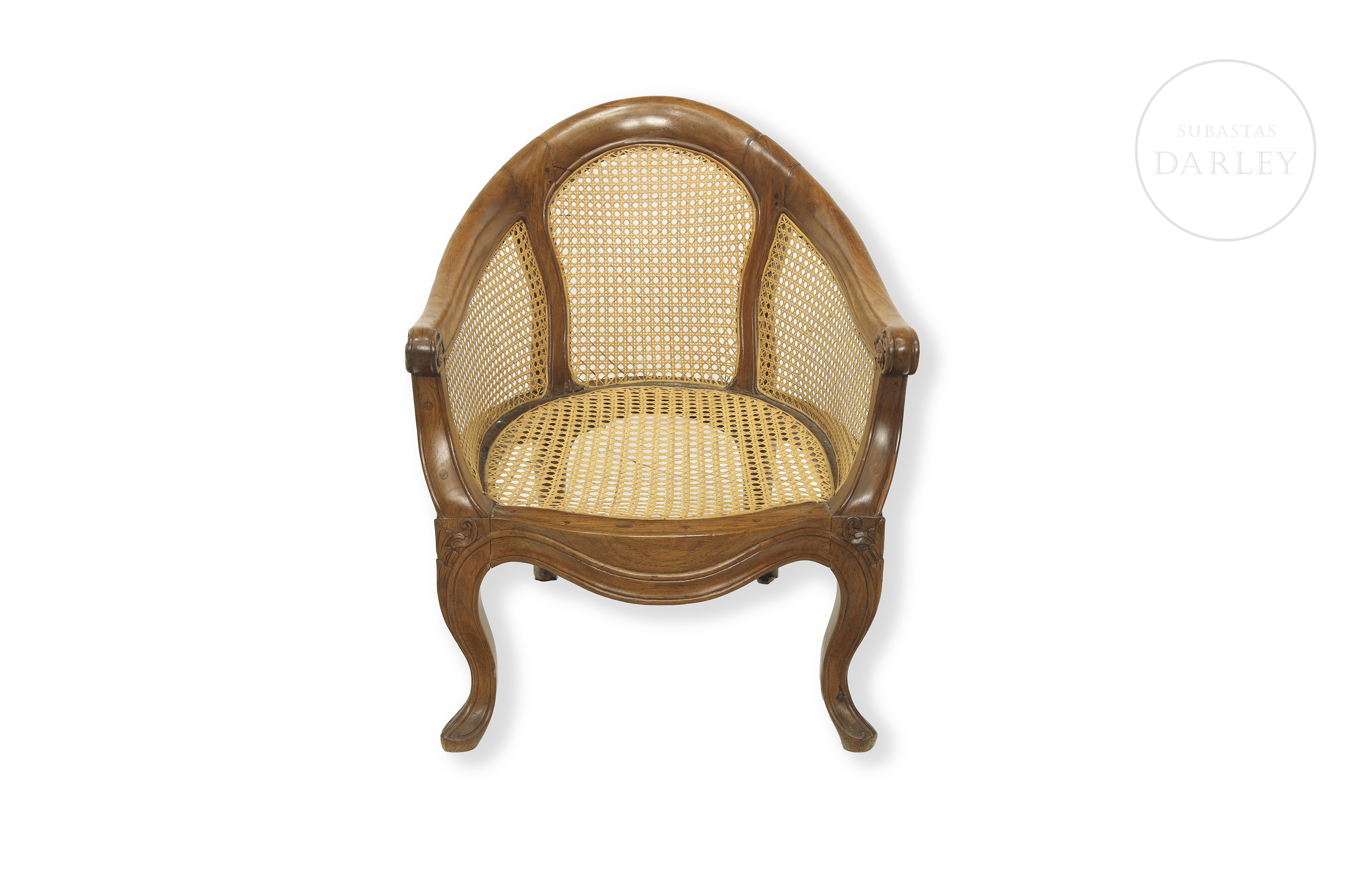 雕花木质座椅,桶形靠背。靠背、座椅和扶手均采用格纹支撑。扶手和前腿饰有浅色叶纹雕刻。