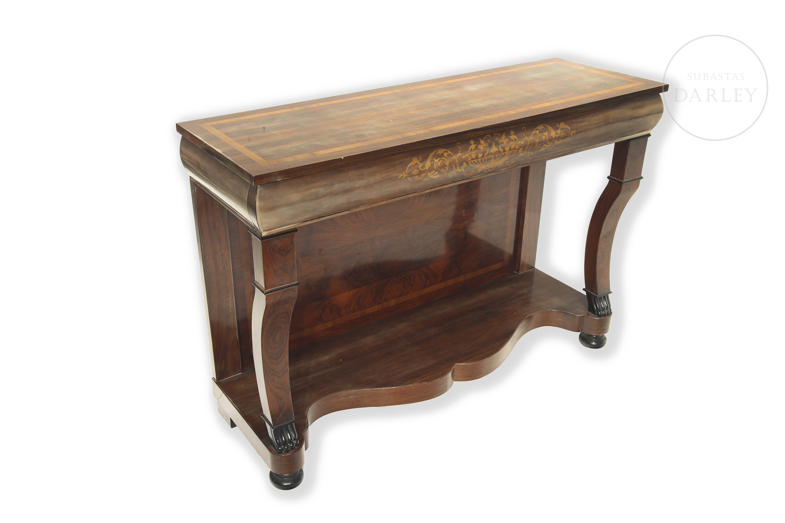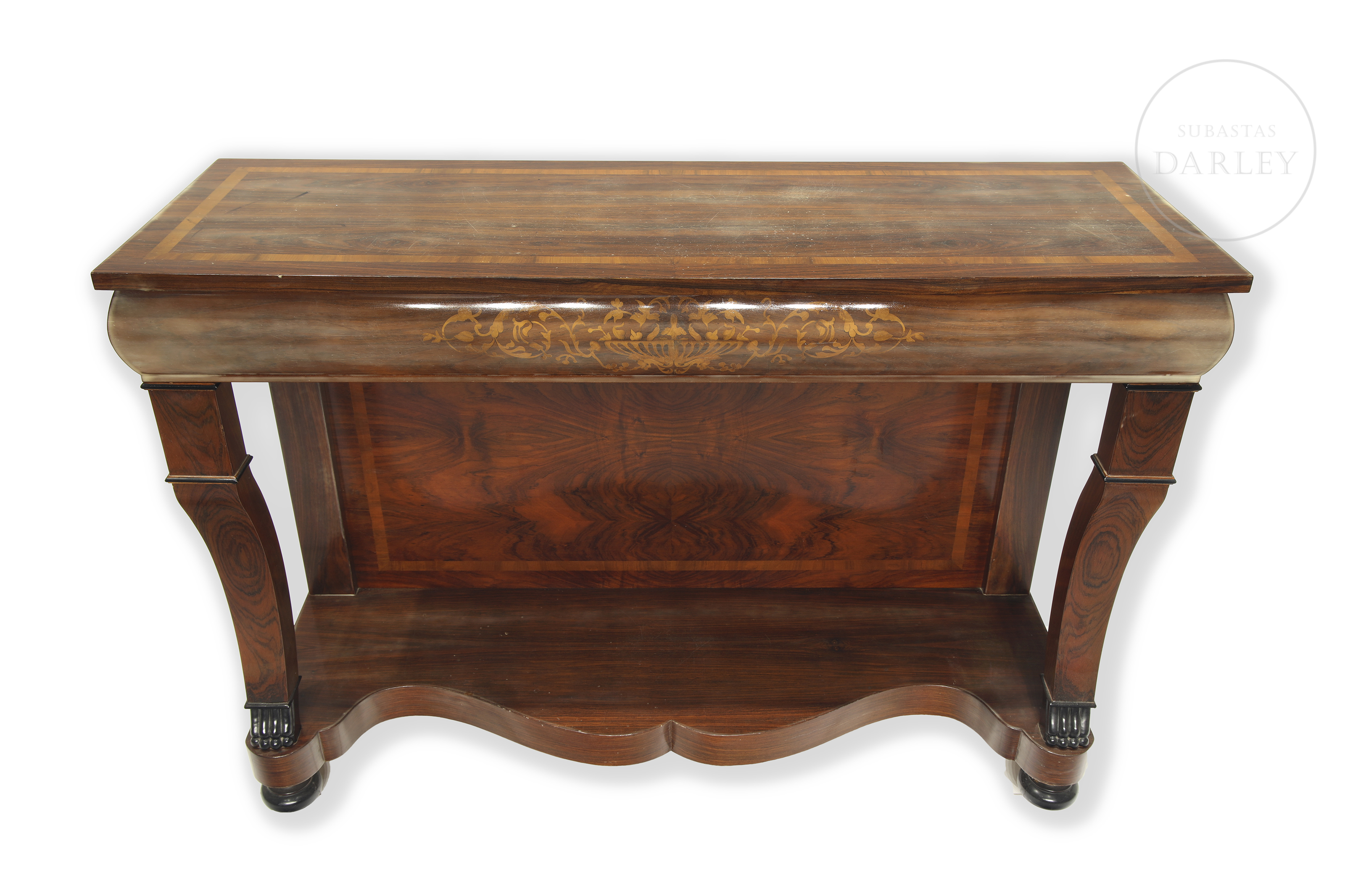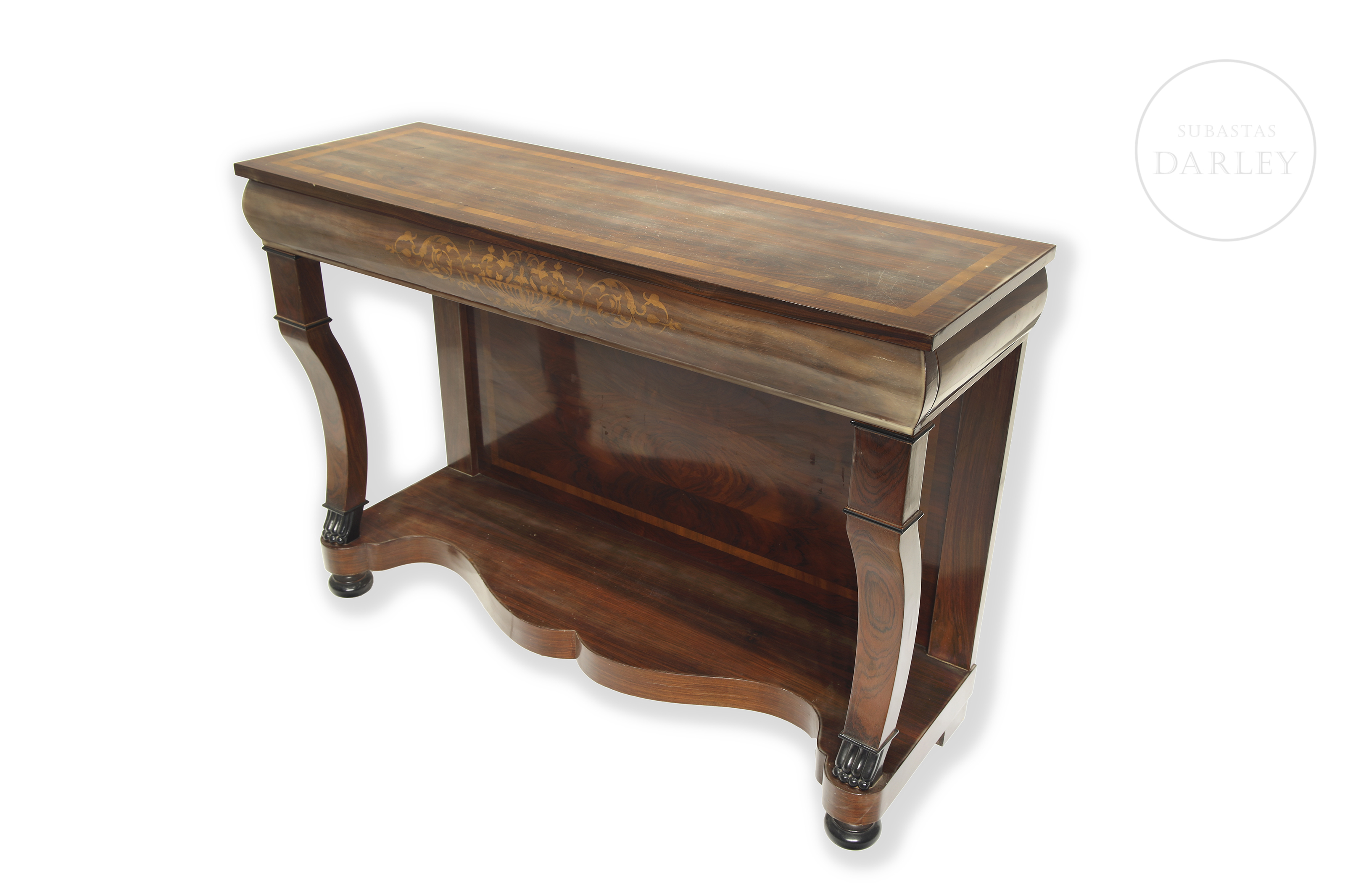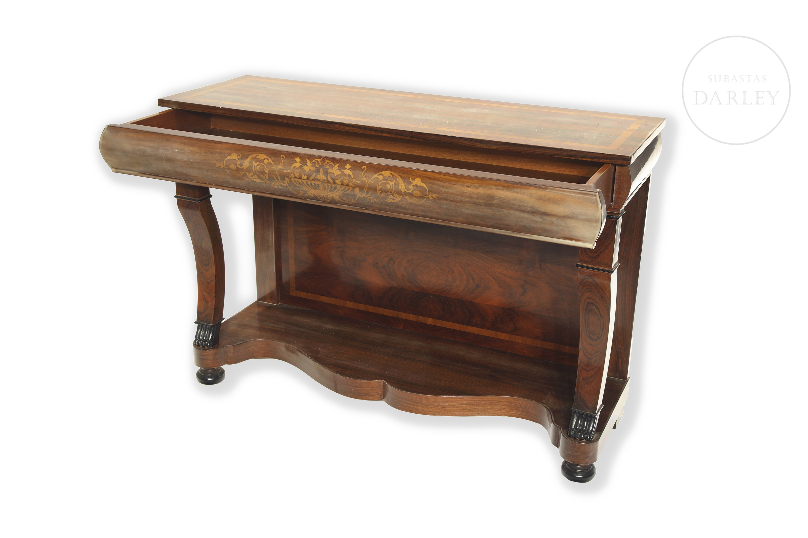 Empire-style console table made of wood, with a rectangular top and a front drawer decorated with floral marquetry. Front supports in the form of angled pilasters topped with carved and ebonized claw feet, joined by a lower shelf with a sinuous outline.