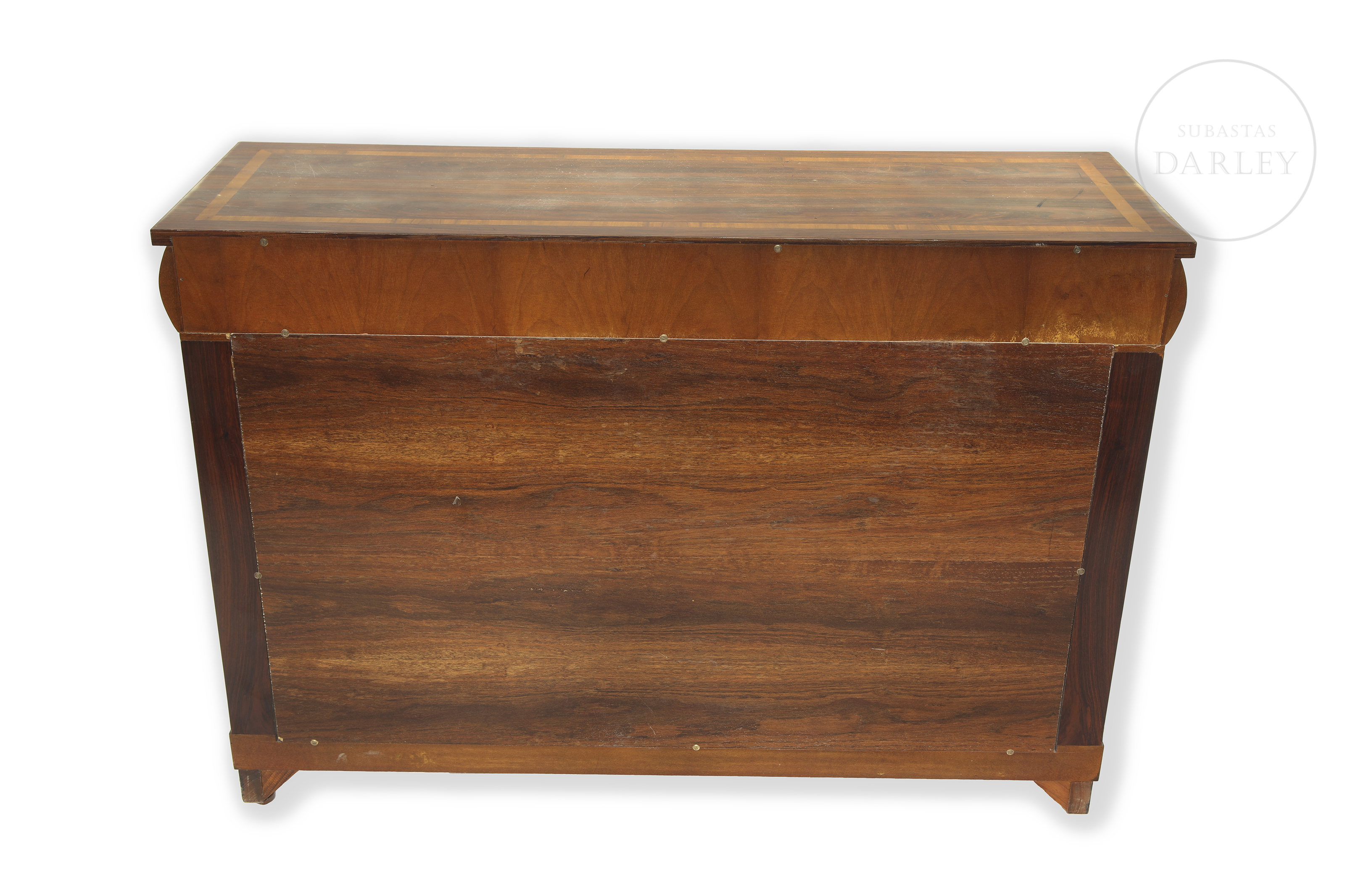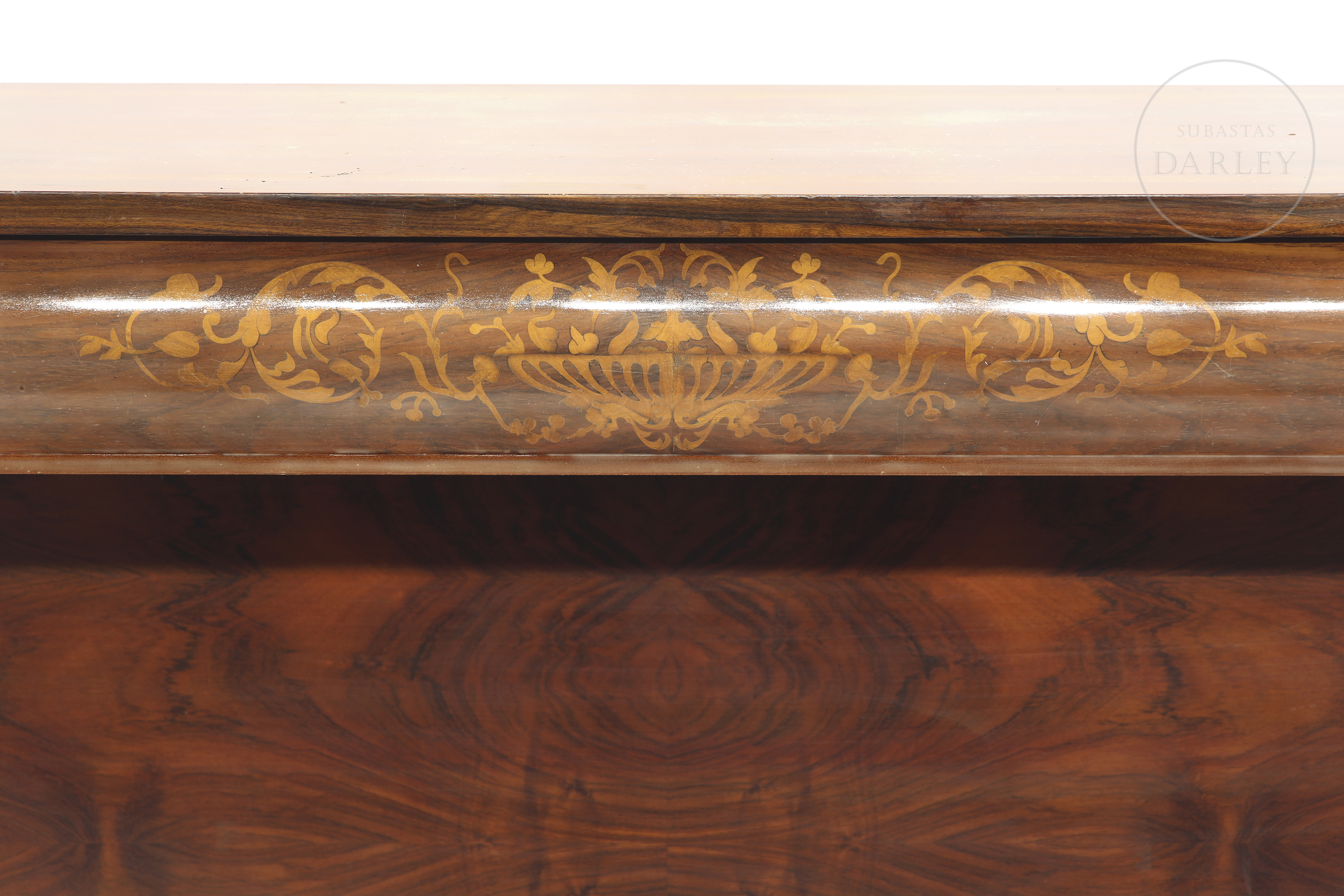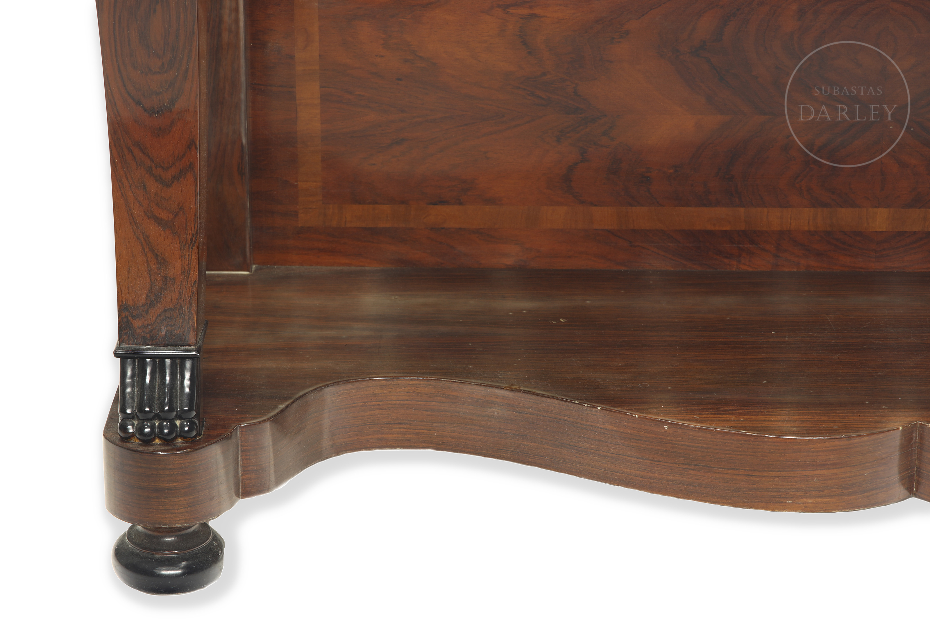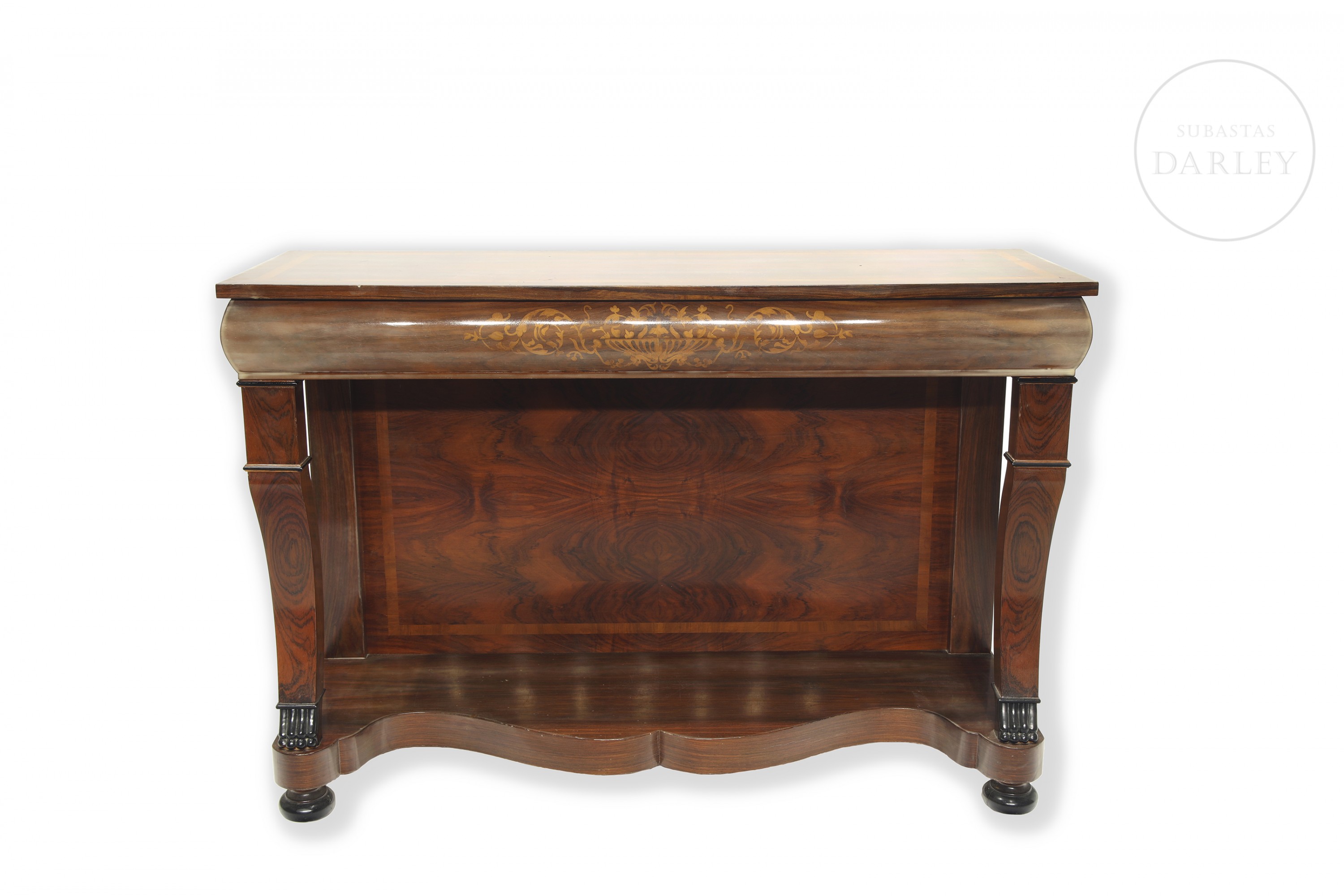 Empire-style console table made of wood, with a rectangular top and a front drawer decorated with floral marquetry. Front supports in the form of angled pilasters topped with carved and ebonized claw feet, joined by a lower shelf with a sinuous outline.