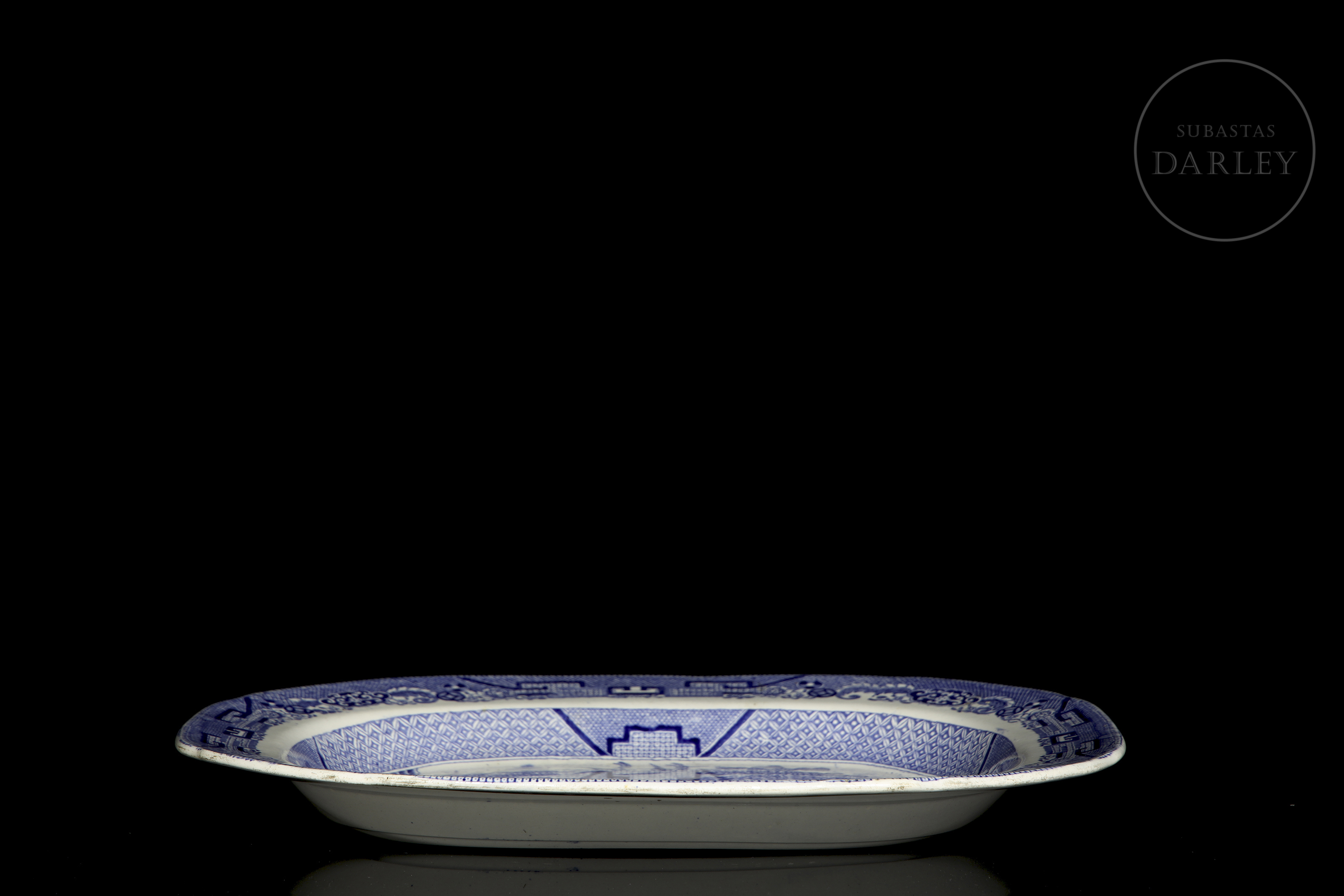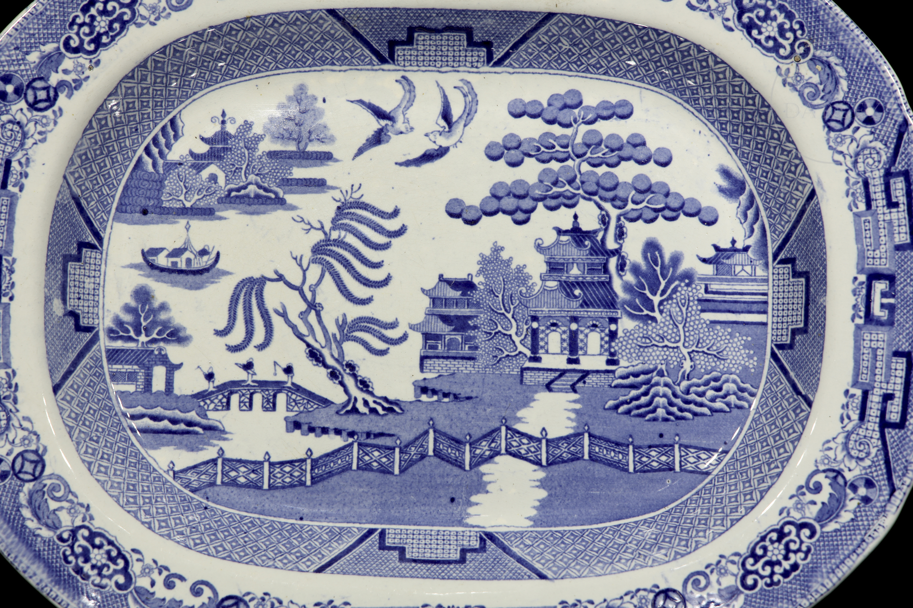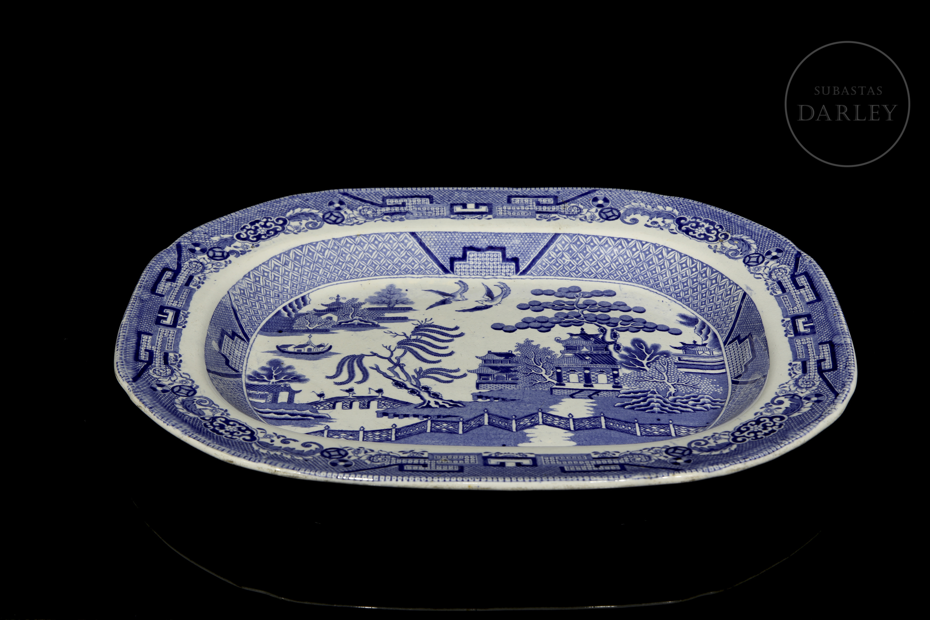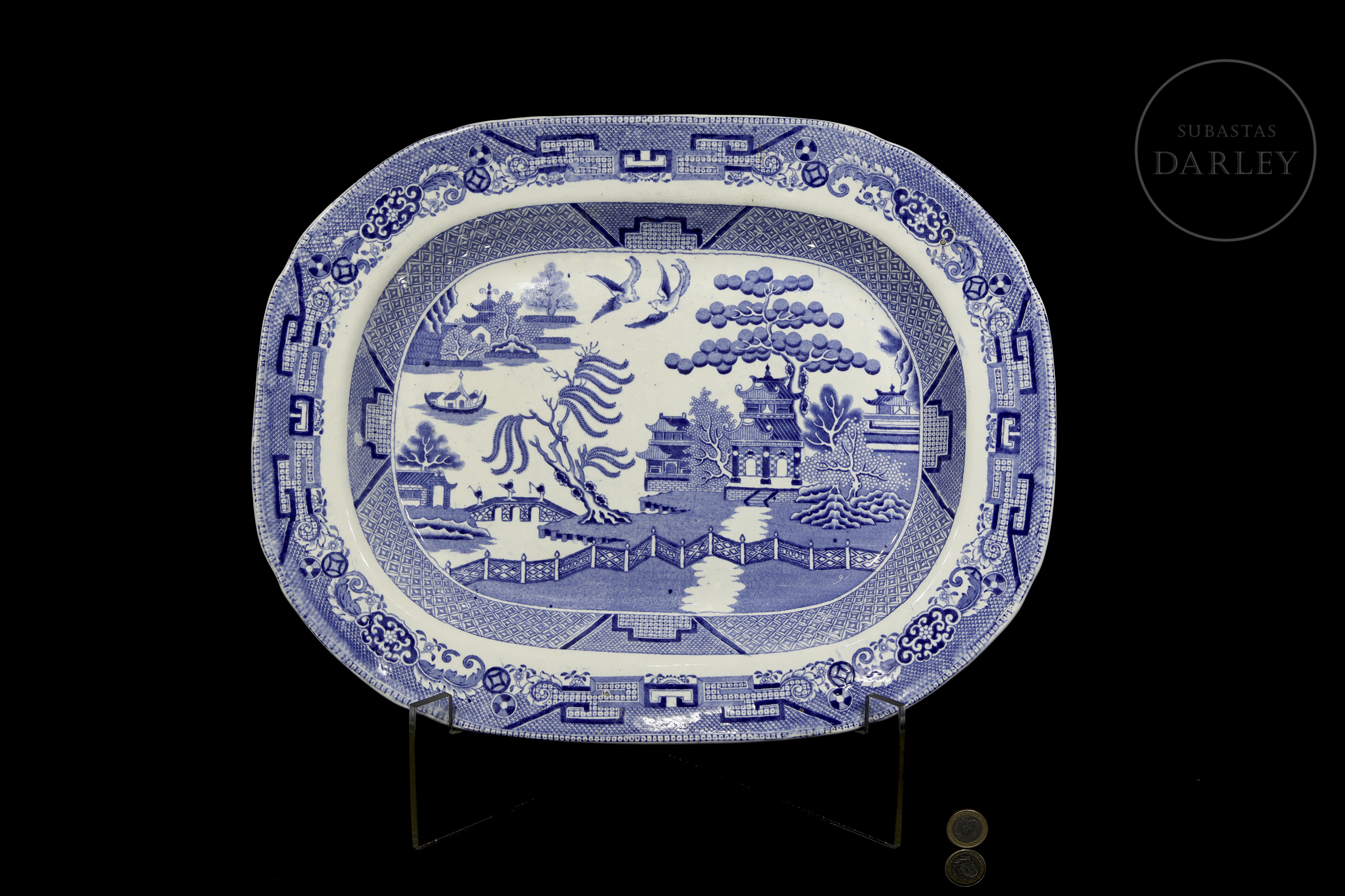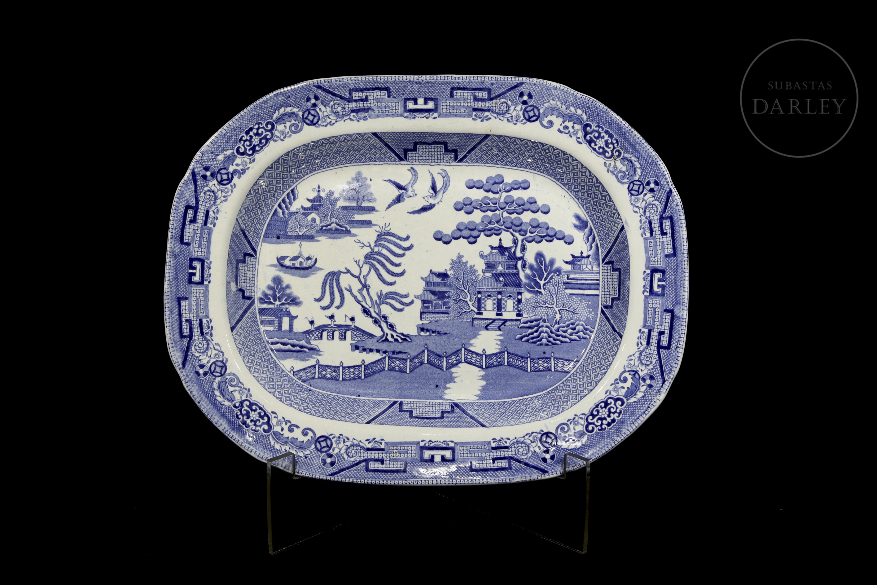 这款古董皇家石瓷托盘饰有标志性的柳树纹,产于19世纪的英国。柳树纹是一种蓝白相间的转印图案,其灵感源自当时的中国纹样,并在18世纪后期风靡英国。