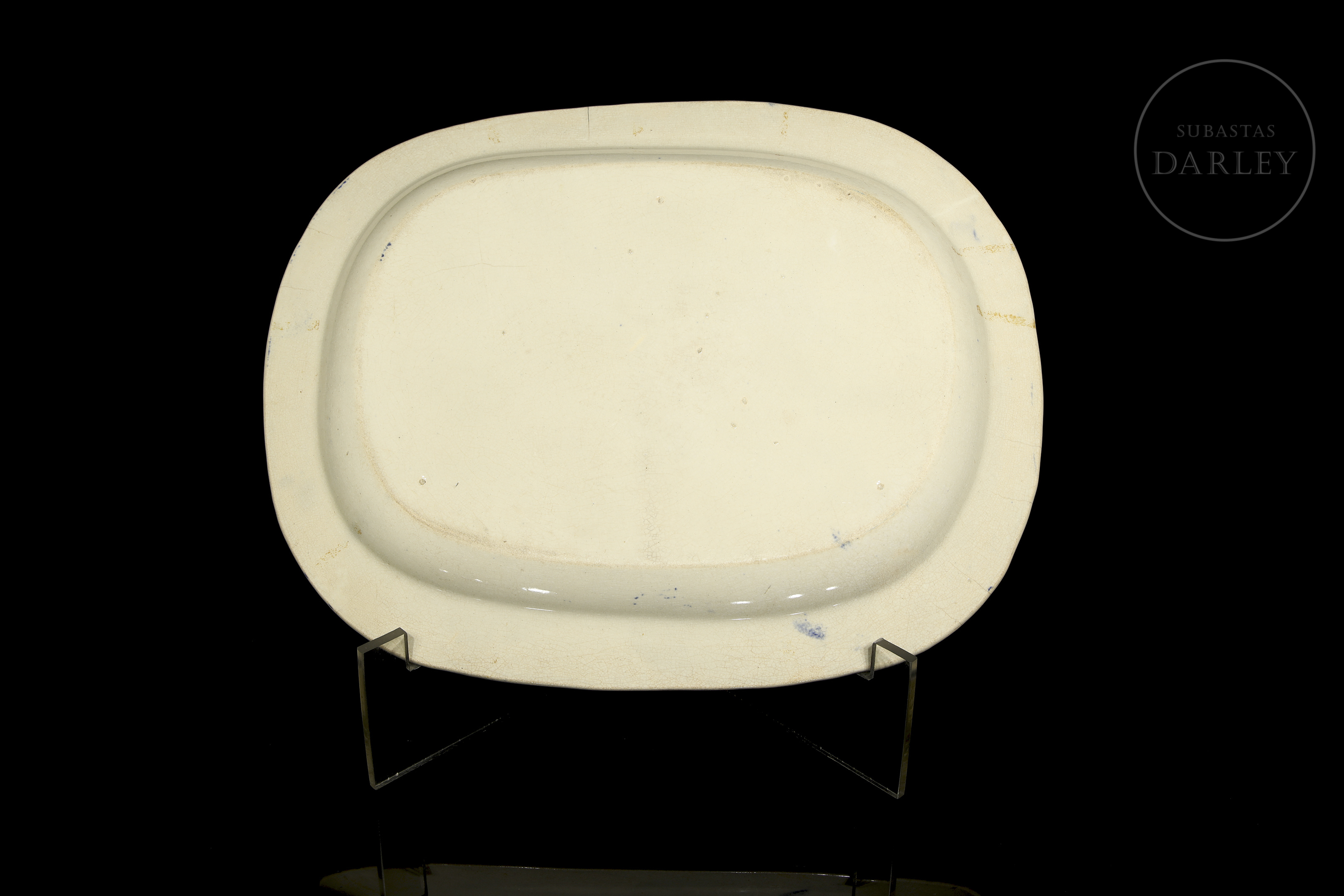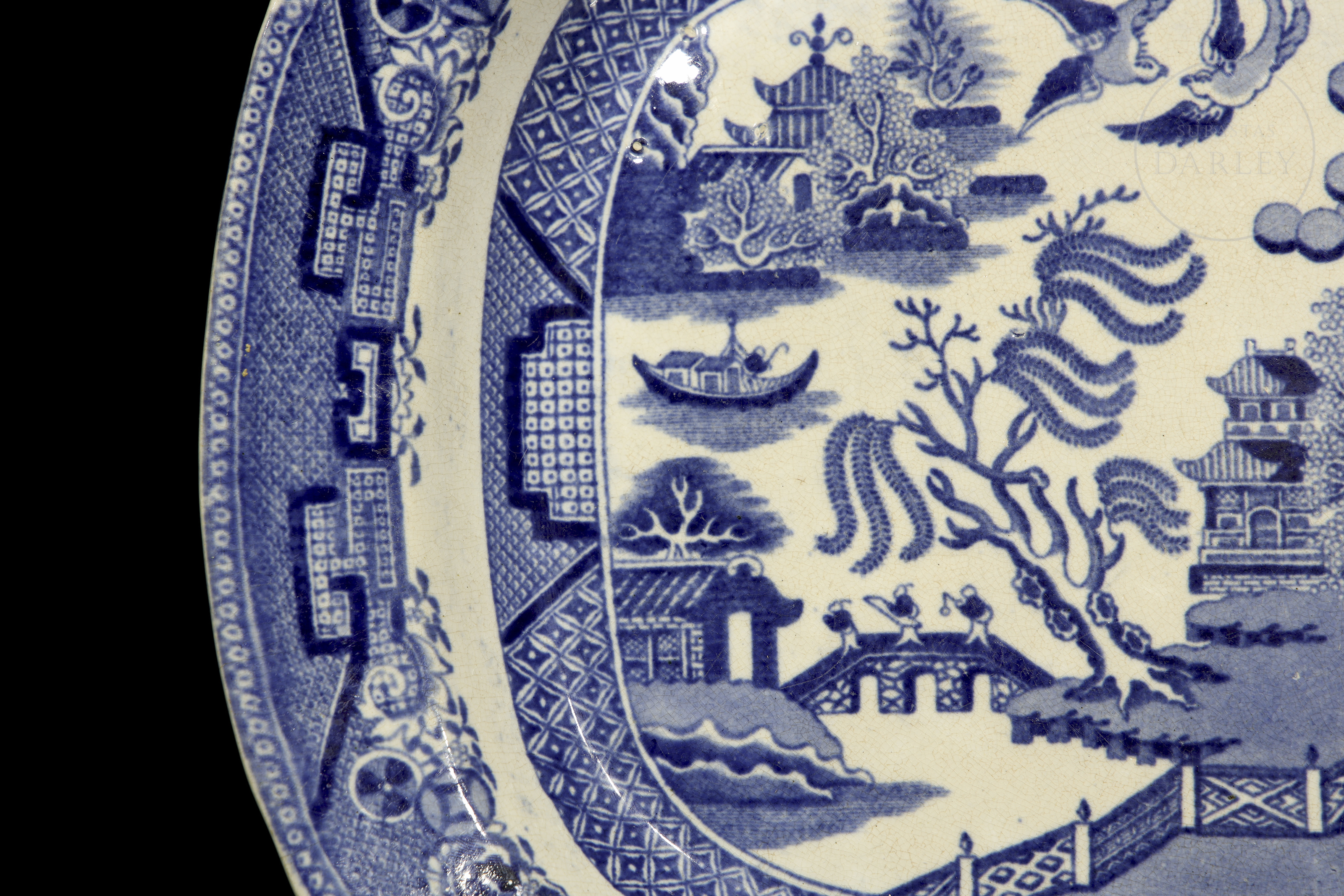 托盘或碟子,饰有经典的“柳树纹”图案,该图案起源于18世纪末的英国,并在19世纪风靡一时。左上角有破损,已重新上色。