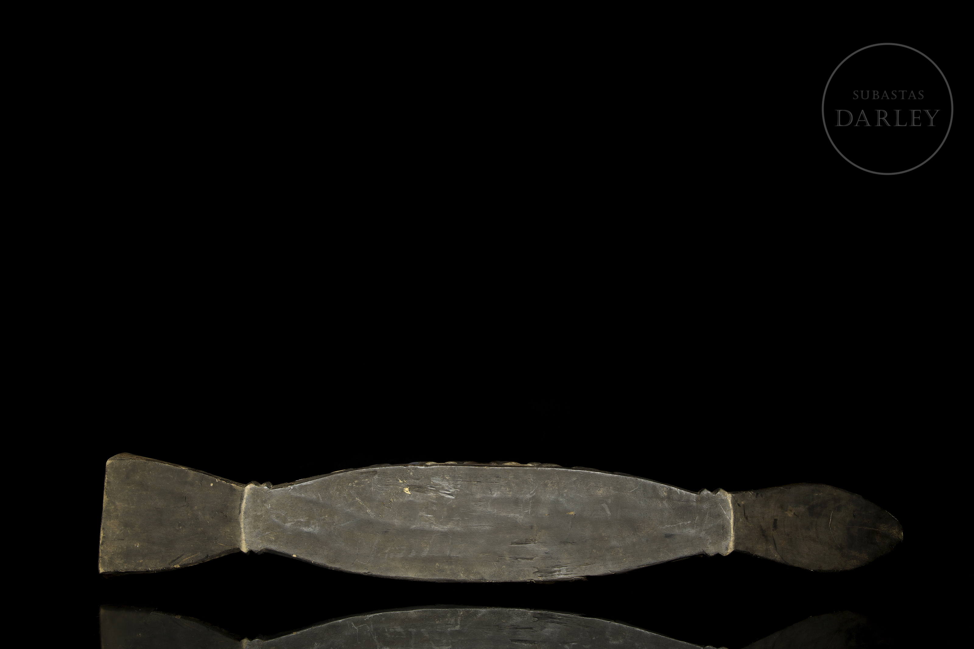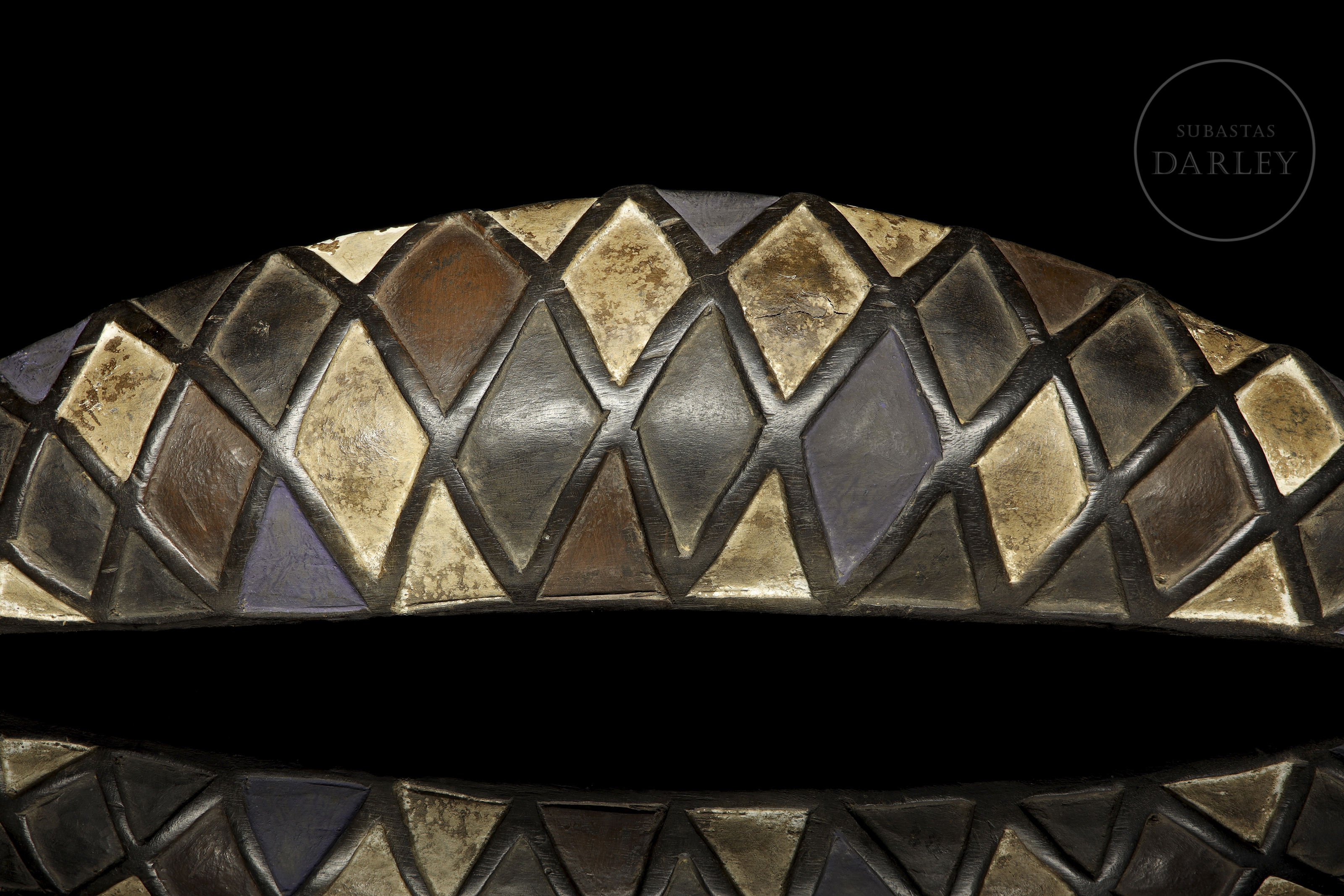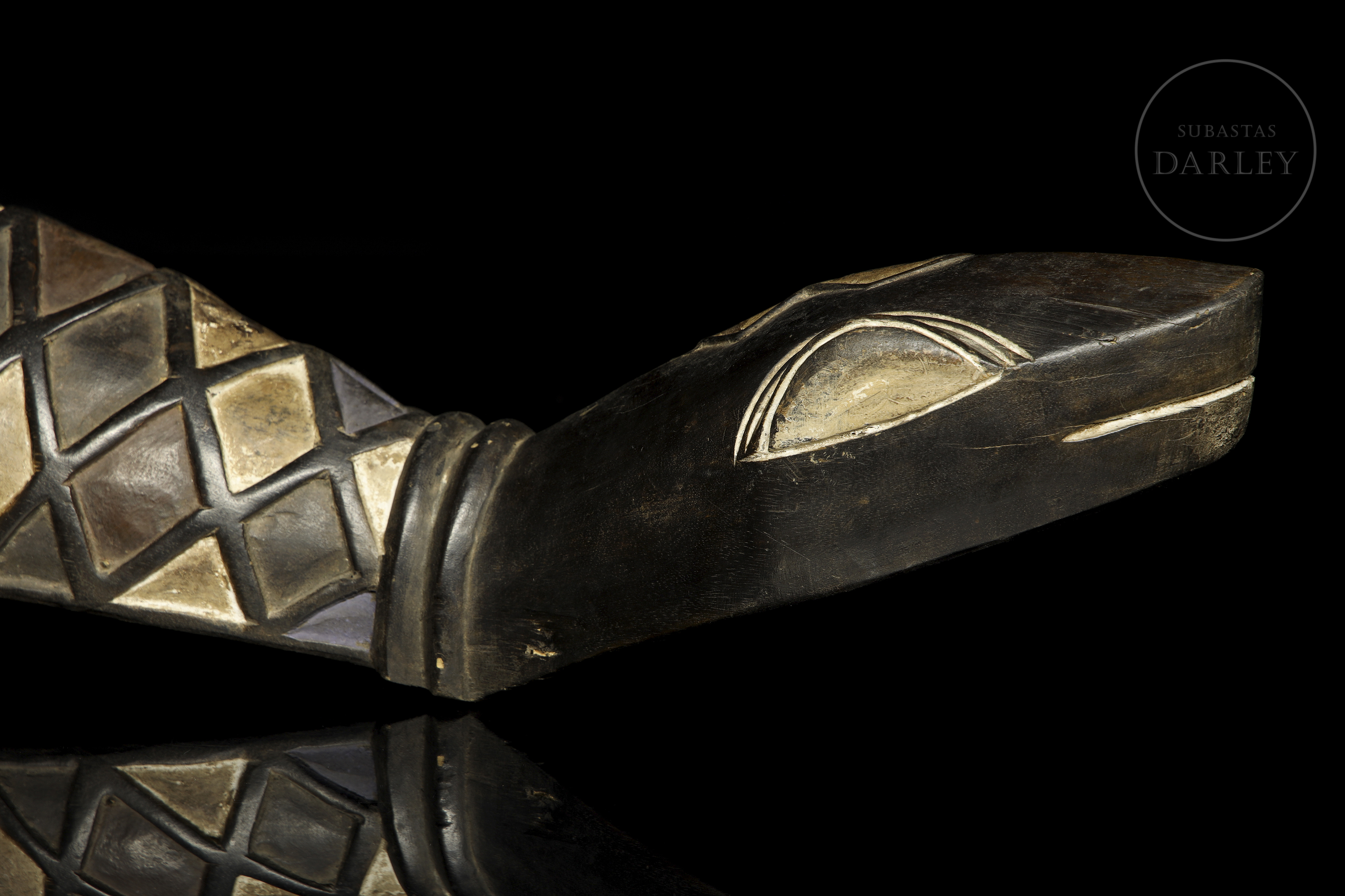 Carved and polychromed wood. It has an elongated shape, imitating the morphology of a reptile with a scaled body, made up of coloured diamonds, and a sharp head with almond-shaped eyes. It is labelled ‘Kalahari artesanado S.L.’.