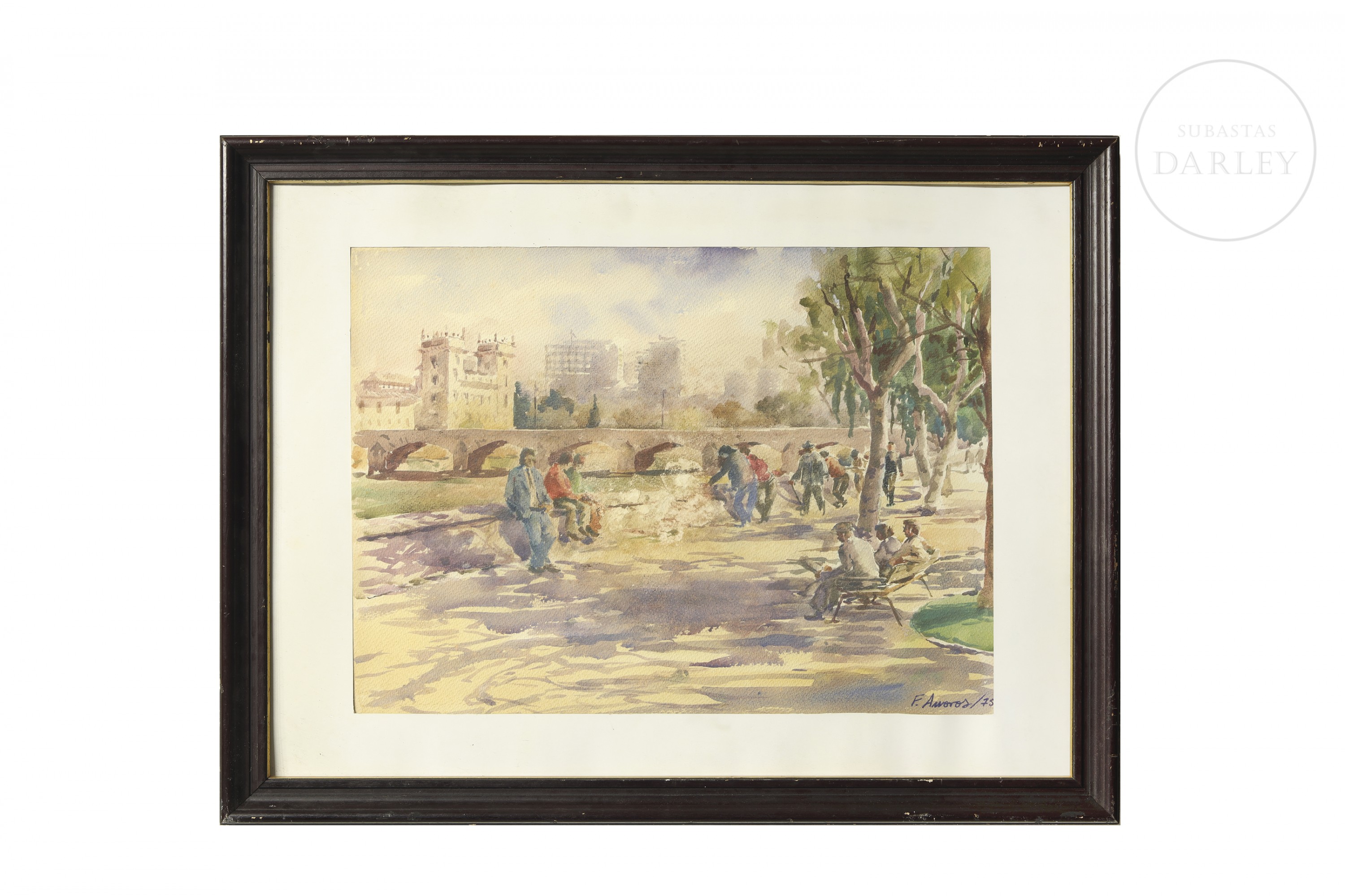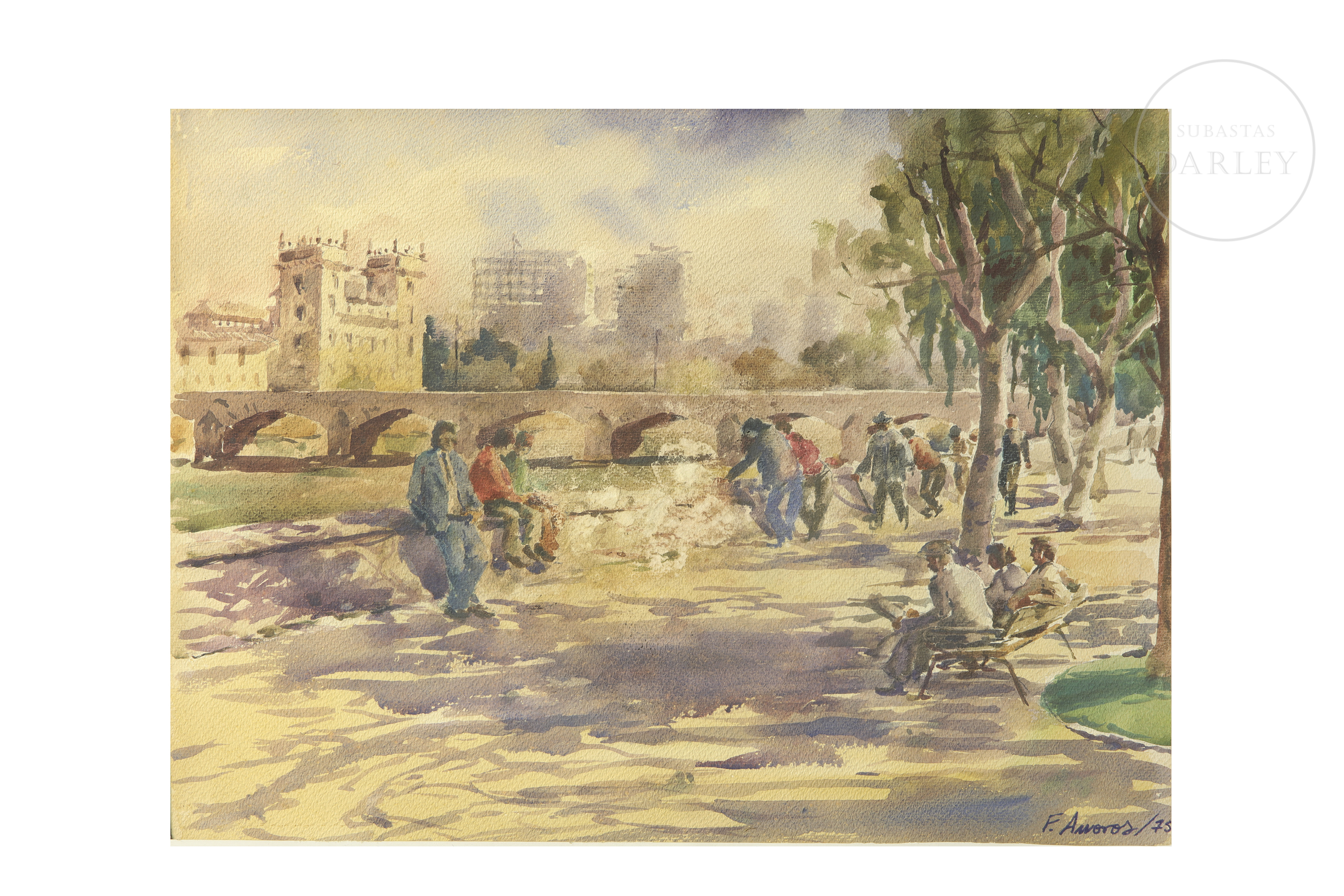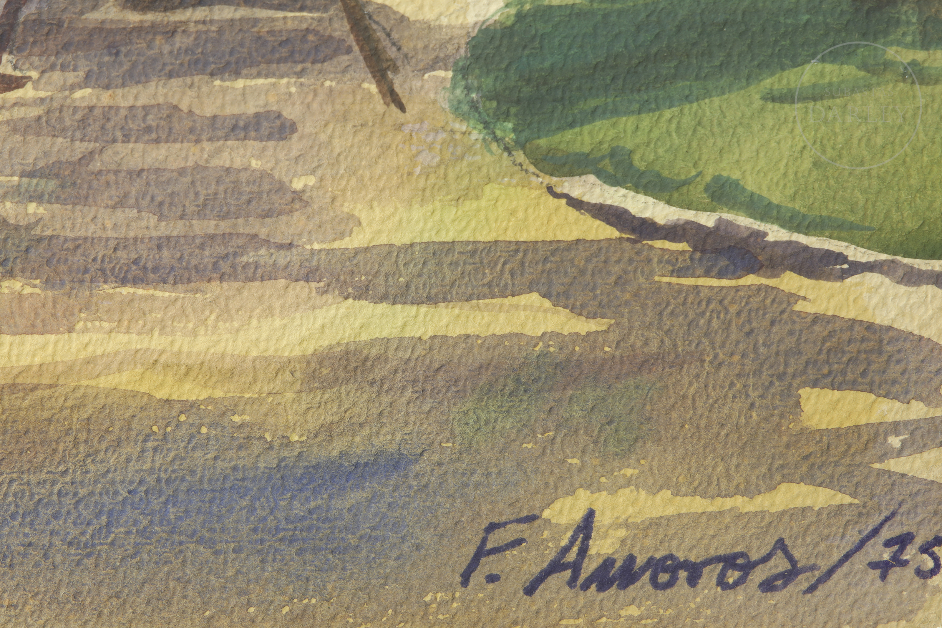 纸本水彩。右下角有签名及日期“F. Amoros/75”。