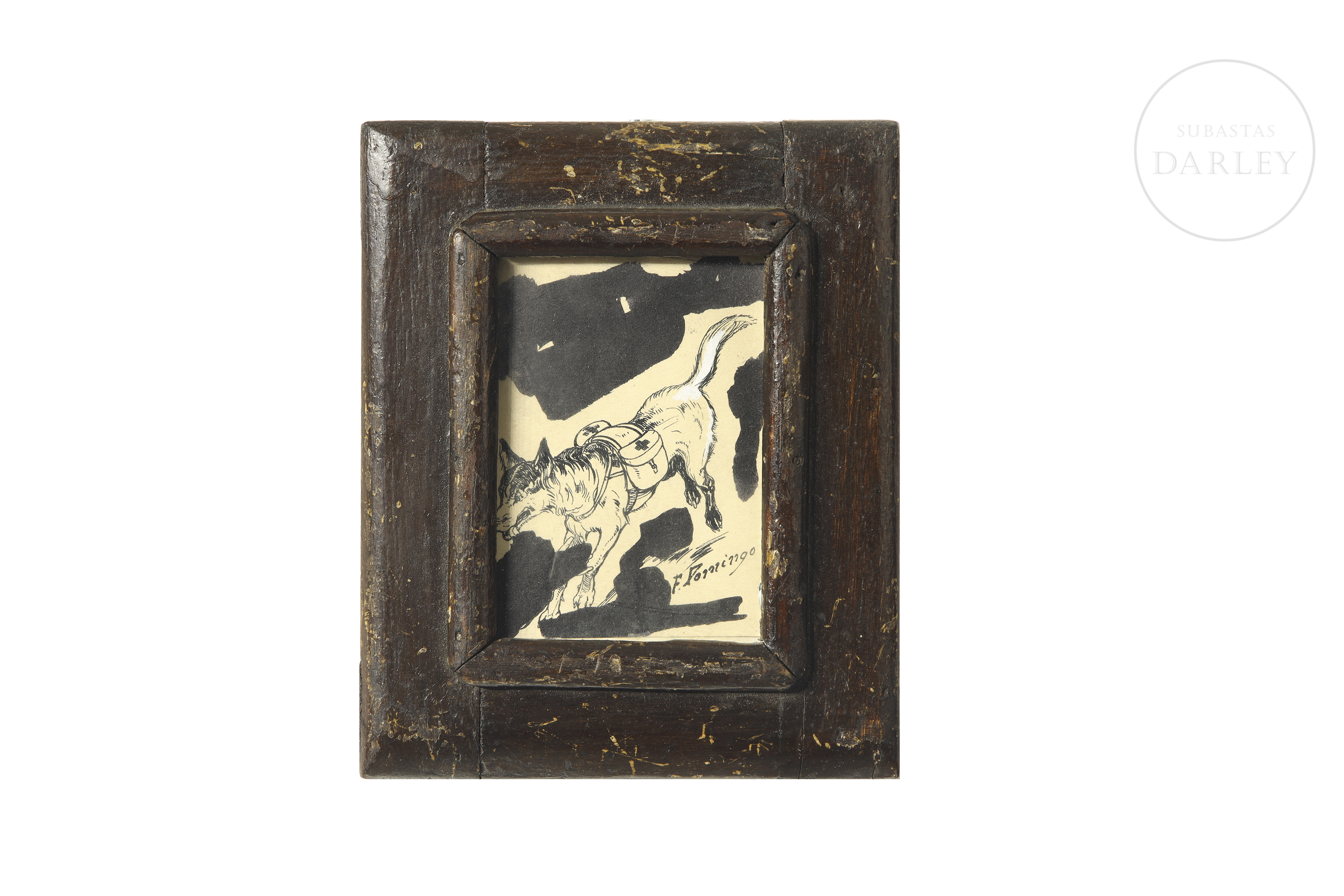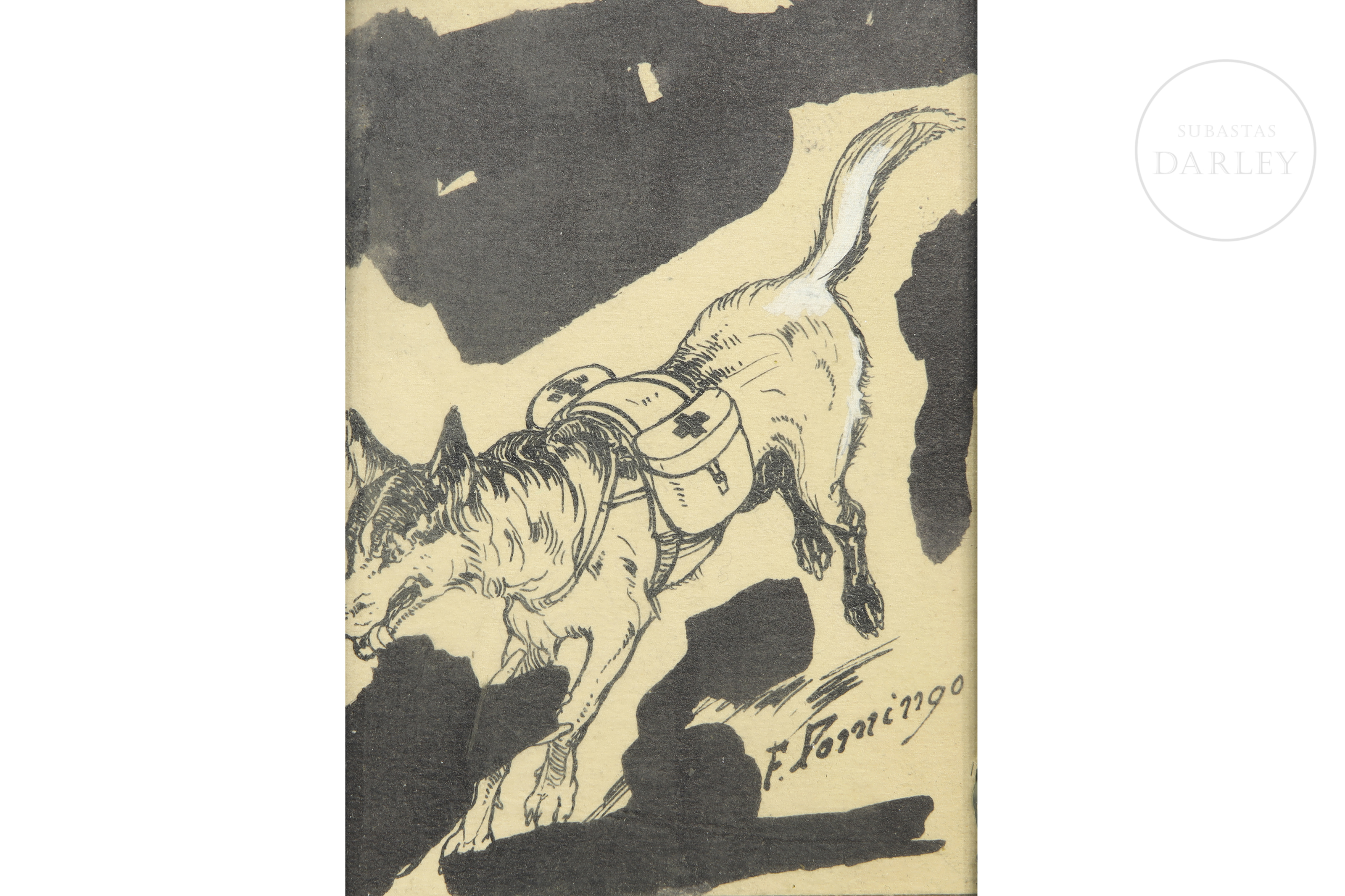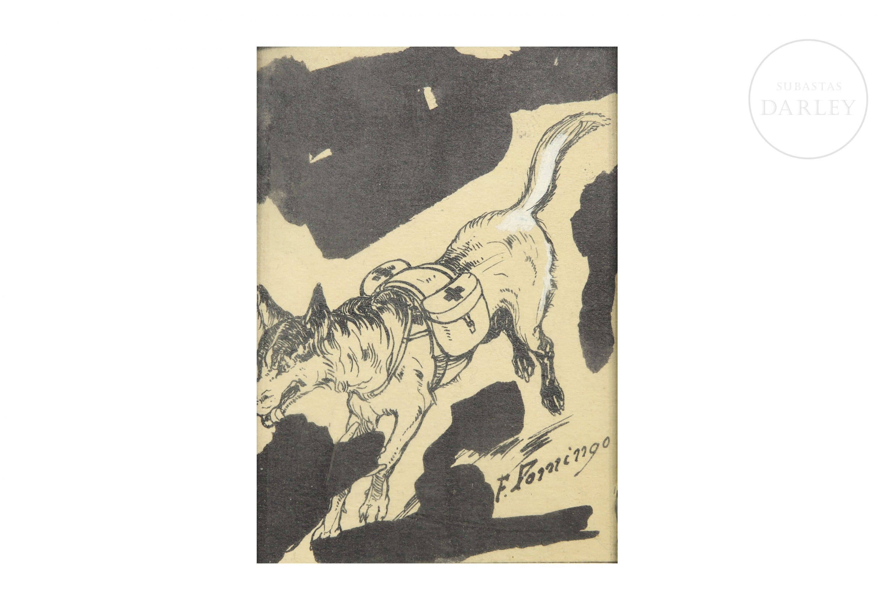 纸本水墨。描绘一只工作犬奔跑的场景,背负着标有红十字标志的鞍袋。右下角署名“F. Domingo”。