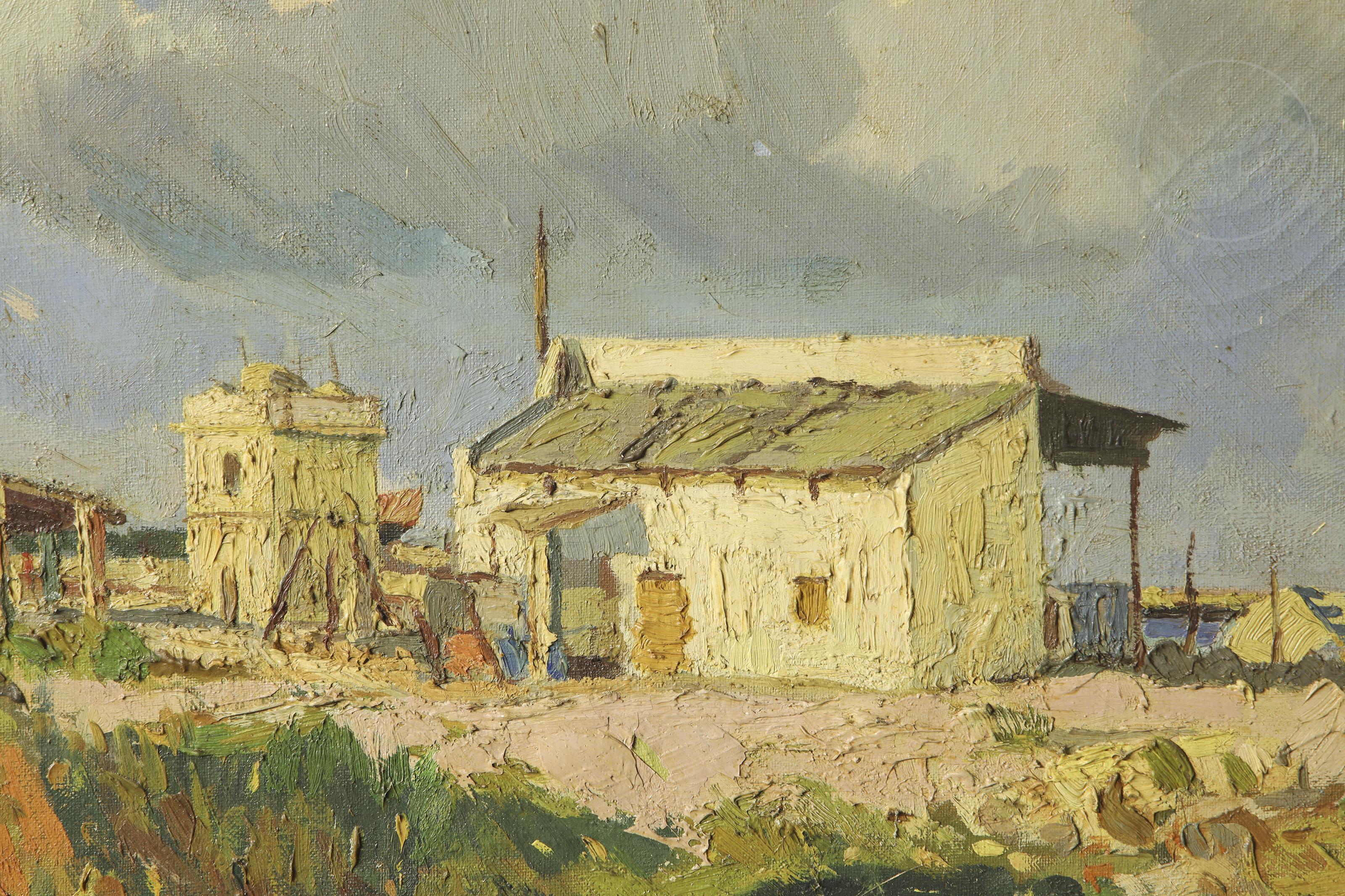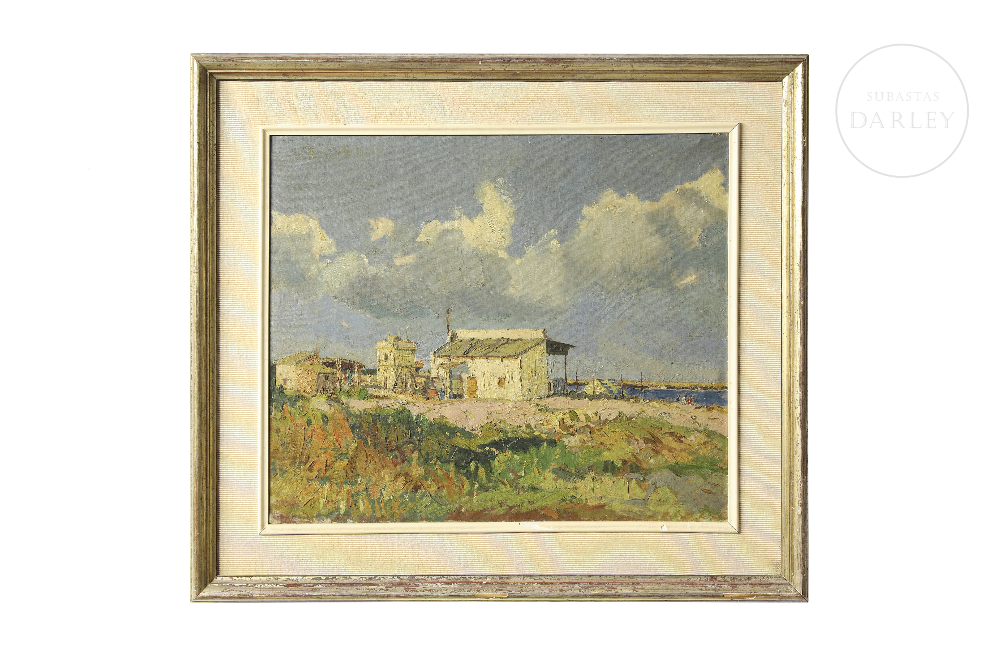 油画布面。描绘海岸风光,岸边有座小屋。左上角签名“F. Ribera”。背面题名、署名并标注创作地点。