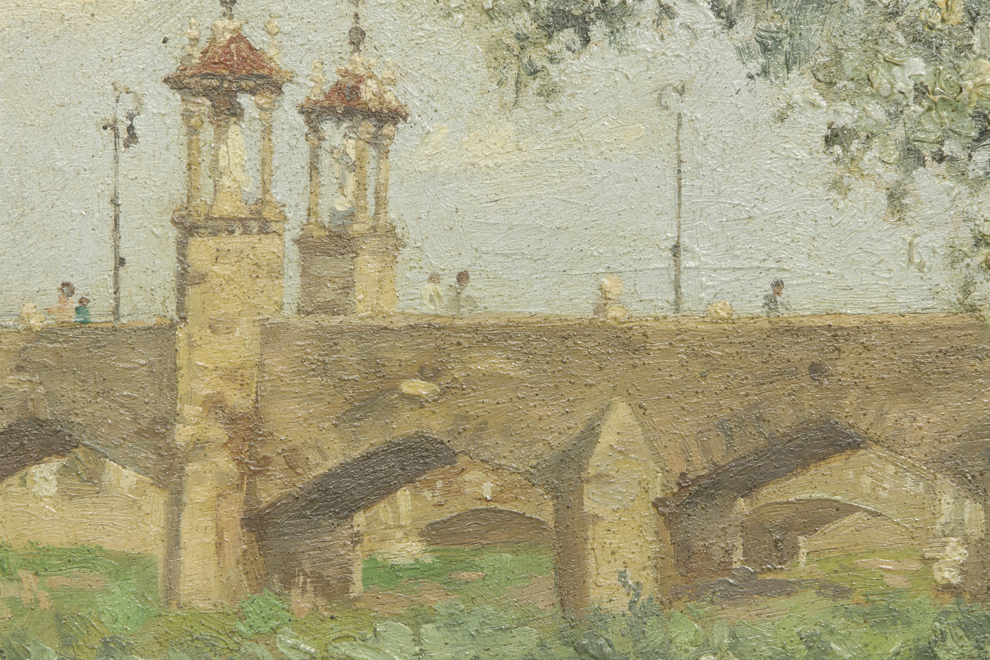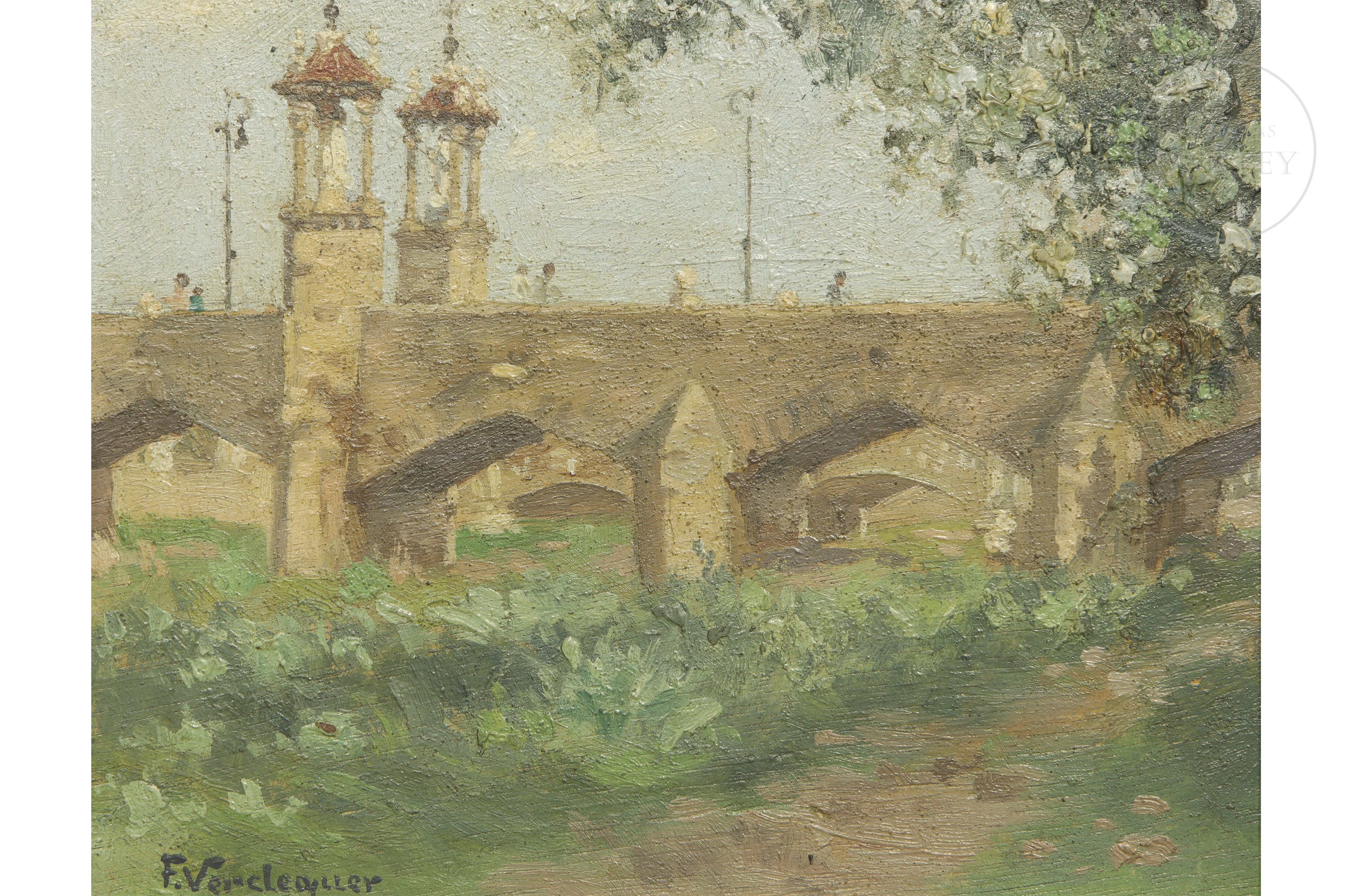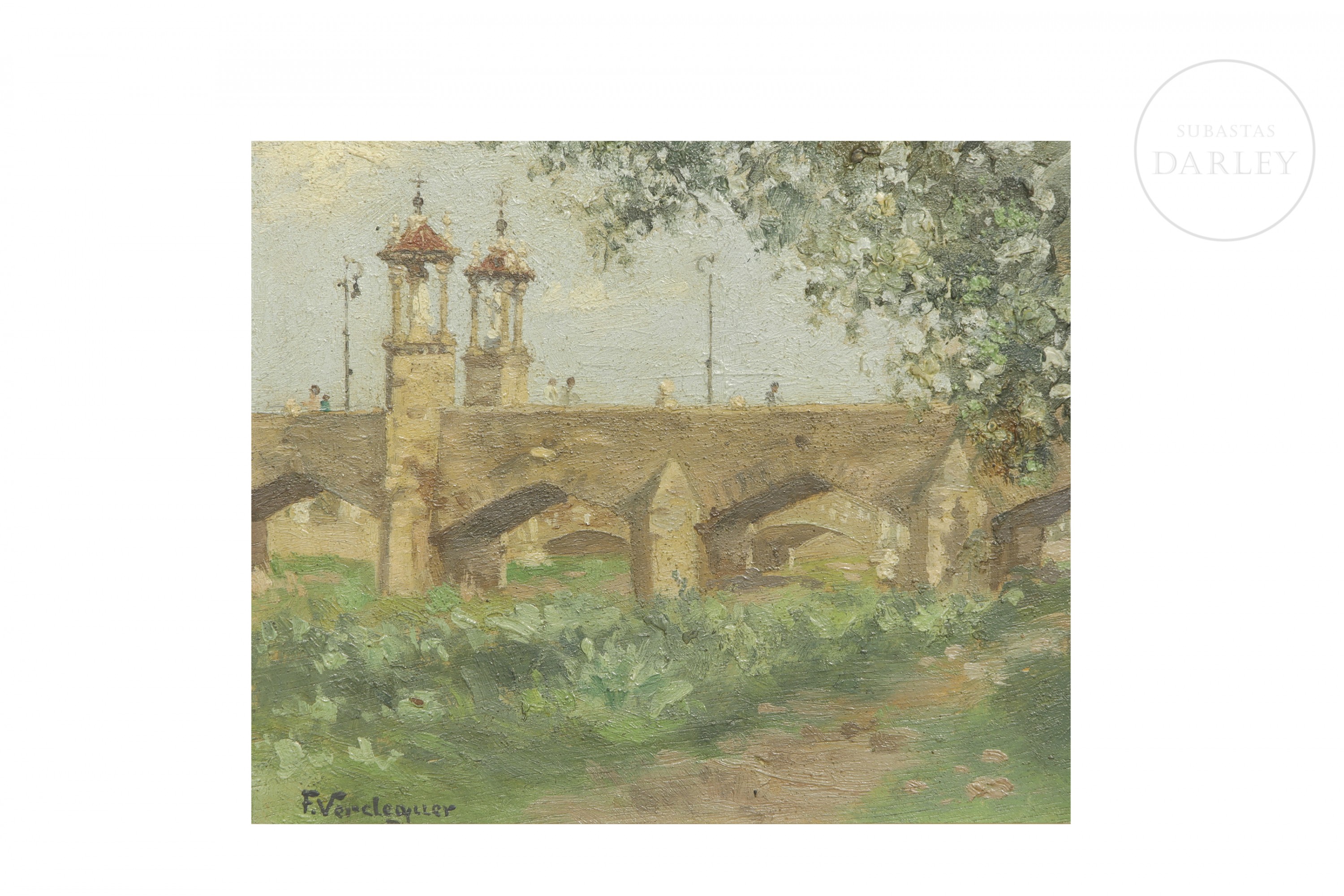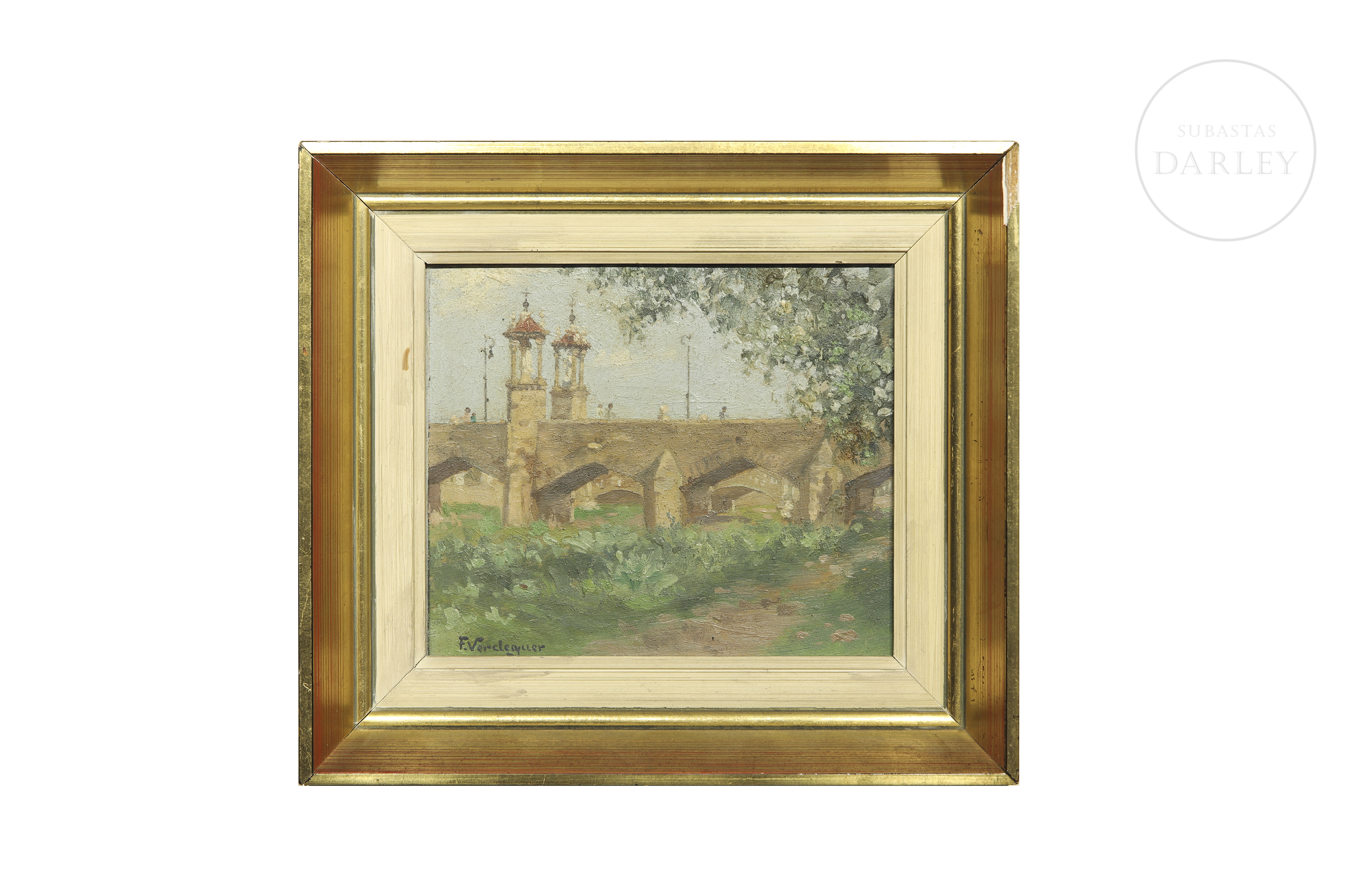 油画布面油画。描绘了瓦伦西亚城市景观,背景中可见一座石桥与两座塔楼。左下角签名“F. Vedreguer”。