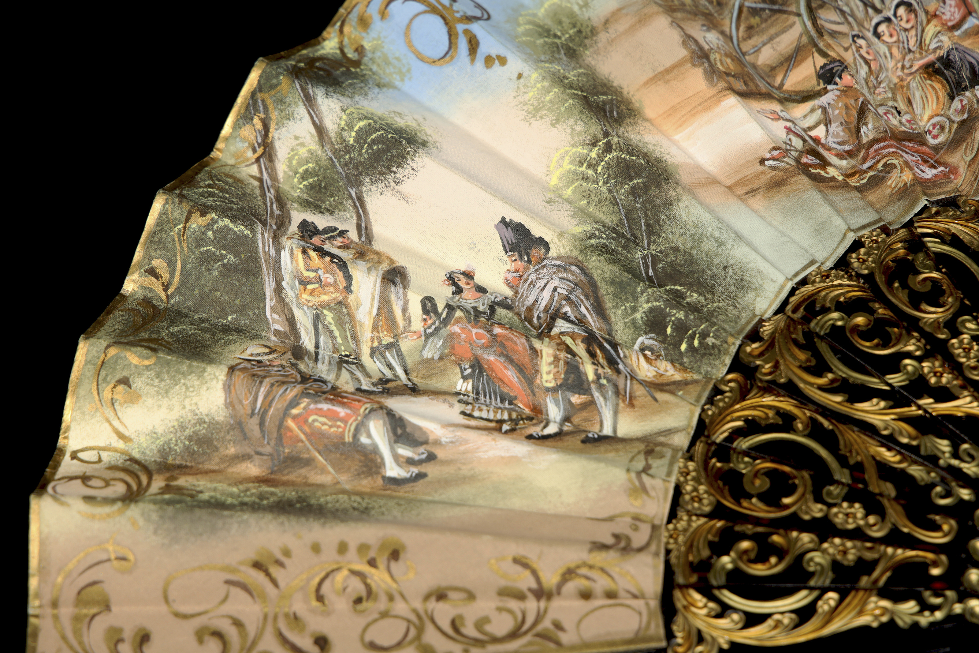 扇面以手绘三幅场景描绘西班牙风俗,画面四周饰以繁复金纹。扇骨采用合成玳瑁材质,饰有透雕工艺及金质卷草叶纹细节。