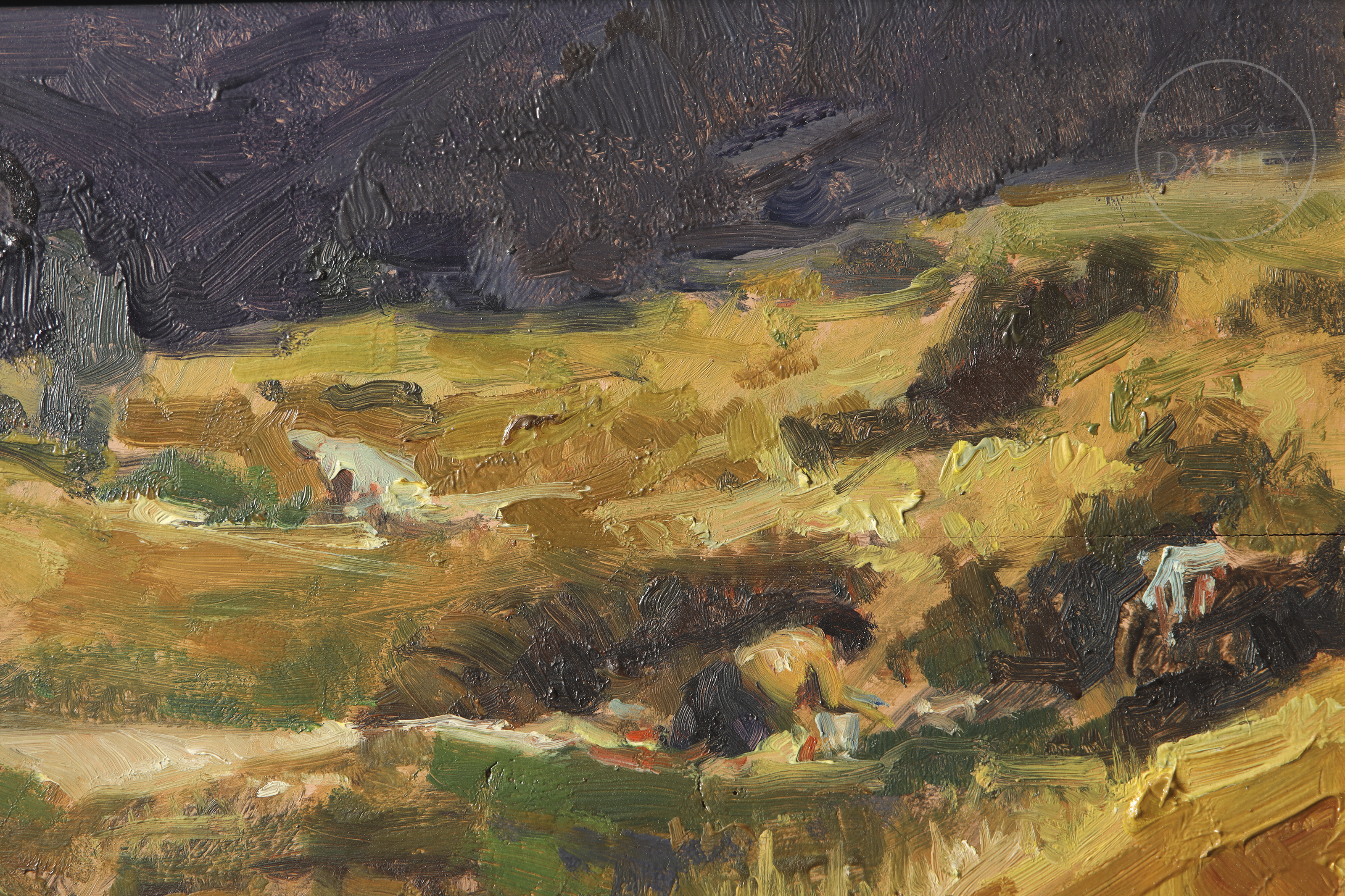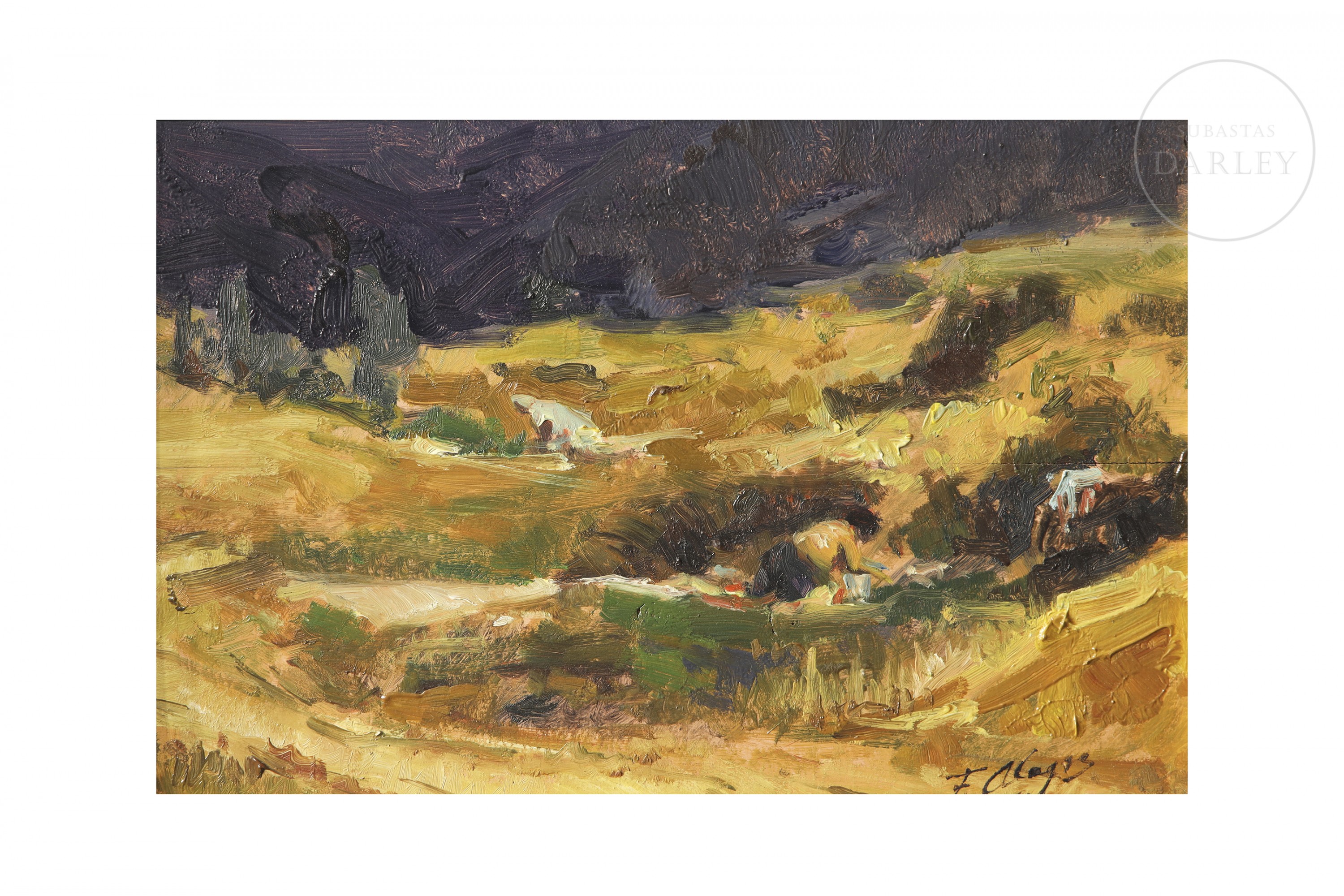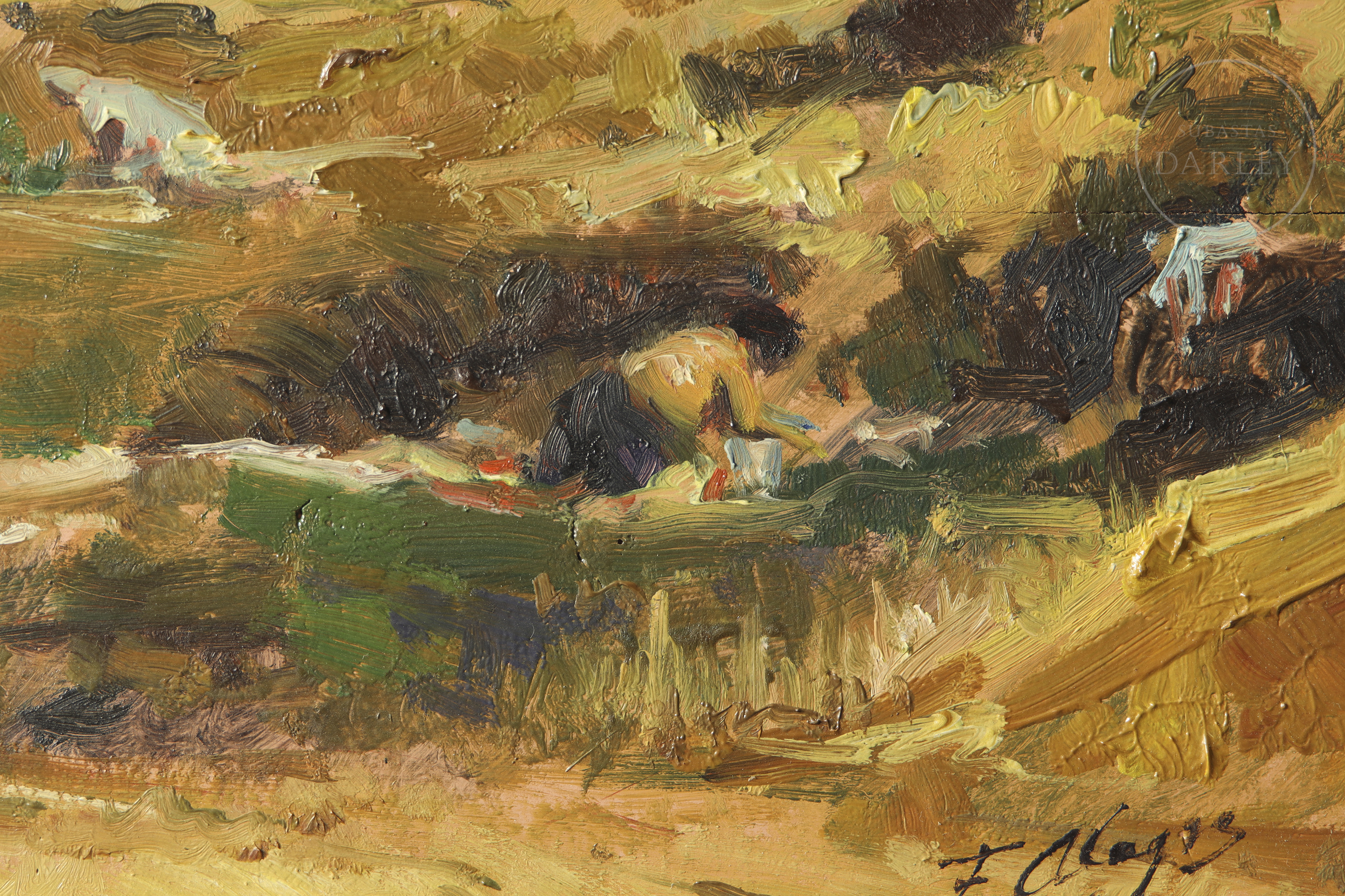 Oil on panel. Impressionist-style landscape depicting a sunny valley with small figures resting in the countryside. The work stands out for its impasto brushwork and its palette of ochre and gold colors. Signed “F. Alegre” in the lower right corner.