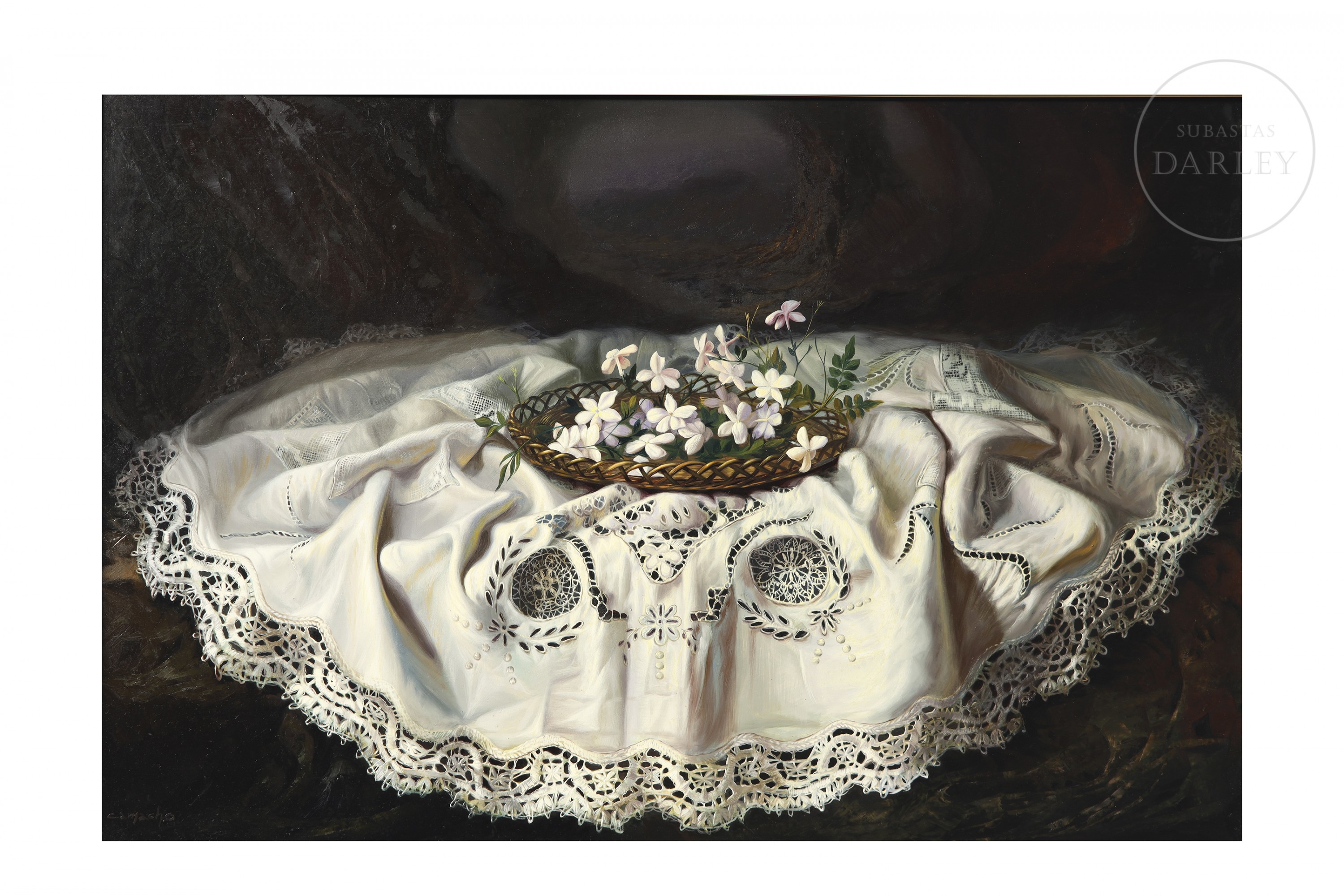 Oil on panel. Depicts a woven basket with white jasmines resting on a delicate white lace cloth. Signed "Camacho" in the lower left corner.