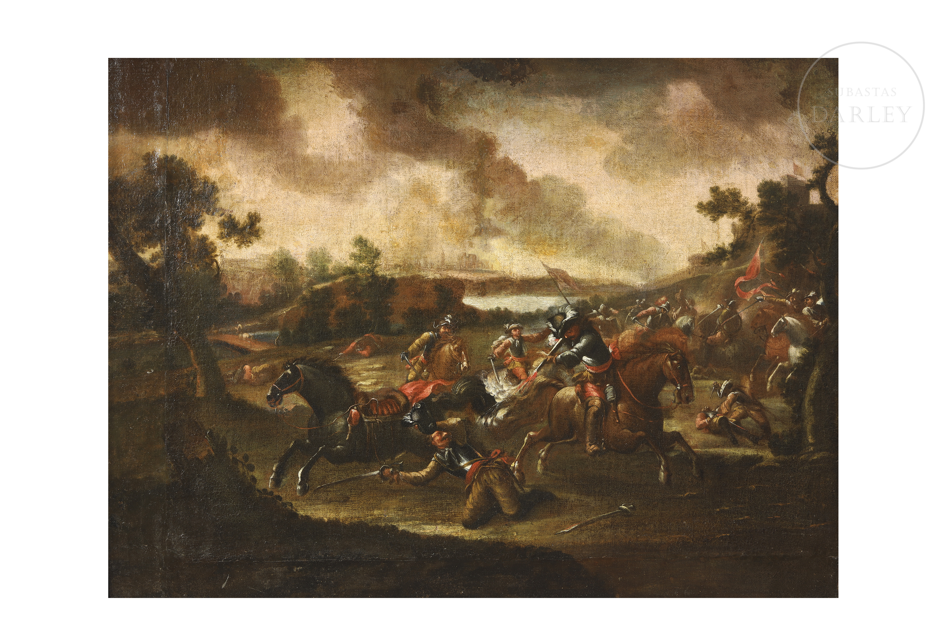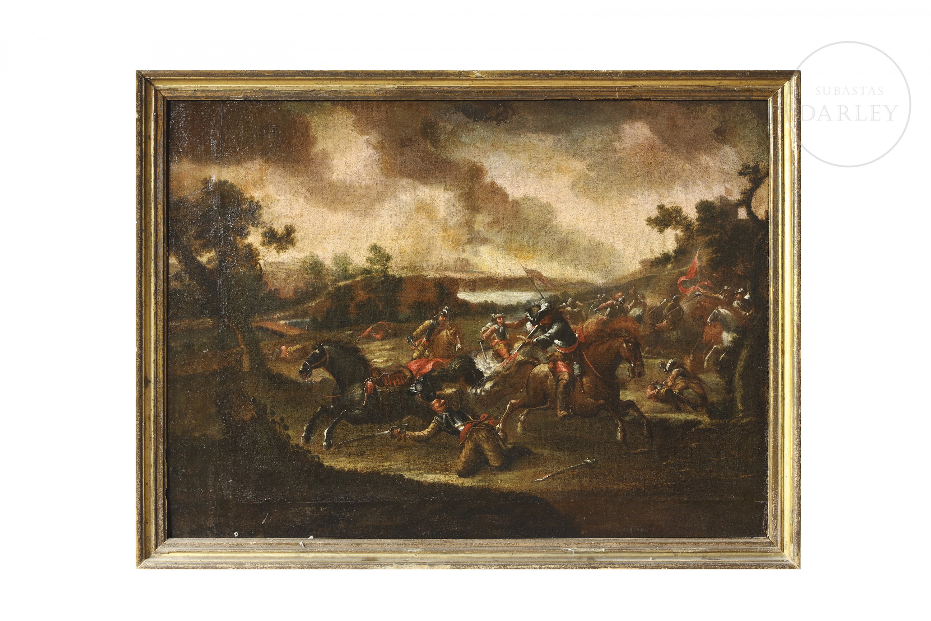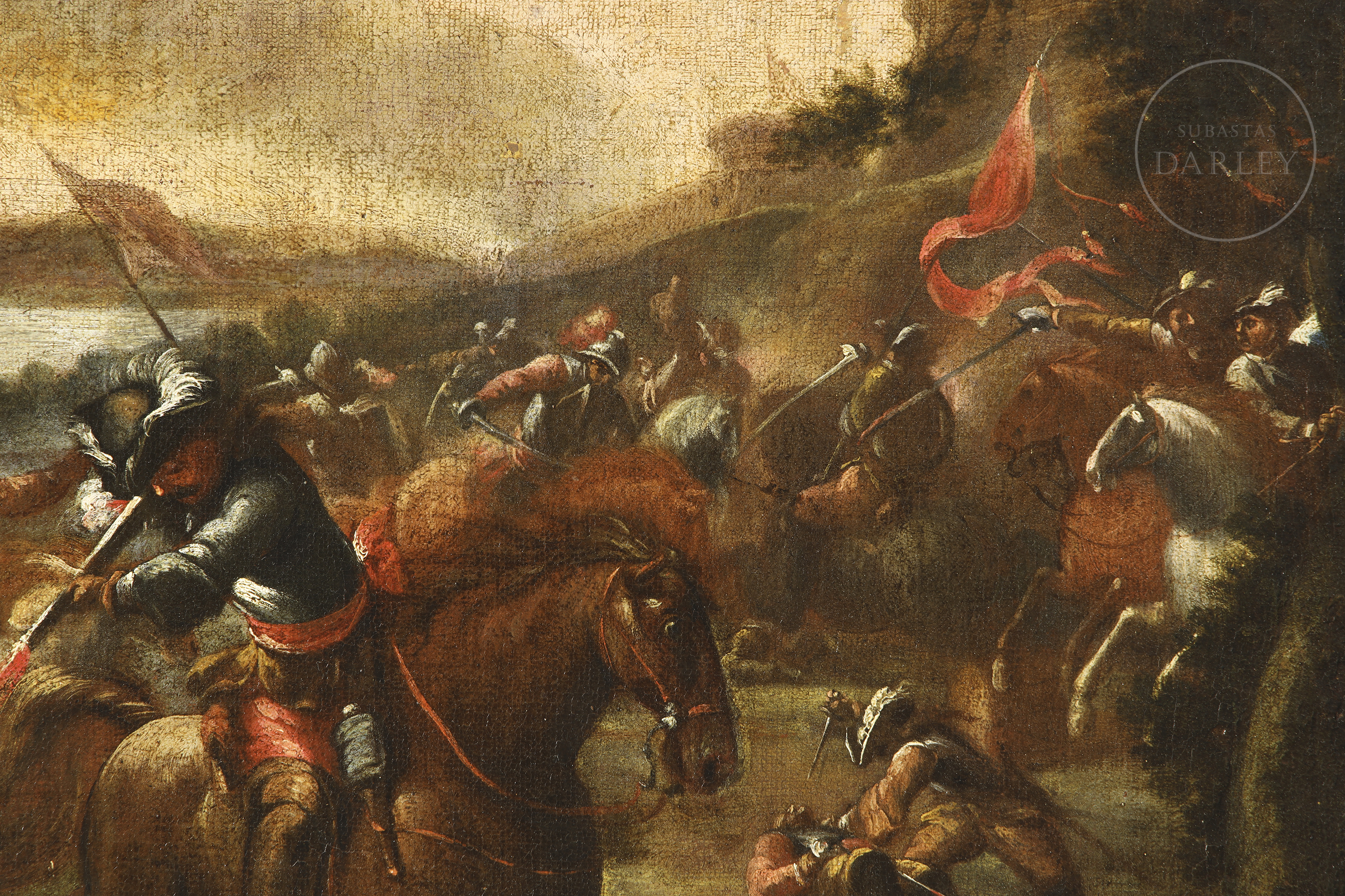 A narrative composition depicting a military confrontation in an open landscape, with soldiers on horseback and on foot in the midst of combat. The work maintains the expressive intensity, dynamism and dark atmosphere characteristic of Valencian Baroque, common features in the circle of Esteban March. Spanish school, 17th century.