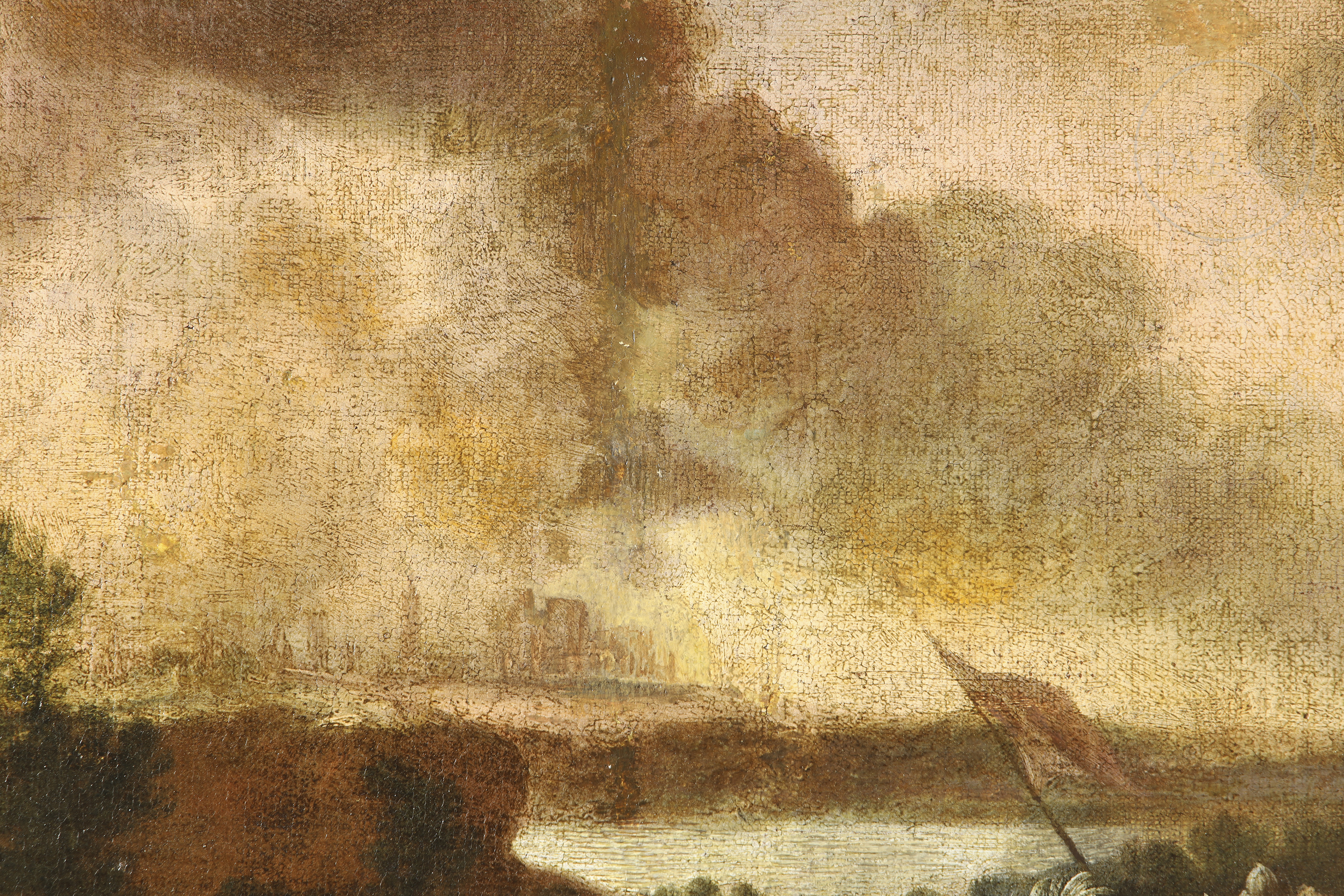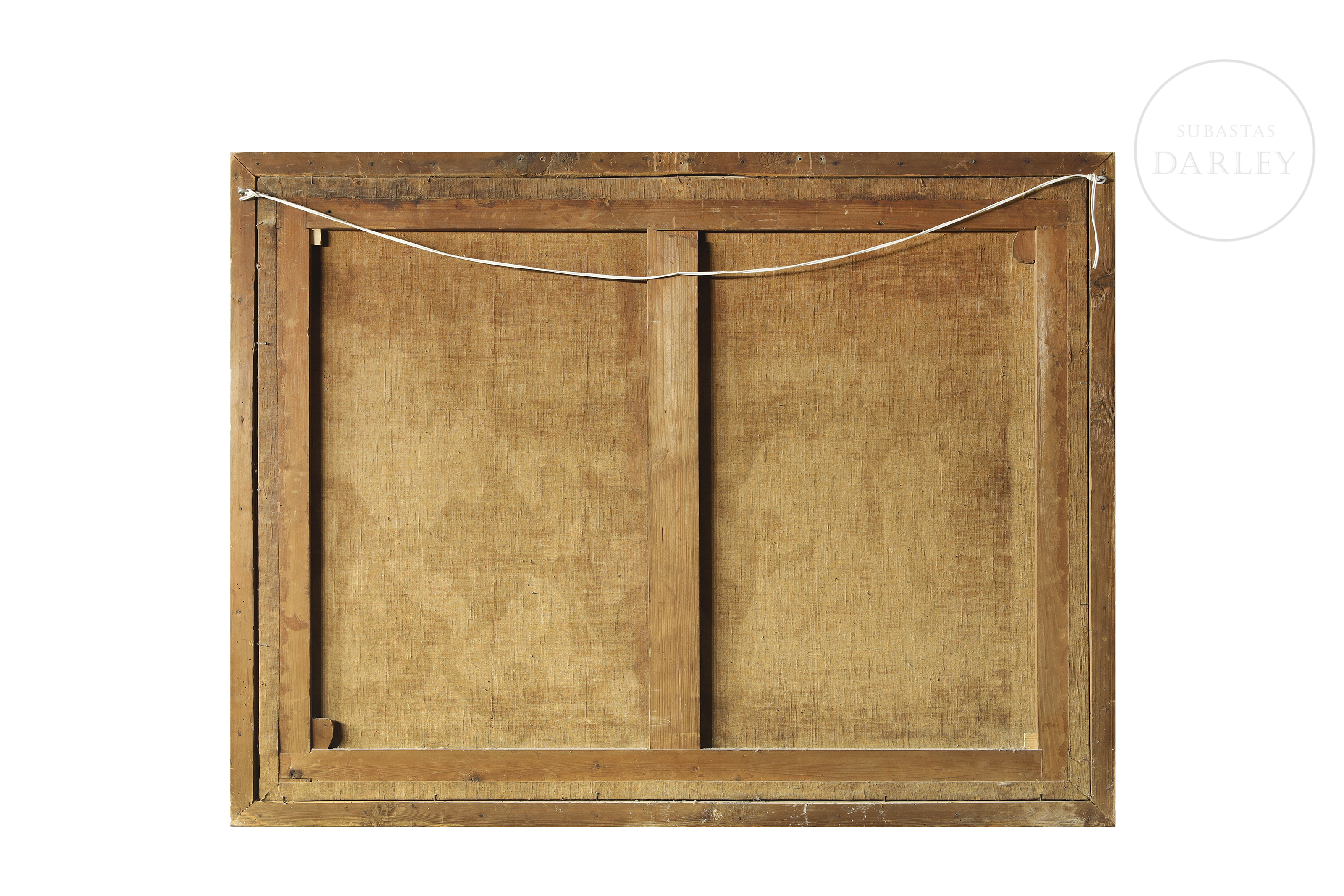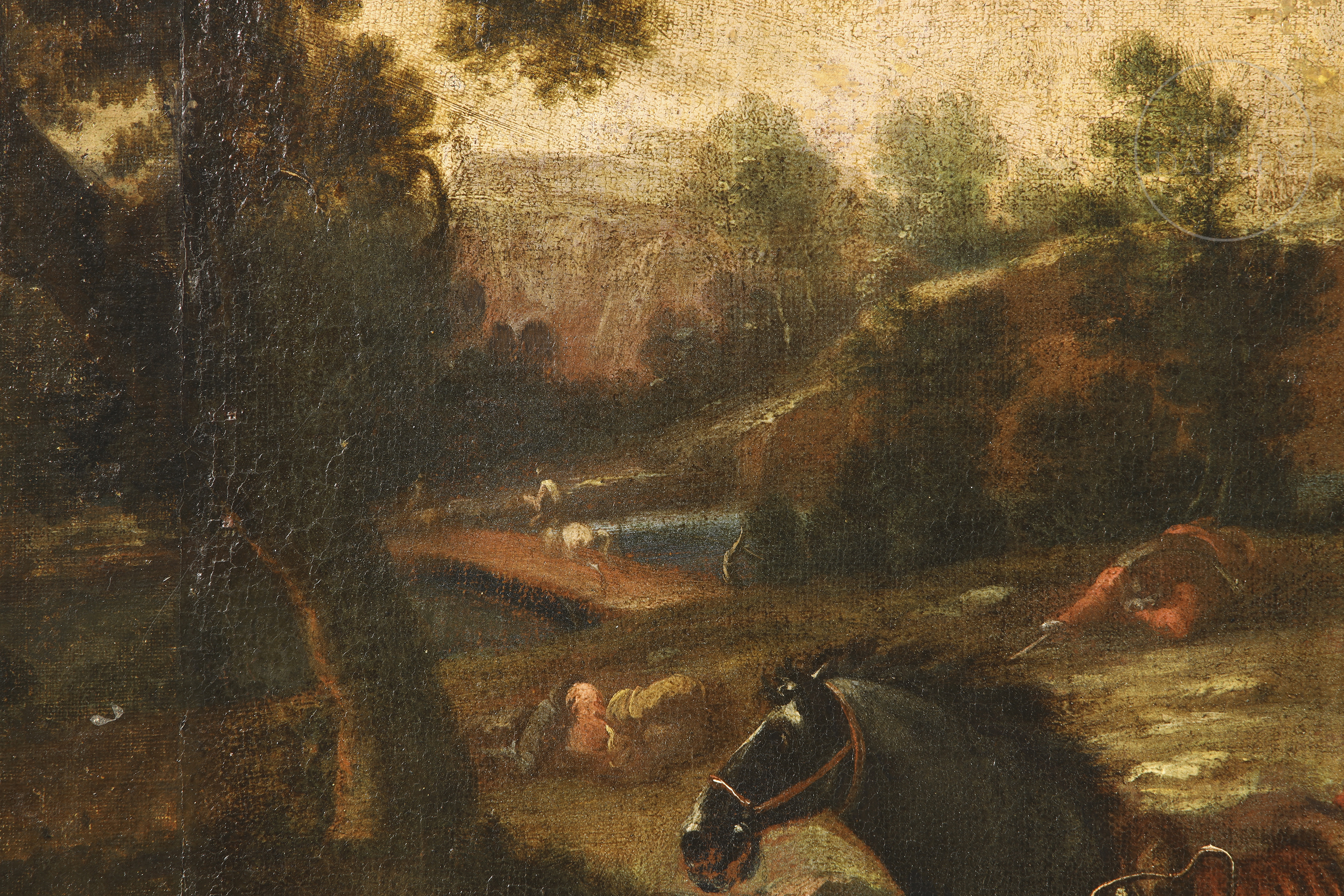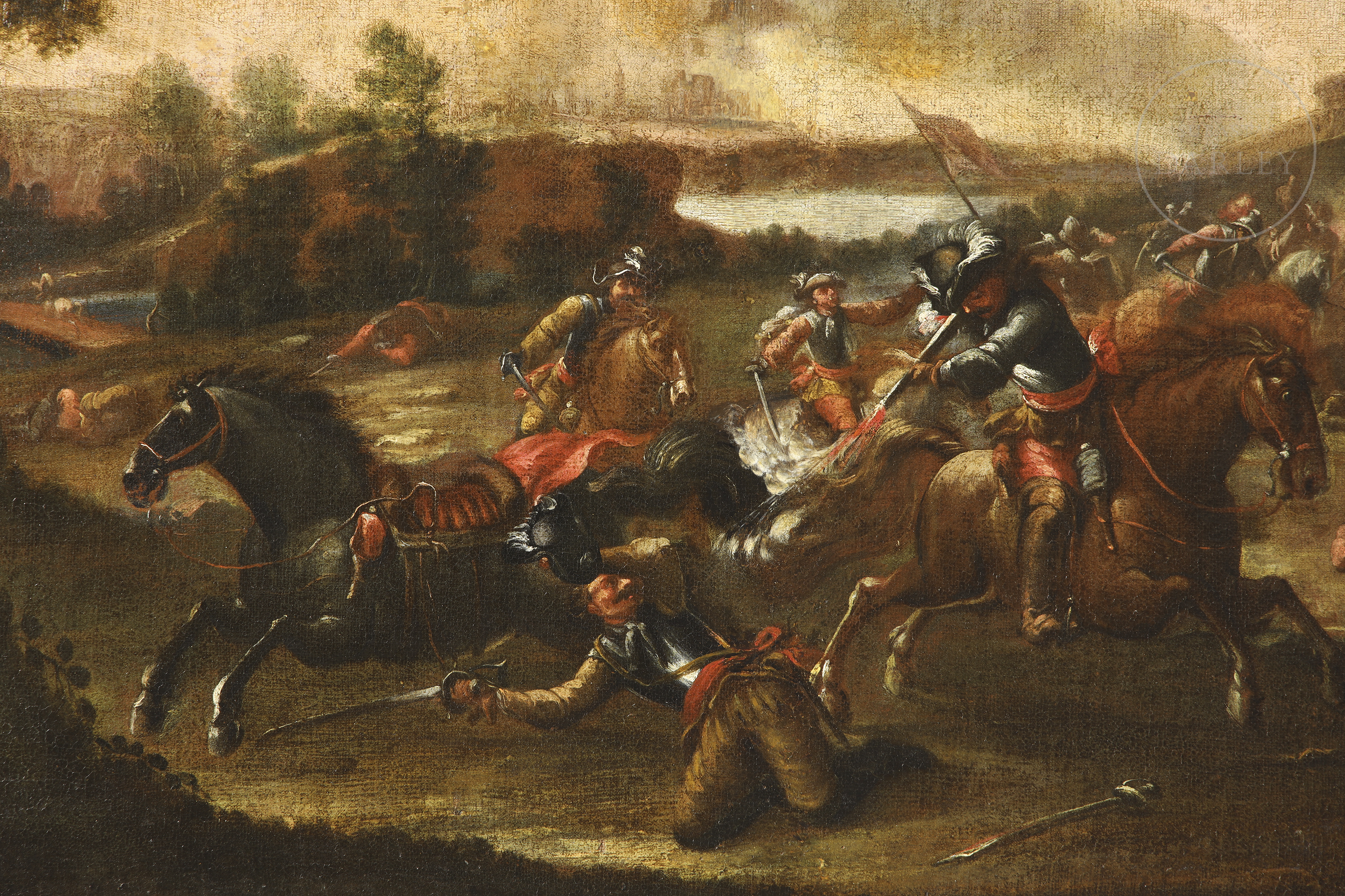 A narrative composition depicting a military confrontation in an open landscape, with soldiers on horseback and on foot in the midst of combat. The work maintains the expressive intensity, dynamism and dark atmosphere characteristic of Valencian Baroque, common features in the circle of Esteban March. Spanish school, 17th century.