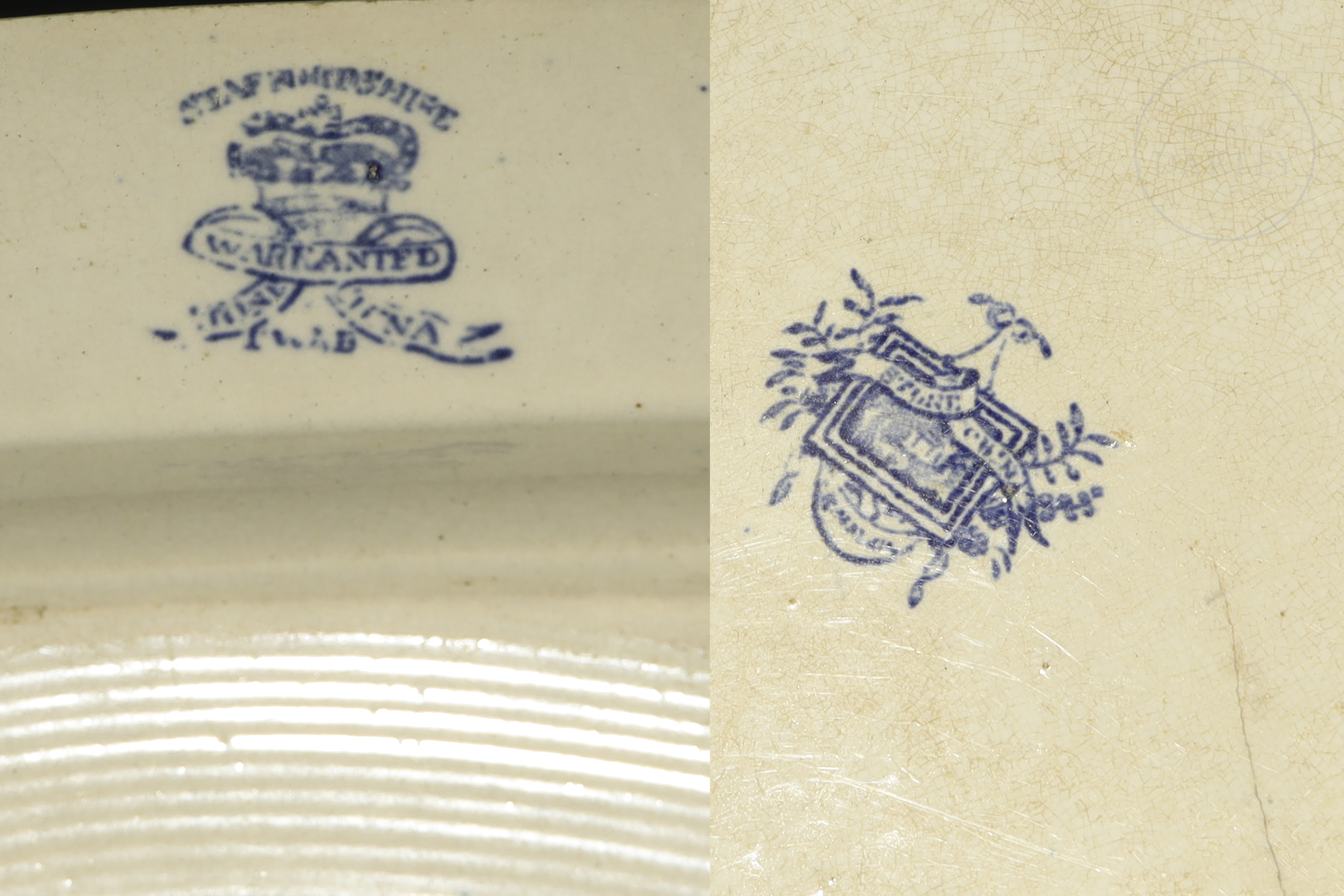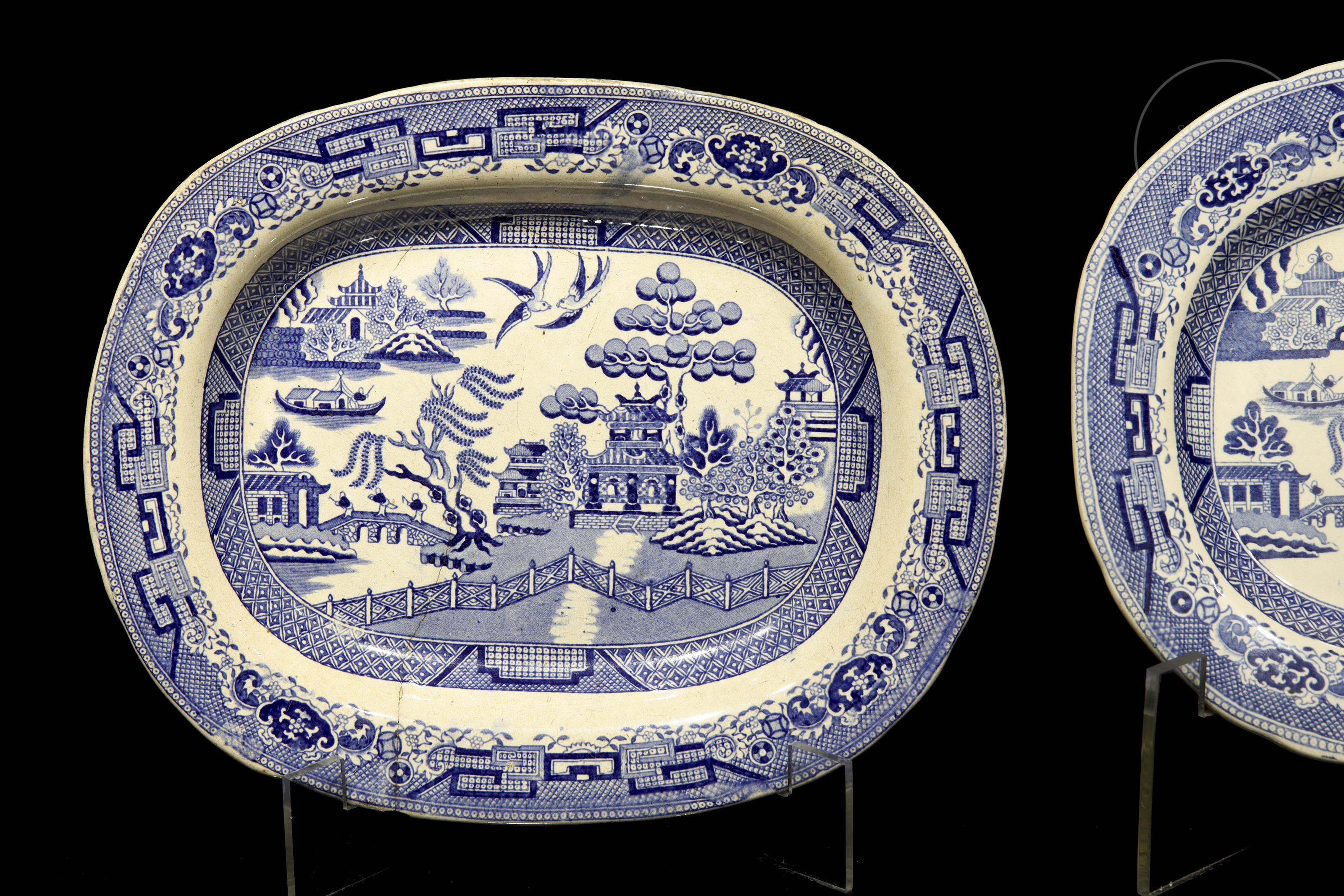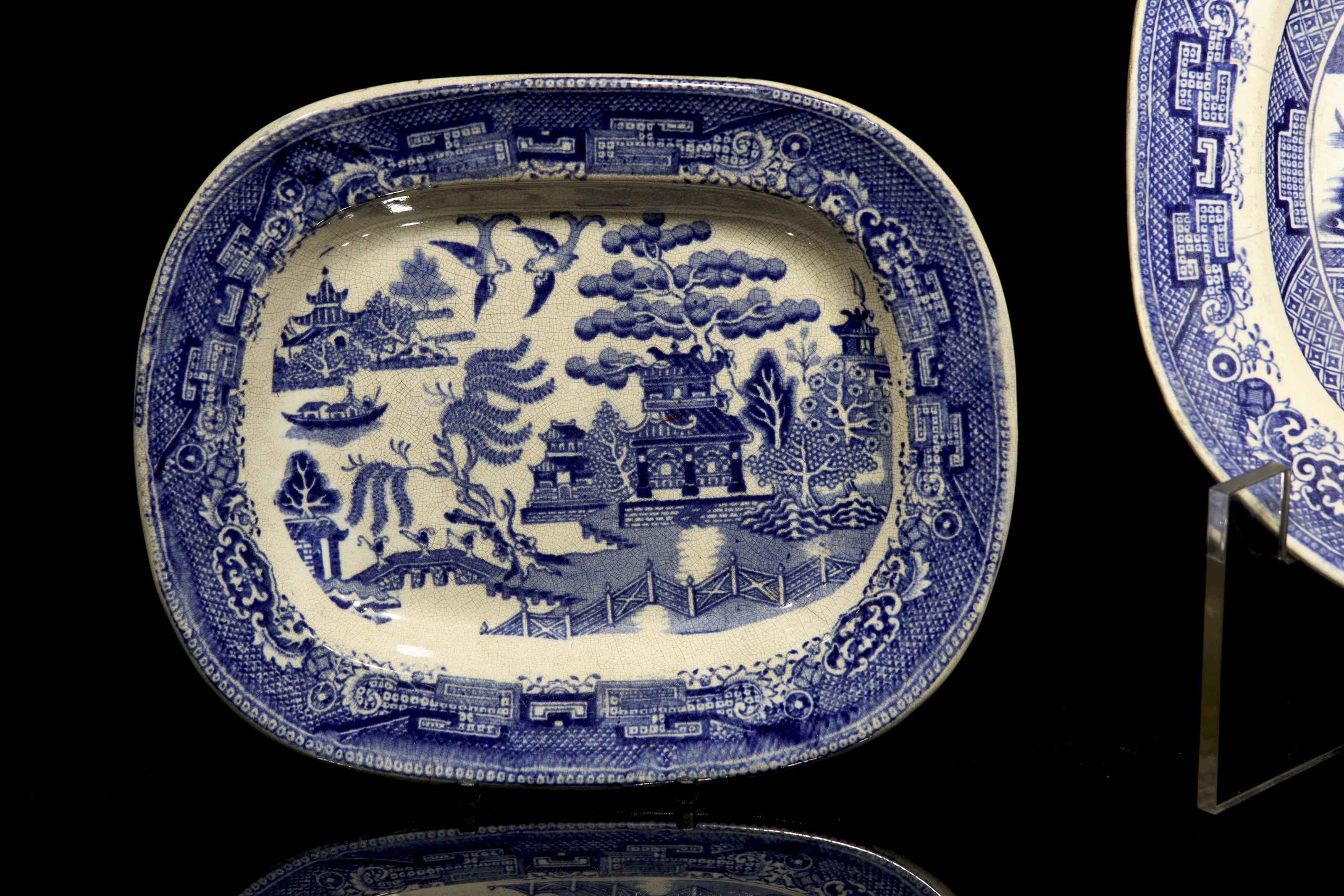 四件十九世纪英国陶瓷的经典之作,均饰有广受欢迎的柳树纹样,产于斯塔福德郡地区。该纹样采用釉下蓝彩转印技法,相比手绘,生产效率更高,成本更低。