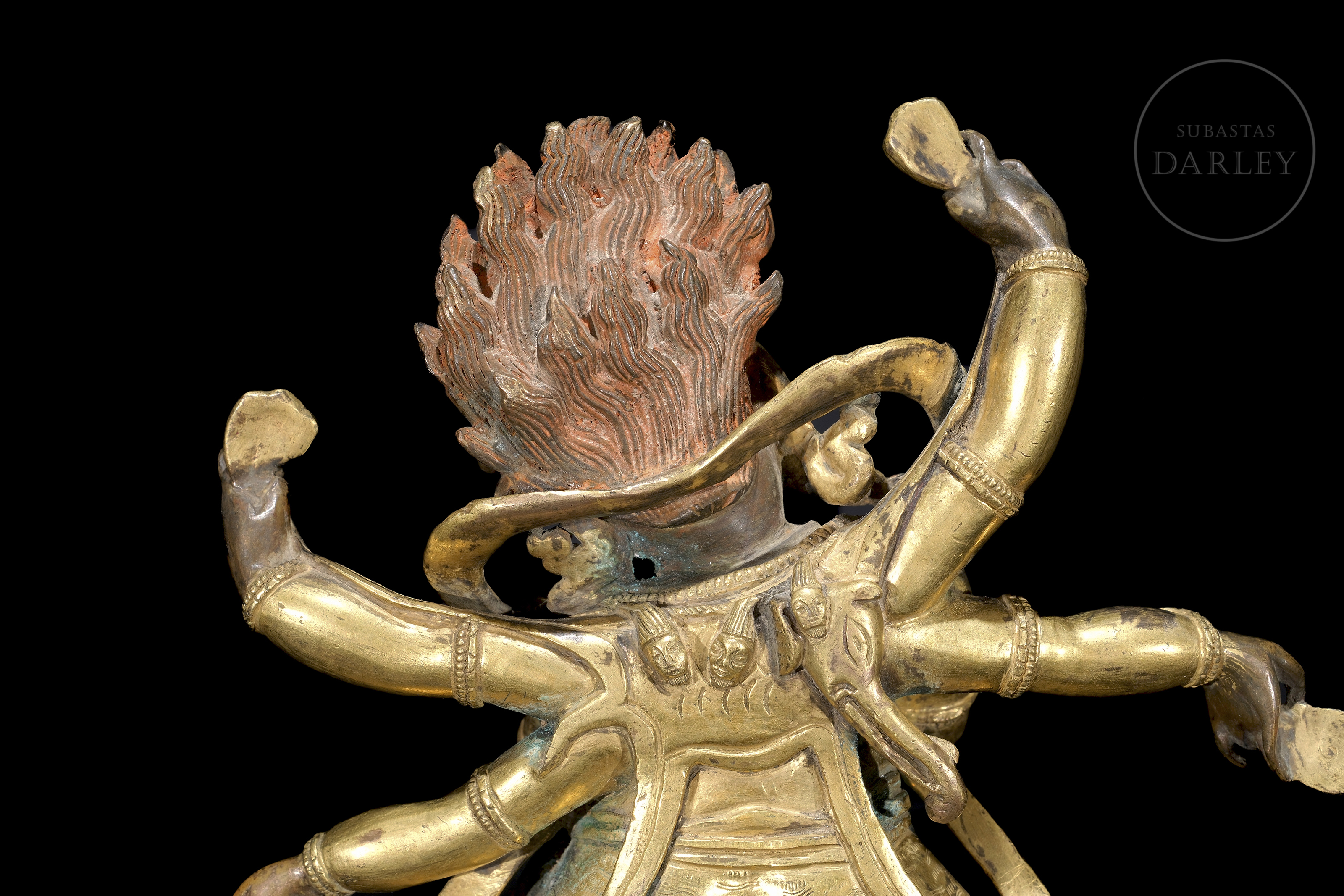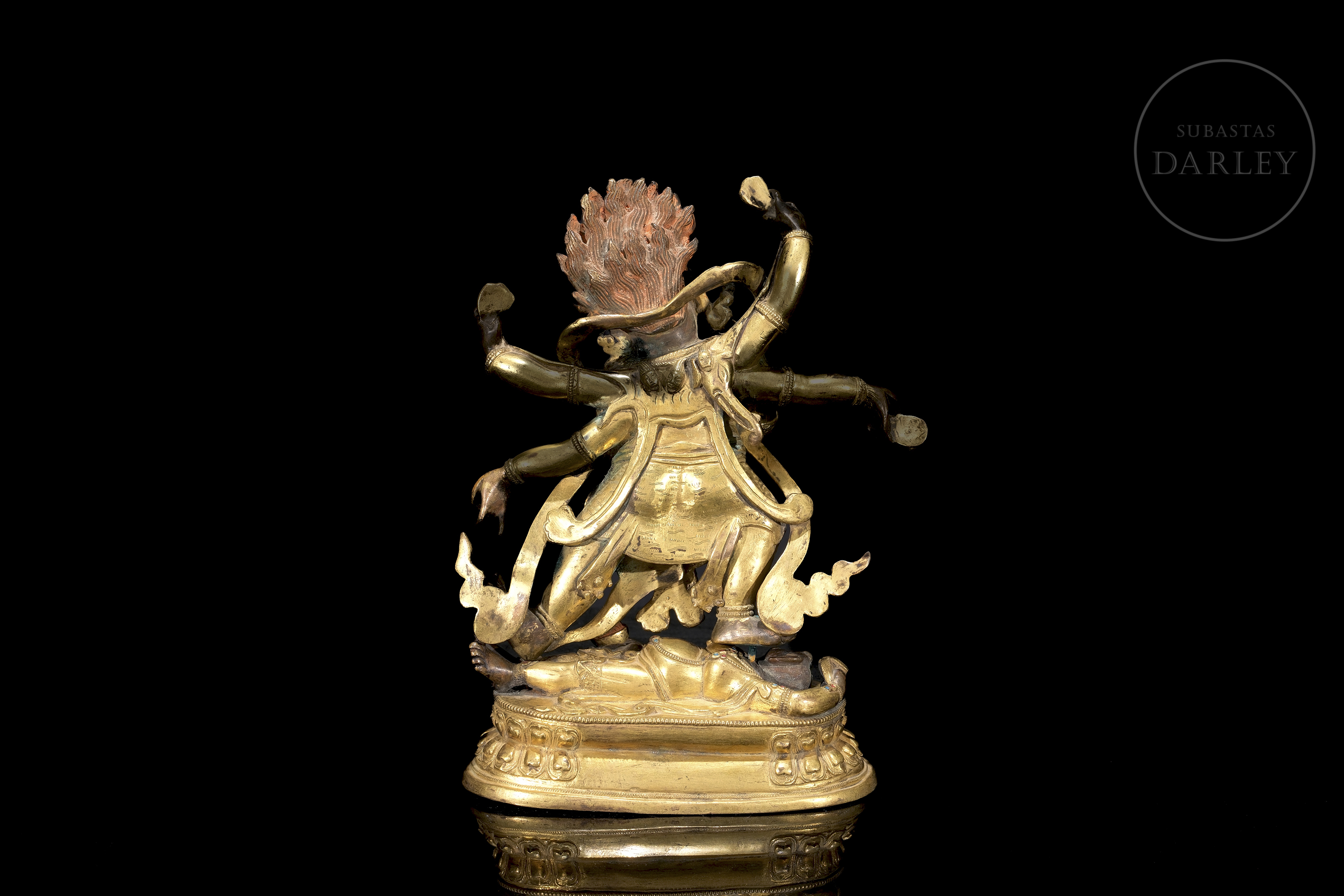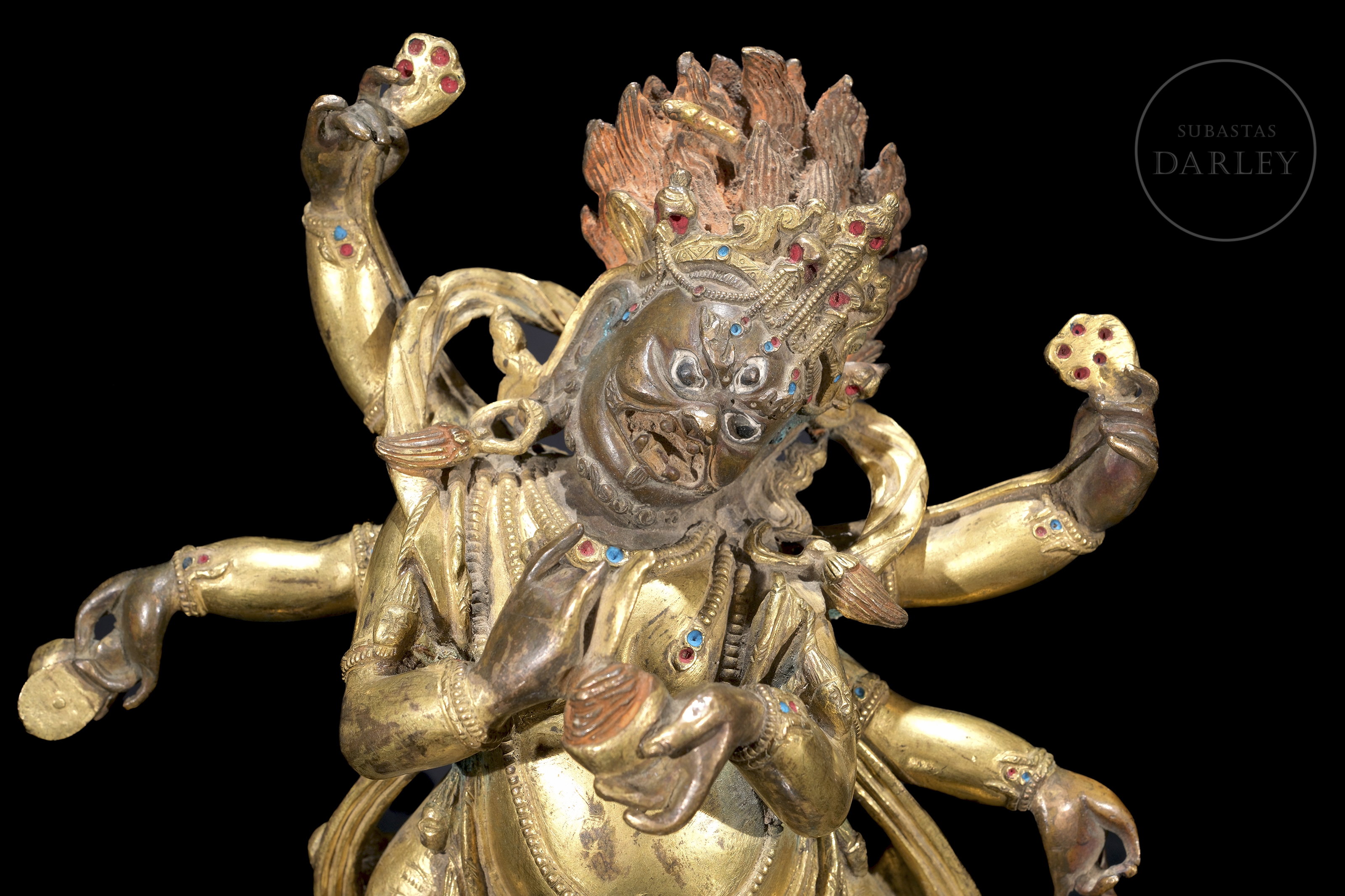 Bronze figure with traces of fire gilding and polychromy, representing the six-armed protective deity Mahakala. It is presented in an energetic warrior dance posture, trampling on a figure symbolizing obstacles on a lotus throne. With his wrathful three-eyed face and skull crown, he holds various tantric attributes in his six arms. The piece, which is highly expressive, has an unsealed base.