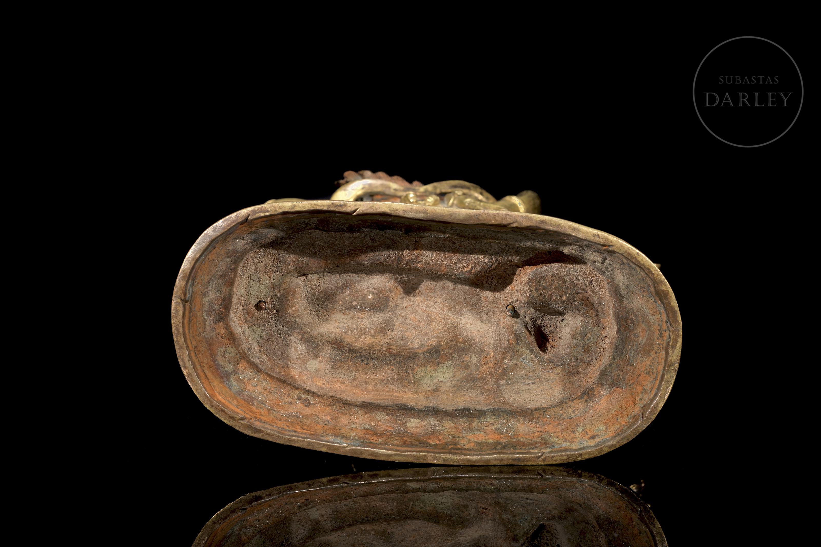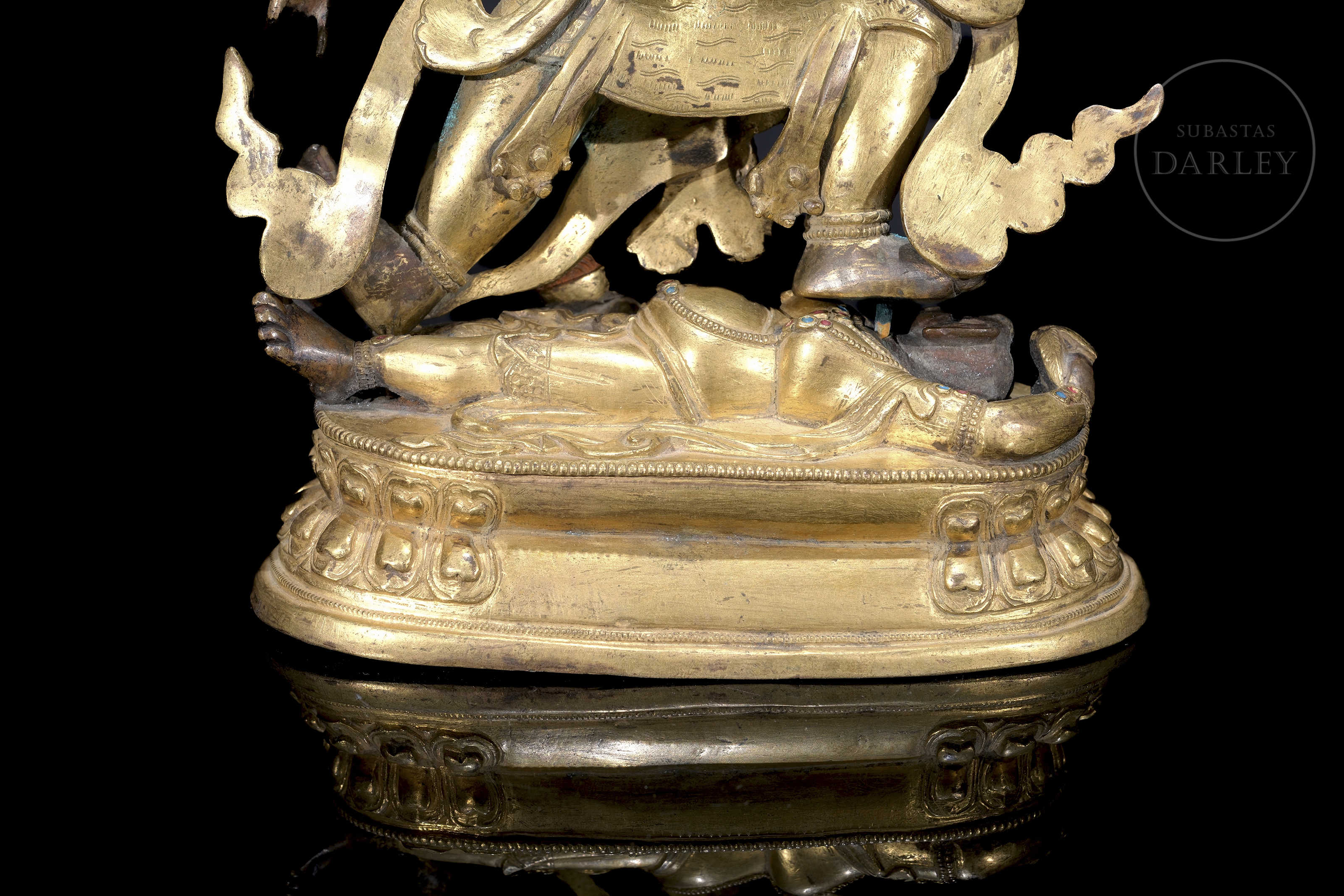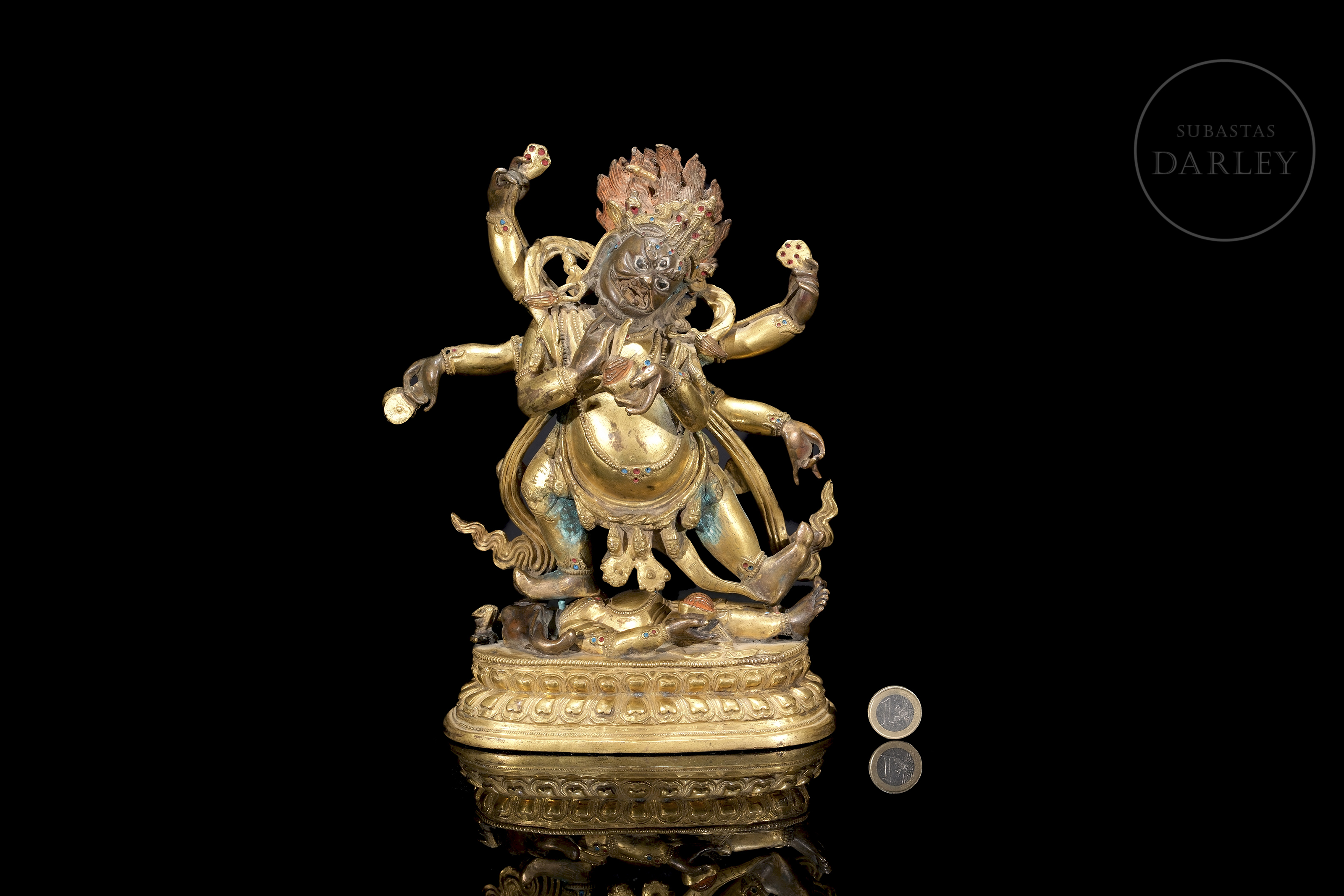 Bronze figure with traces of fire gilding and polychromy, representing the six-armed protective deity Mahakala. It is presented in an energetic warrior dance posture, trampling on a figure symbolizing obstacles on a lotus throne. With his wrathful three-eyed face and skull crown, he holds various tantric attributes in his six arms. The piece, which is highly expressive, has an unsealed base.