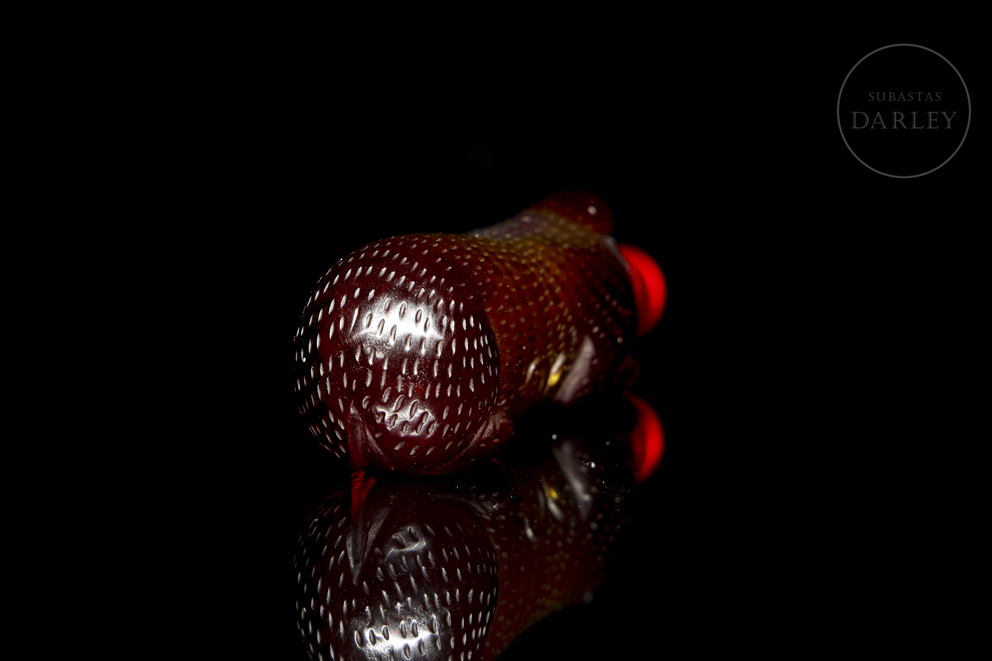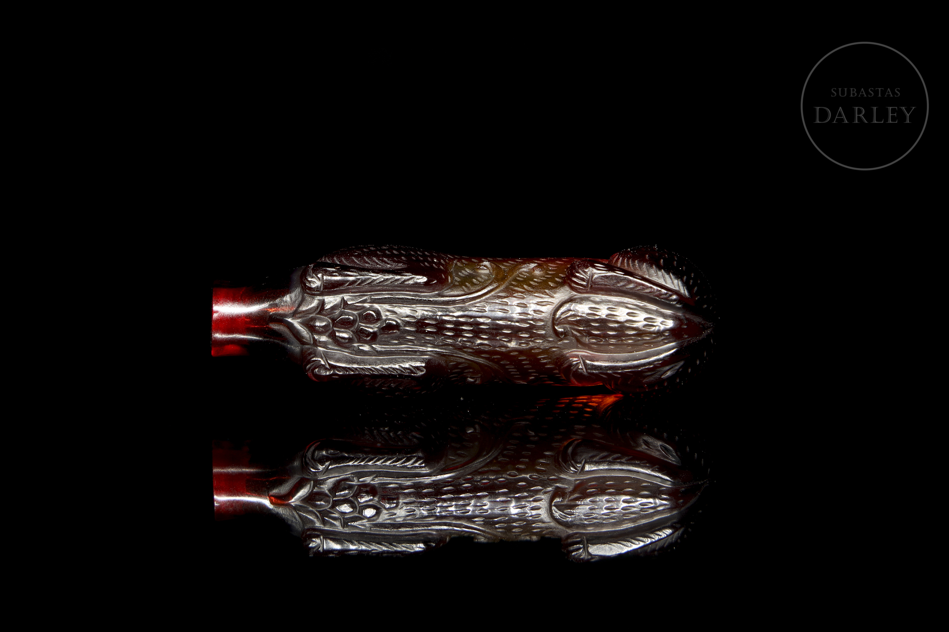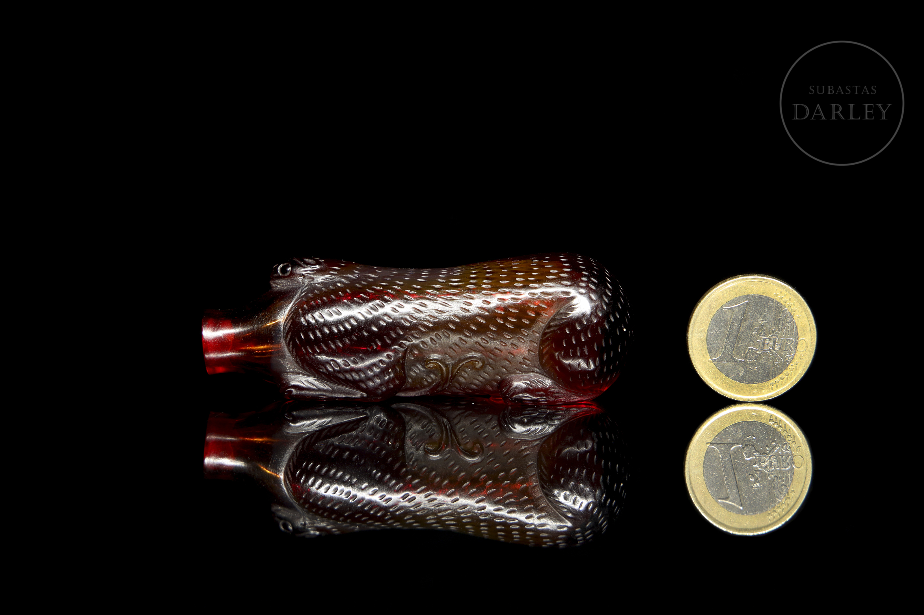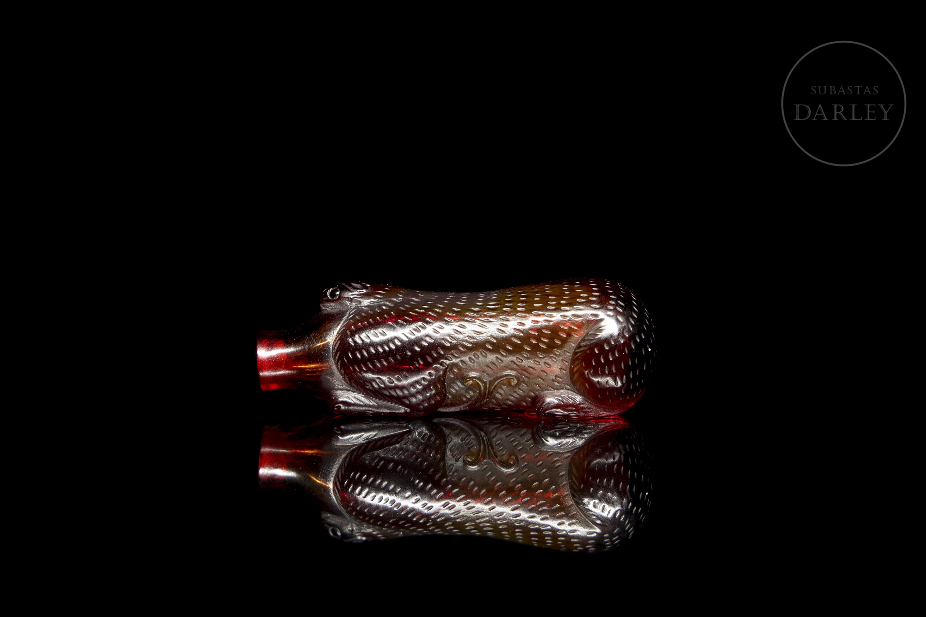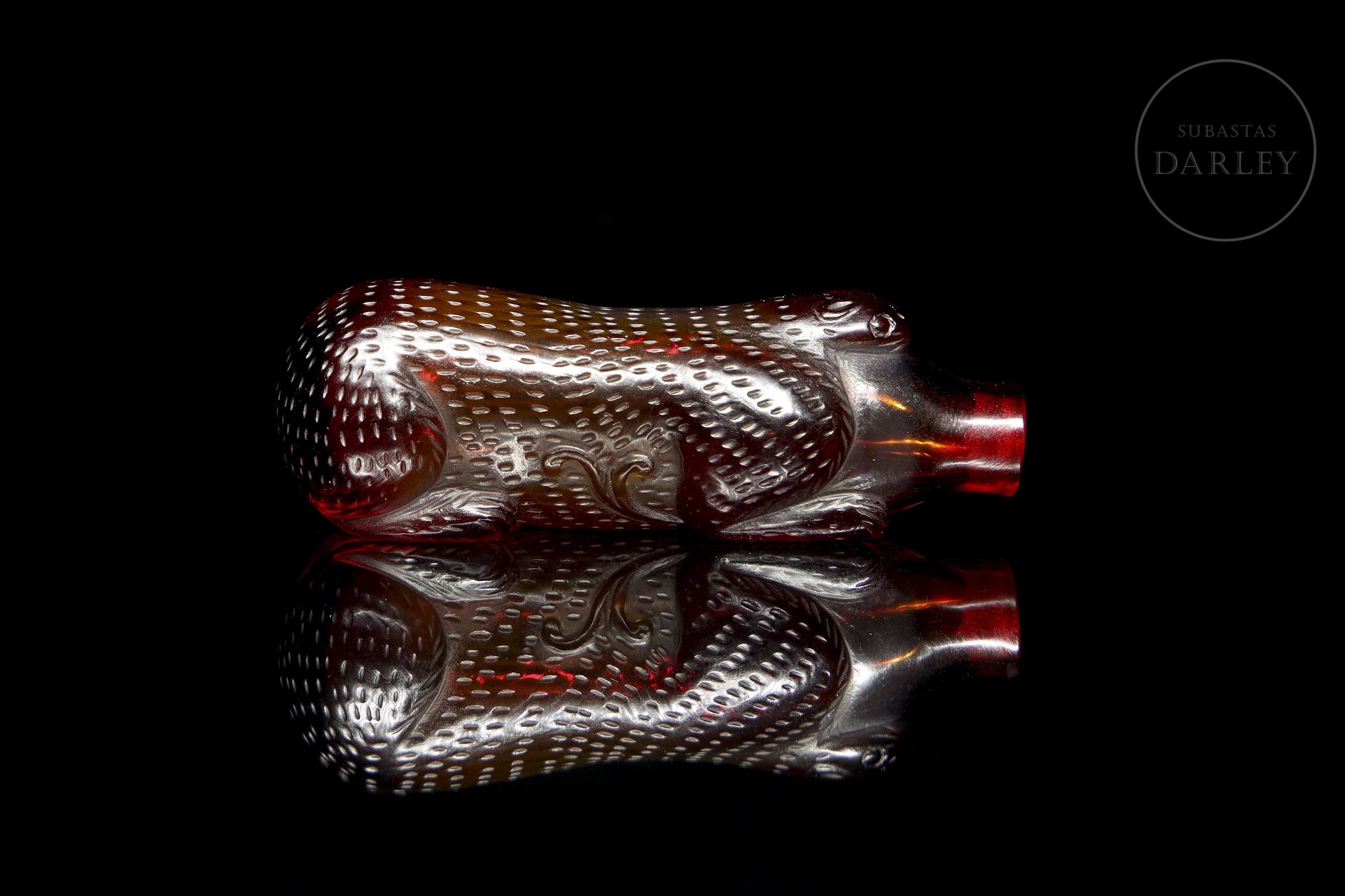 Red glass snuff bottle, carved in the shape of a mythological beast, with the back decorated in relief to resemble fur. The piece, crafted from a single block of glass, features a stylized body, legs in relief and a raised head.