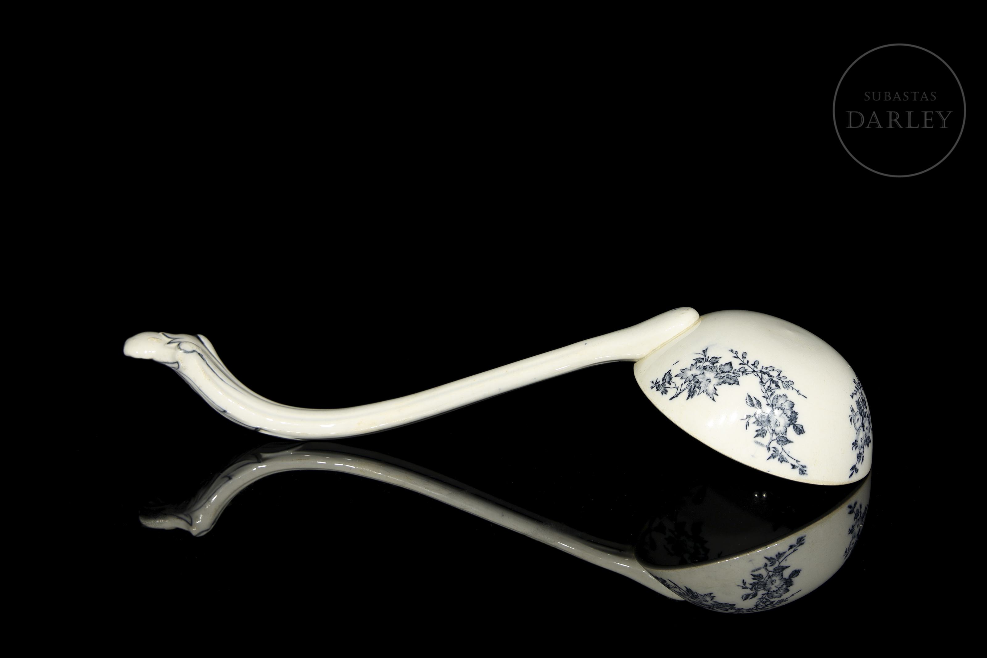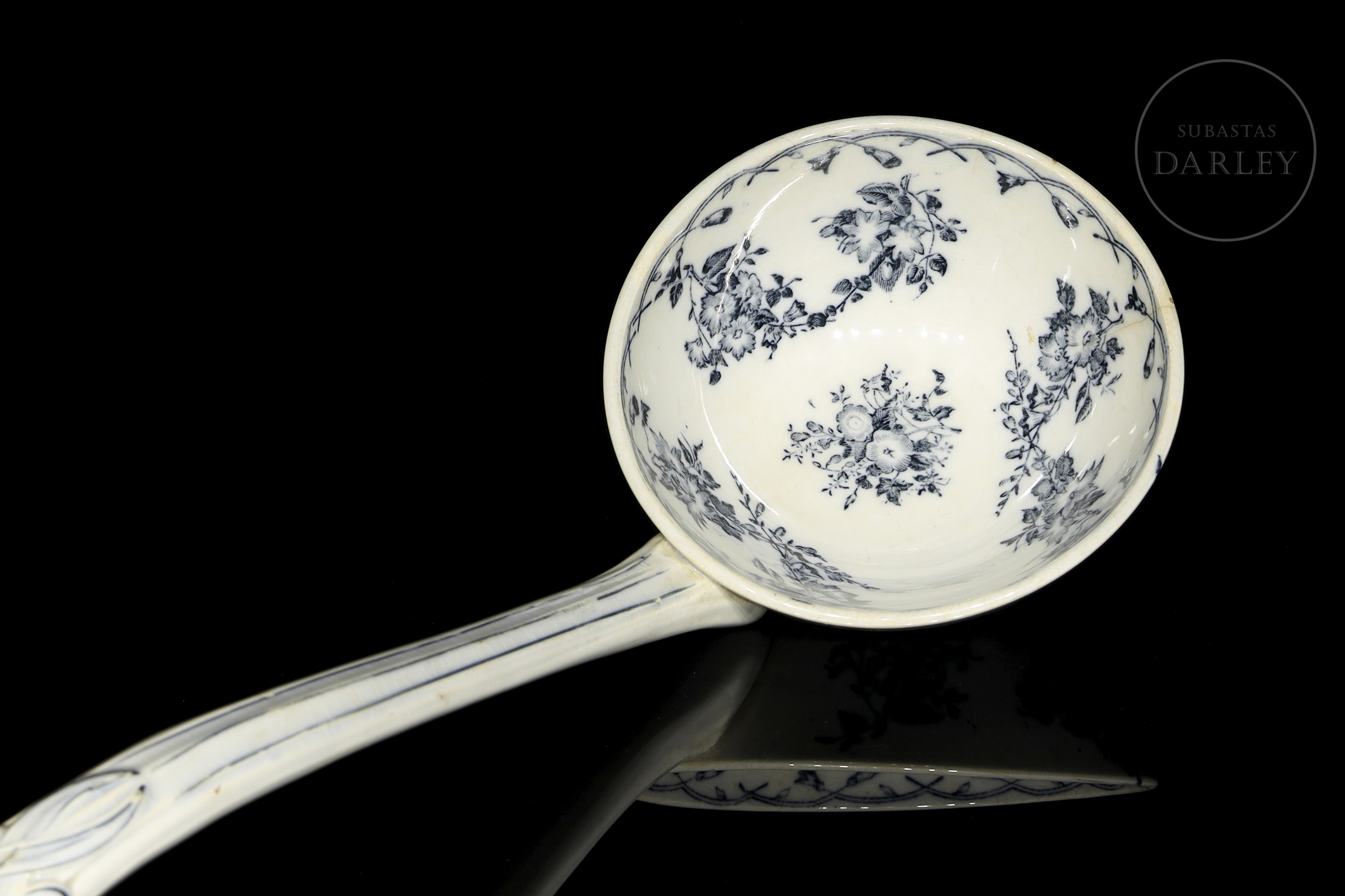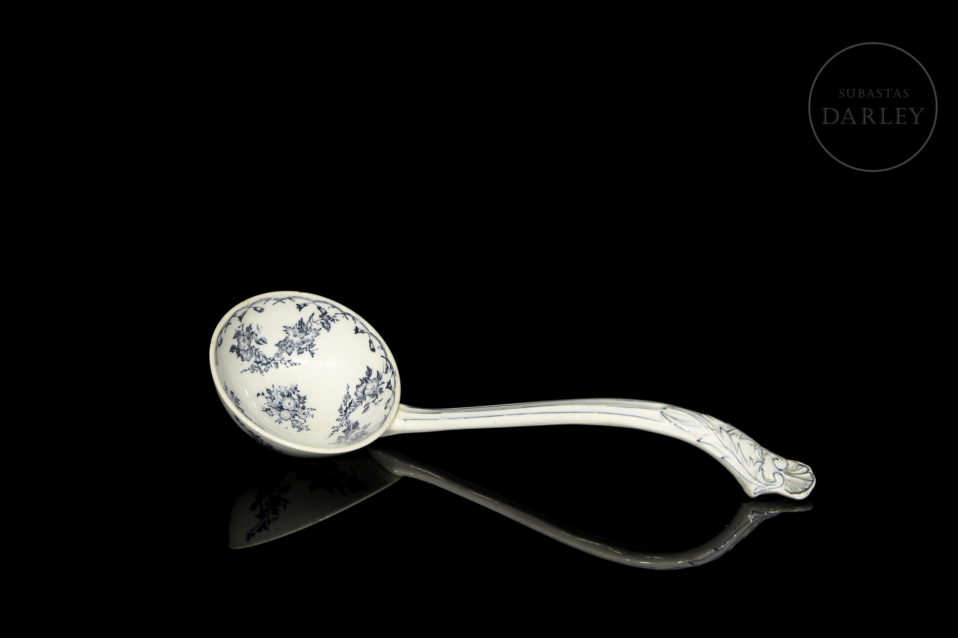 大型陶瓷汤勺,配有弯曲手柄。饰有“灰德里”花卉图案,以钴蓝色点缀于白色底纹之上。